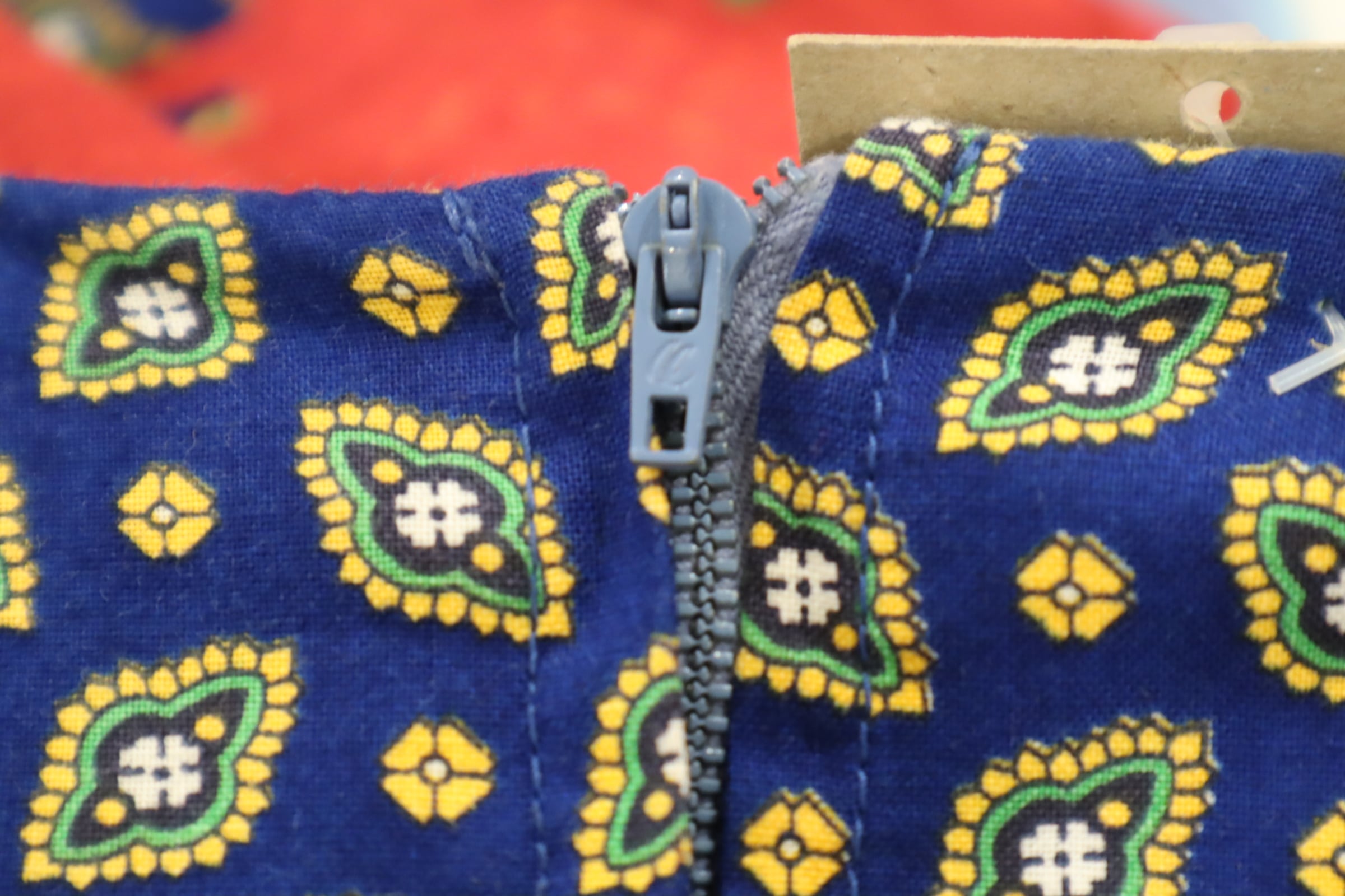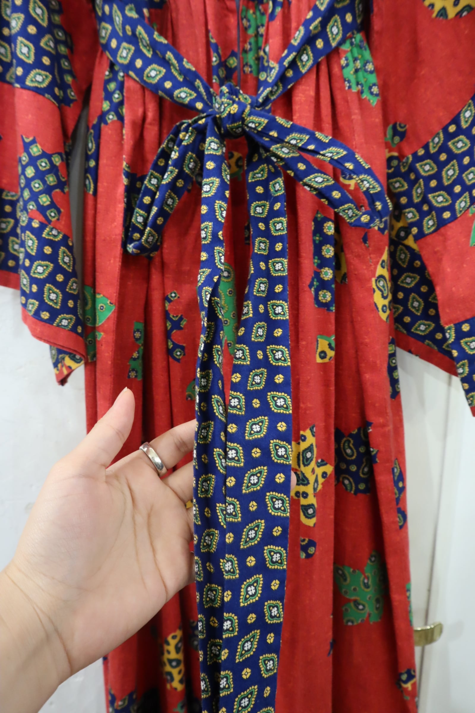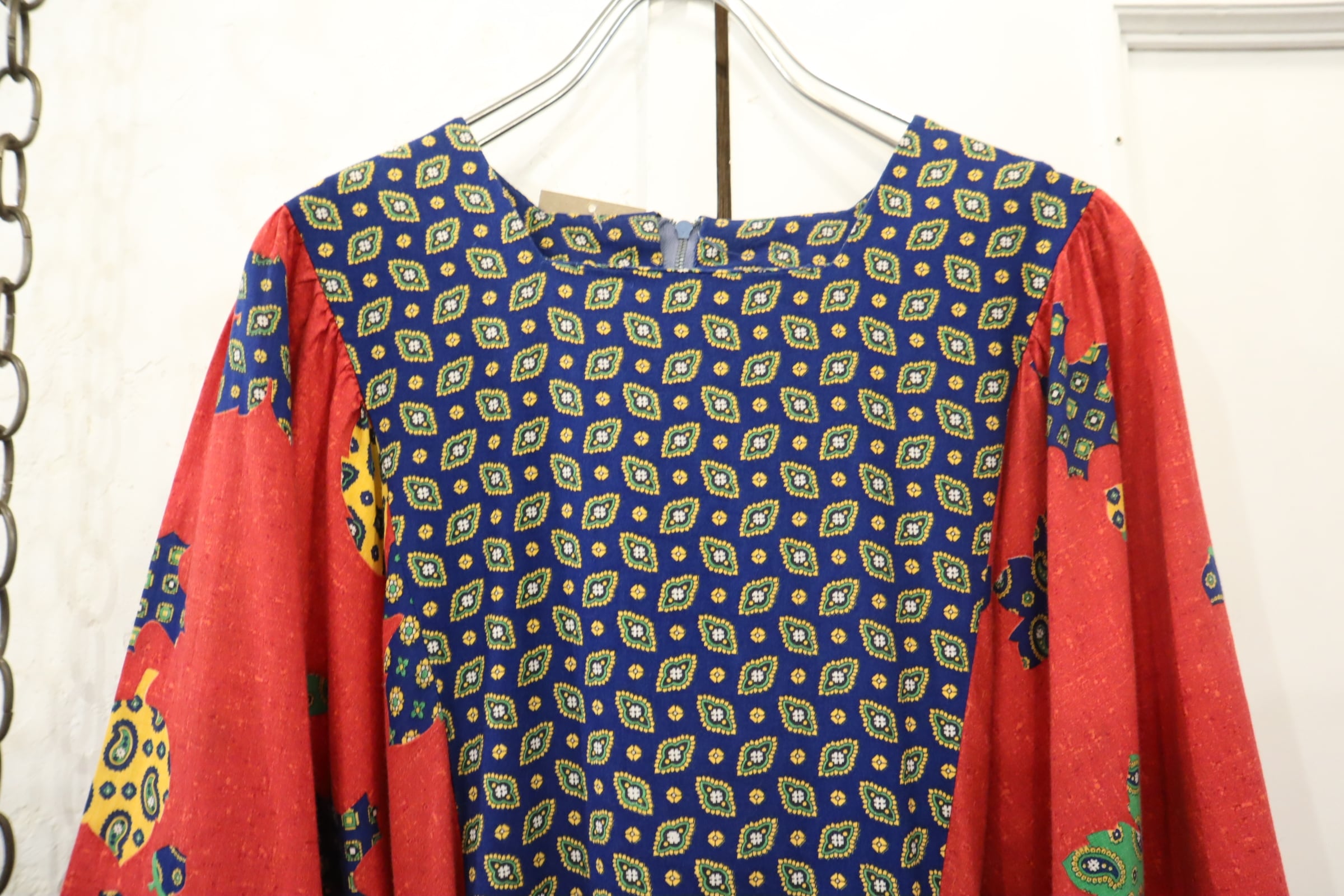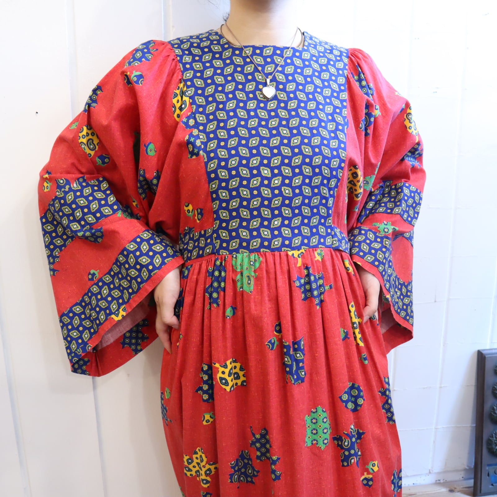 70s red×blue×yellow leaf pattern wide sleeve dress [l-4093]