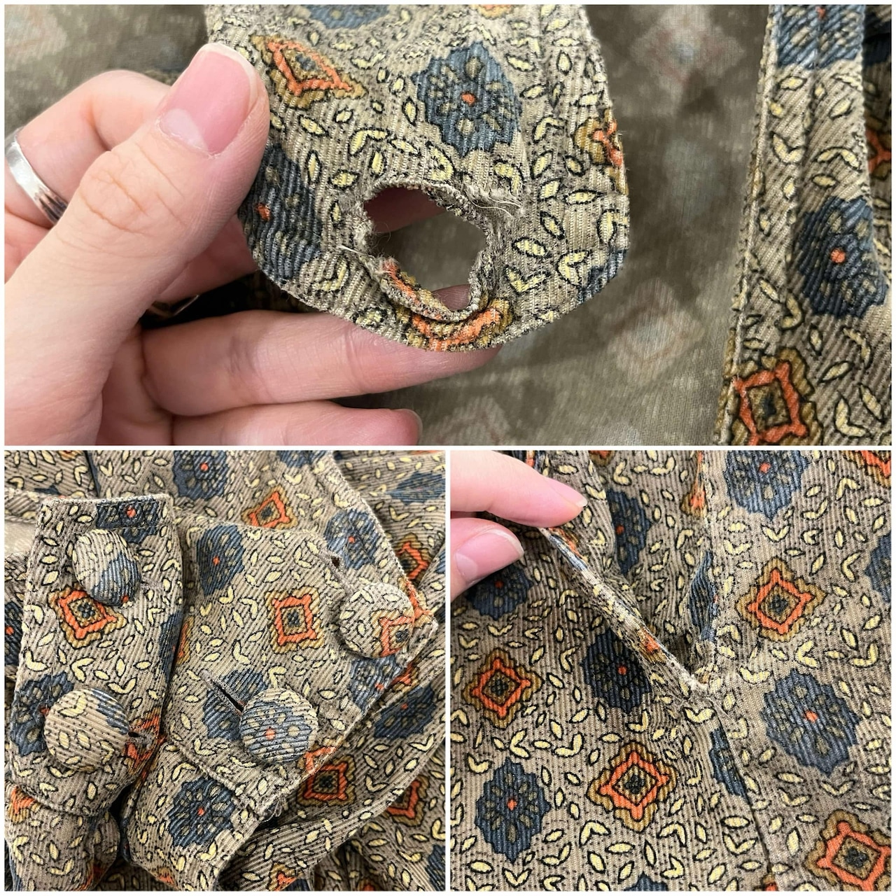 肩のボタンホールに少し破れがあり、ボタンホールの幅が広がっております。