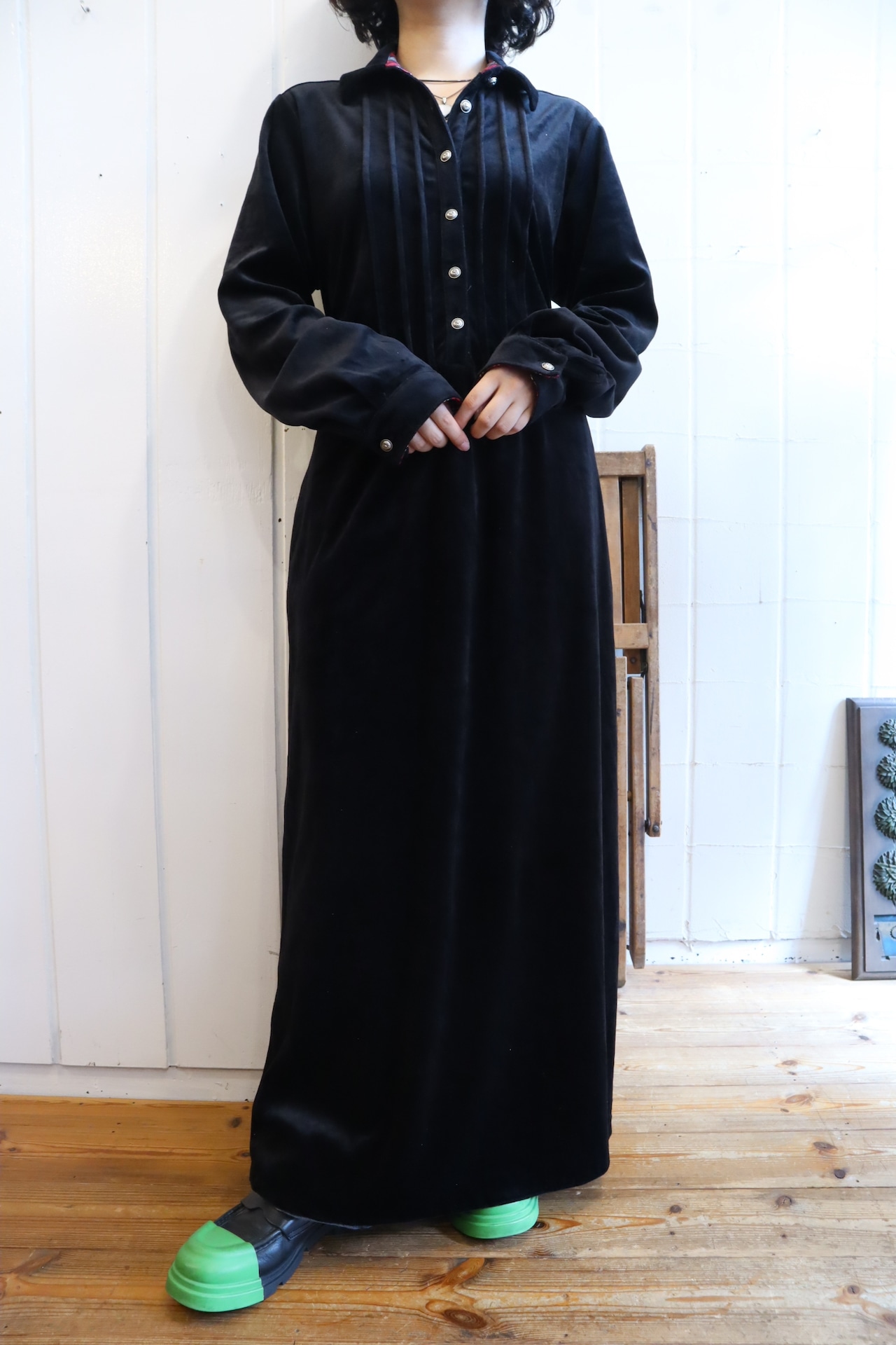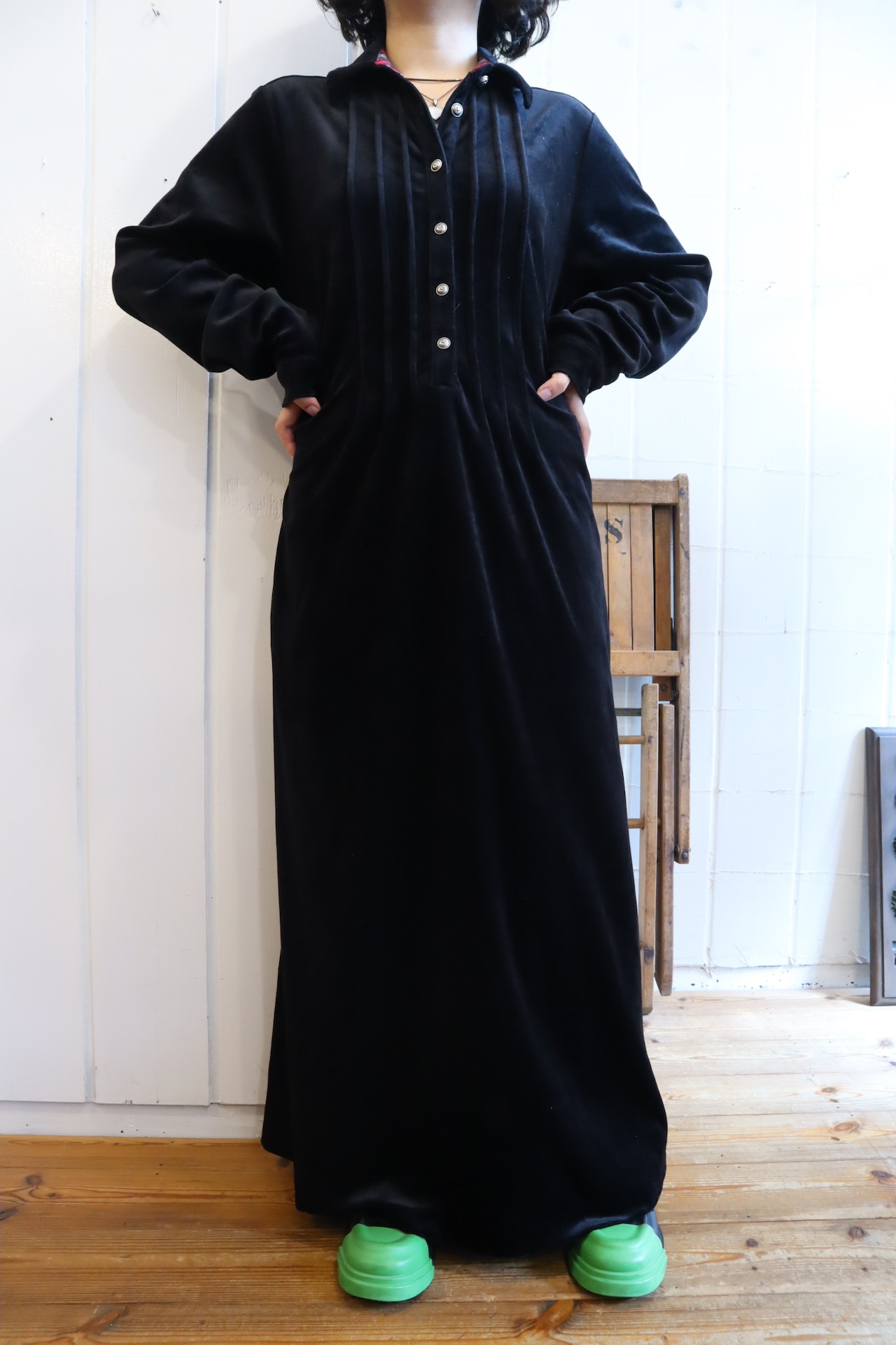 made in USA black tuck design plain velour dress [l-4115]