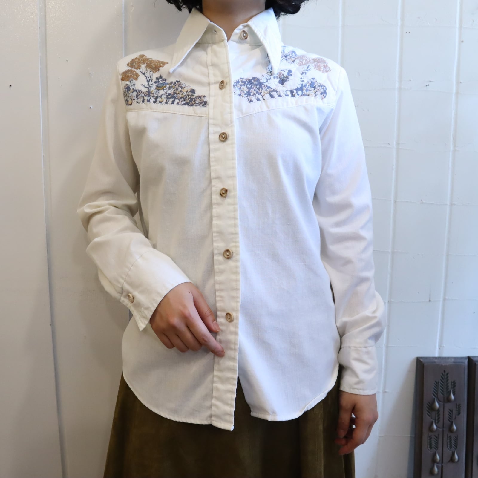 70s white×navy×brown character design shirt [l-4127]