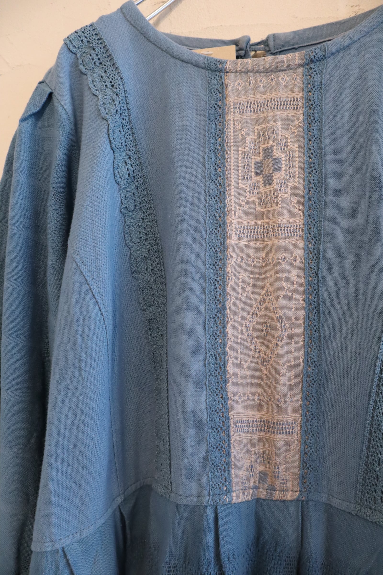 くすみブルーにほどよいエスニック感が素敵なドレス。