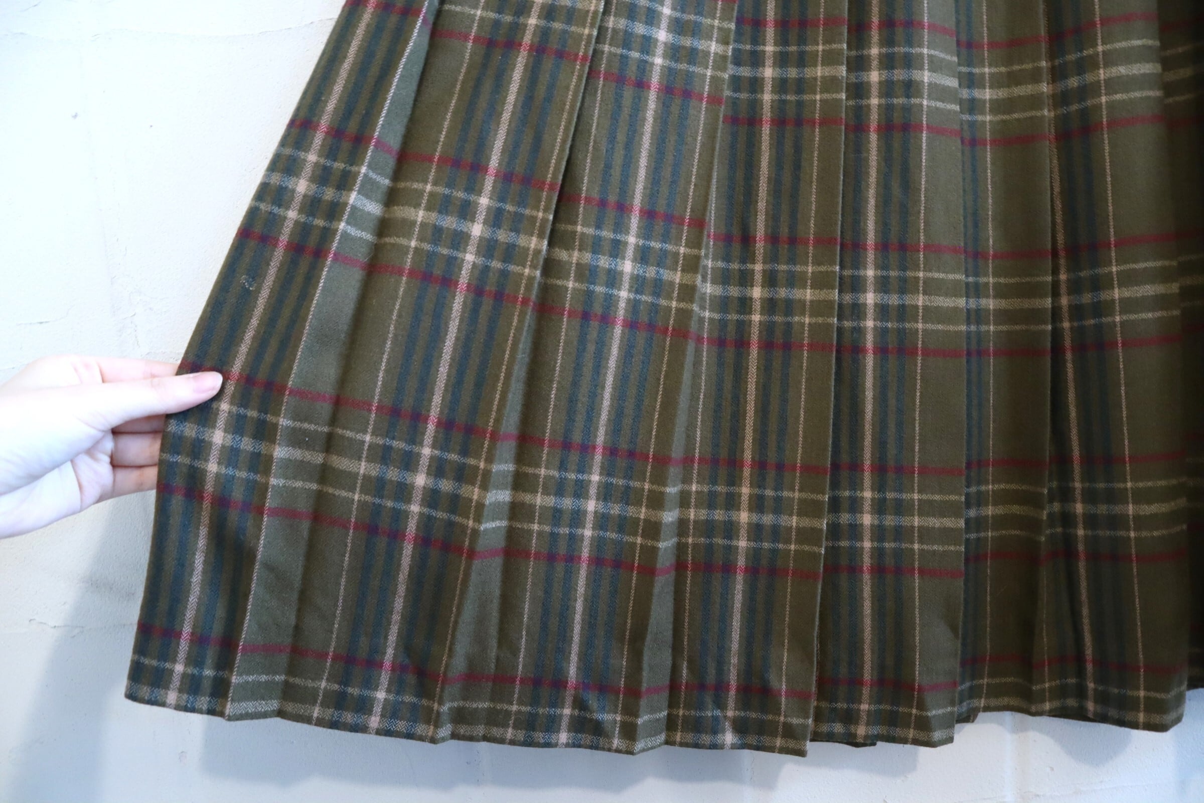 khaki×red×beige plaid pleats wool skirt [l-4202]