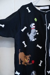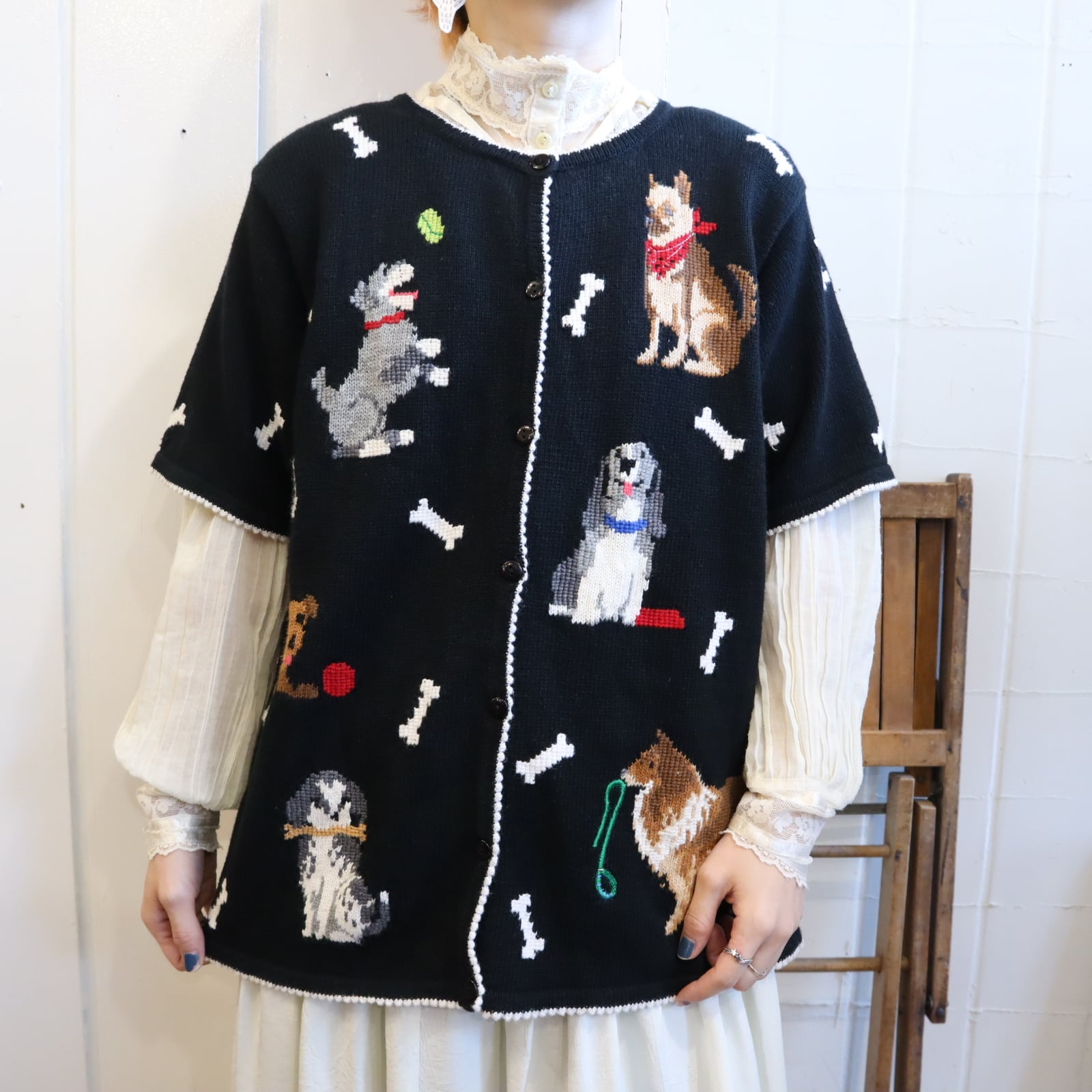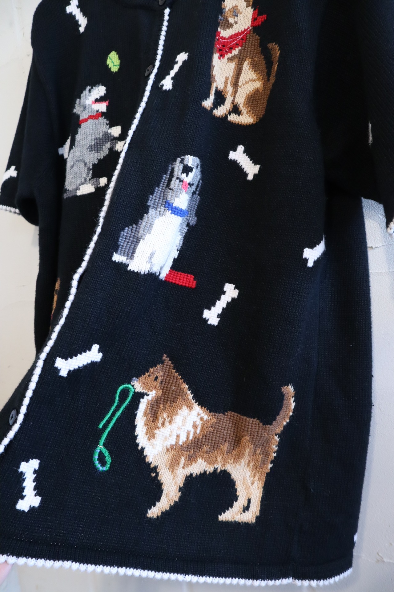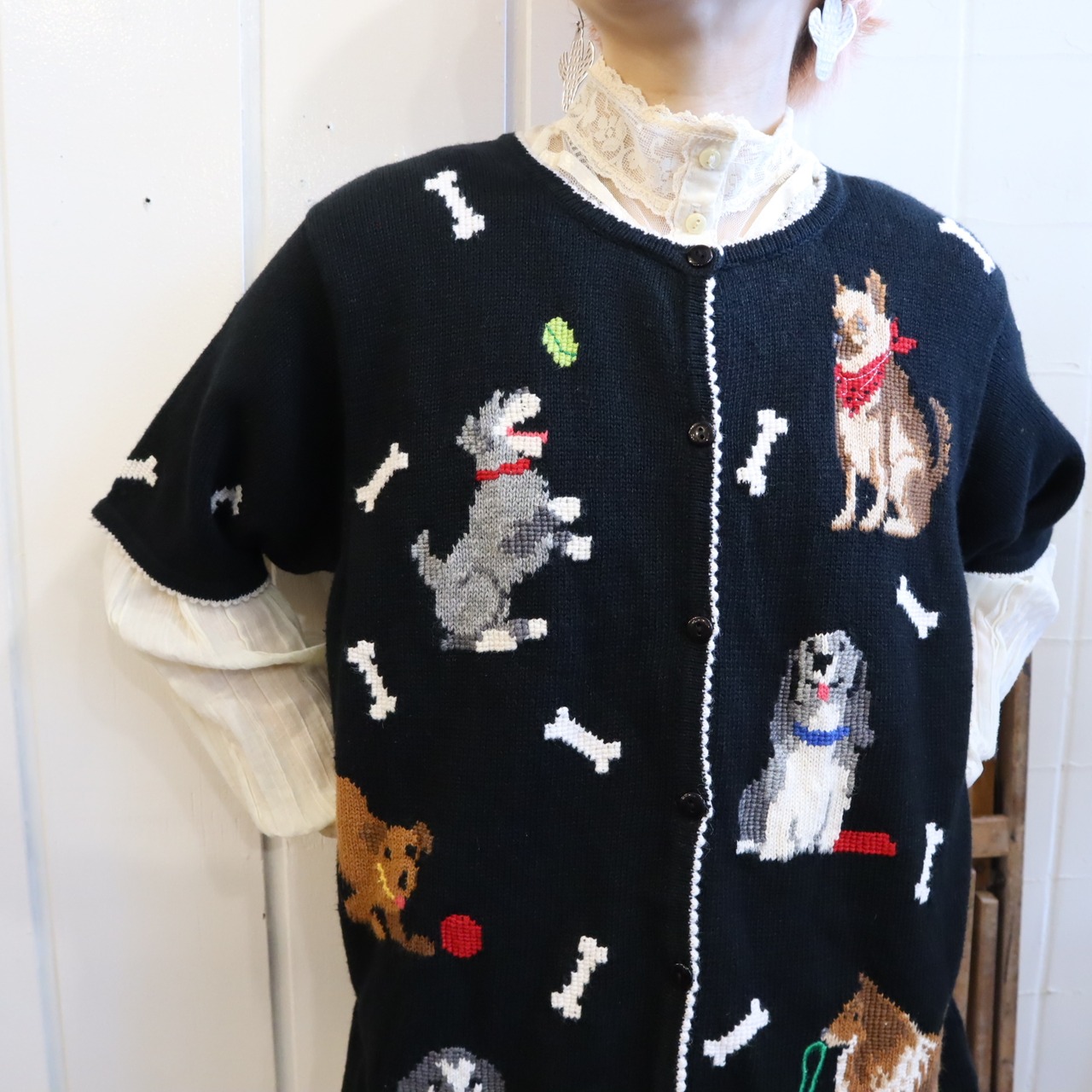 black×white dog motif short sleeve knit cardigan [l-4227]