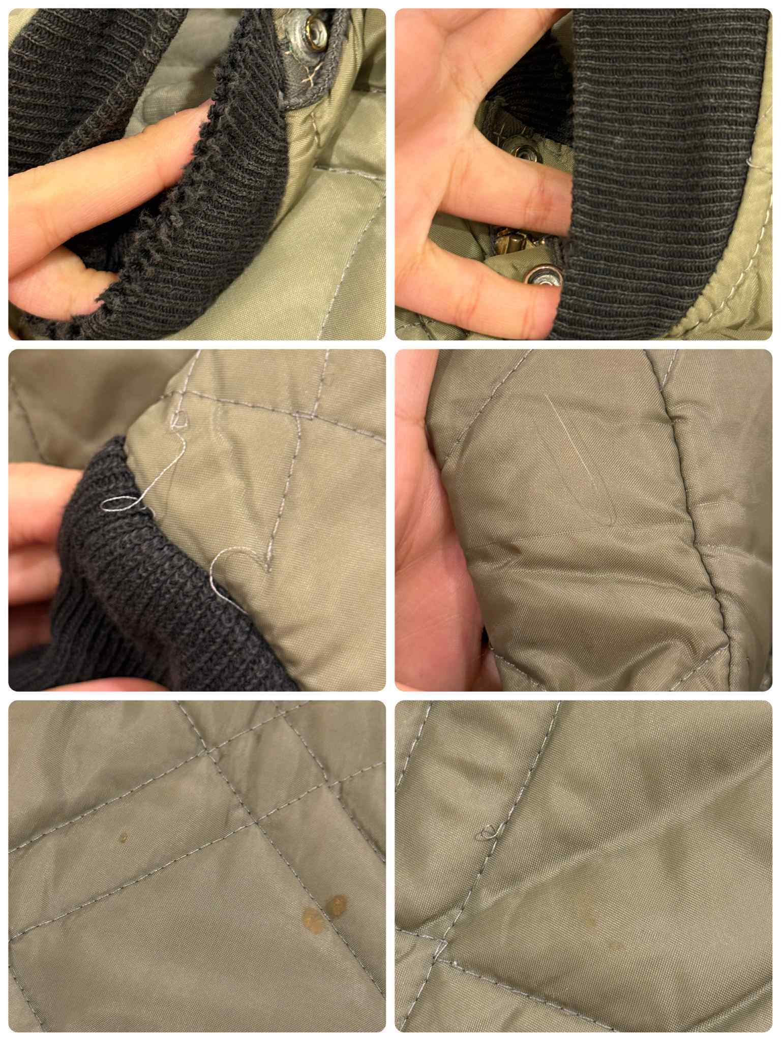いくつか糸の飛び出しやシミ汚れ、リブ部分の毛羽立ちや破れが見受けられますが、古着の味として着て頂けるかと思います。