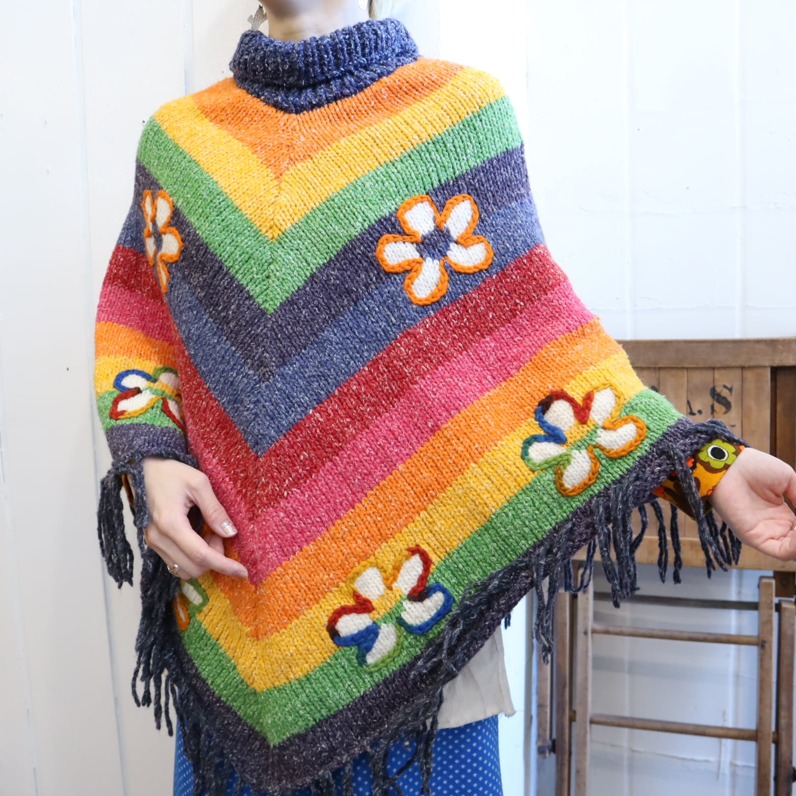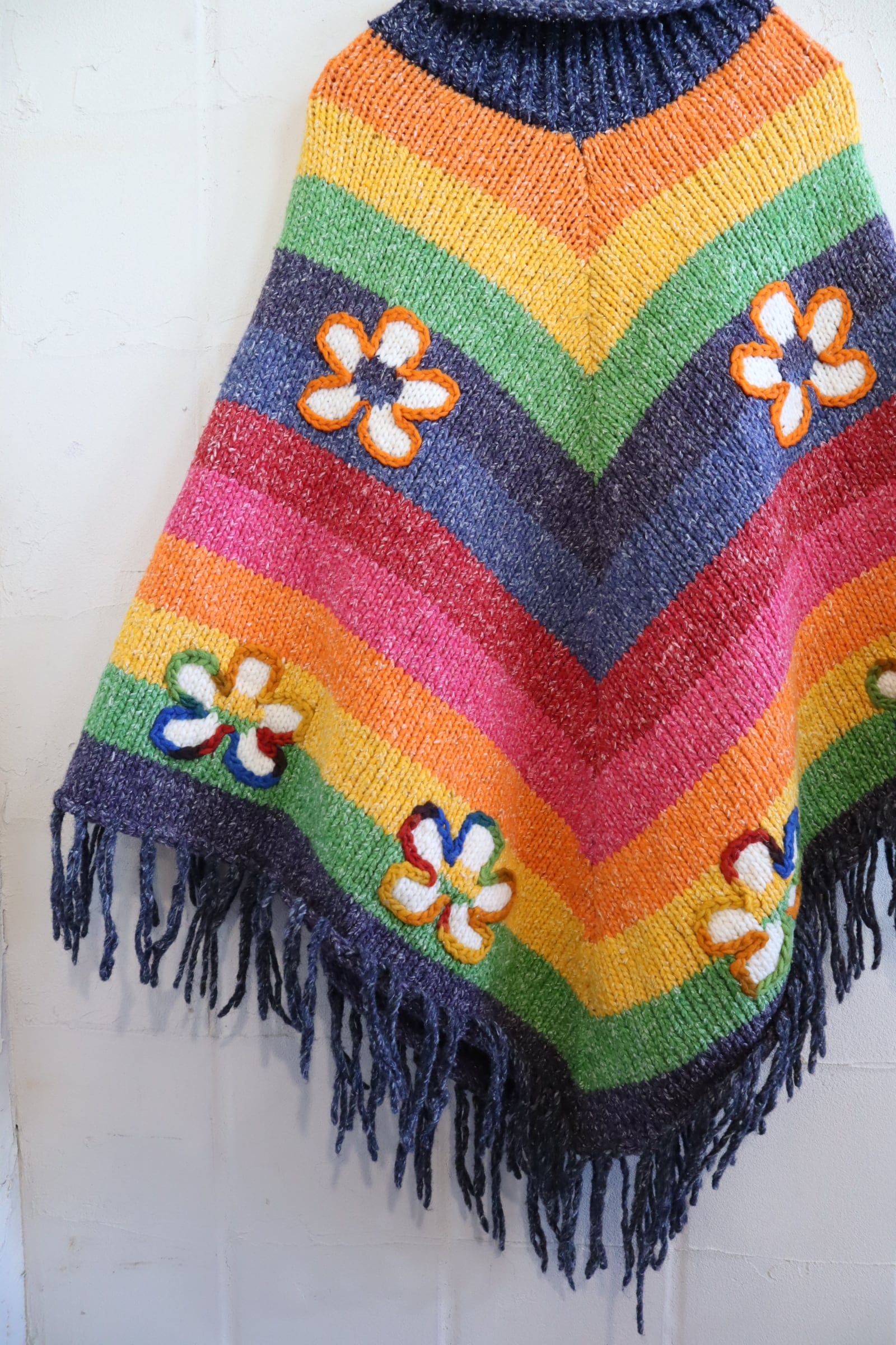 rainbow flower motif turtleneck Ecuador knit poncho [l-4346]