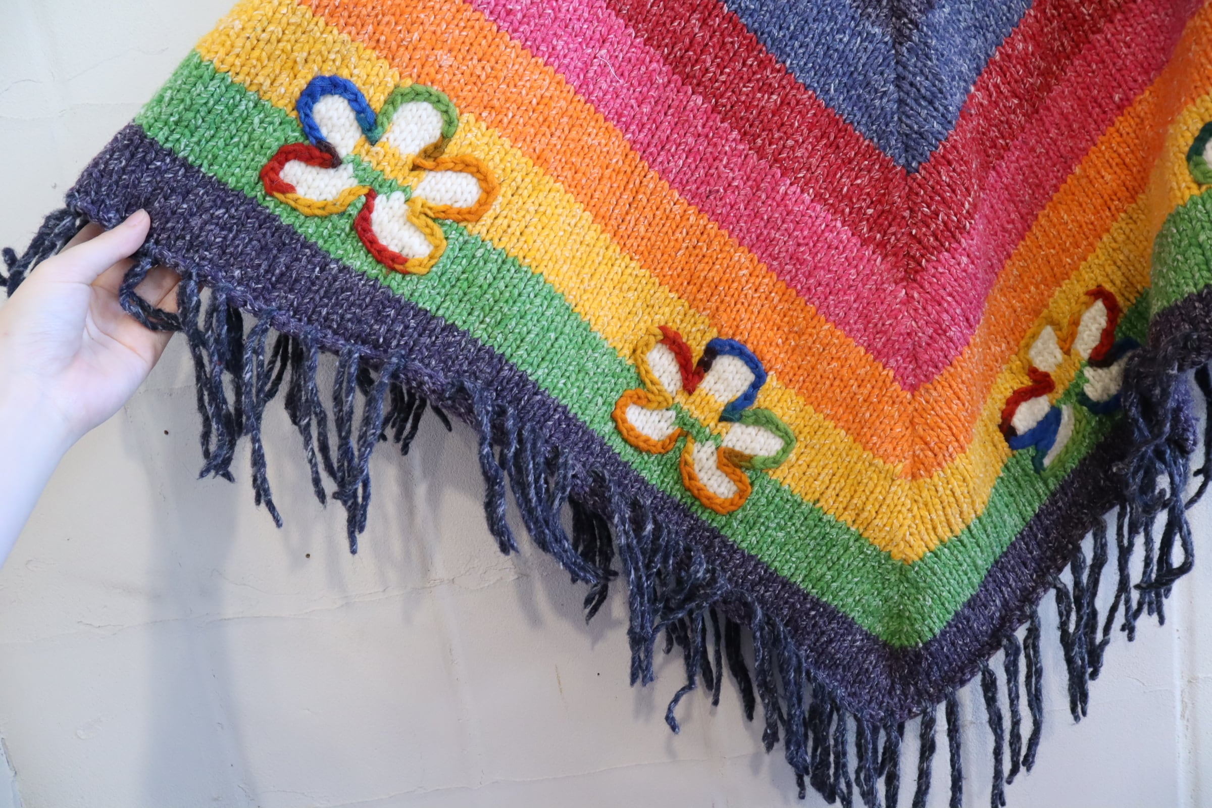 レインボーにお花のモチーフがとっても可愛いエクアドルニットポンチョ。