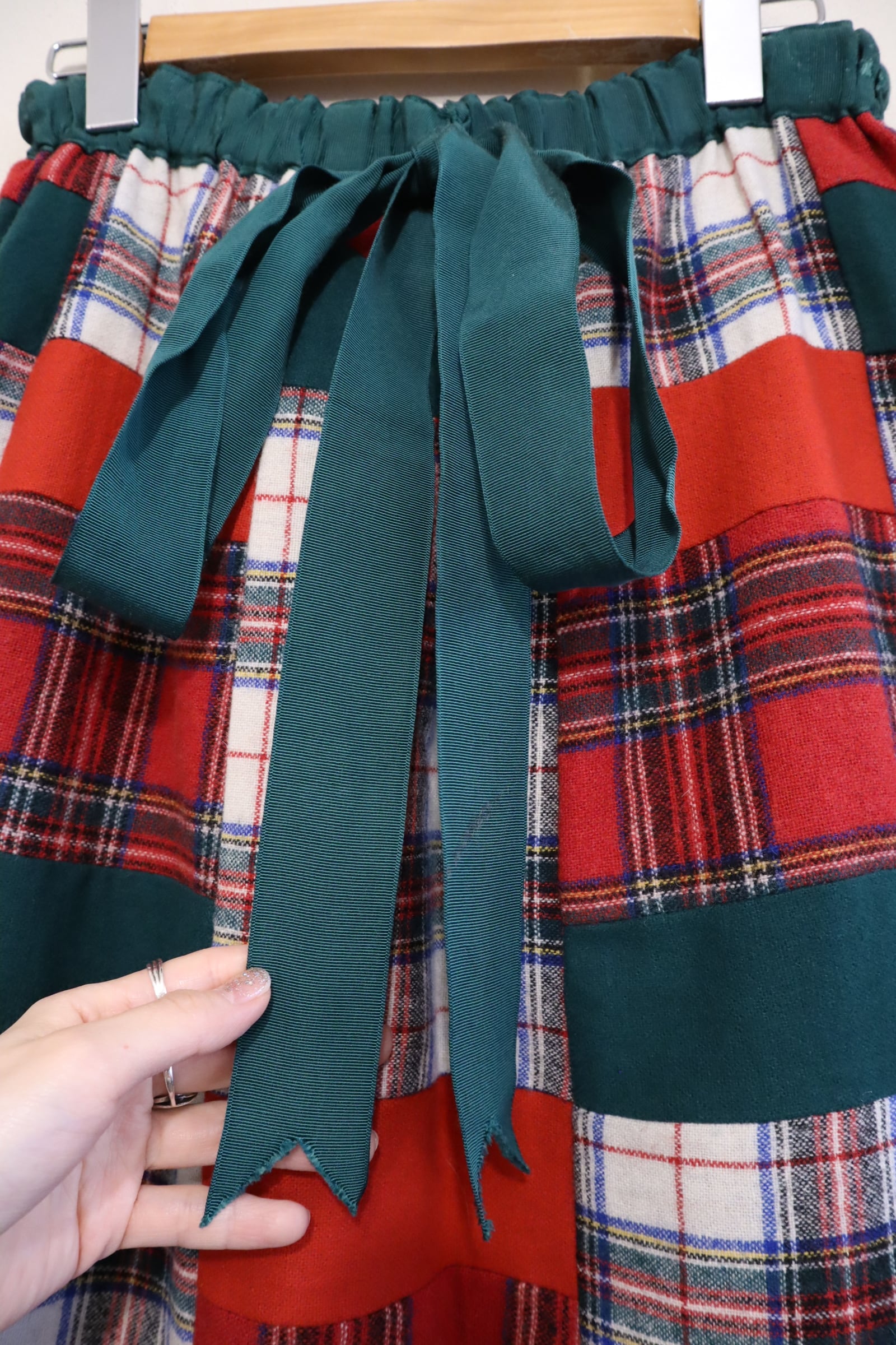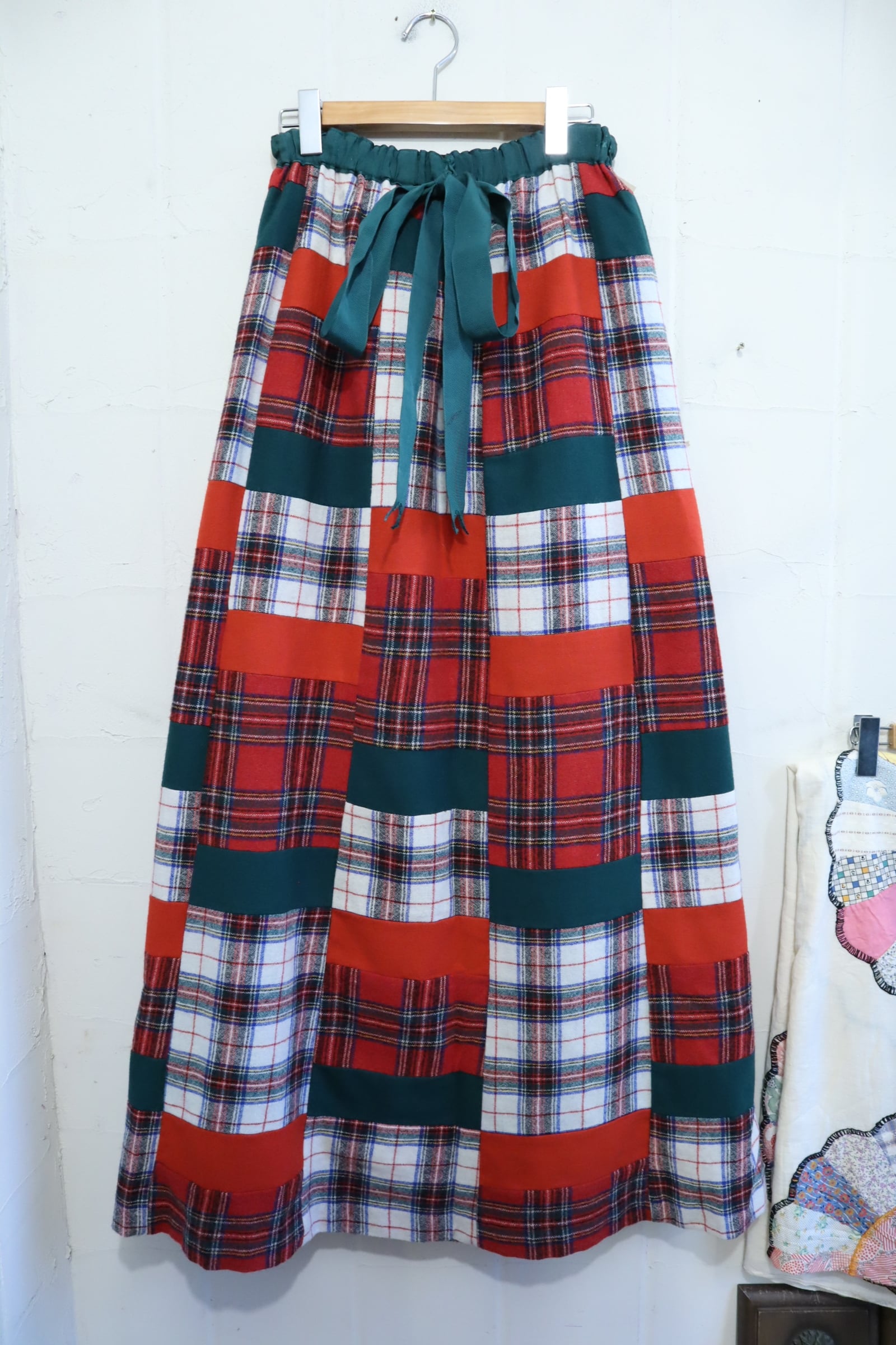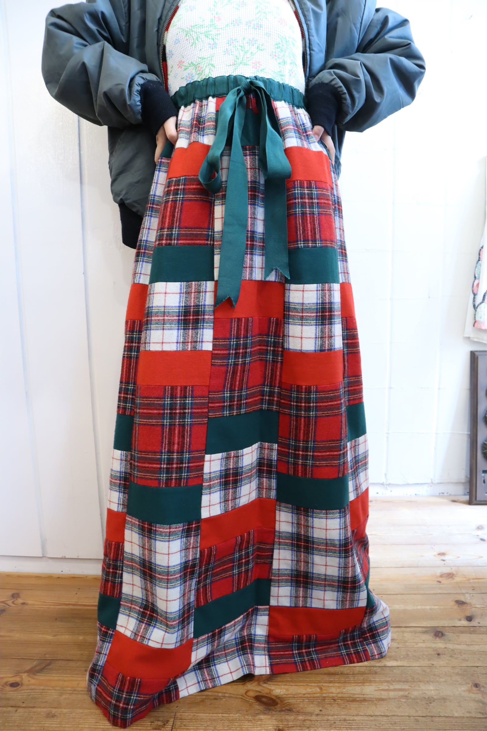 70s green×red plaid patchwork wool long skirt [l-4359]