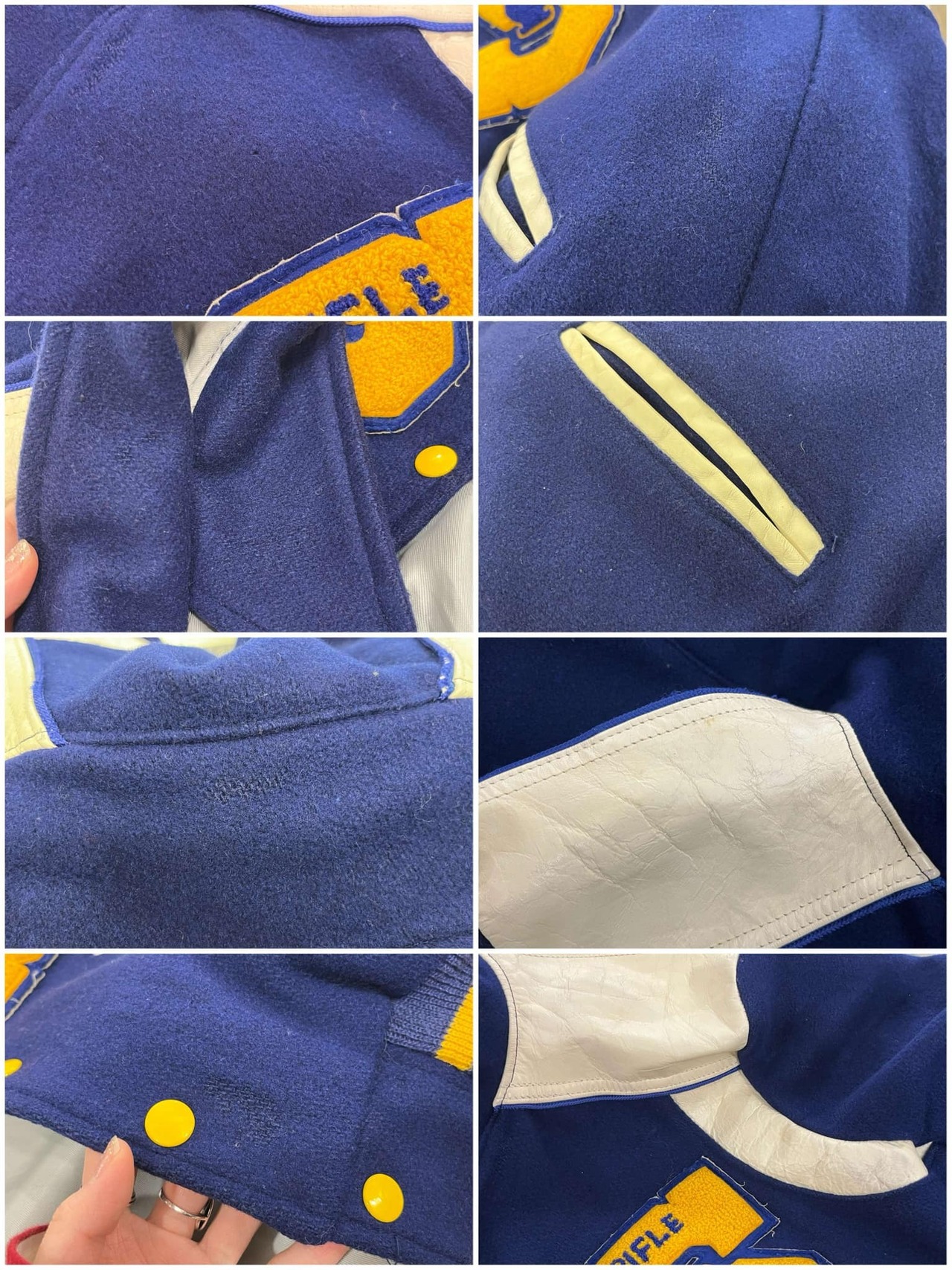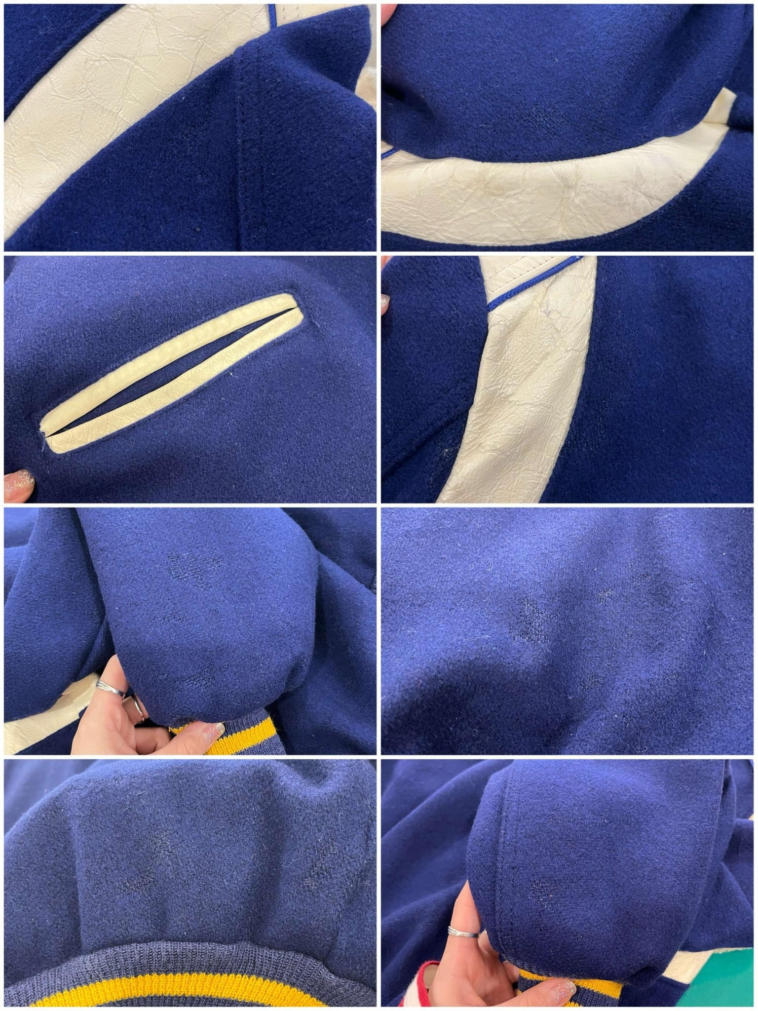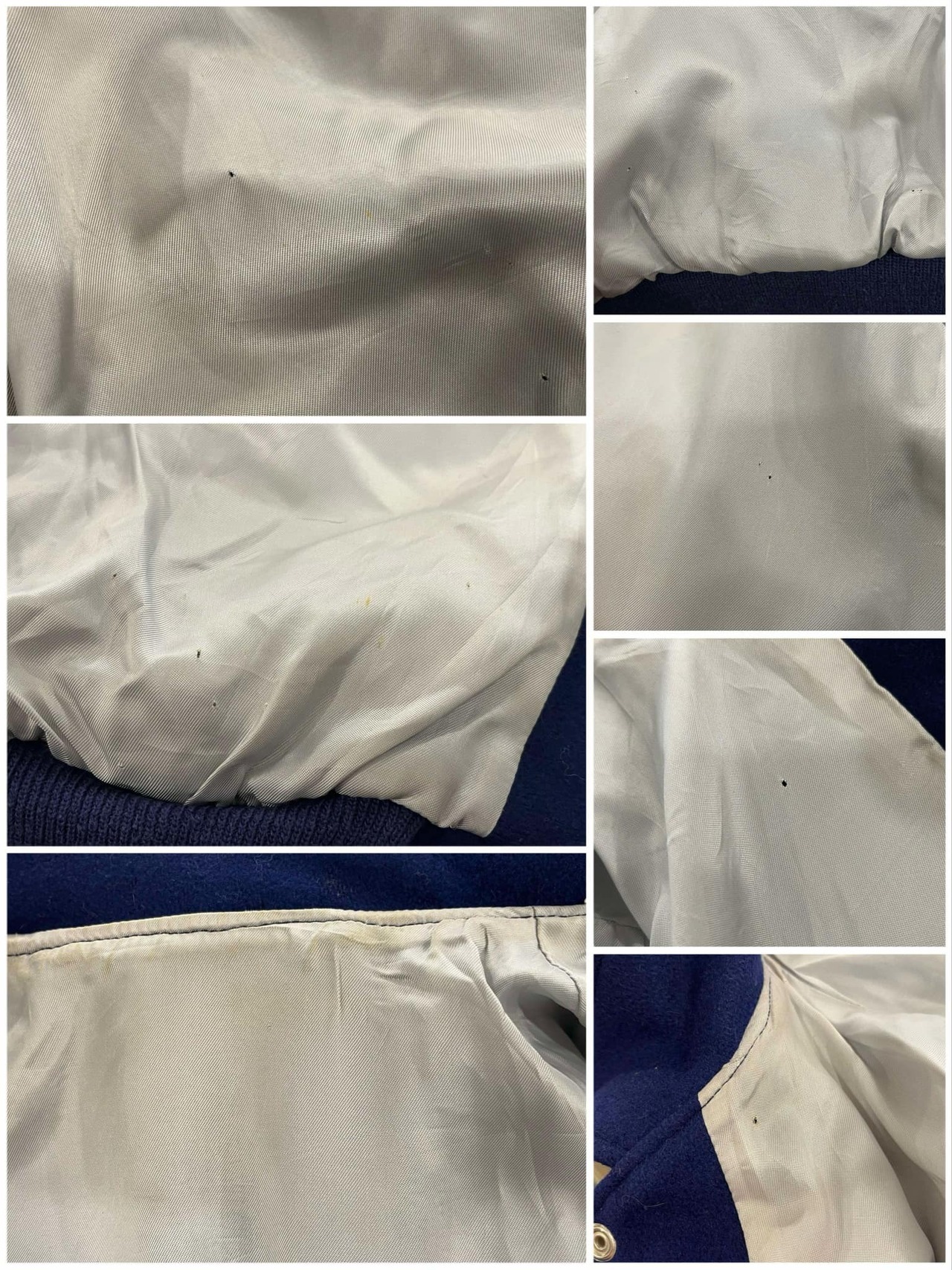 また一部点ほどの穴、いくつか生地の薄れ・シミ、レザー部分に特有のシワがございますが、いずれも古着の味として着ていただけるかと思われます。