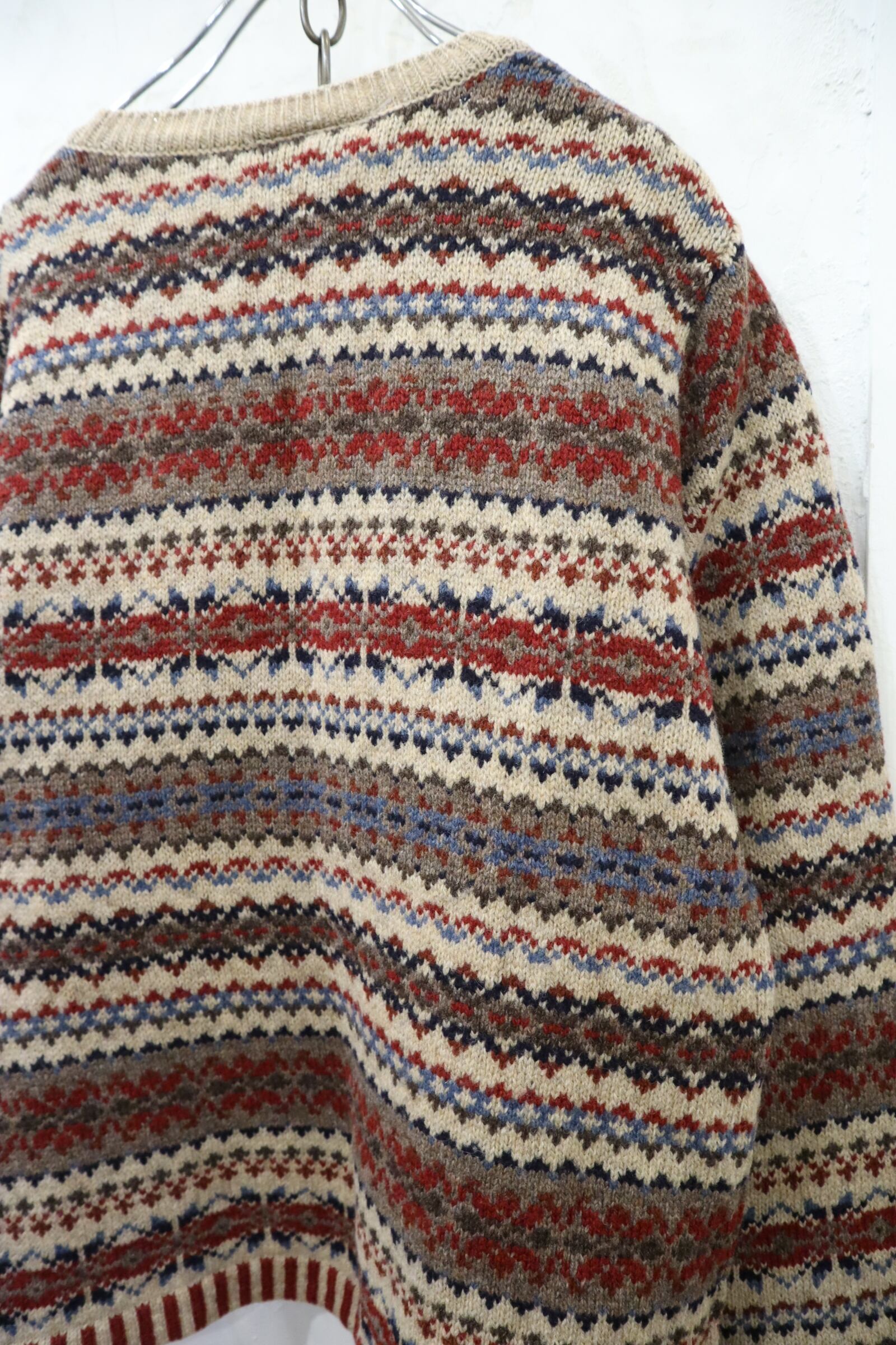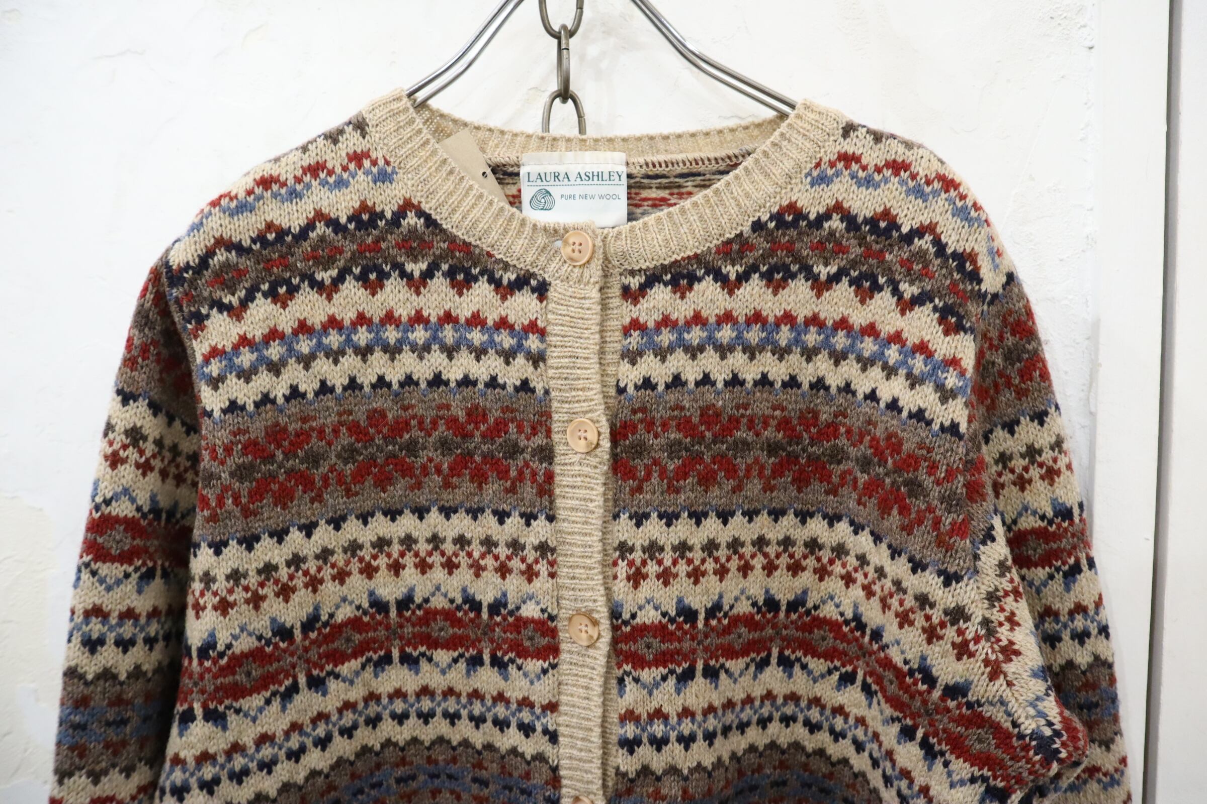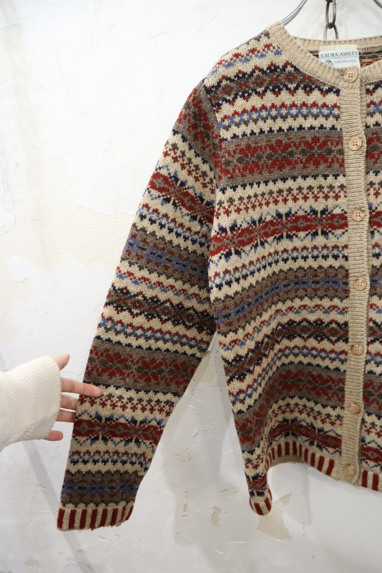 Laura Ashley beige×red×navy nordic pattern wool knit cardigan [l-4369]
