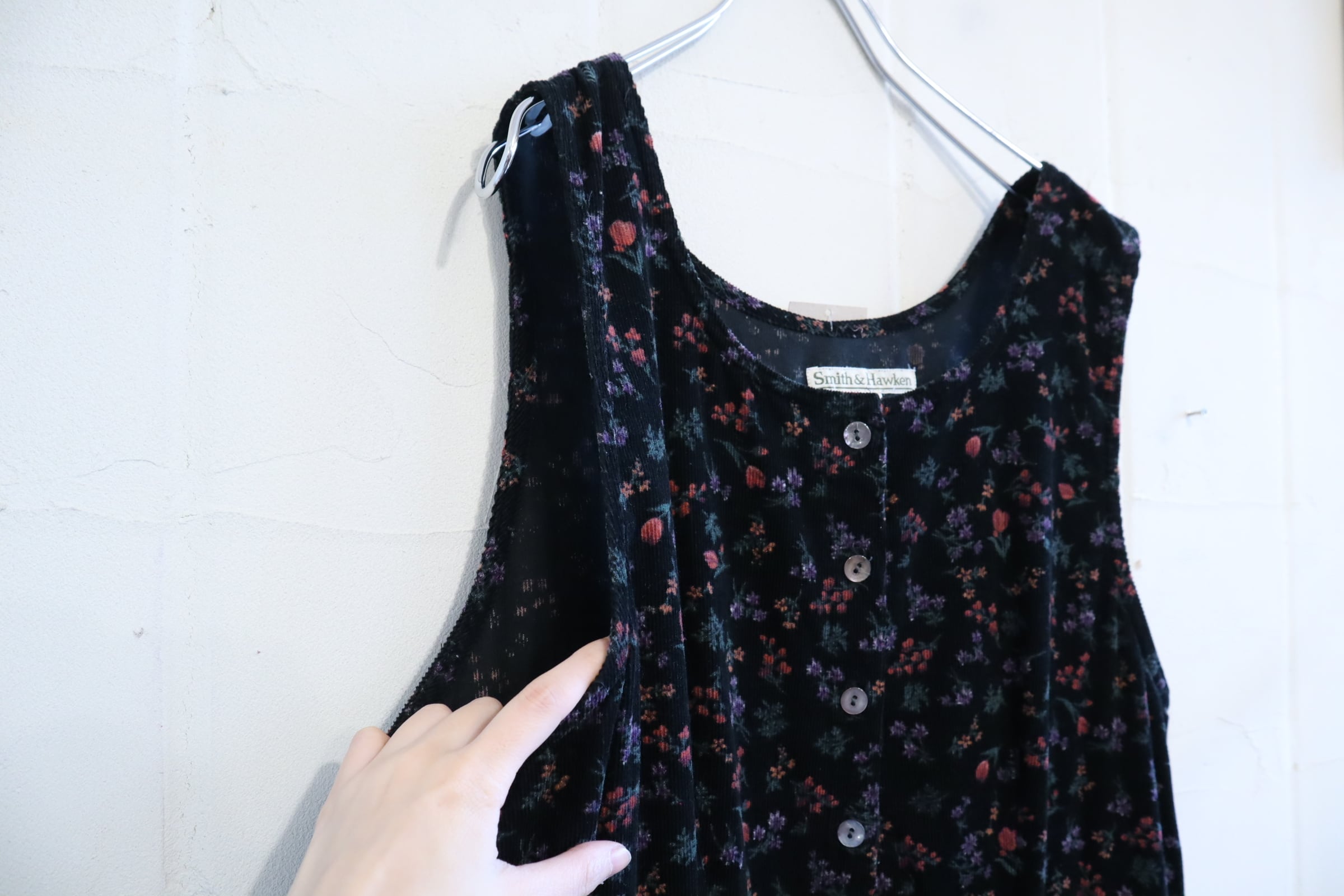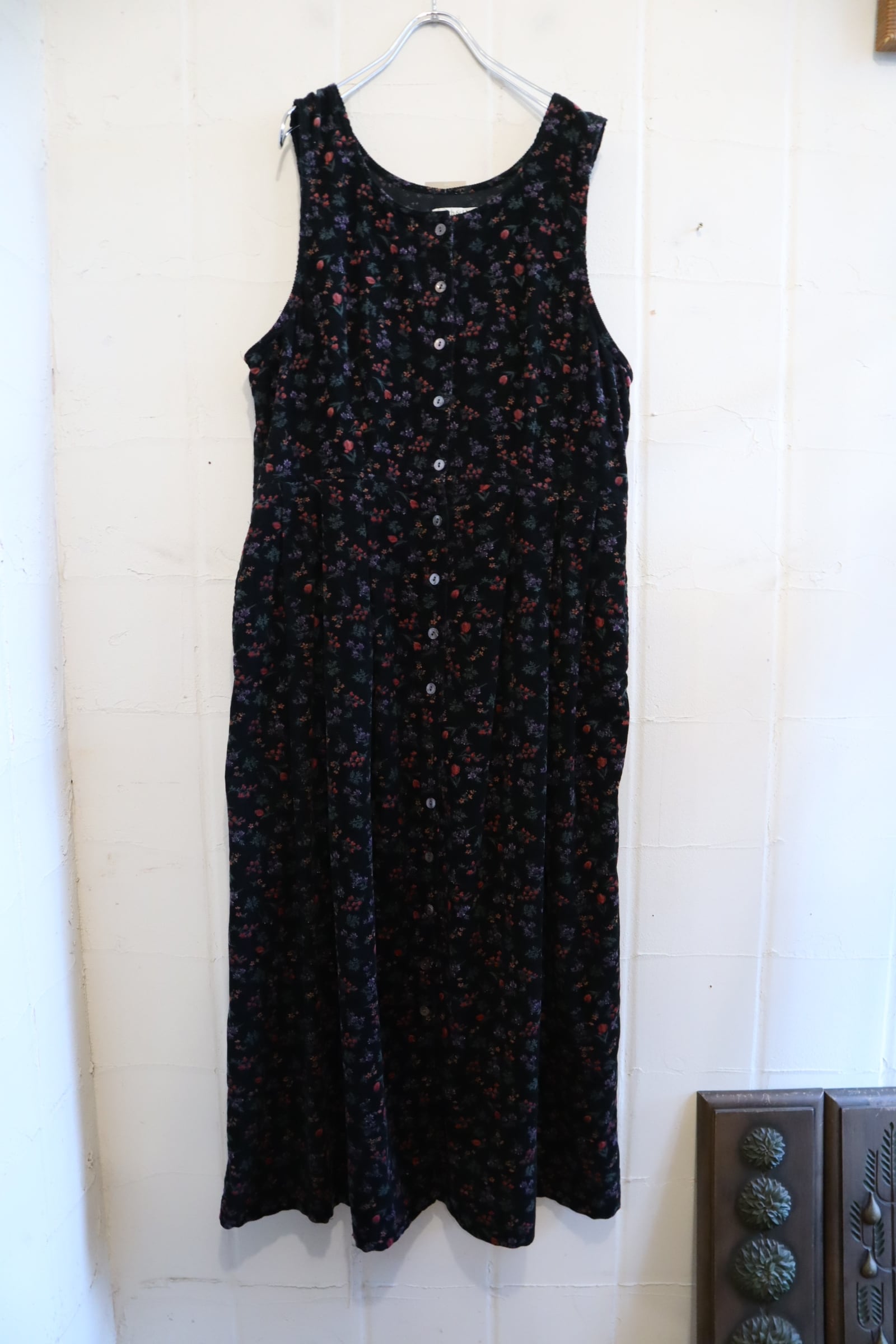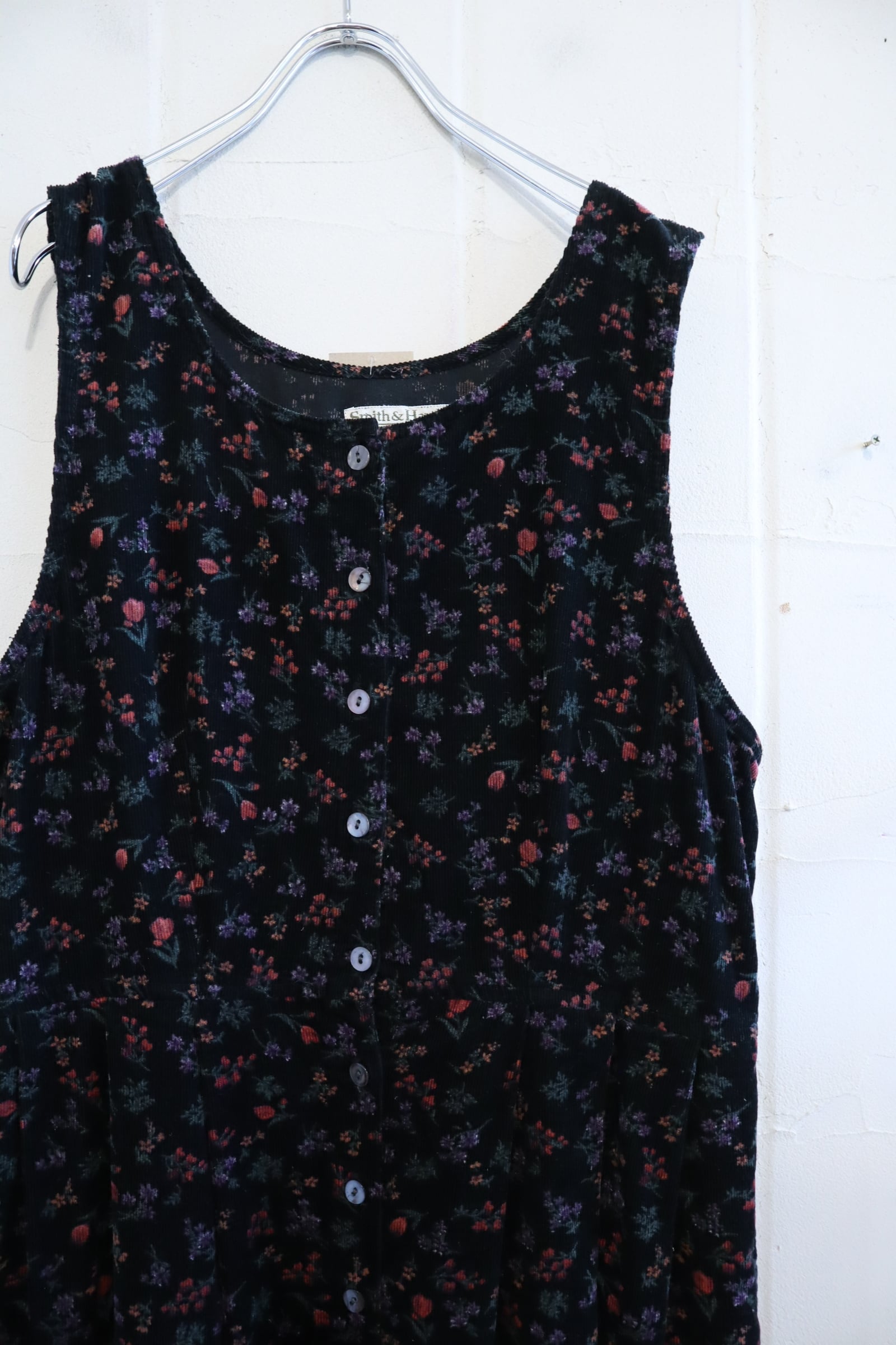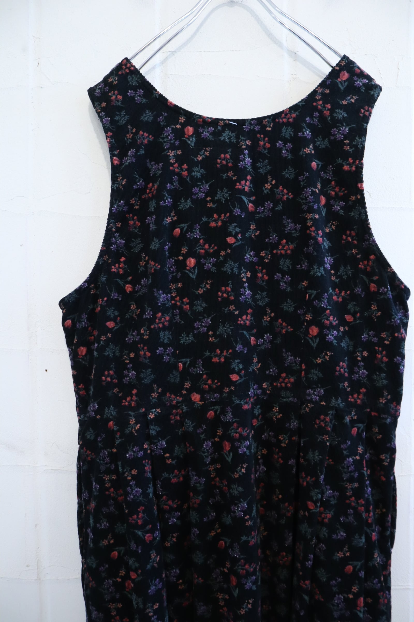 made in USA black×pink flower pattern sleeveless corduroy dress [l-4407]