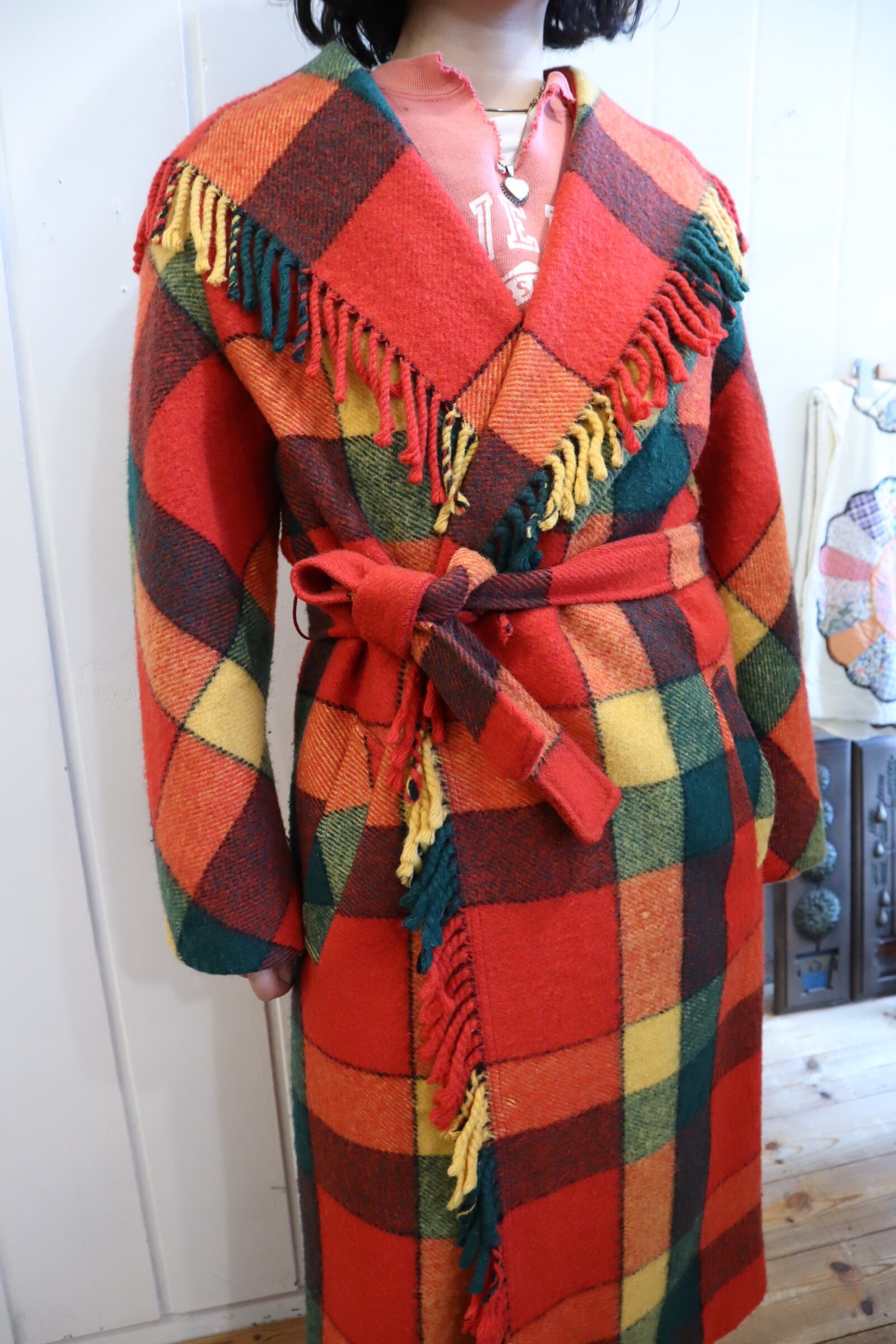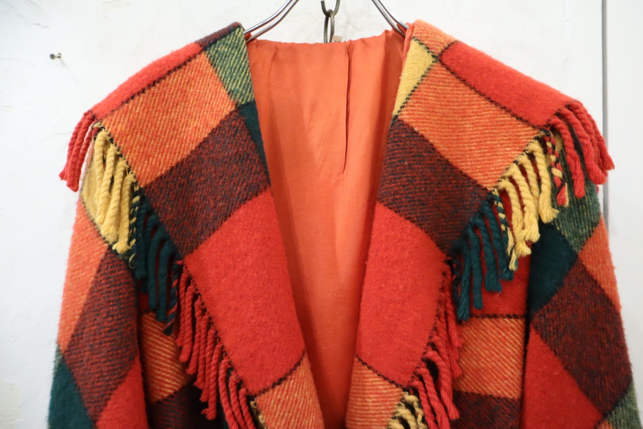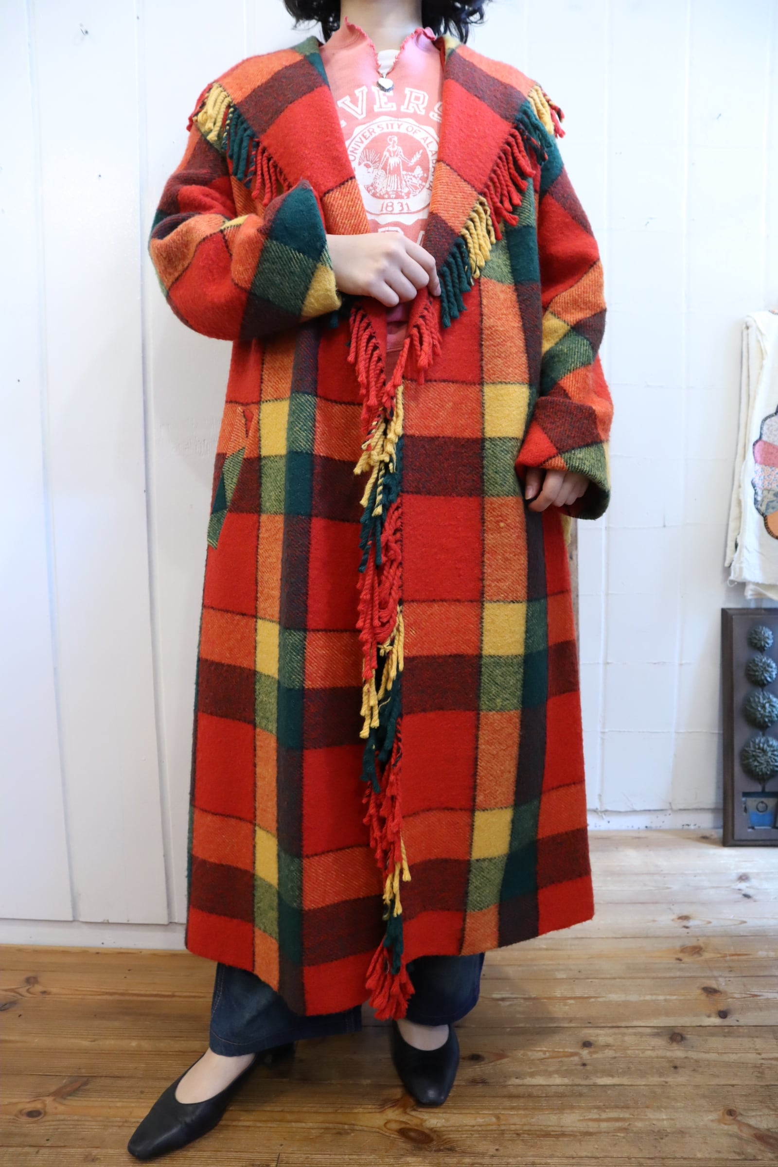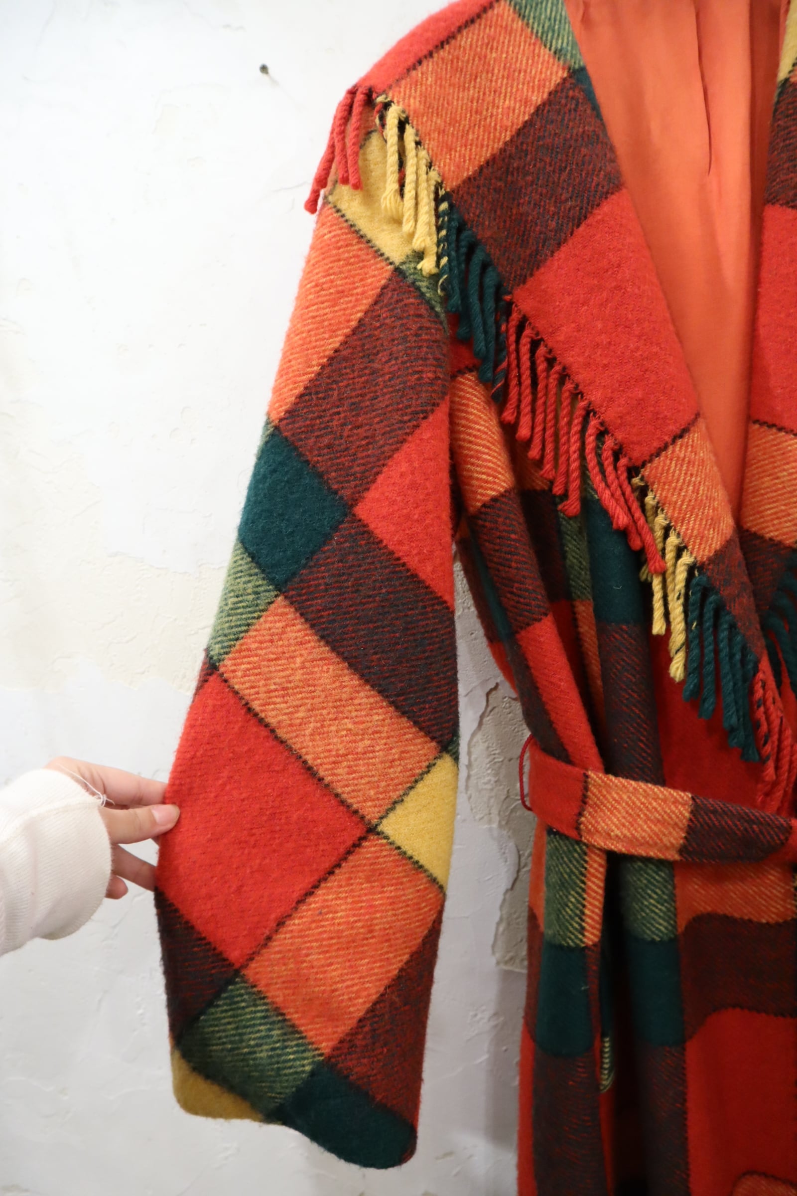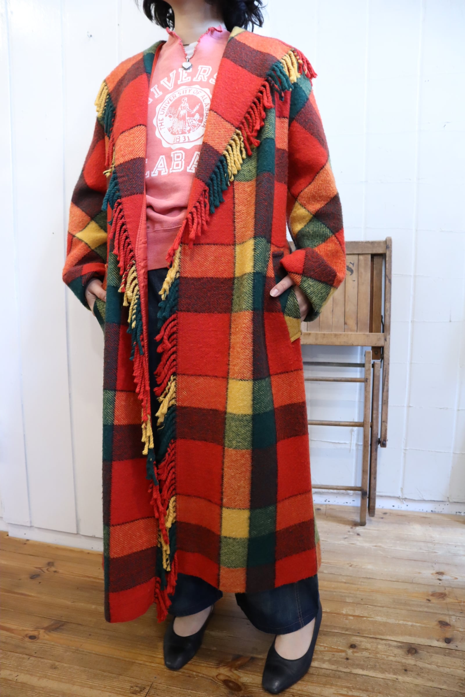 orange×green×yellow plaid wool fringe coat [l-4411]