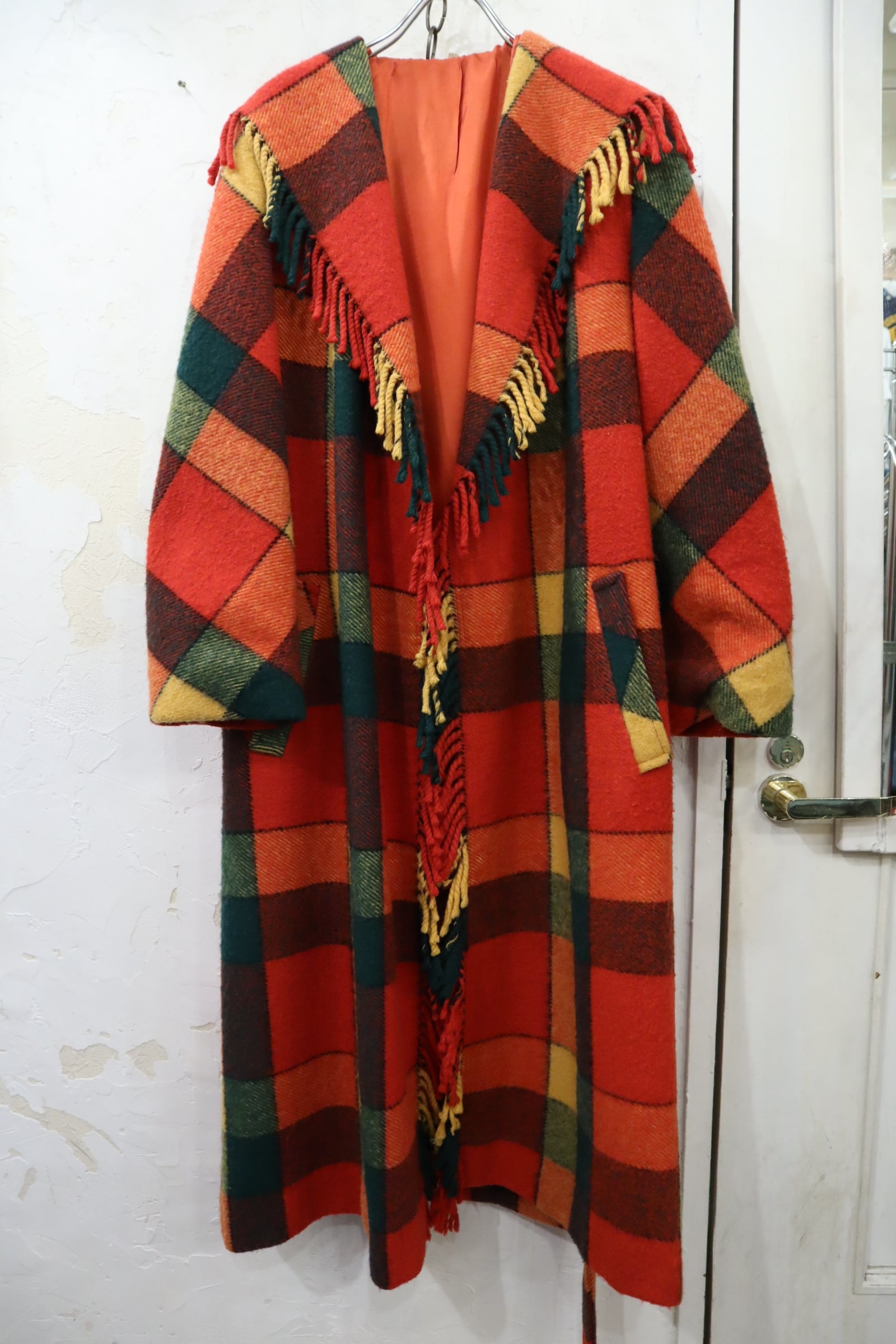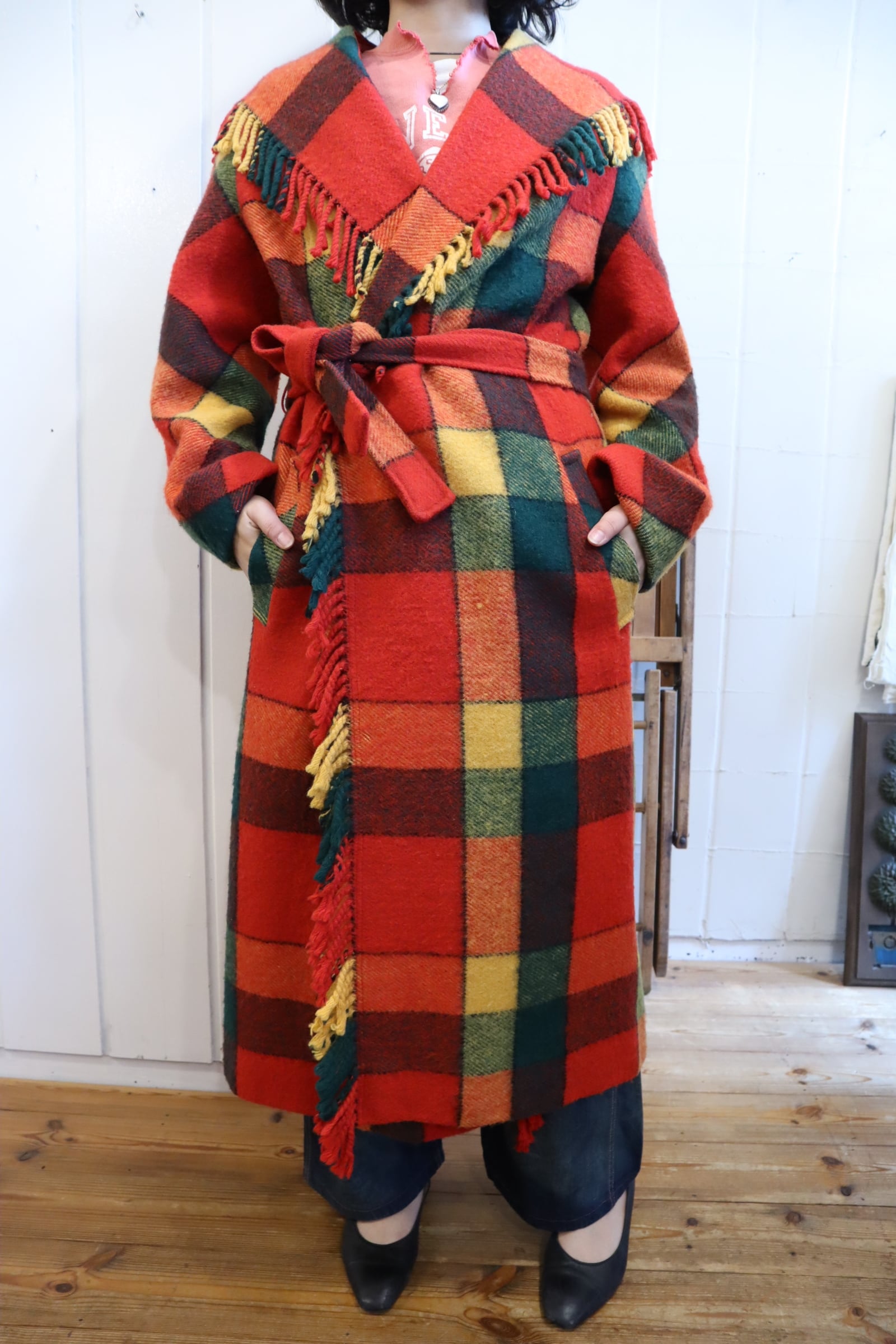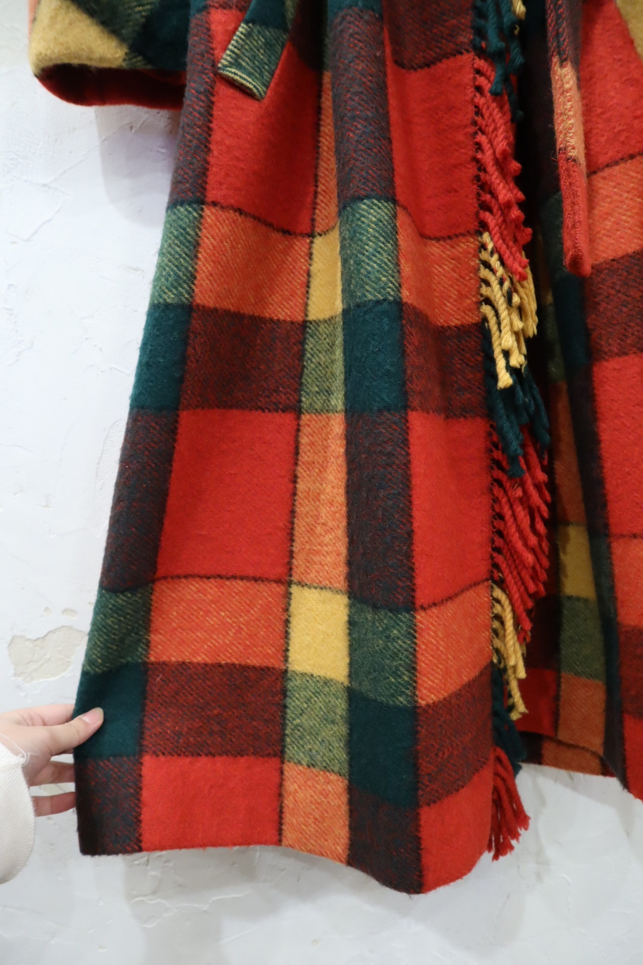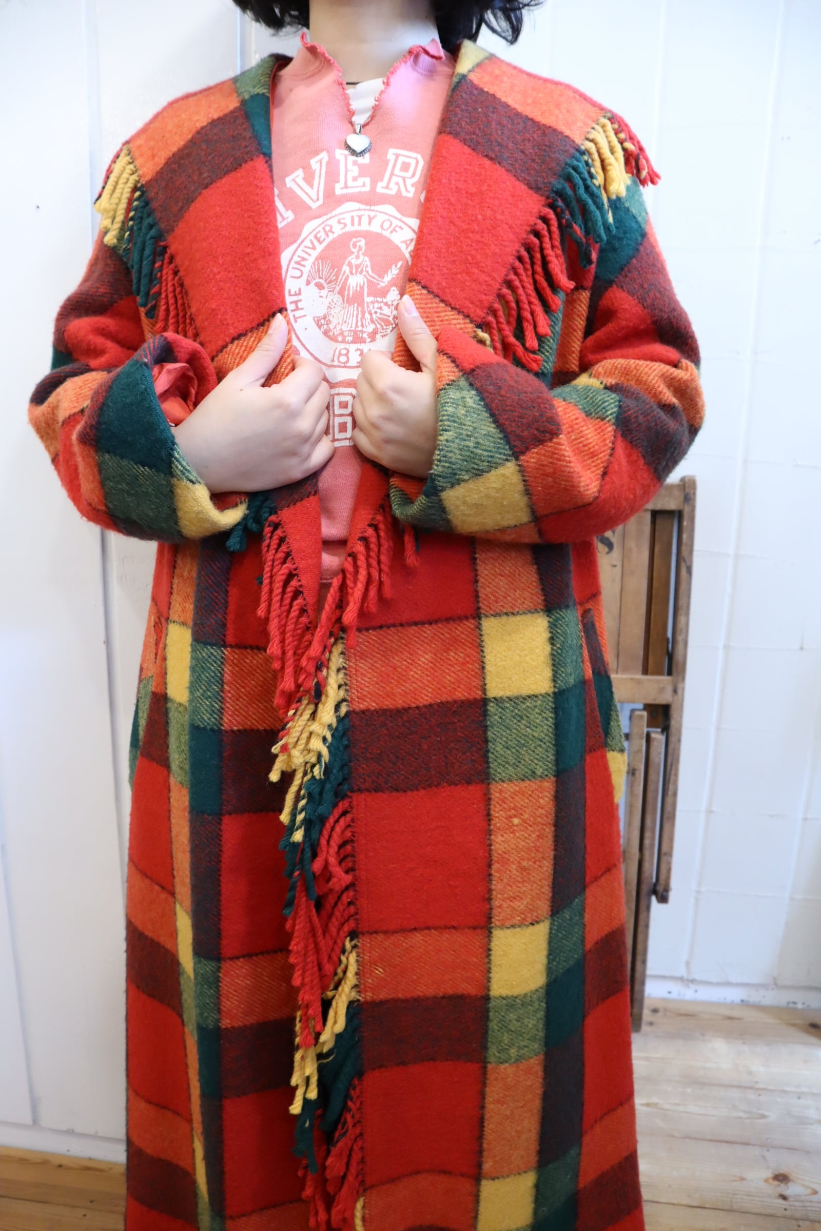 orange×green×yellow plaid wool fringe coat [l-4411]