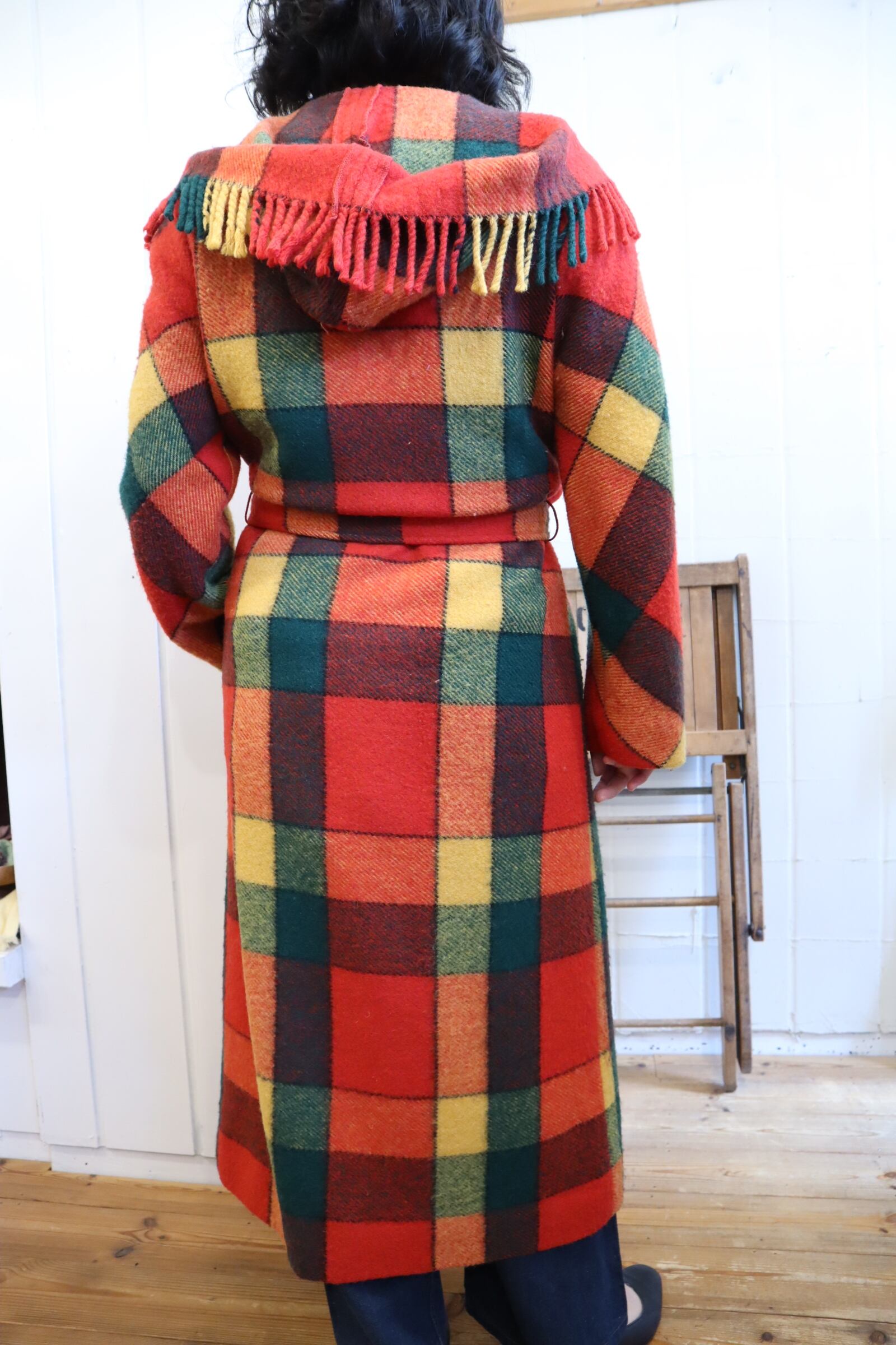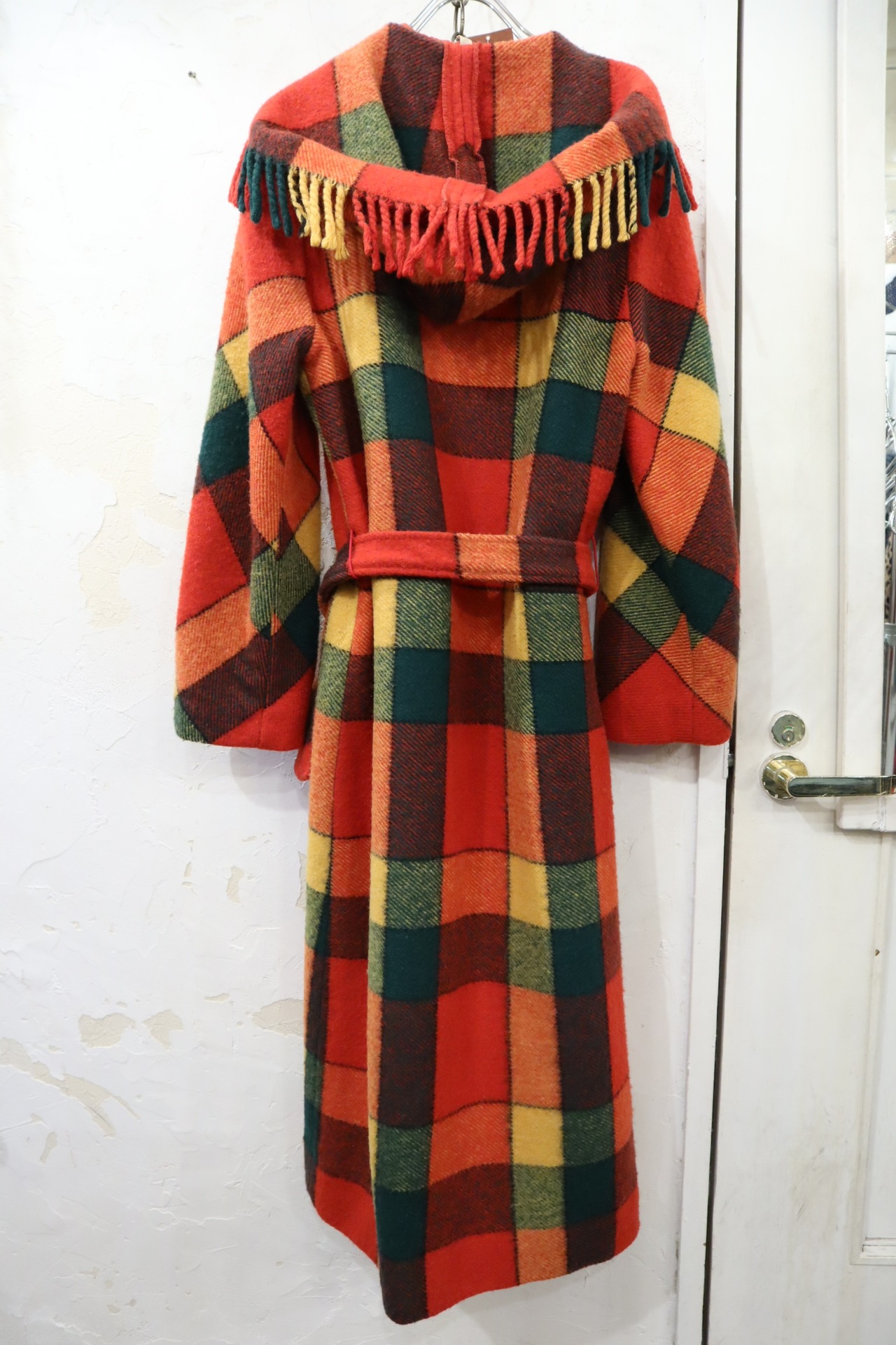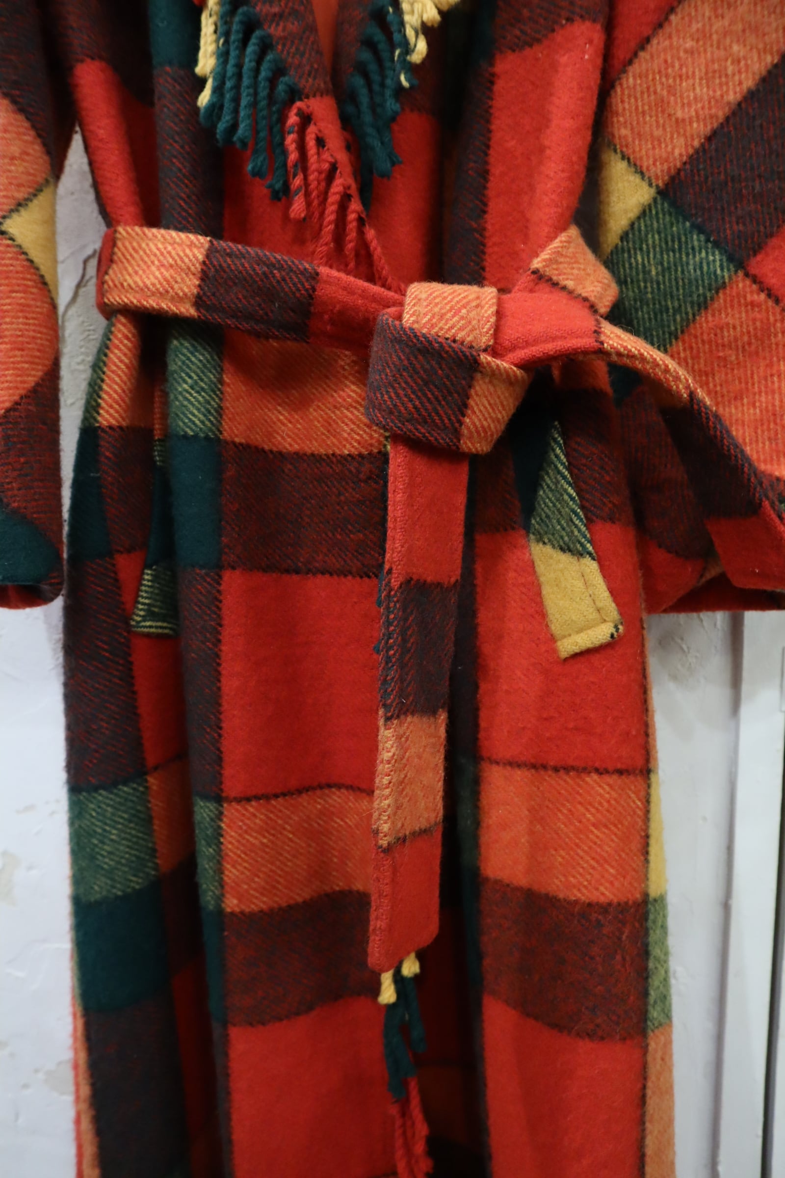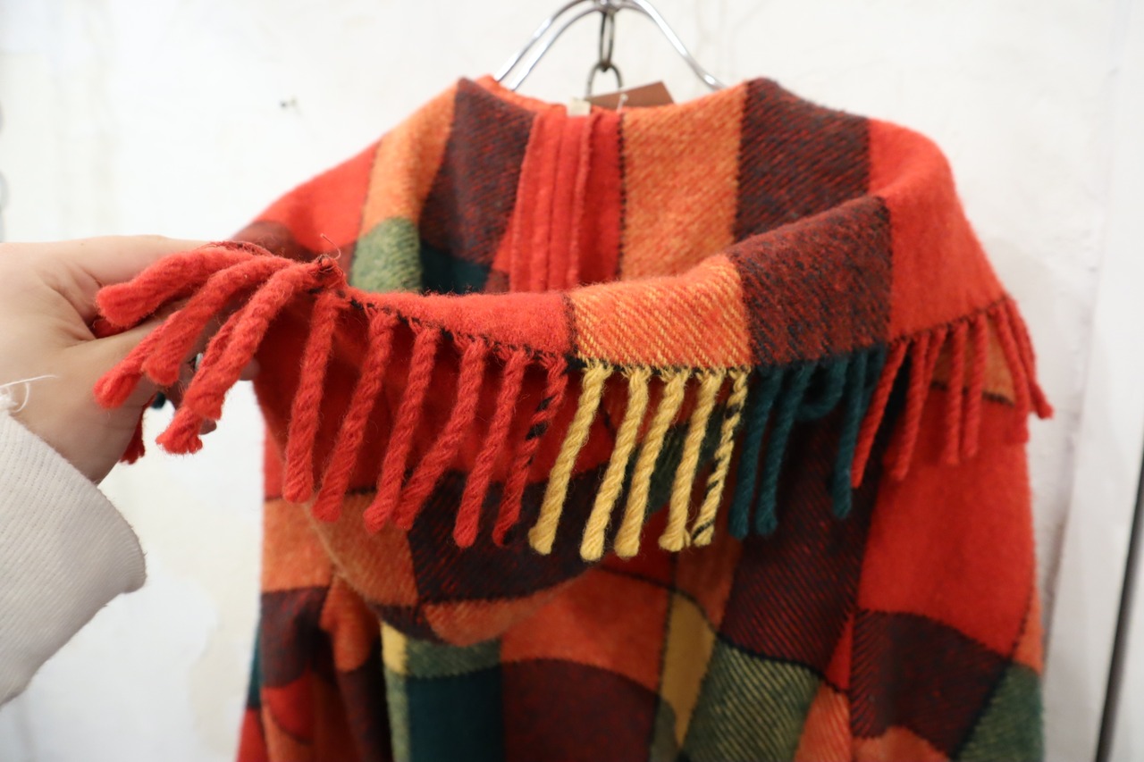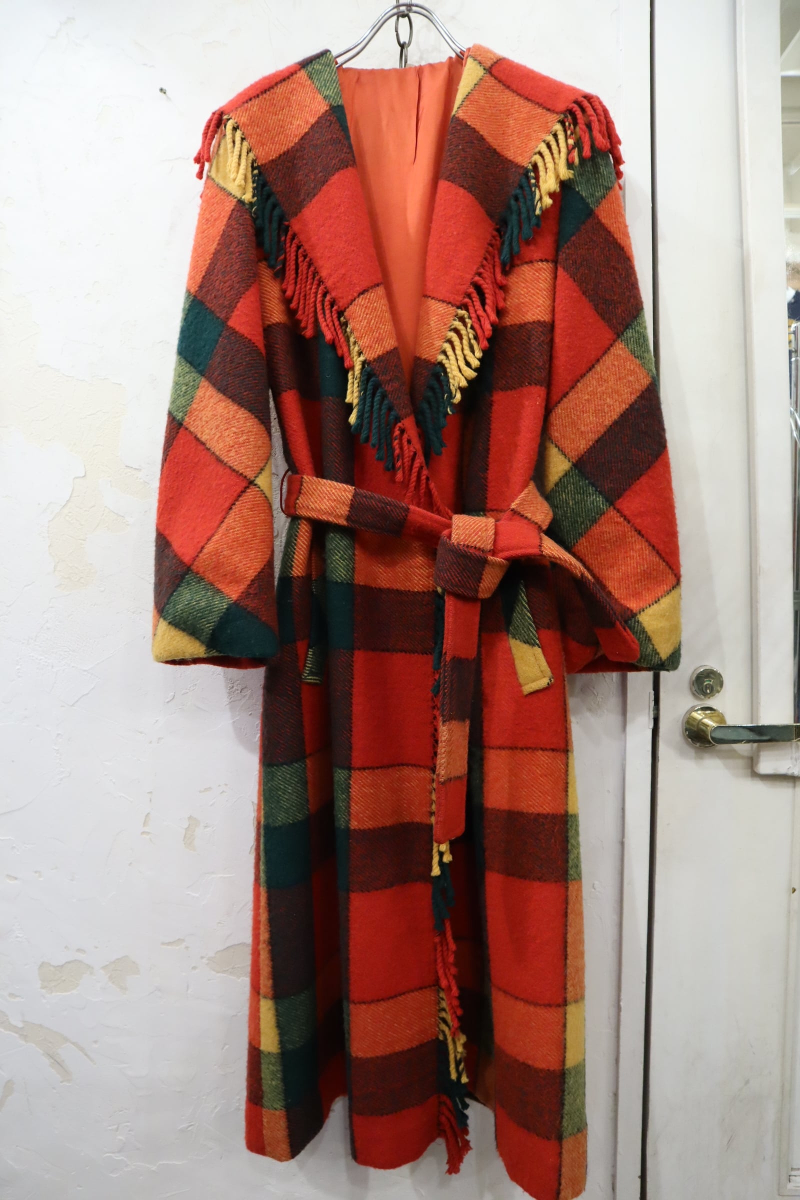 orange×green×yellow plaid wool fringe coat [l-4411]