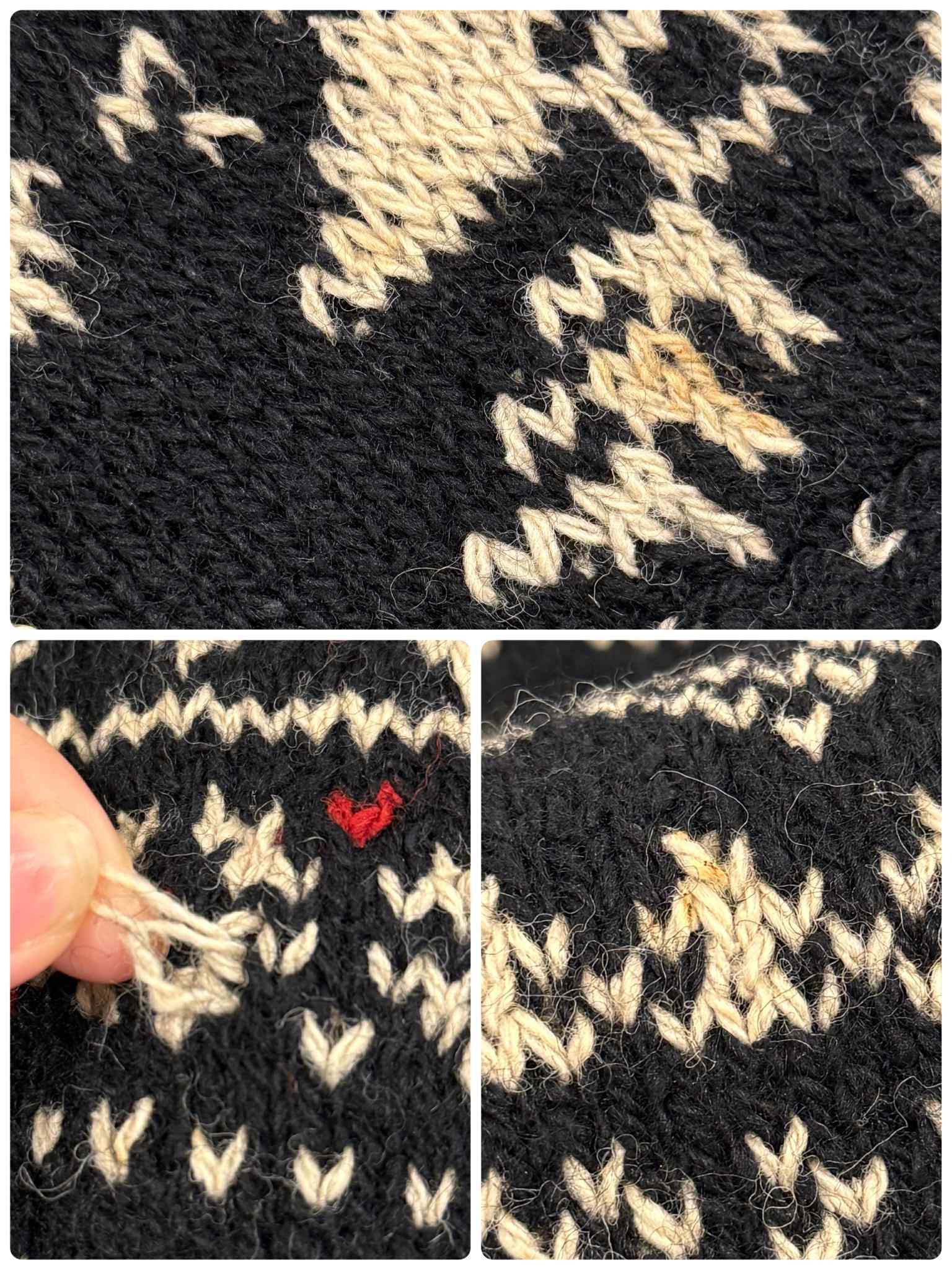 いくつかシミ汚れ、一部糸の飛び出しがございますが、古着の味として着て頂けるかと思います。
