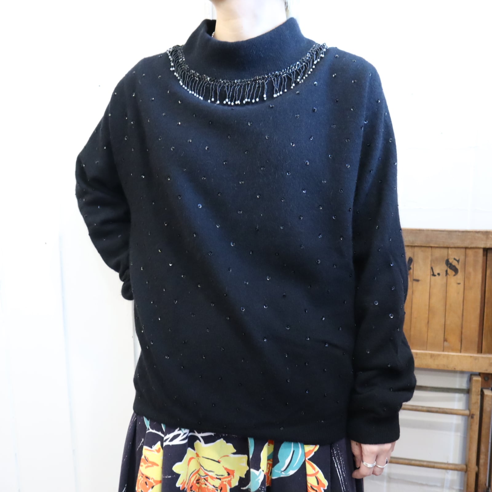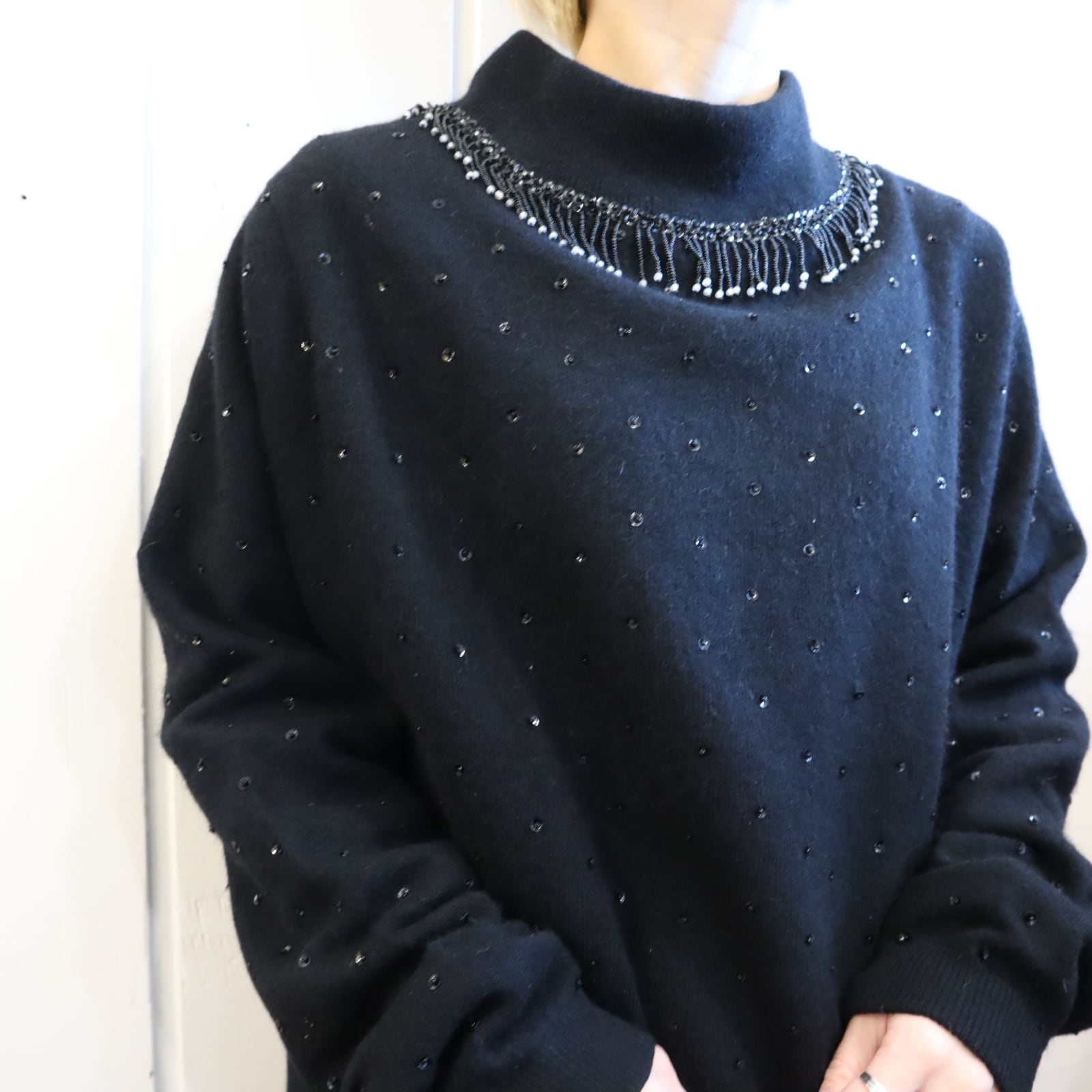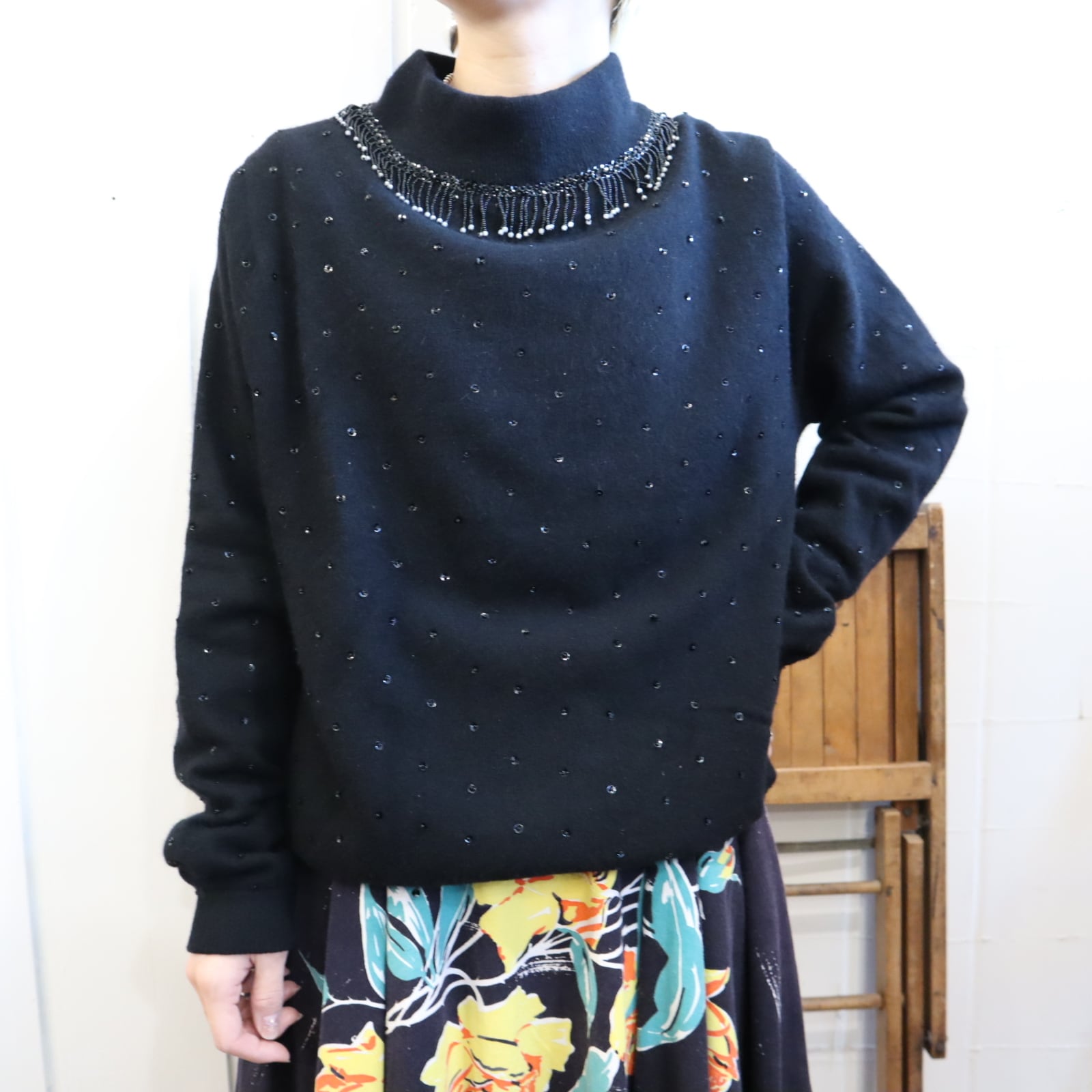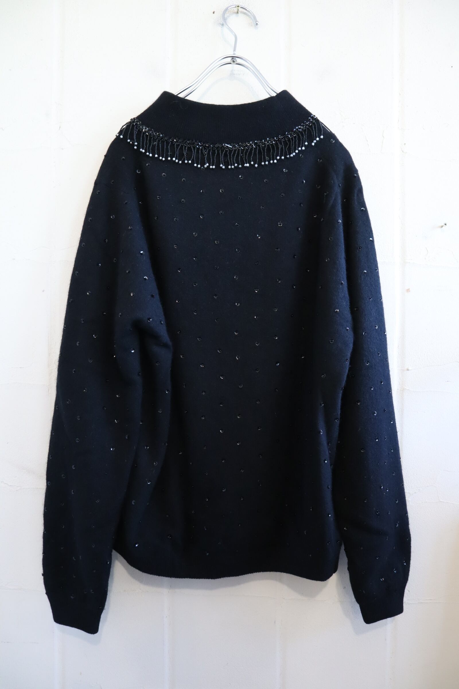 50s-60s black beads & sequins embroidery highneck knit pullover [l-4420]