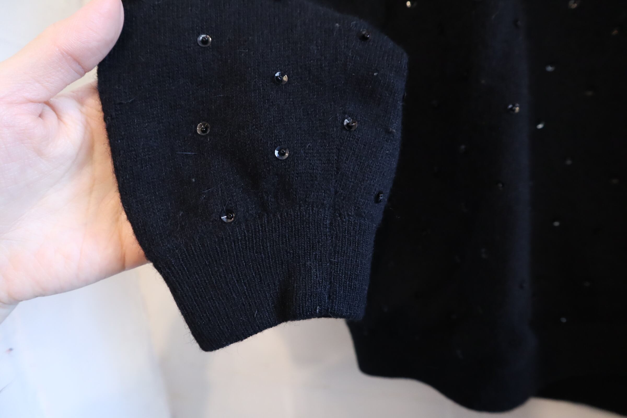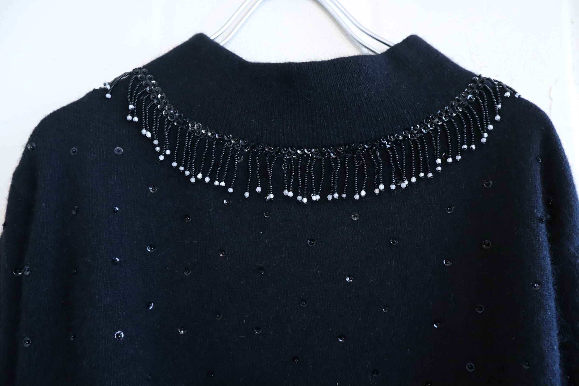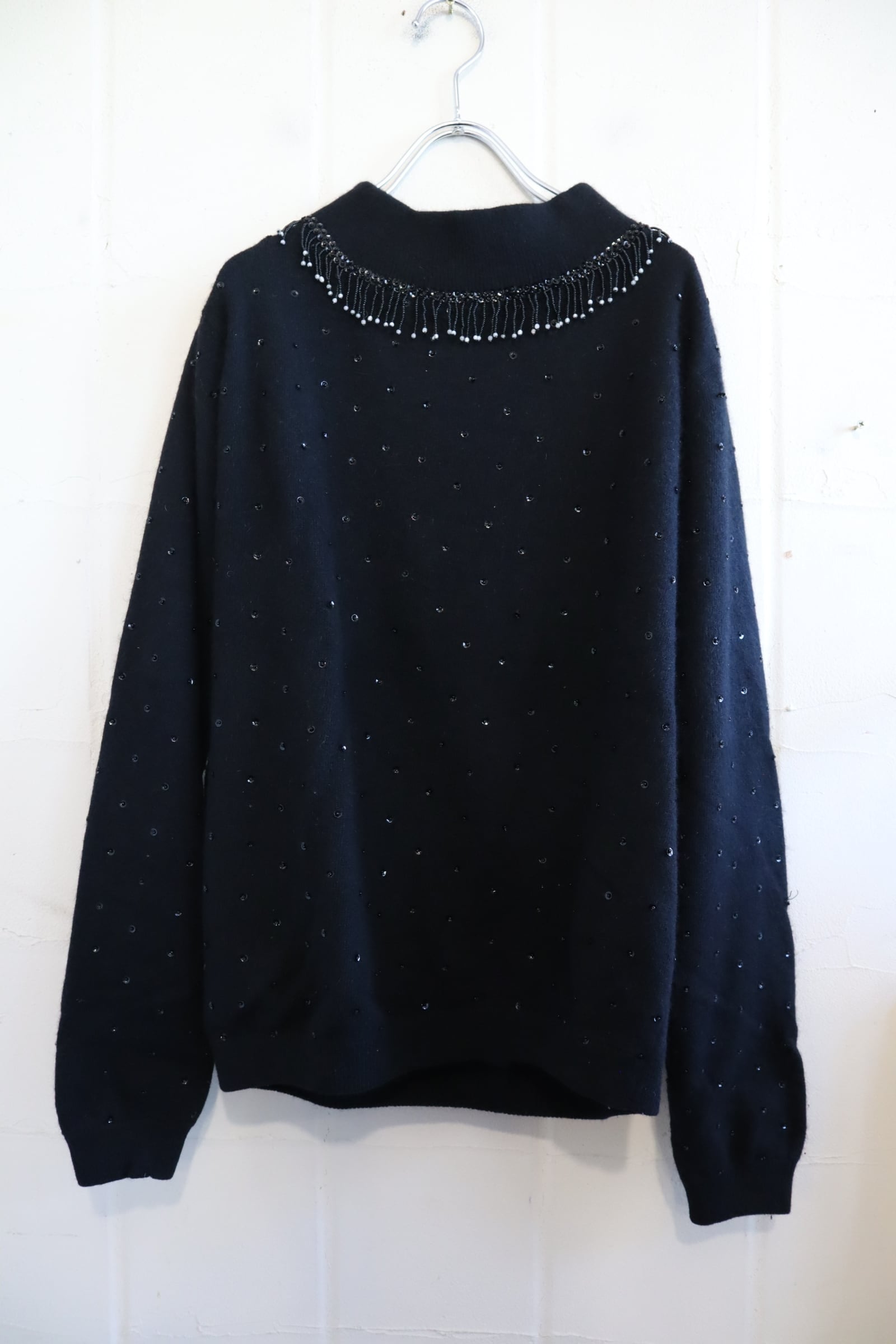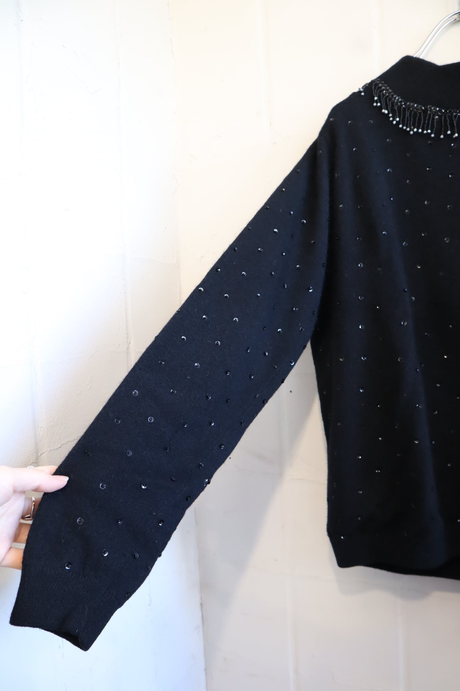 50s-60s black beads & sequins embroidery highneck knit pullover [l-4420]