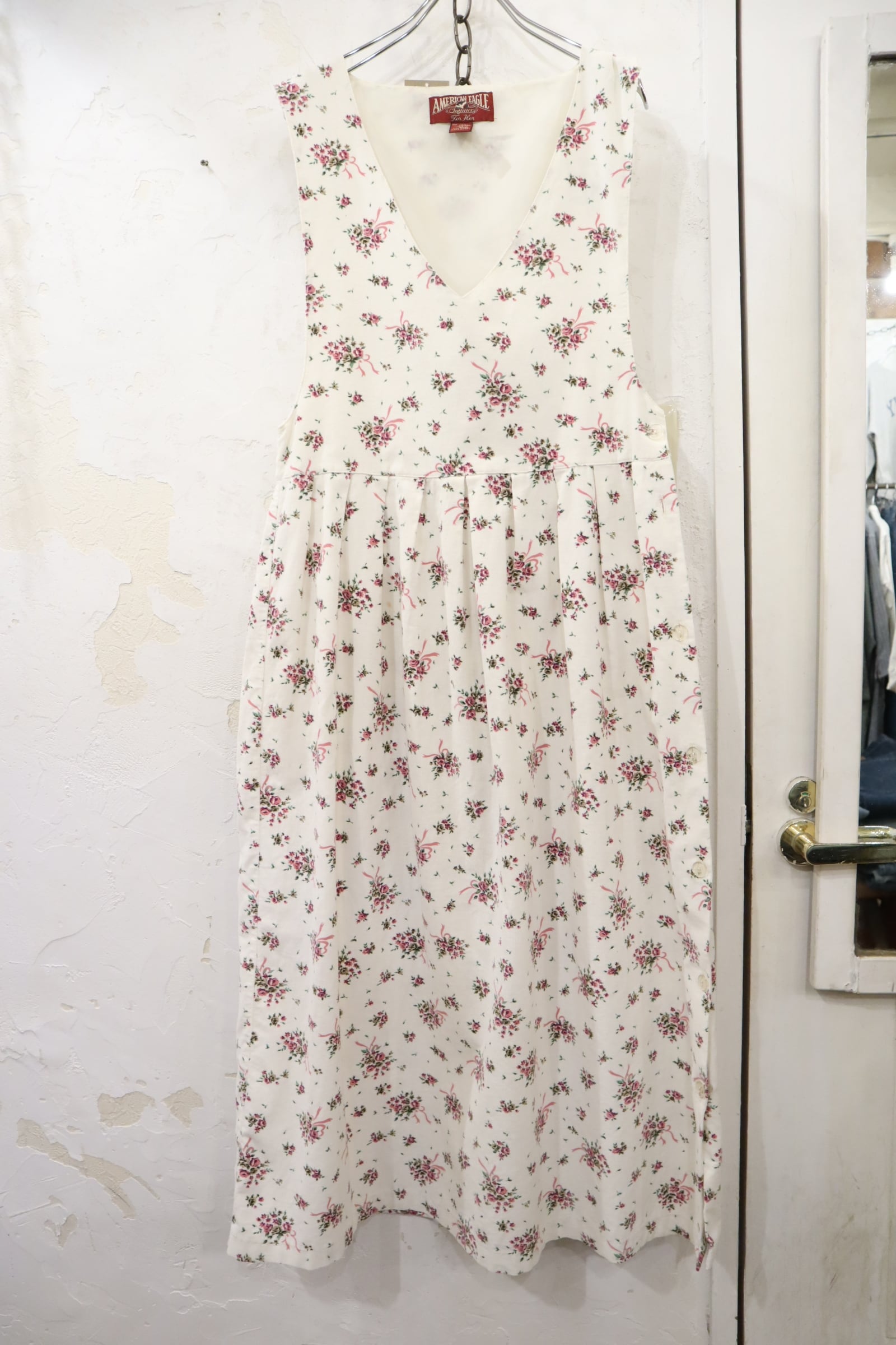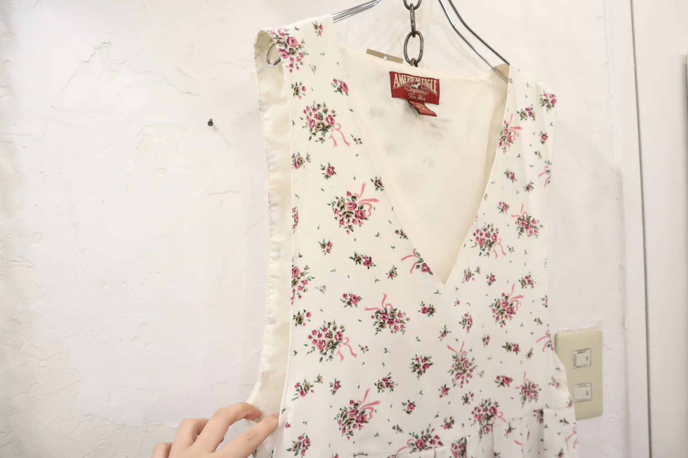 white×pink×green flower pattern sleeveless corduroy dress [l-4446]