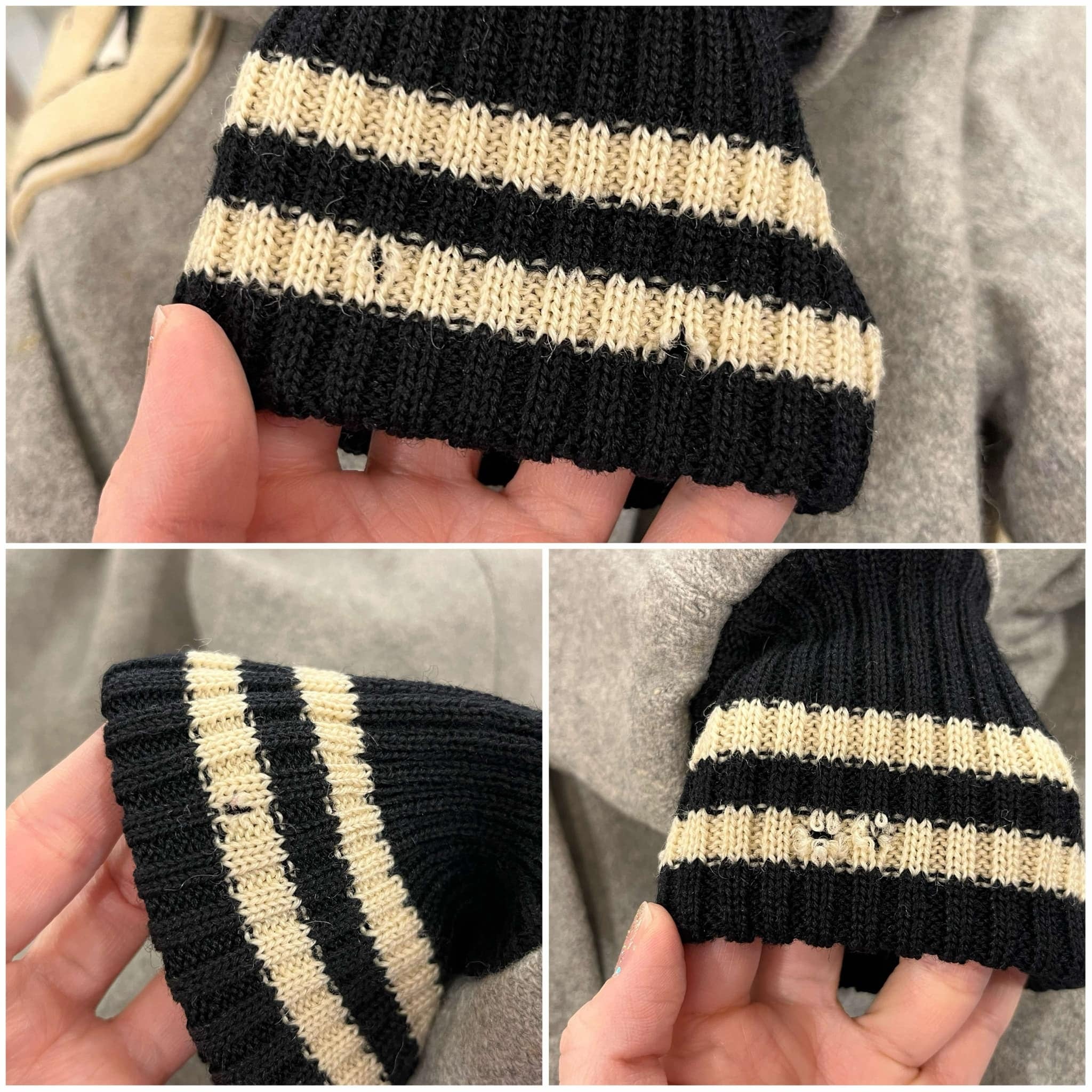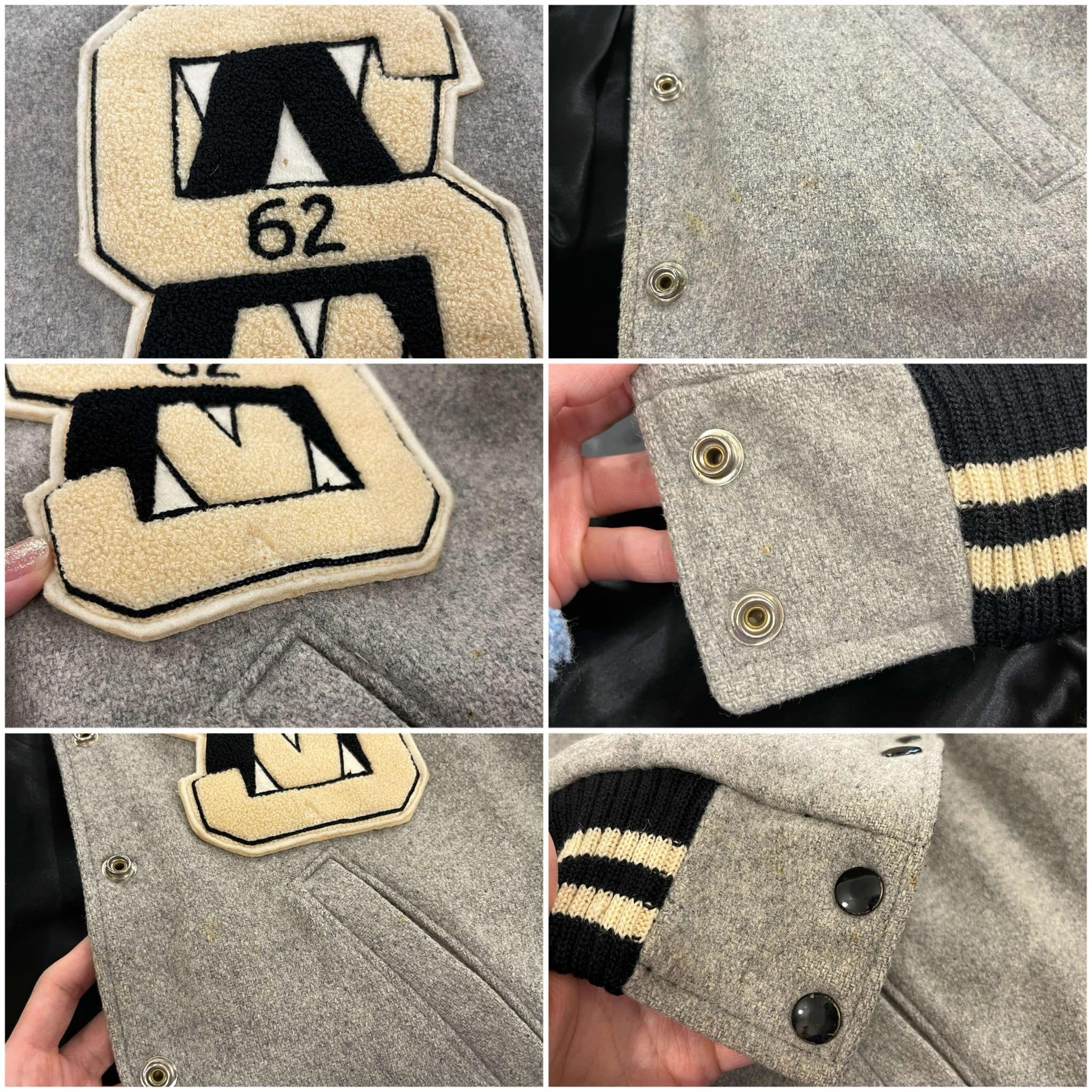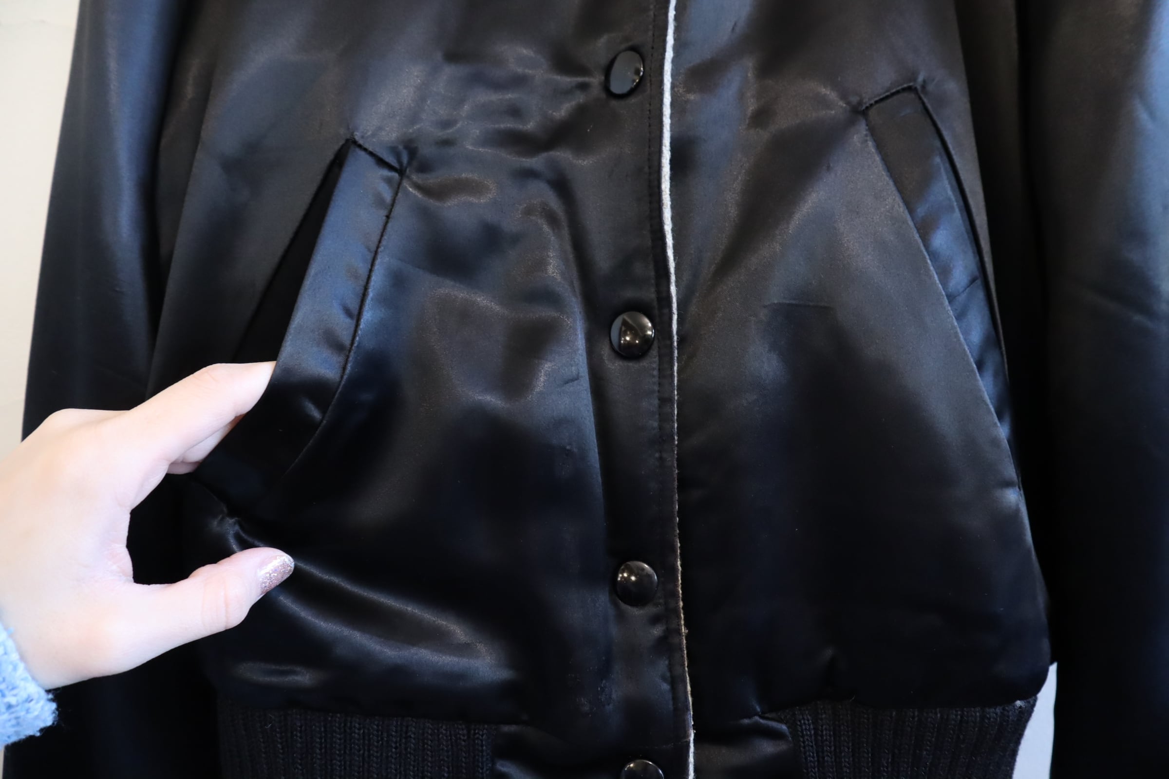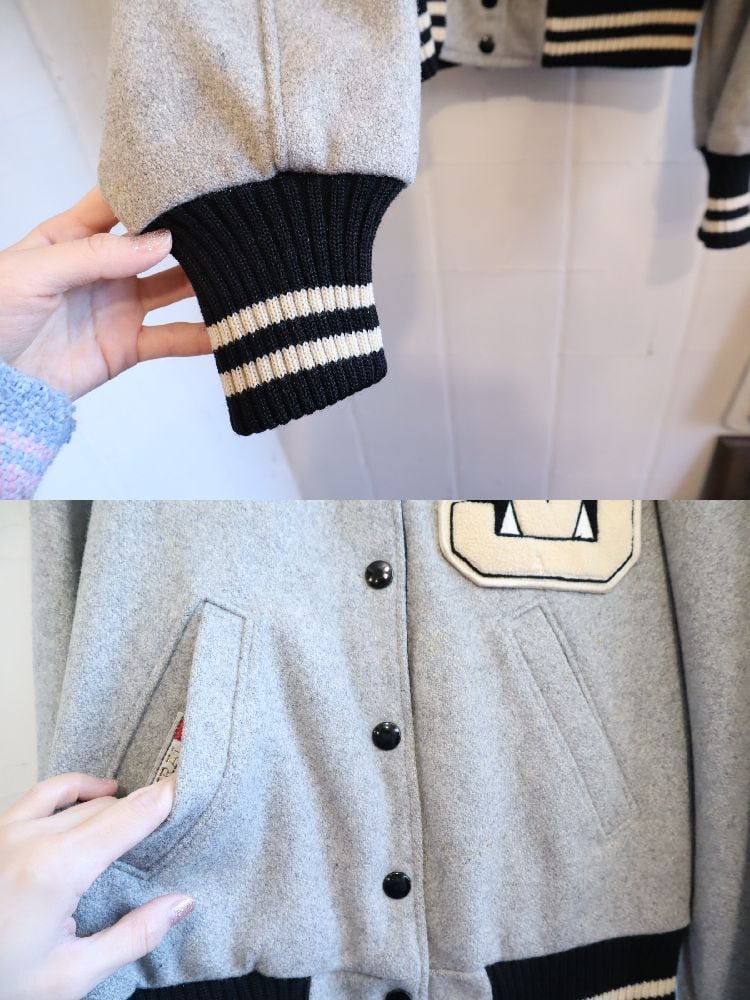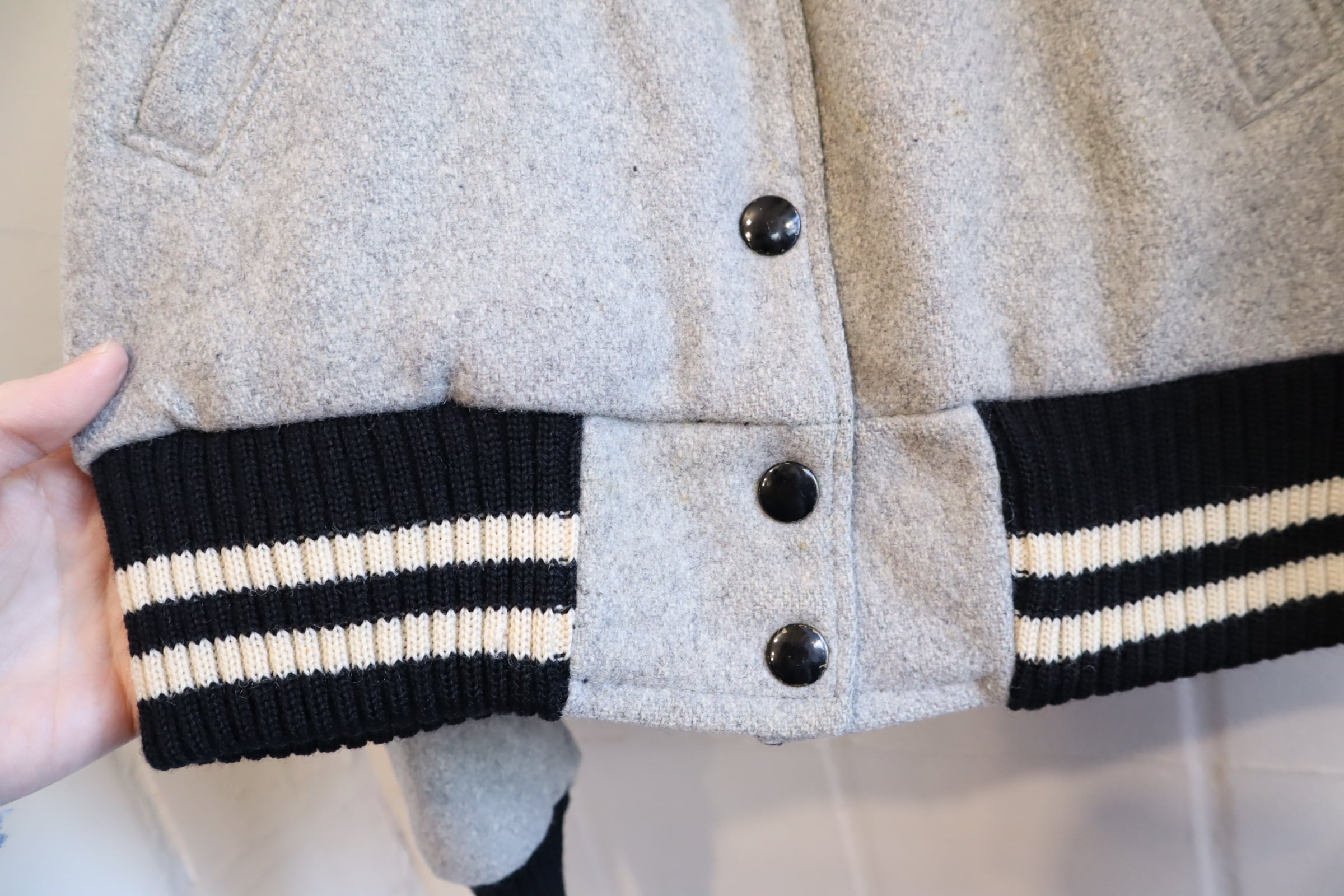 表側→ポケット内側やボディなど所々にシミ、袖にうっすらと色移り、リブやワッペンの表面にキズが見受けられますが、いずれも古着の味として着て頂けるかと思います。