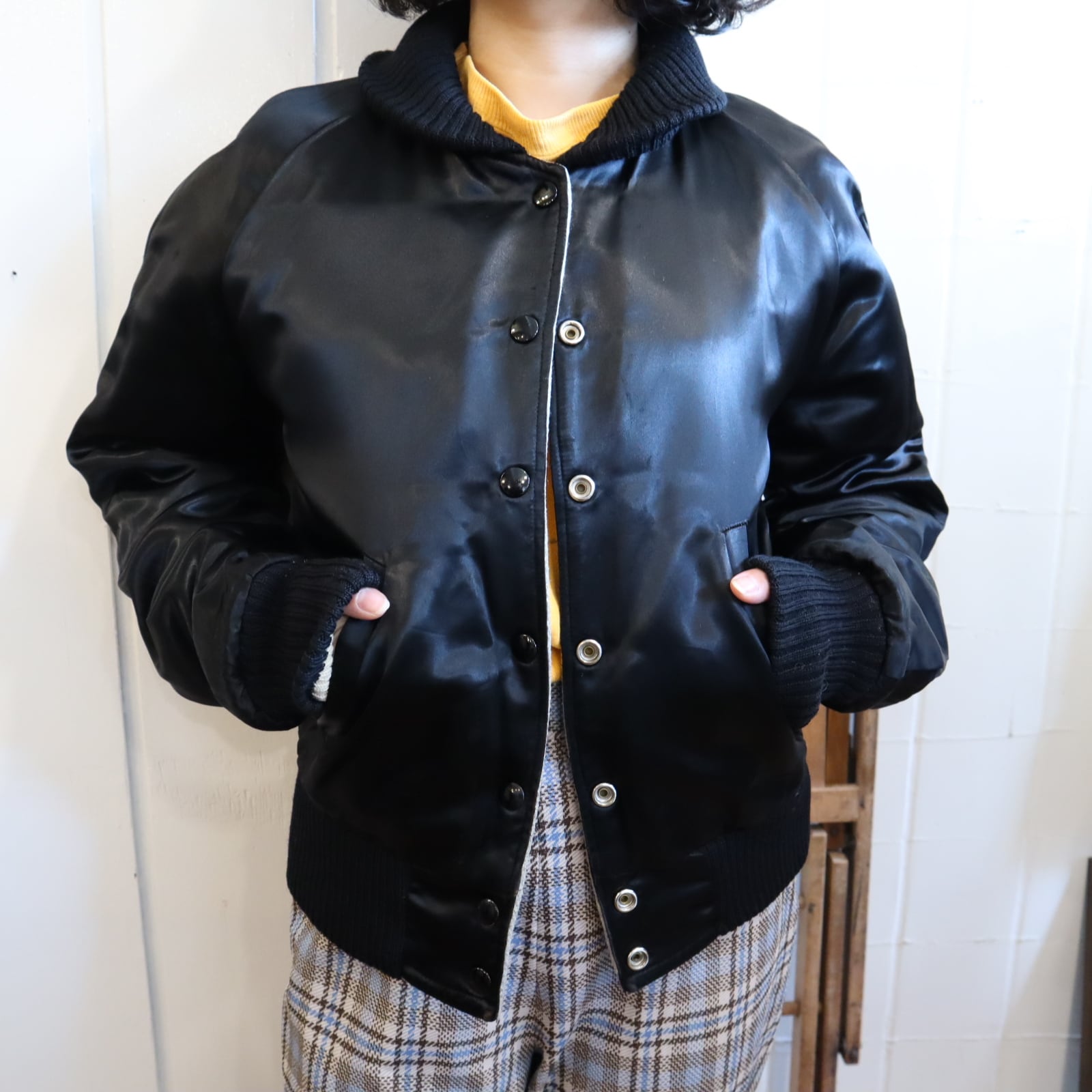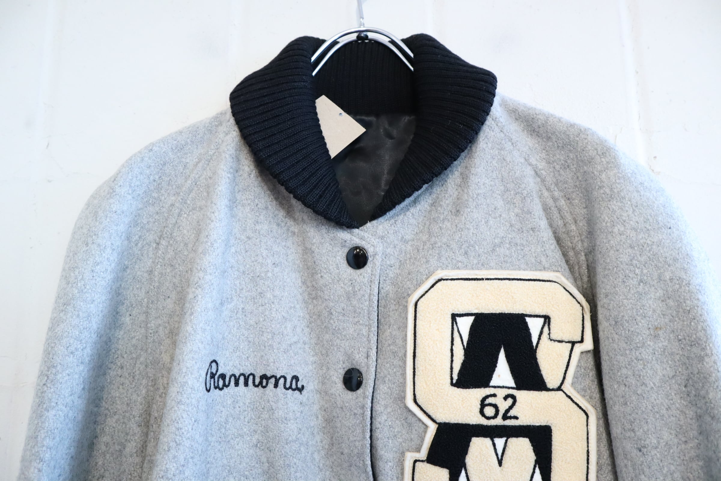 ショールカラーの襟やヴィンテージらしいワッペンと刺繍の雰囲気が素敵なスタジアムジャンパー。