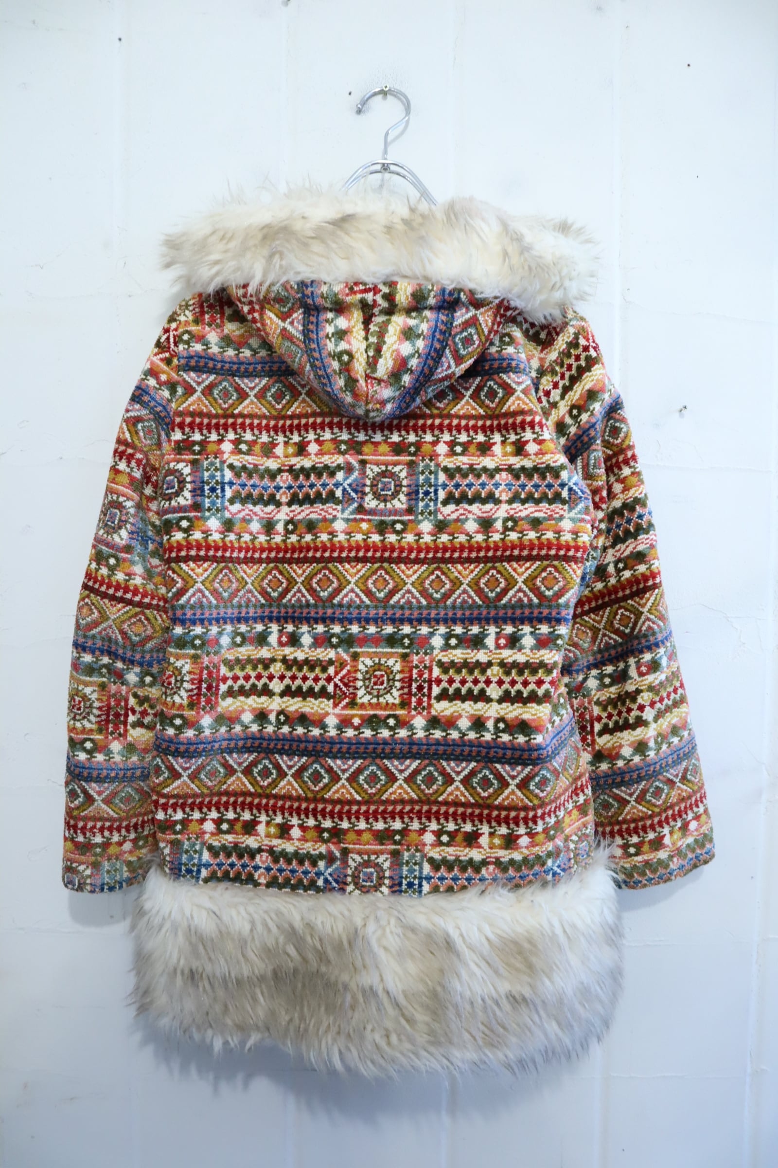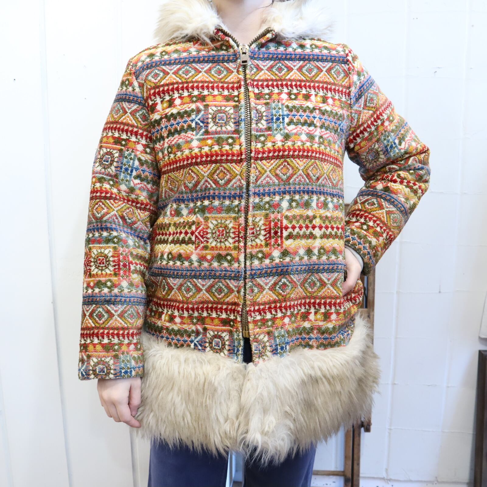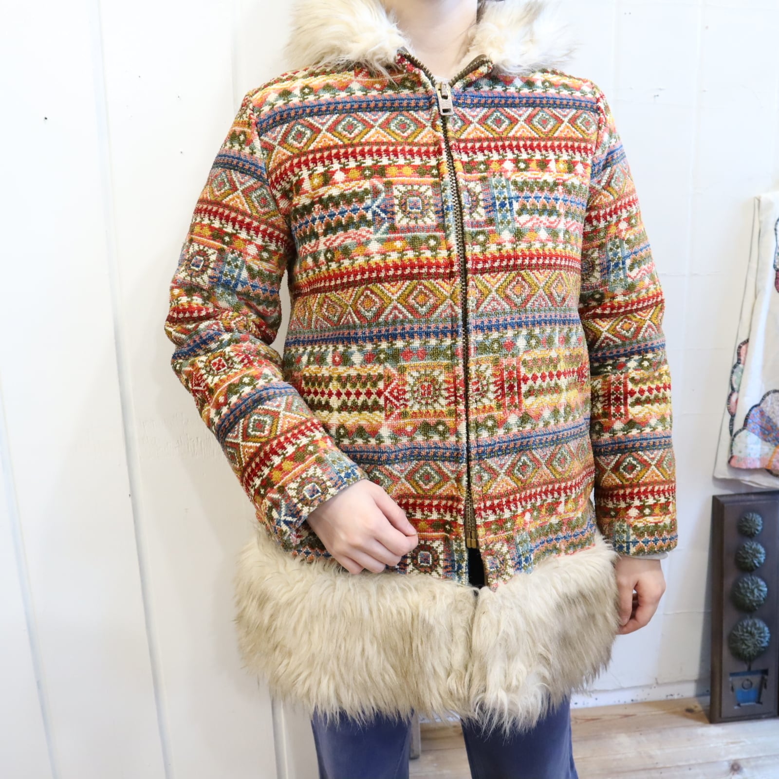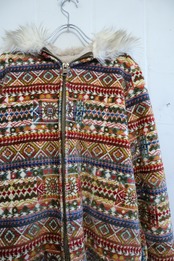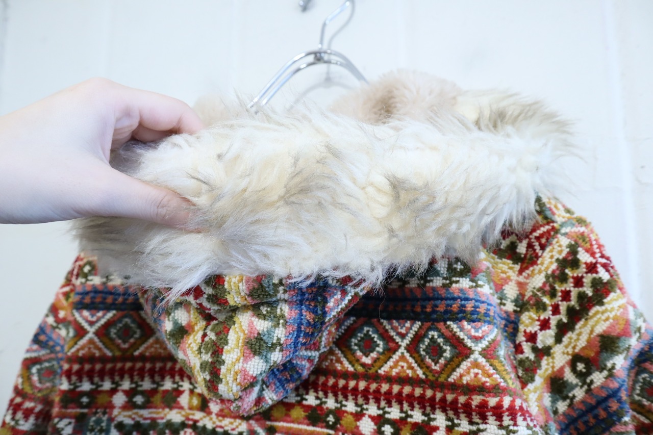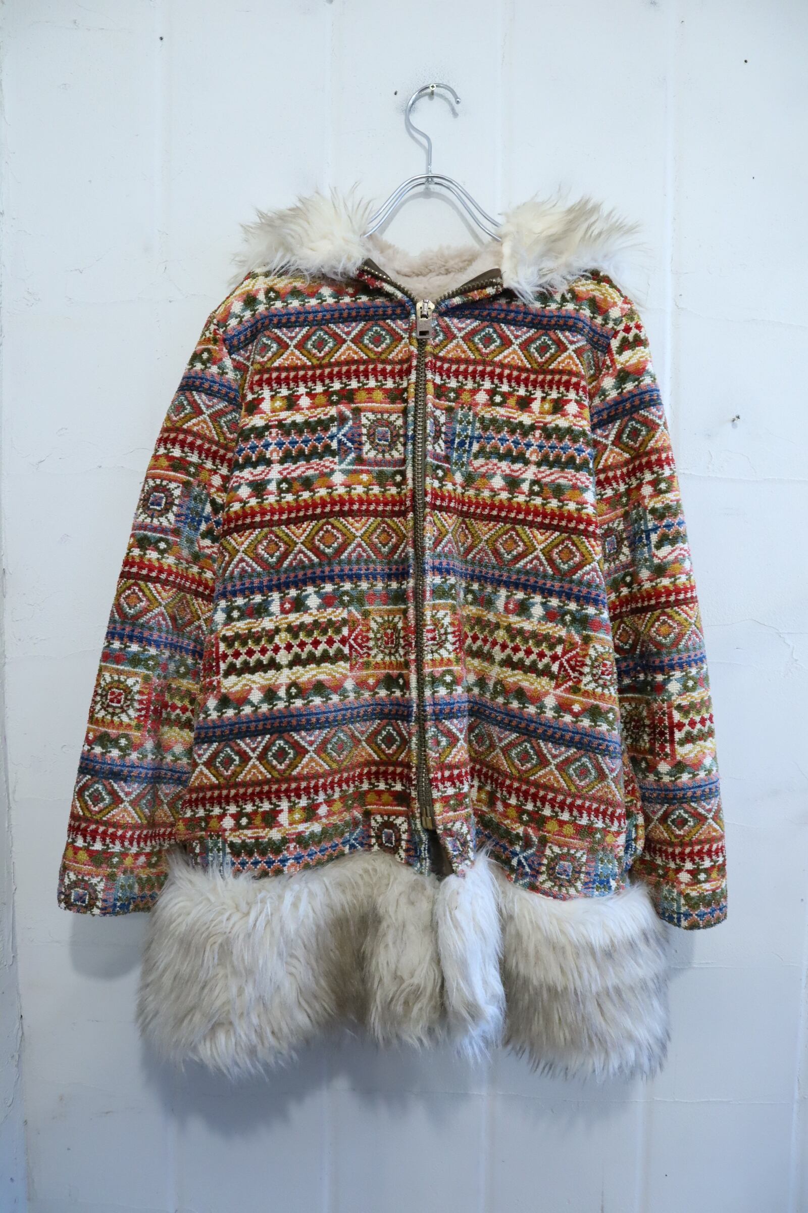 -70s beige×colorful fakefur switching gobelin hood jacket [l-4496]