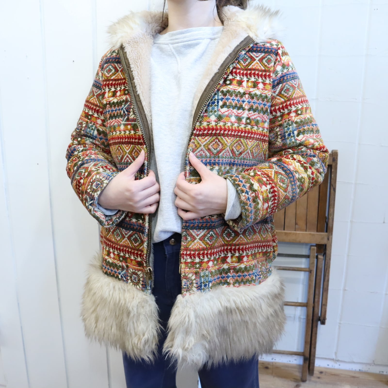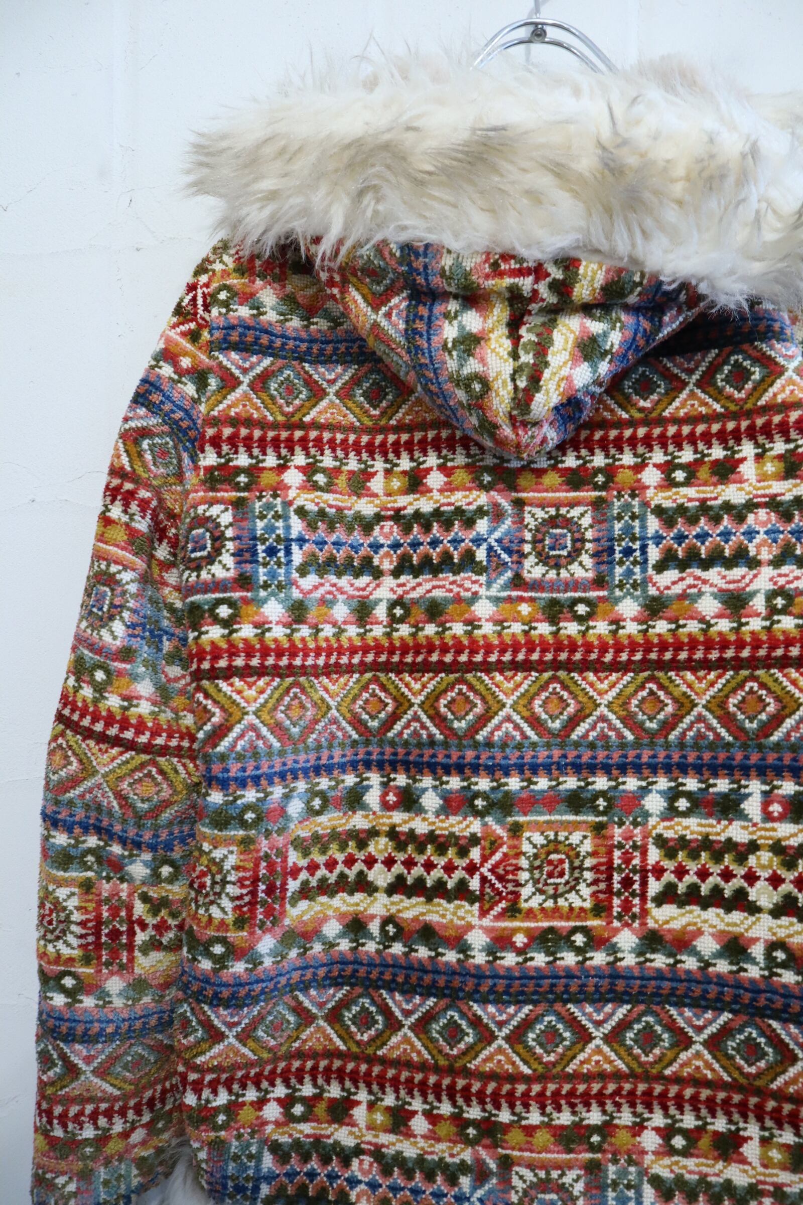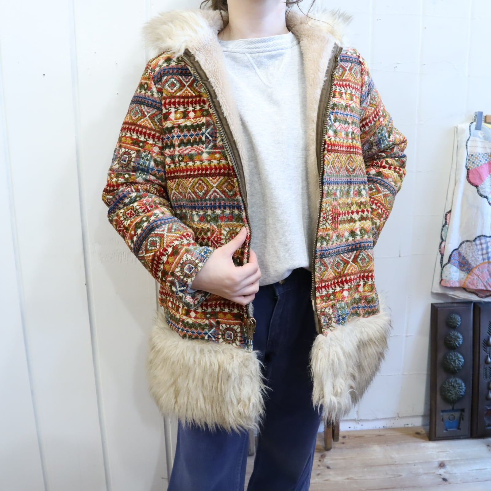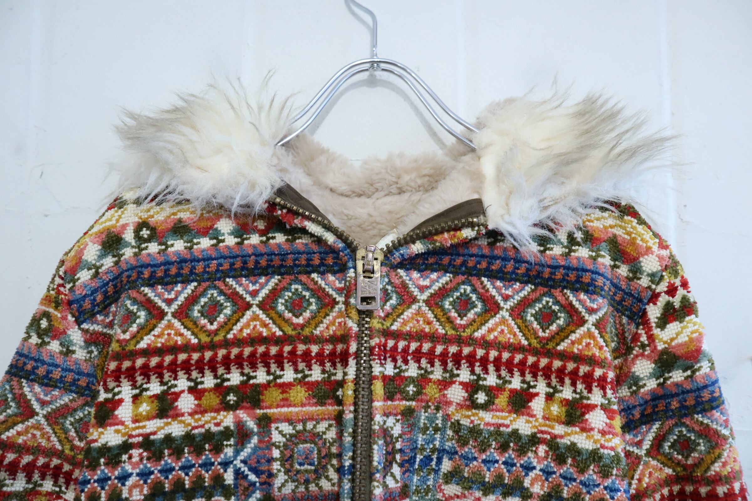 -70s beige×colorful fakefur switching gobelin hood jacket [l-4496]