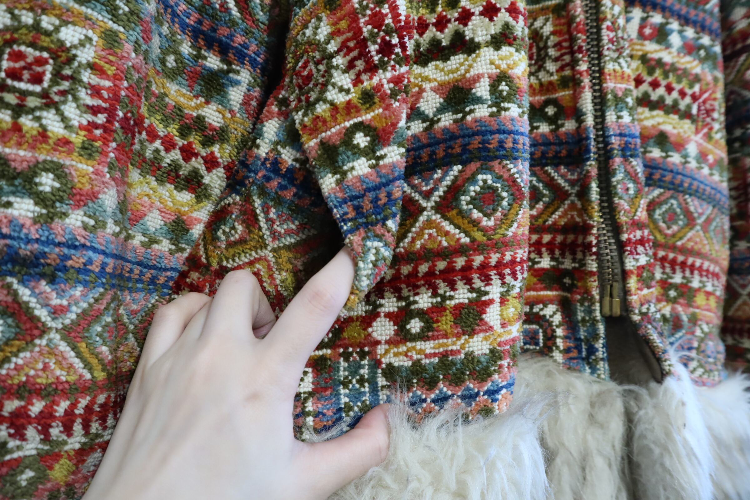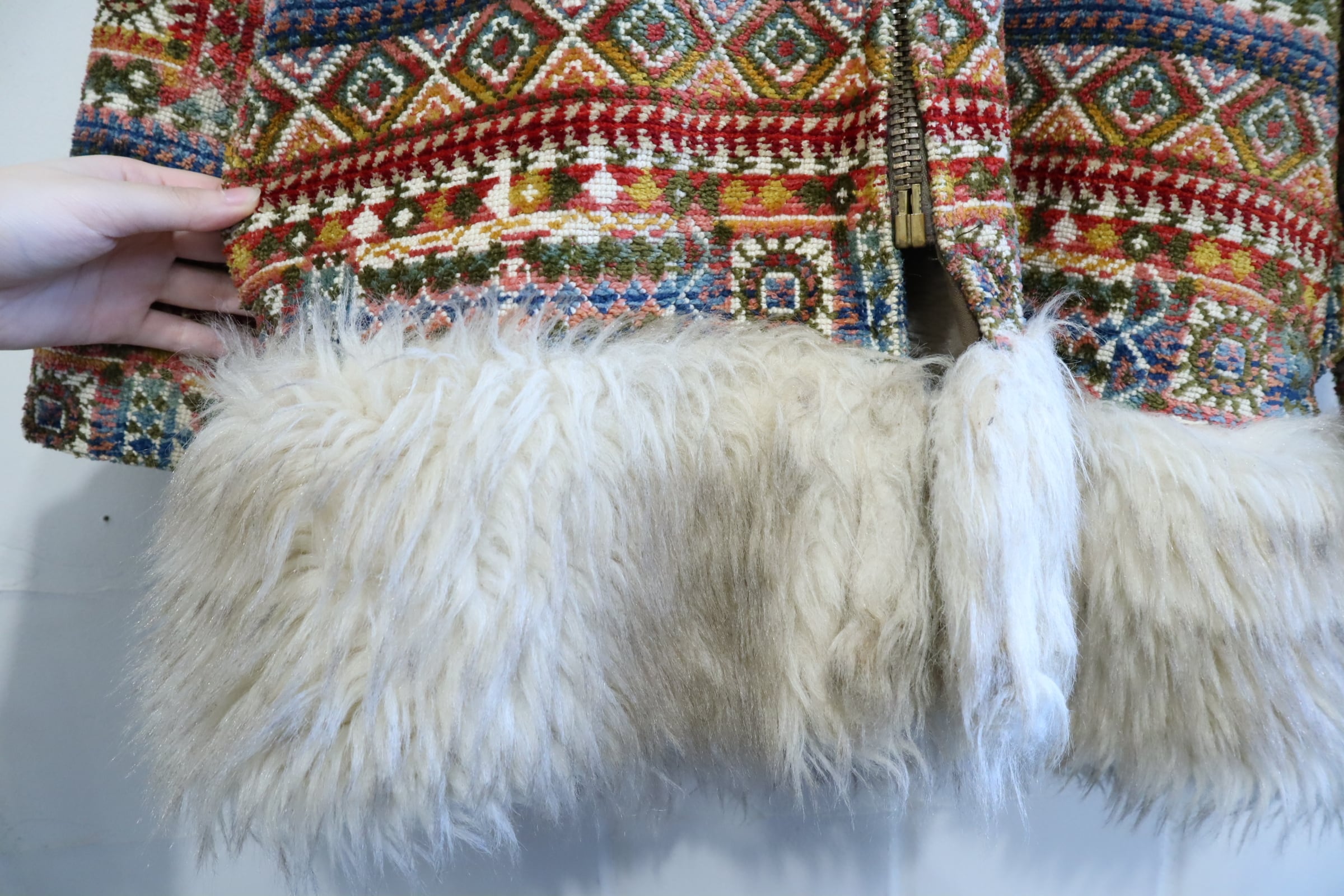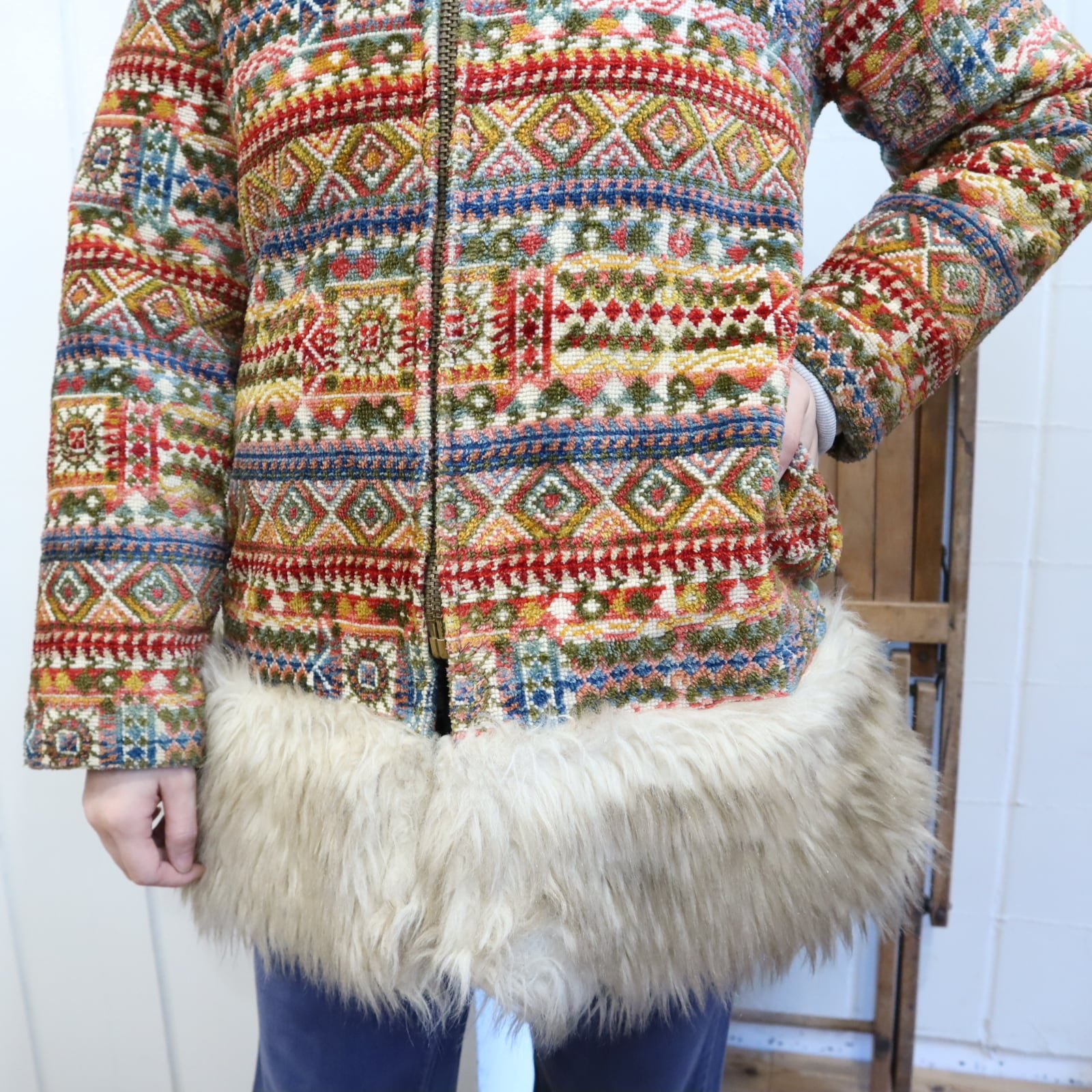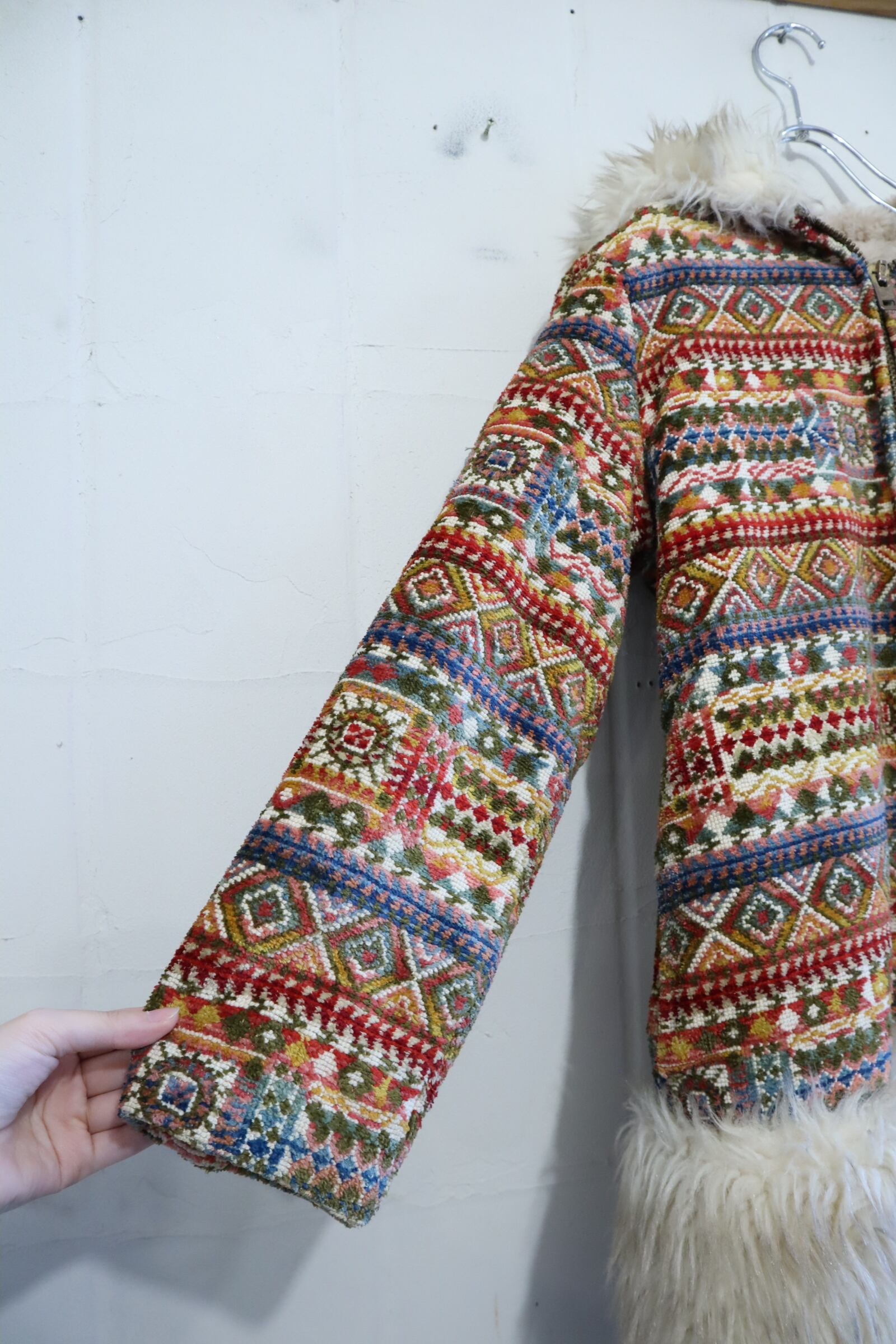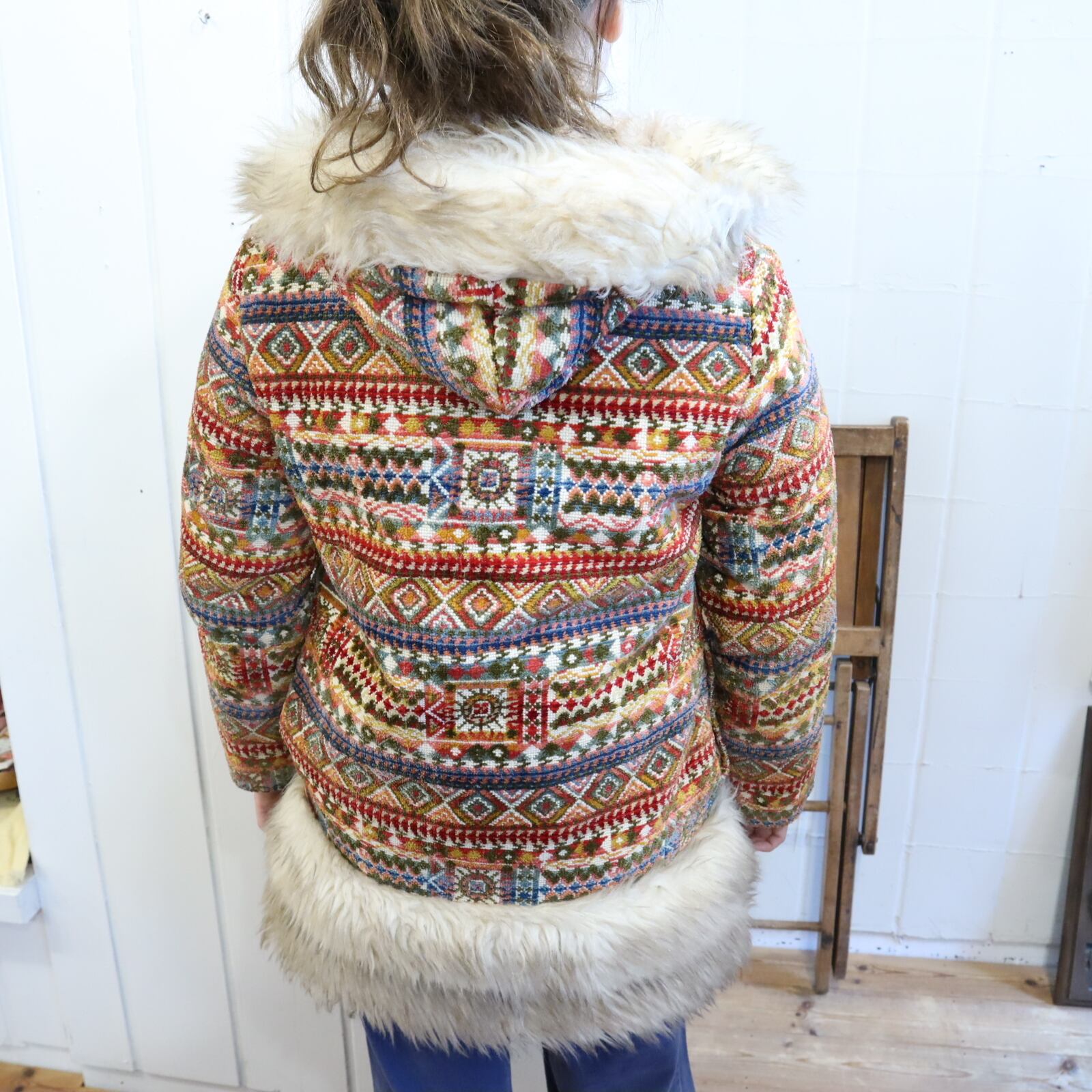 -70s beige×colorful fakefur switching gobelin hood jacket [l-4496]