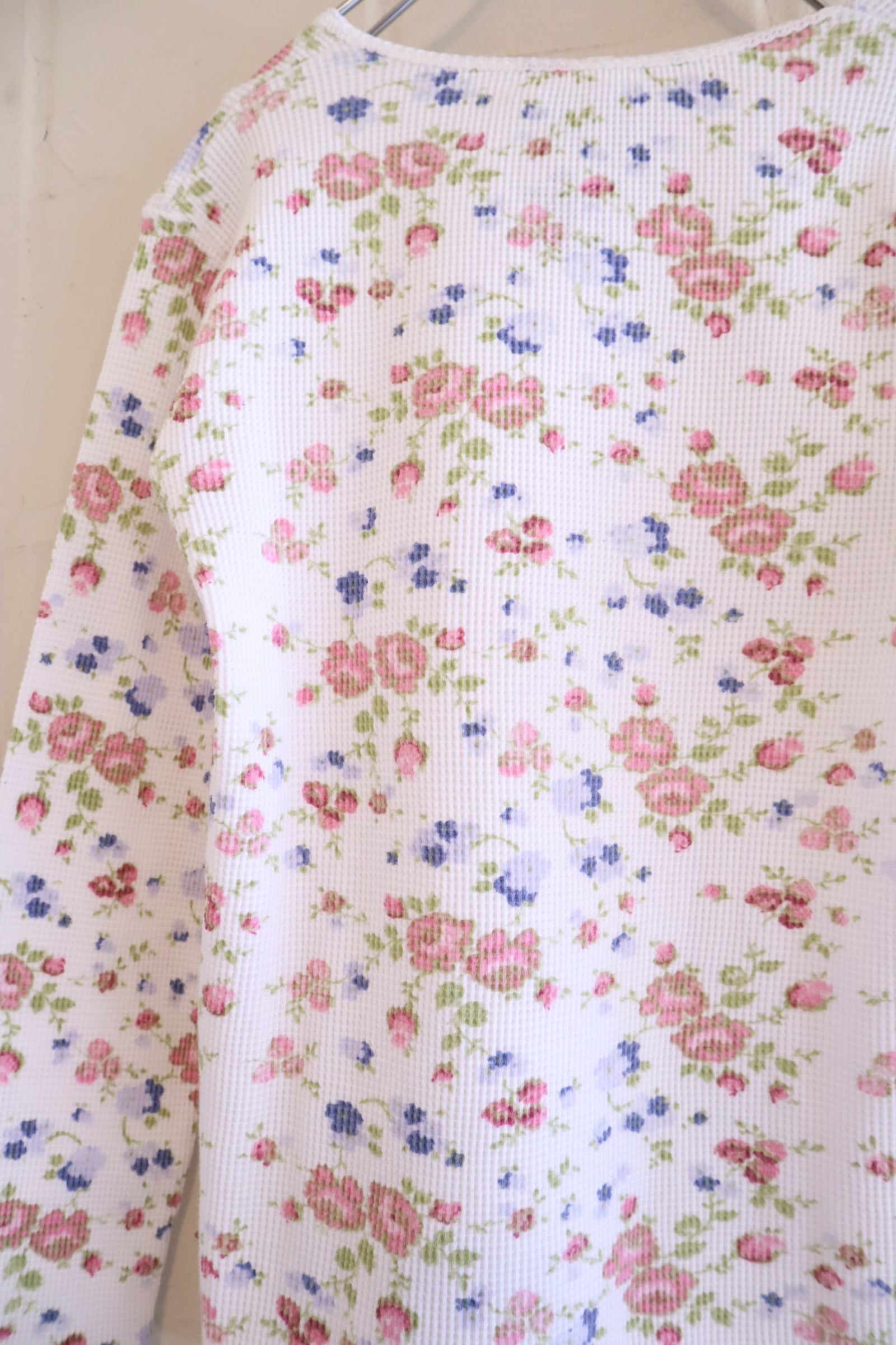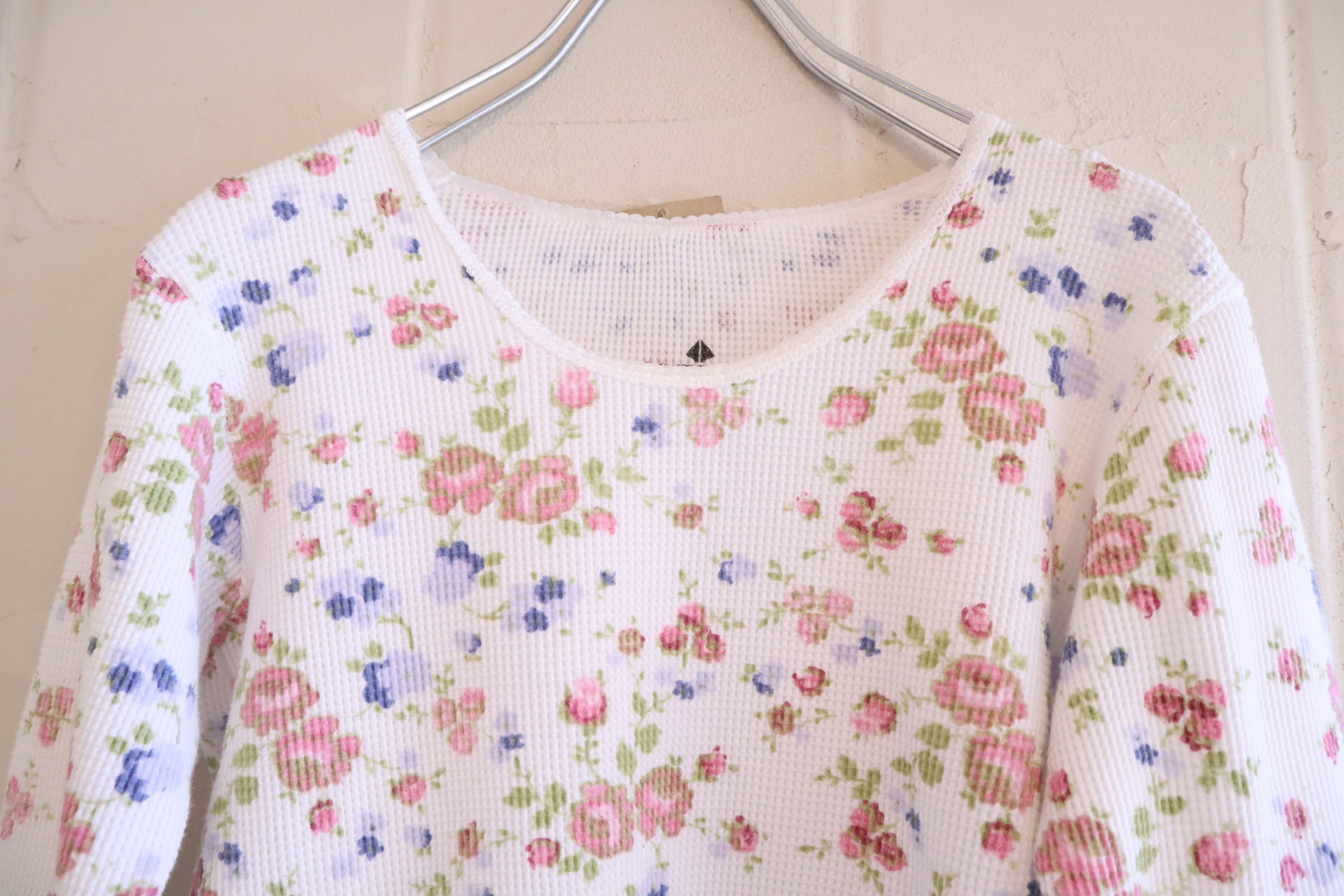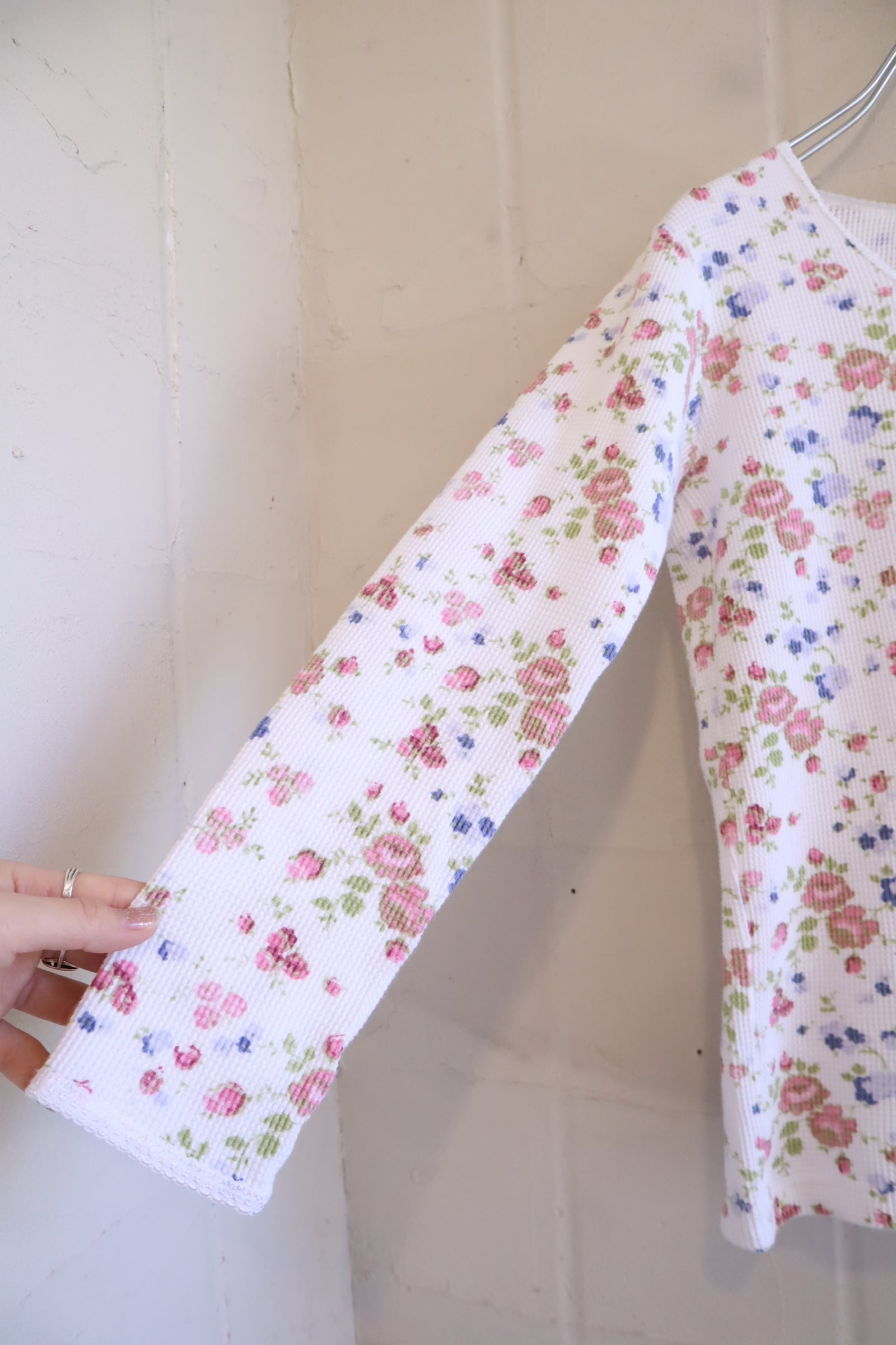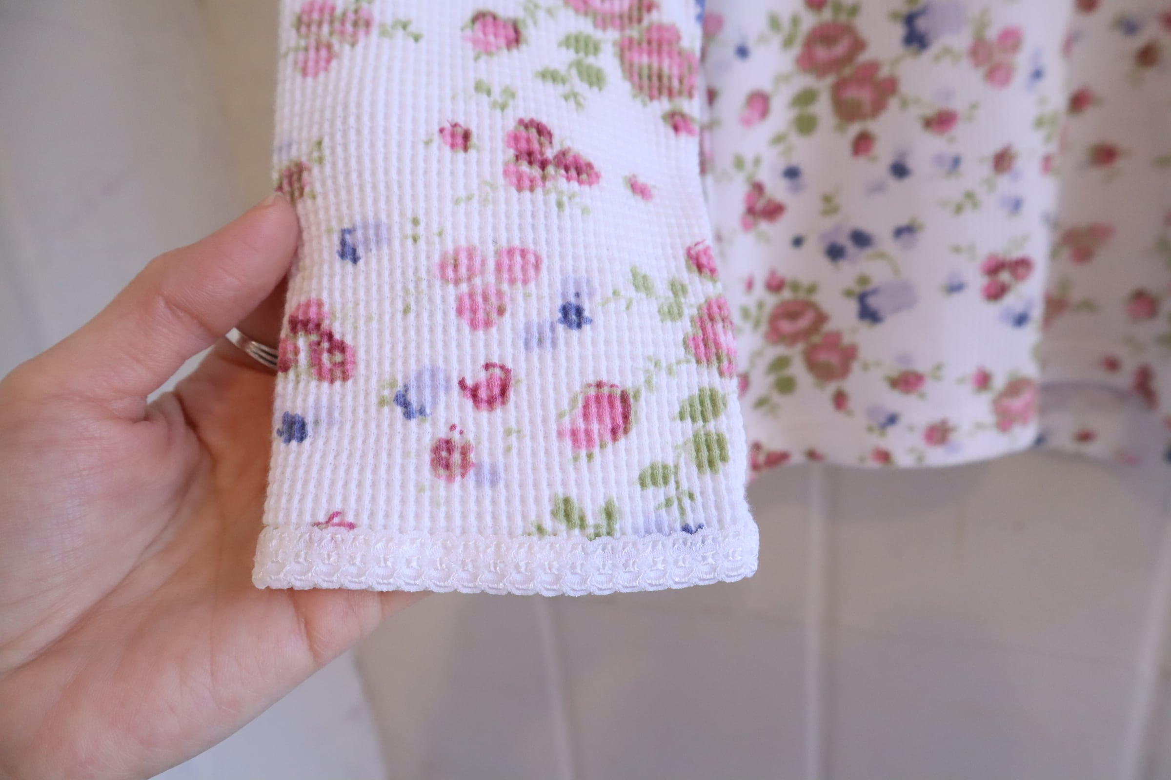 ネックラインや袖口に付いたレースが可愛いワッフルサーマルトップ。