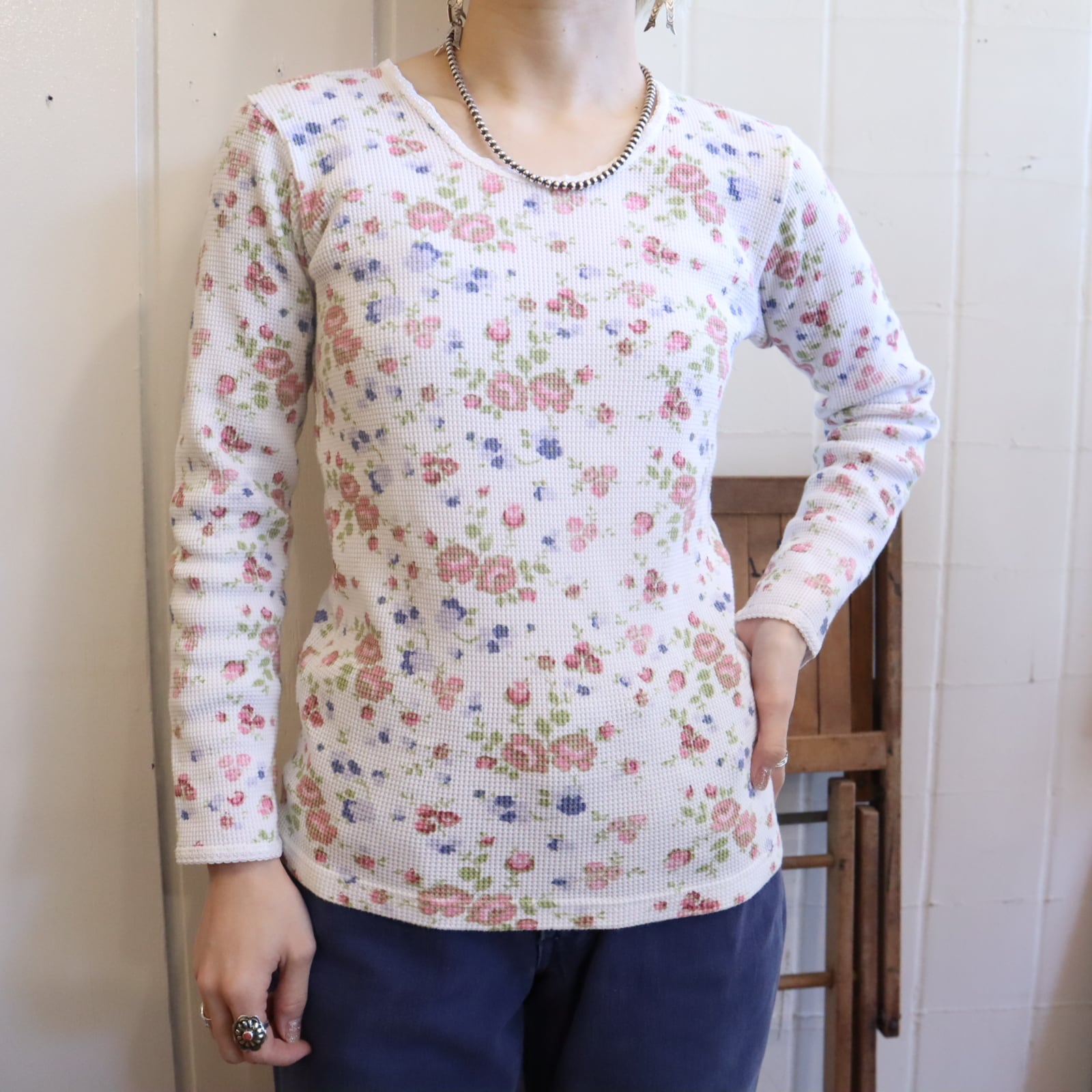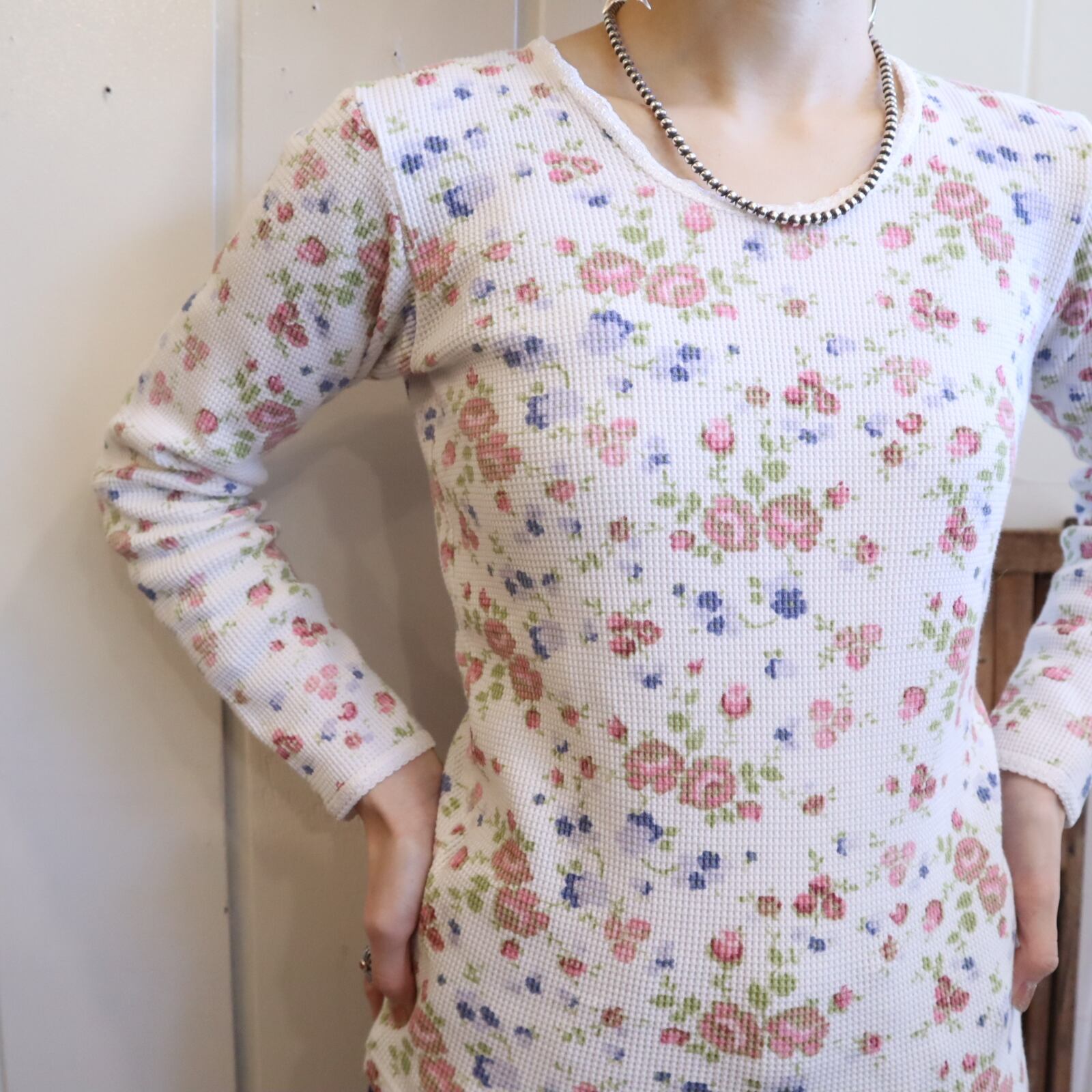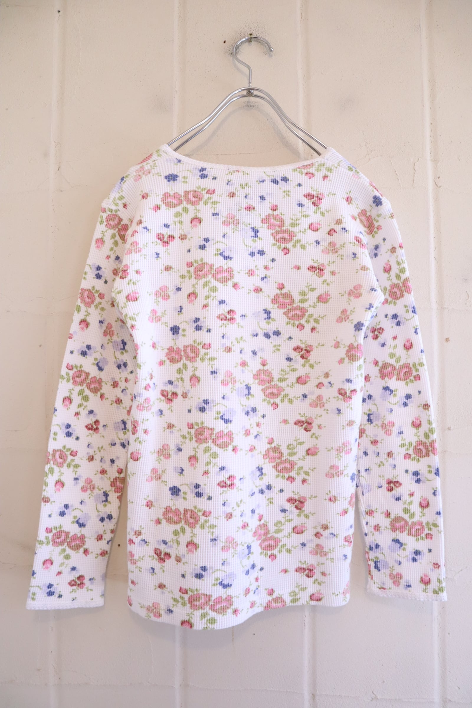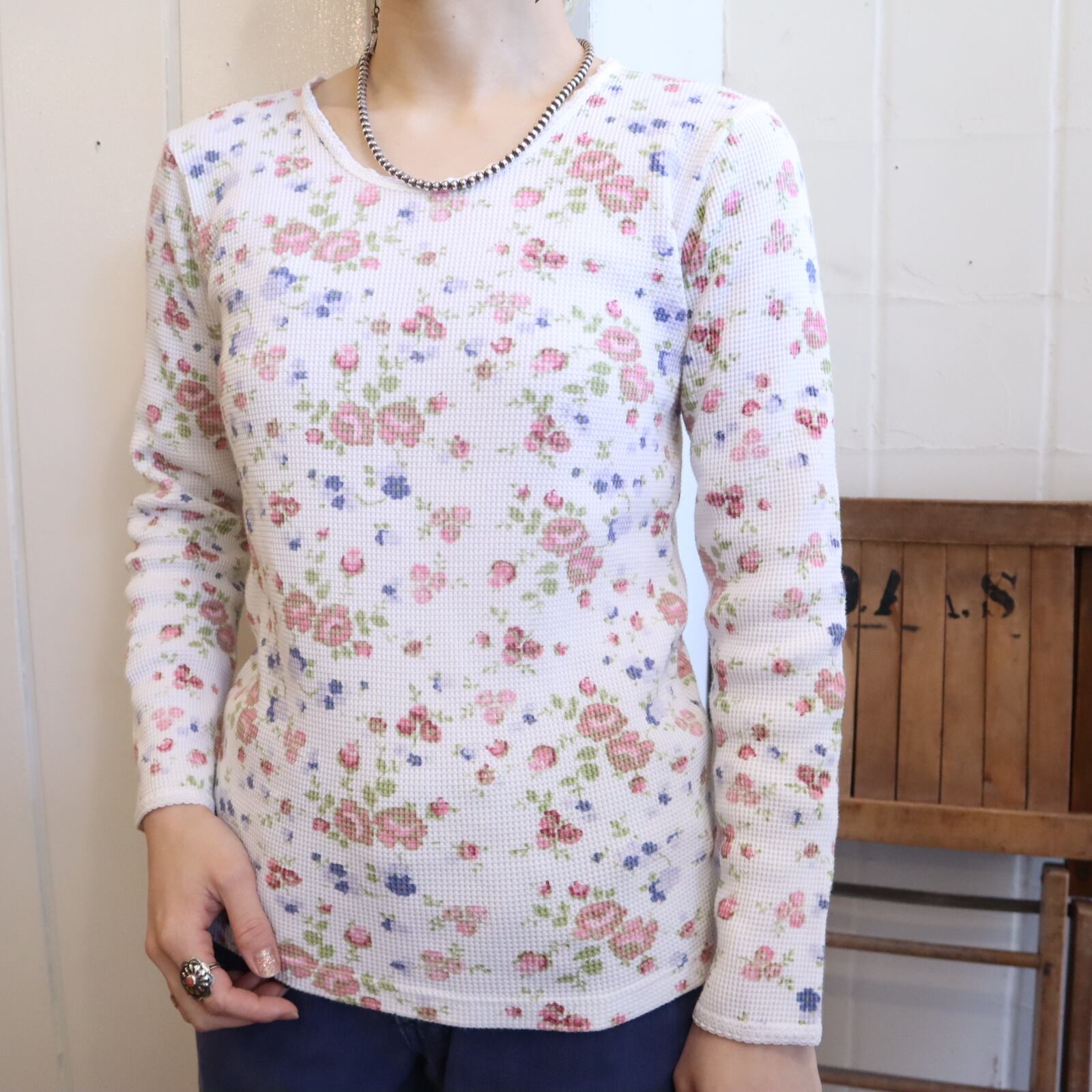 ネックラインや袖口に付いたレースが可愛いワッフルサーマルトップ。