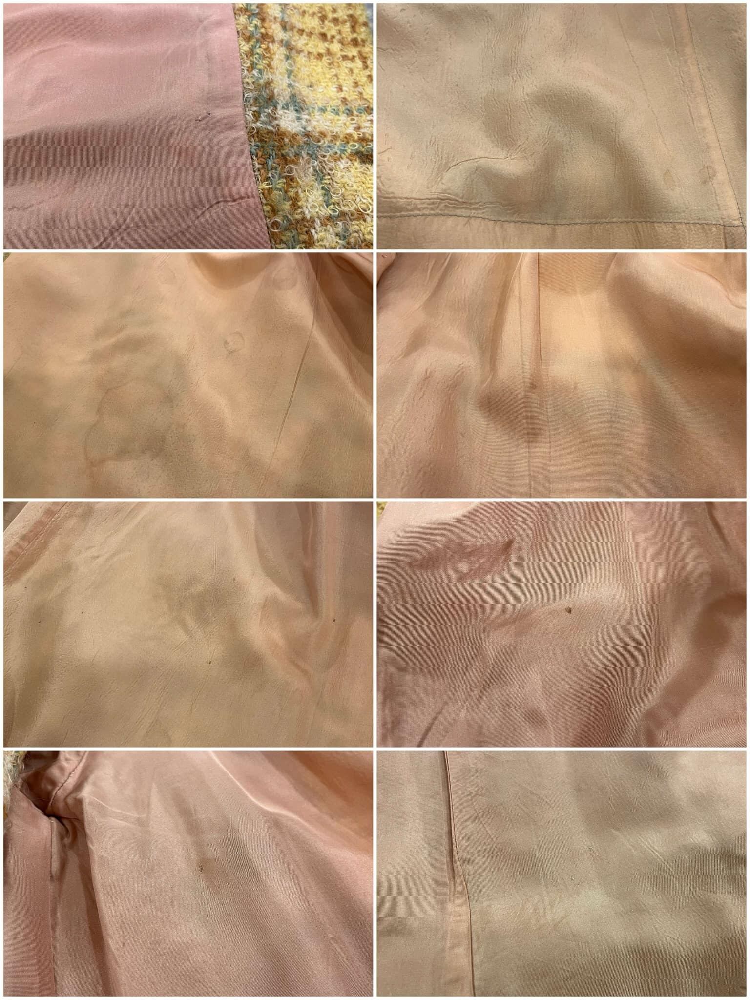 裏地にいくつかシミ汚れ・キズ、表地に一部点ほどの汚れ・ツレがございますが、古着の味として着ていただけるかと思います。