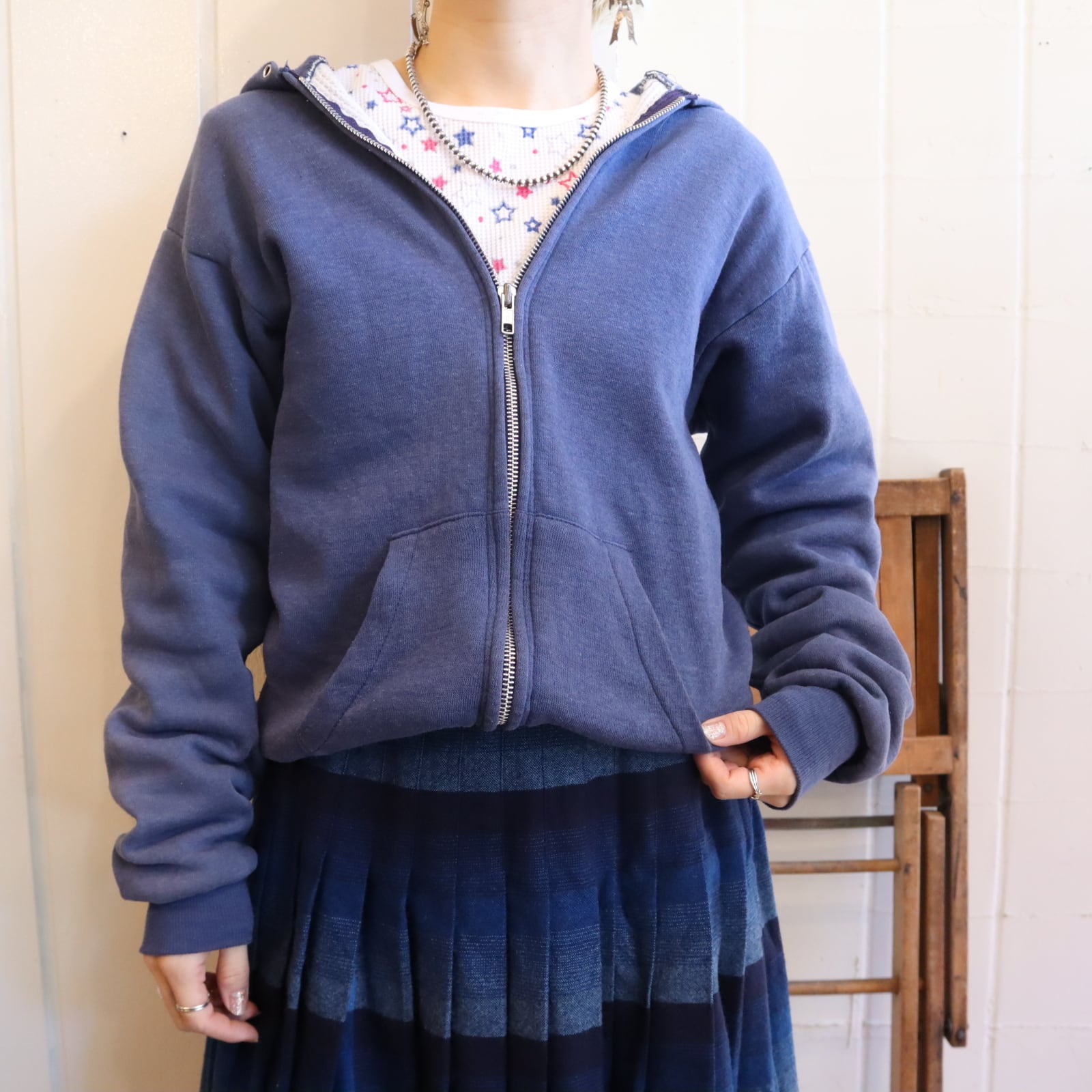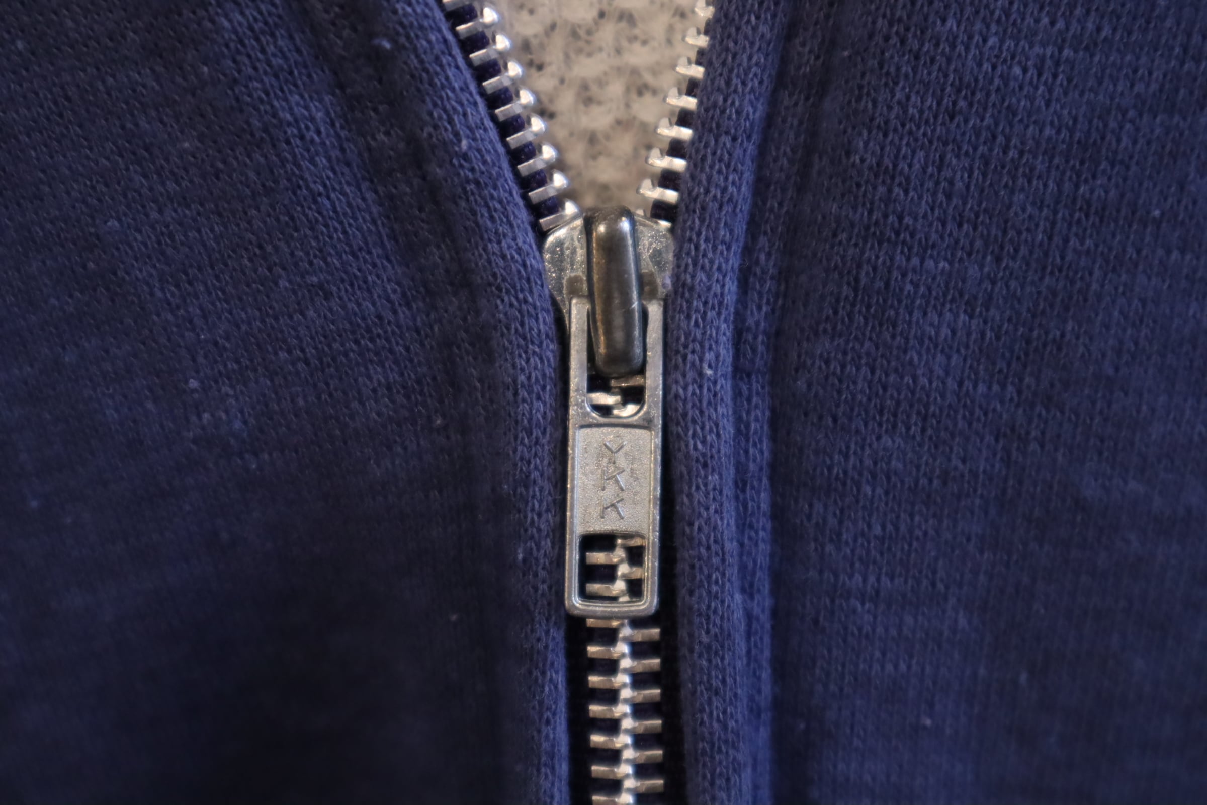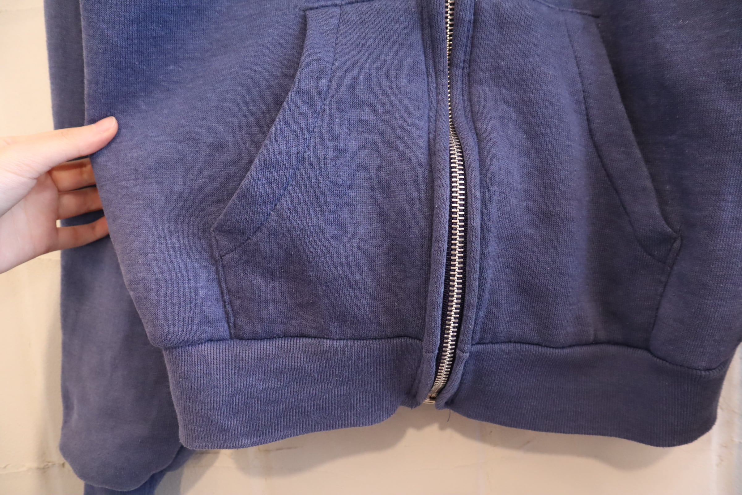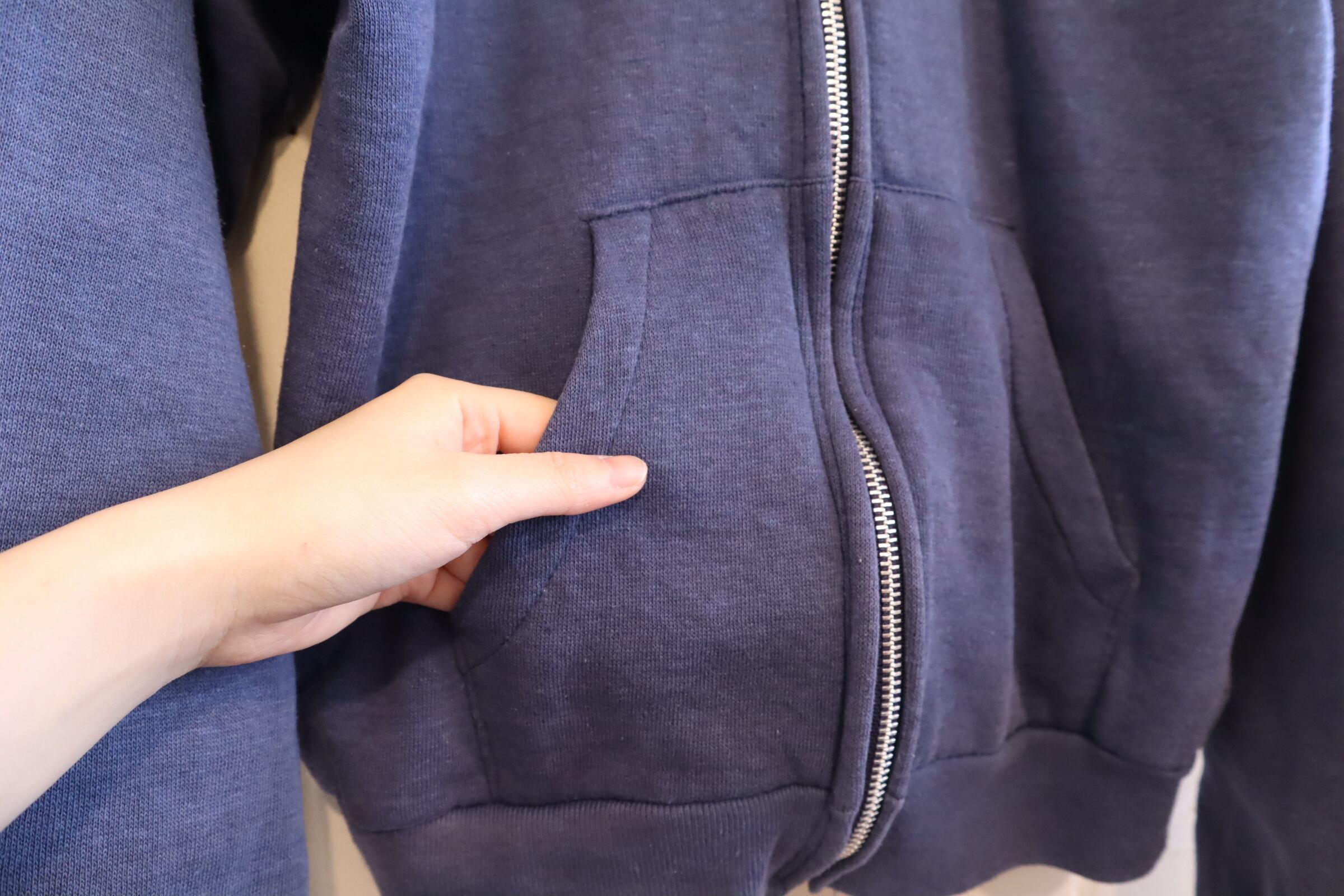 フェードしたネイビーのお色味が素敵なhealthknitボディのジップパーカー。