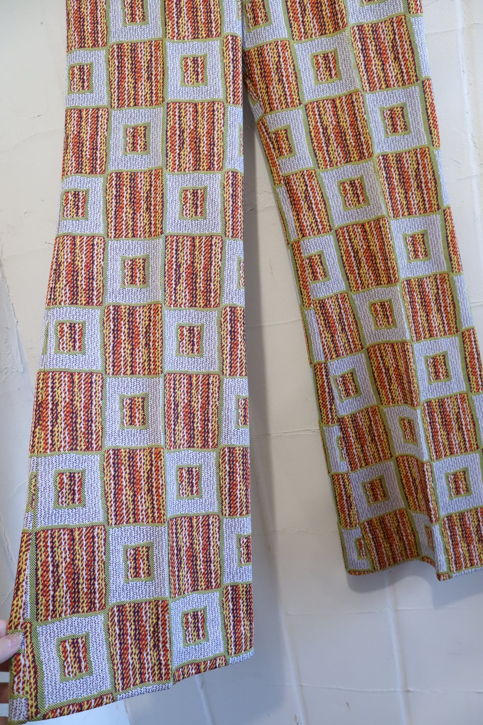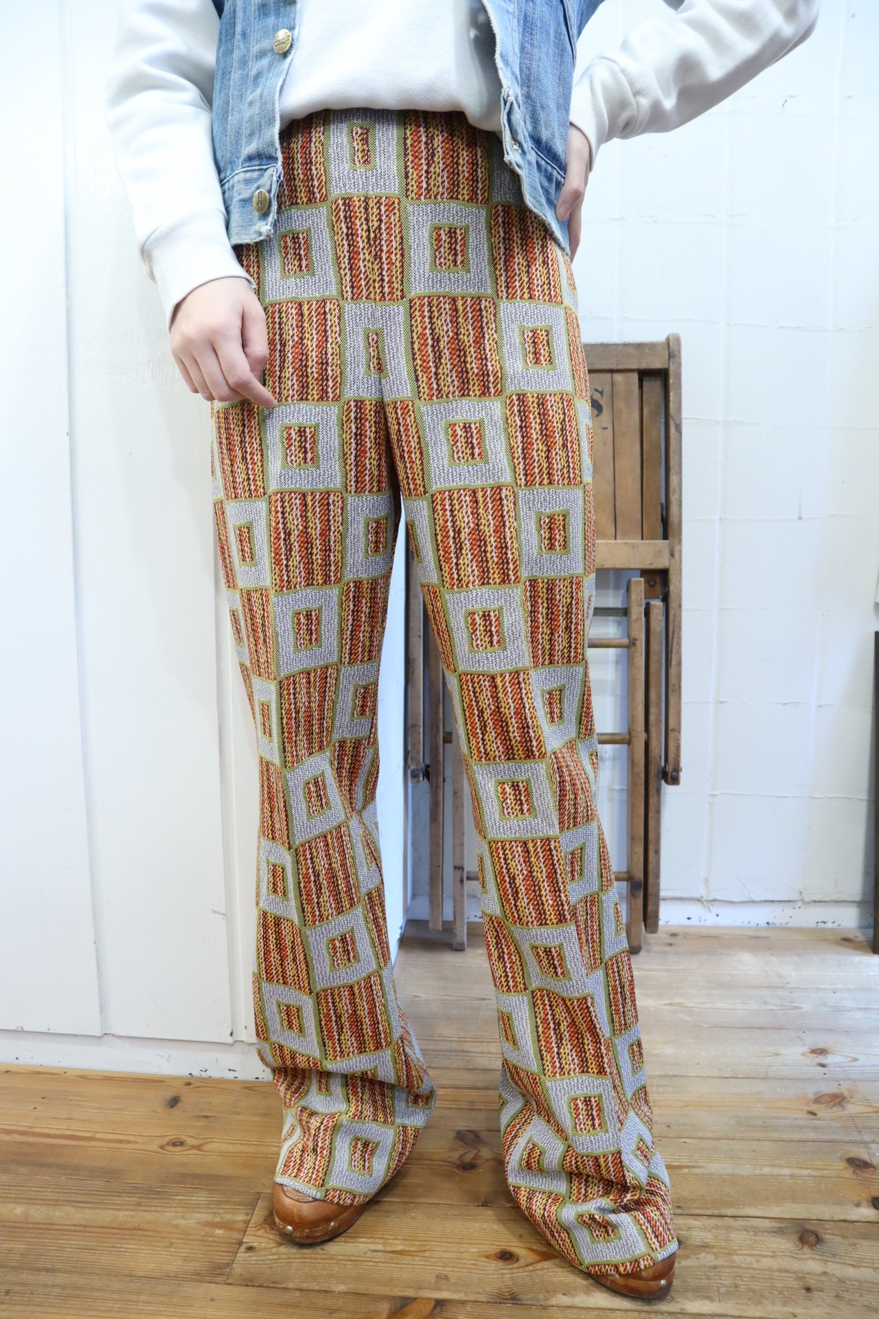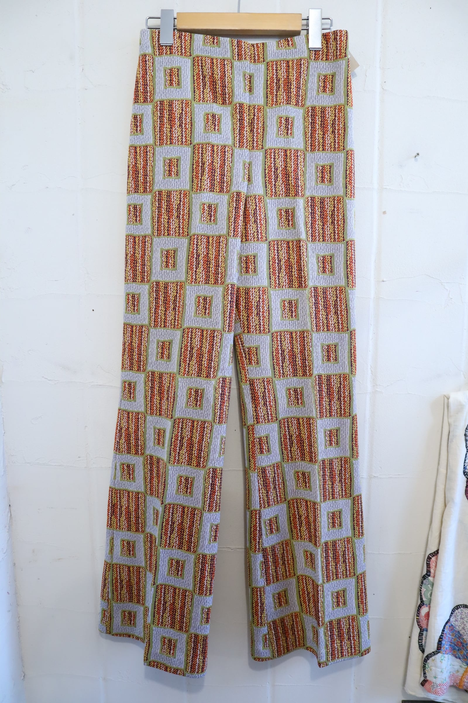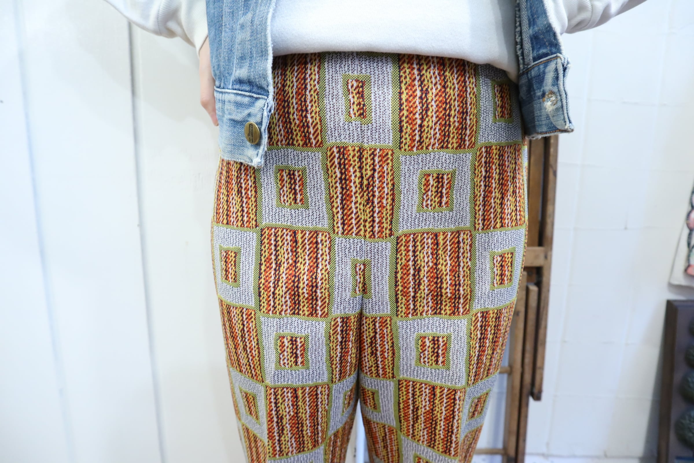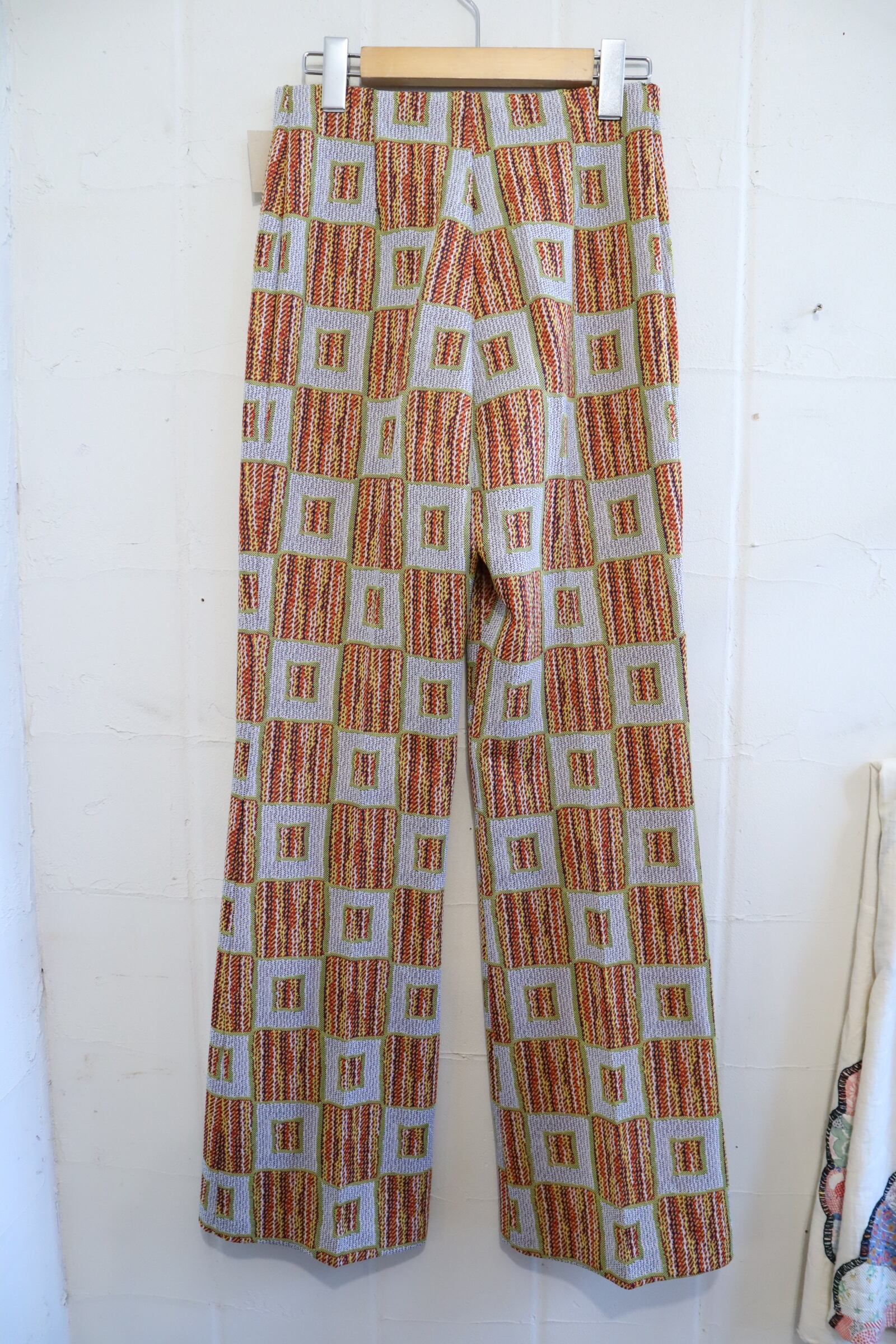 70s gray×orange square pattern polyester pants [l-4517]
