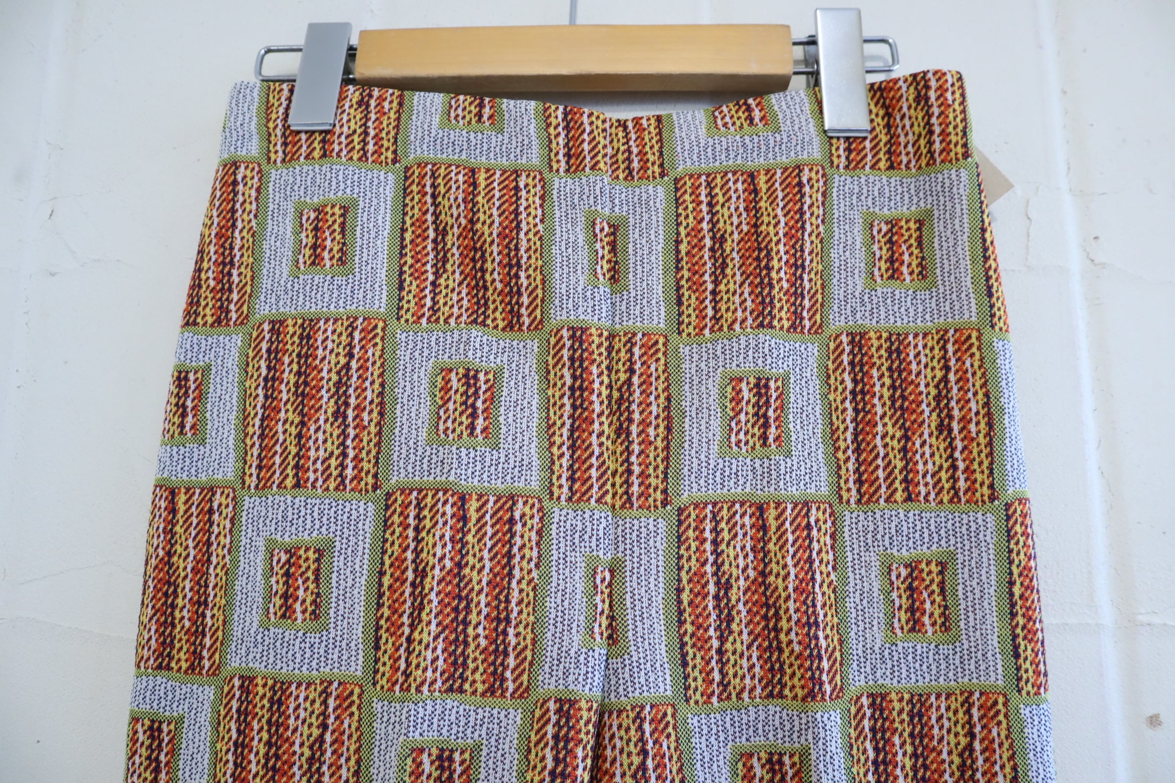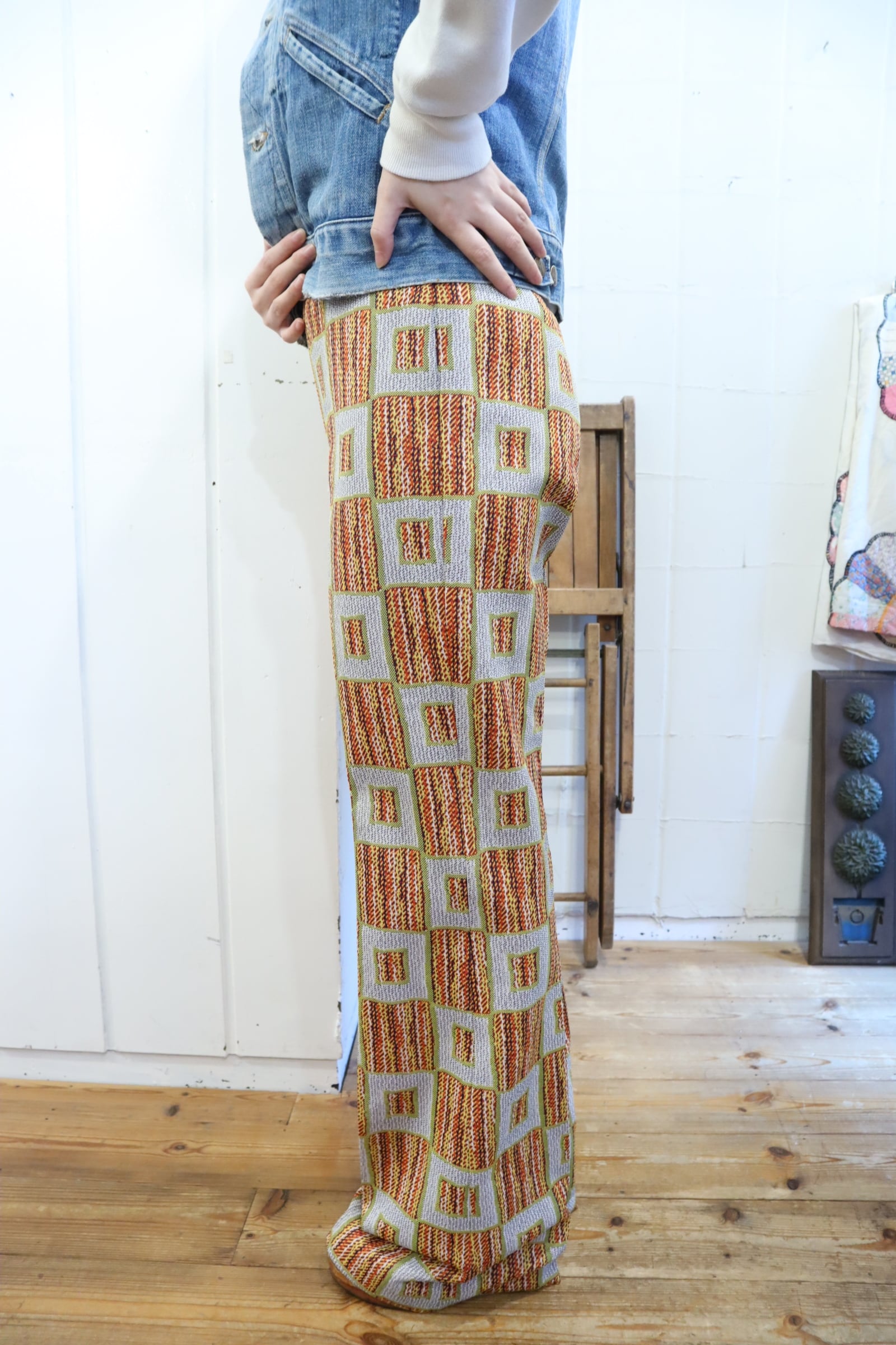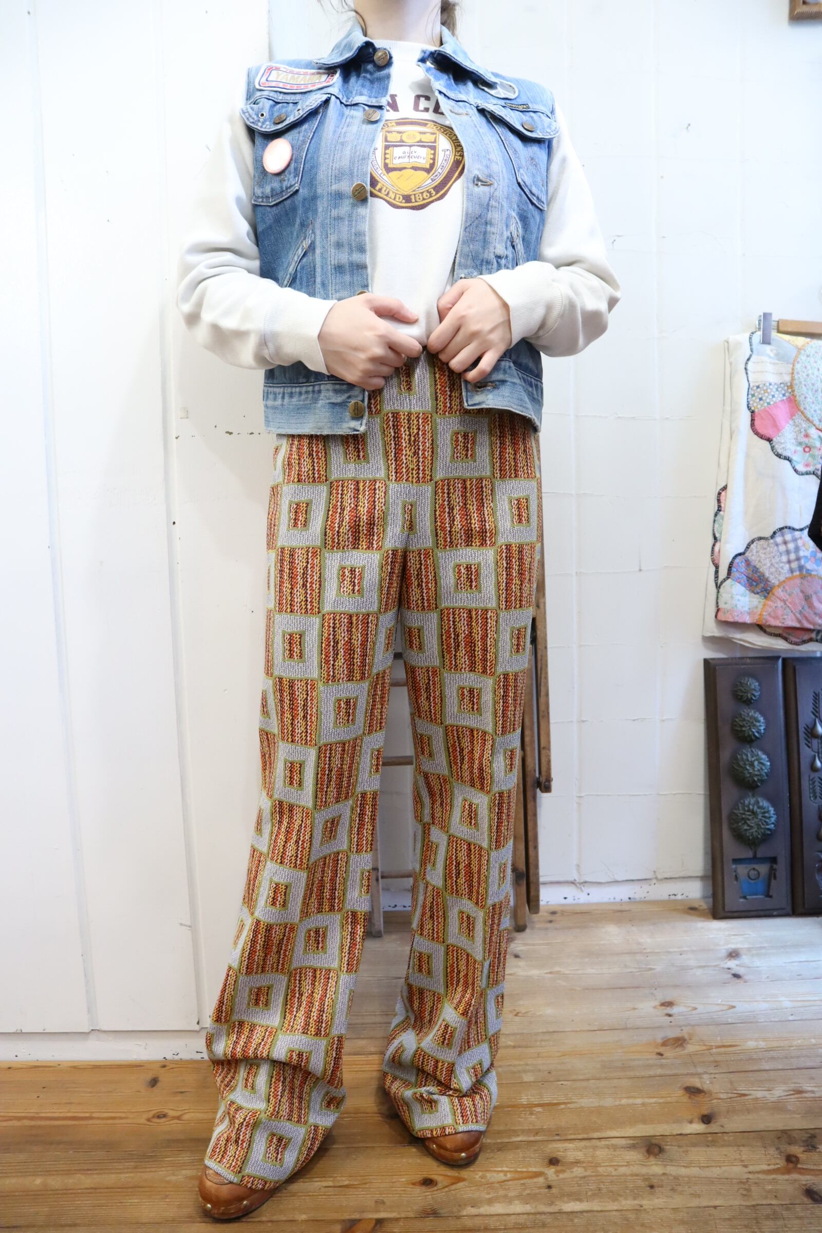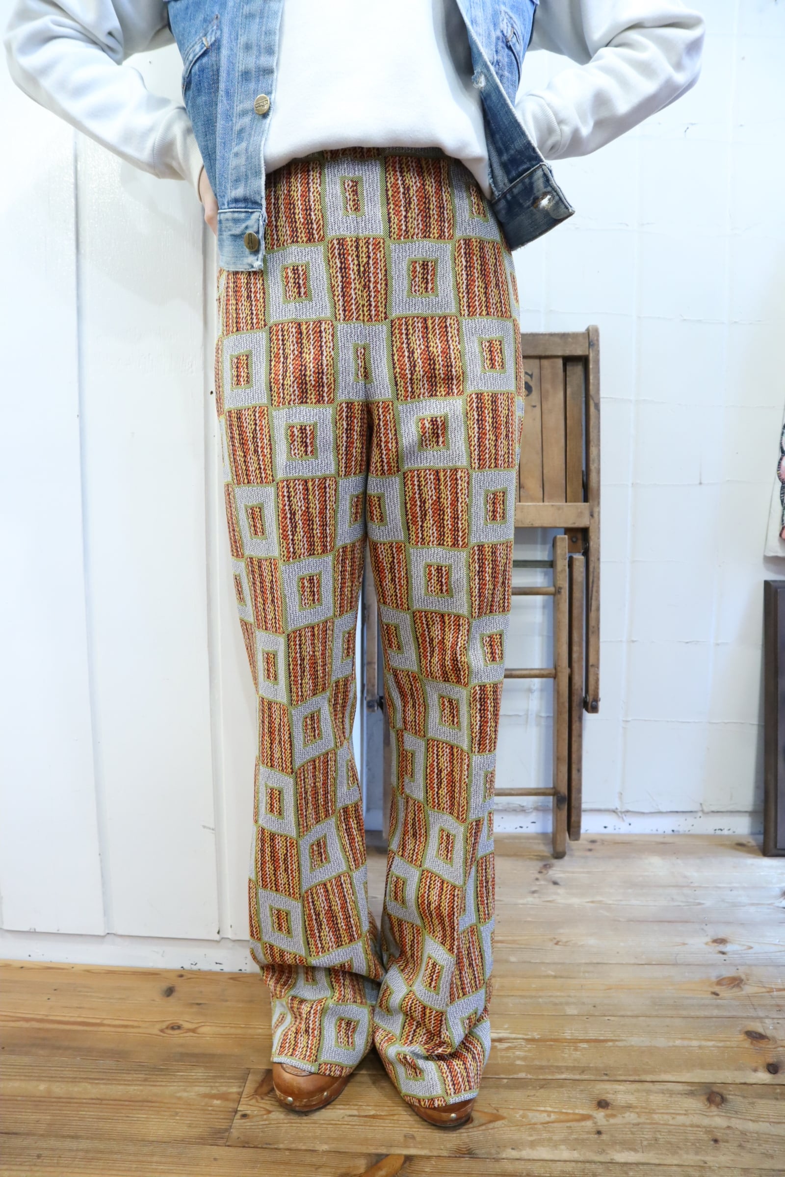 70s gray×orange square pattern polyester pants [l-4517]