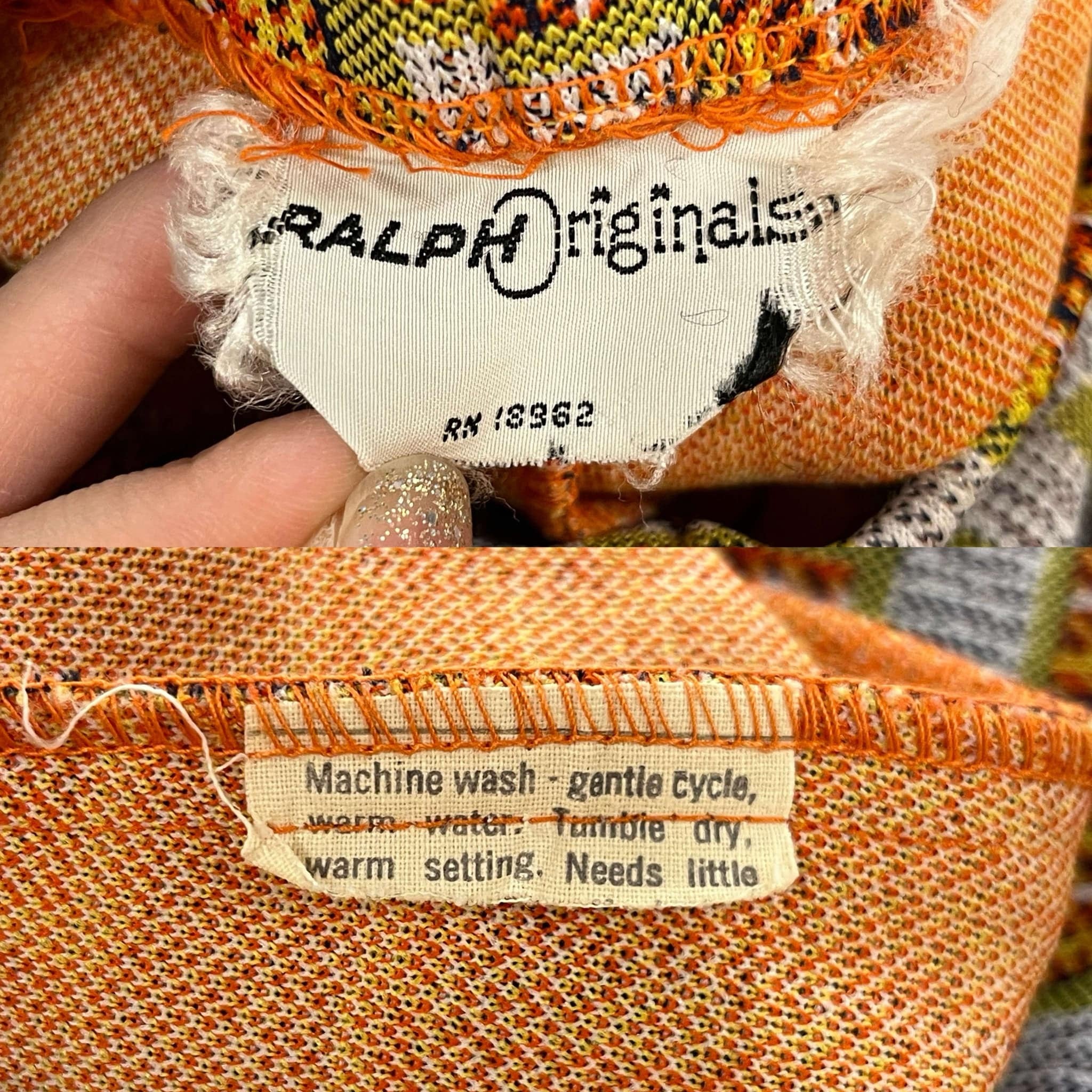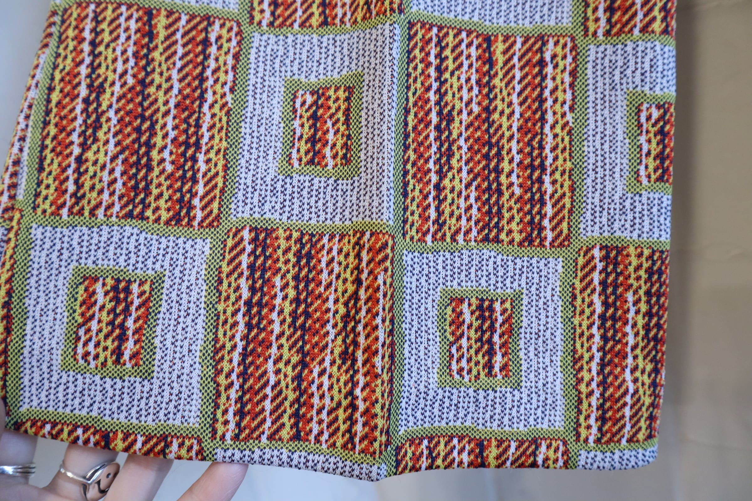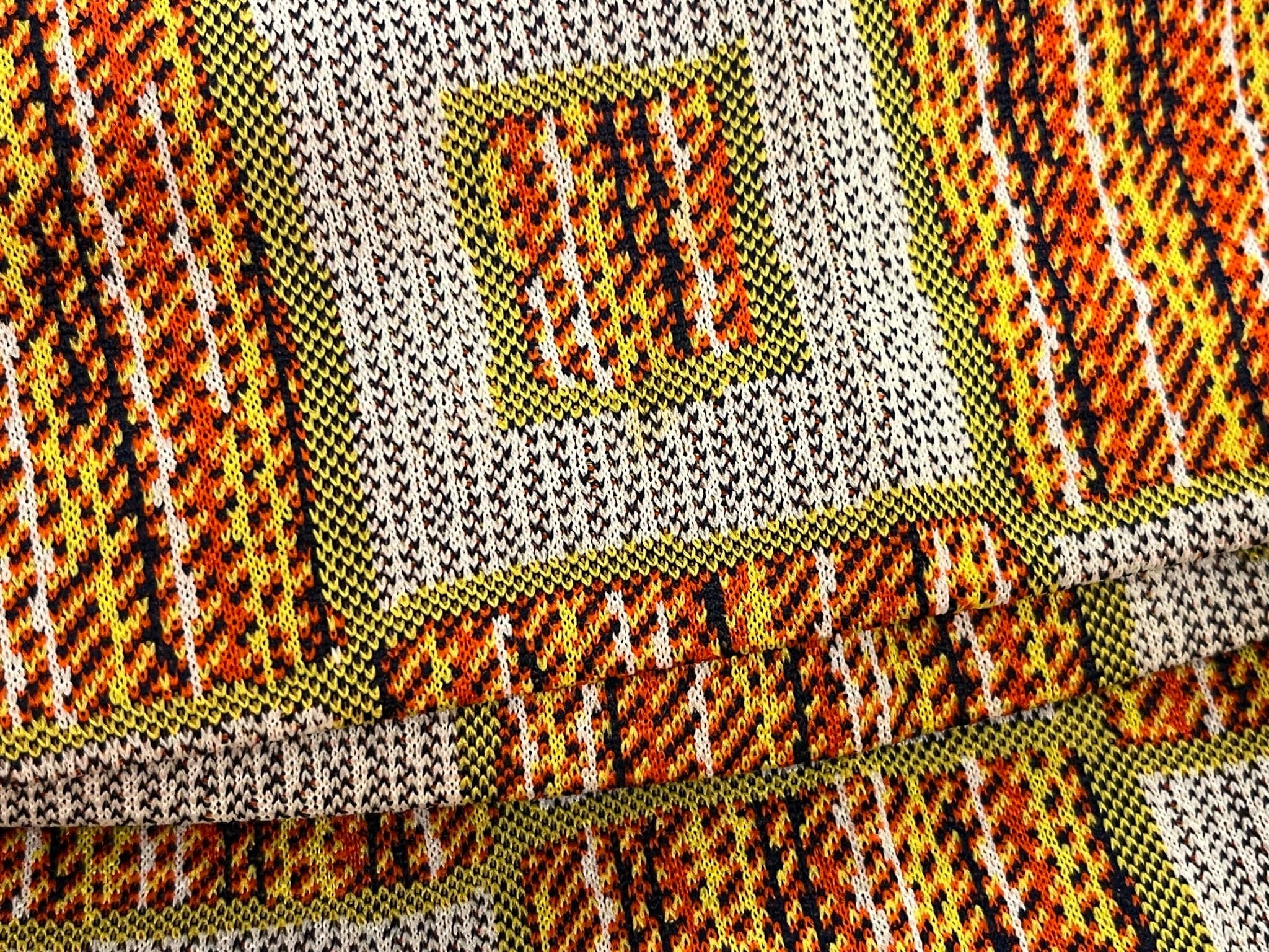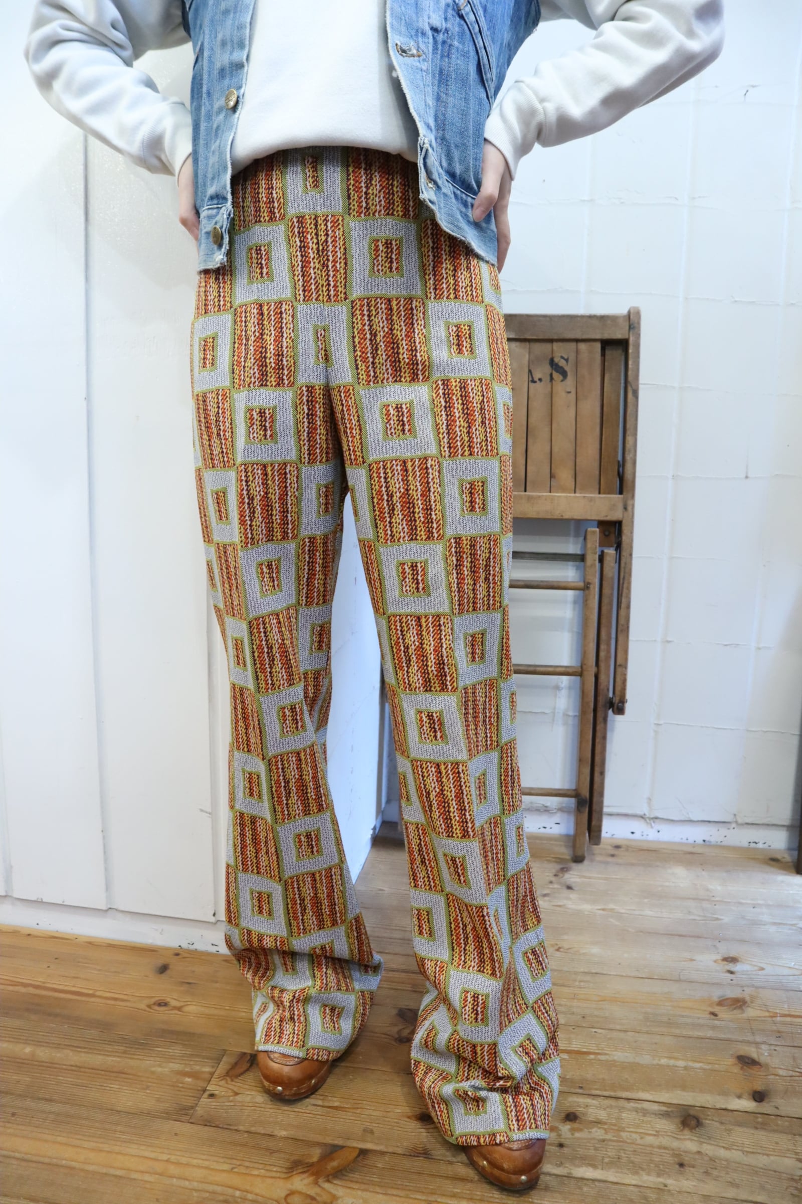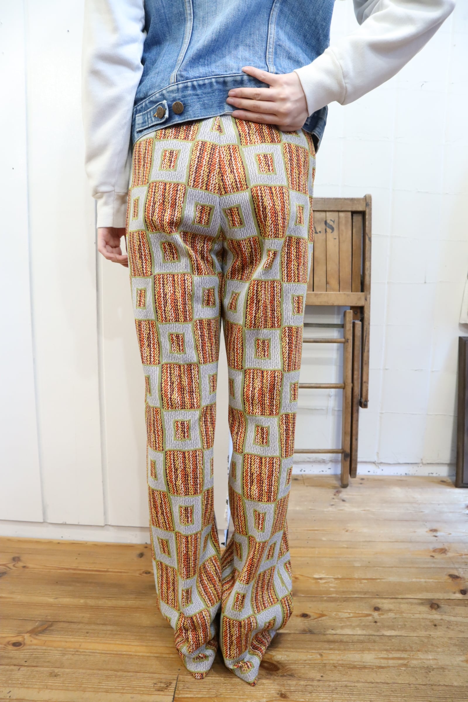 70s gray×orange square pattern polyester pants [l-4517]