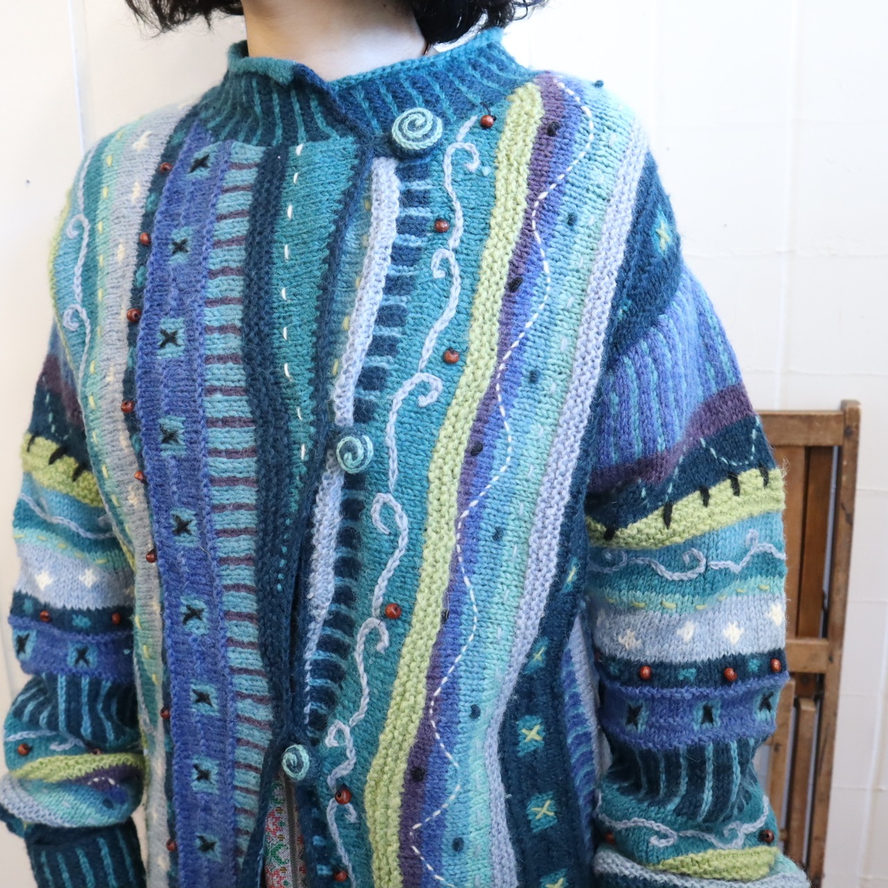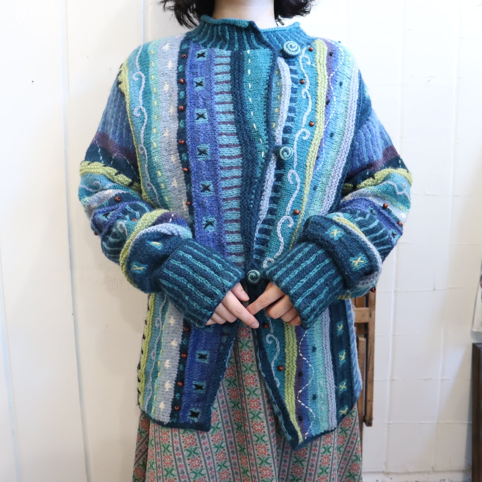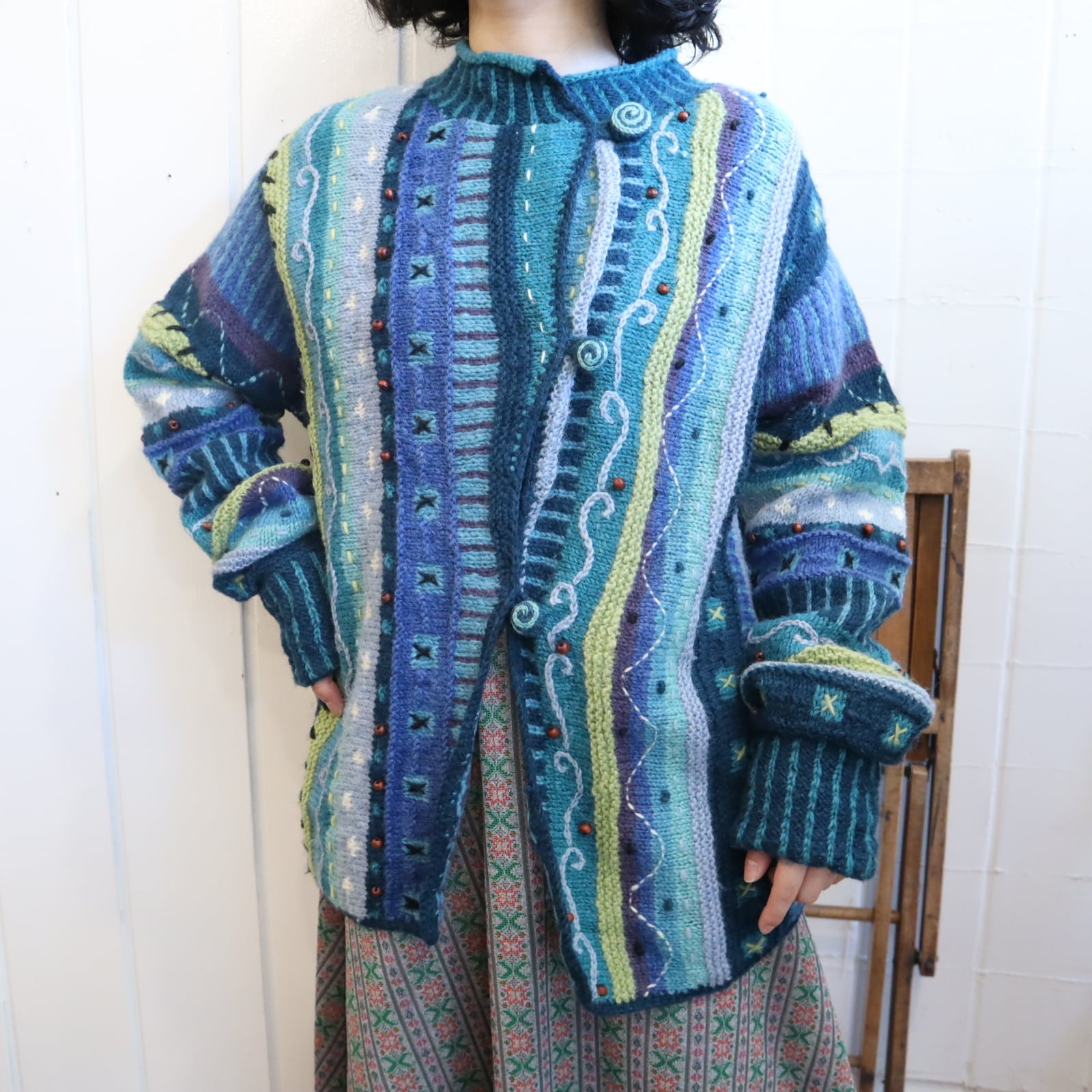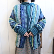 blue×green wood beads design knit cardigan [l-4530]