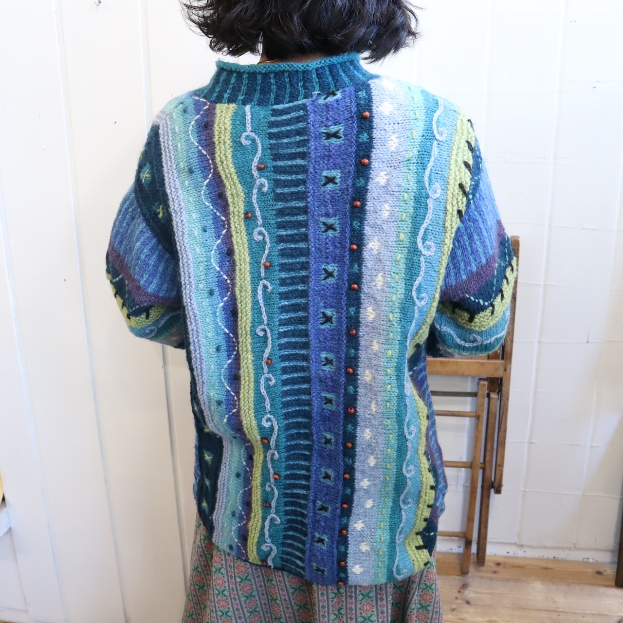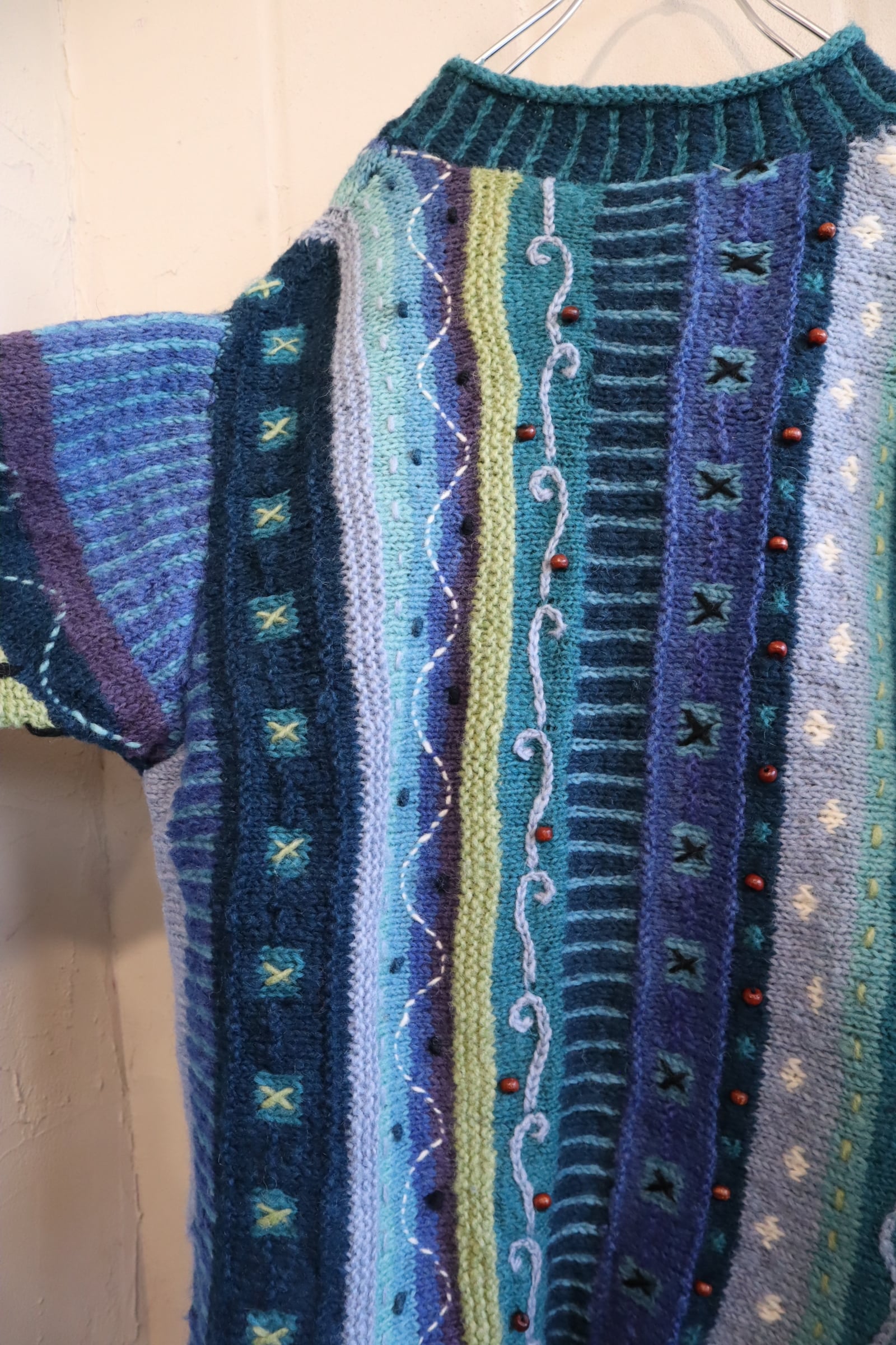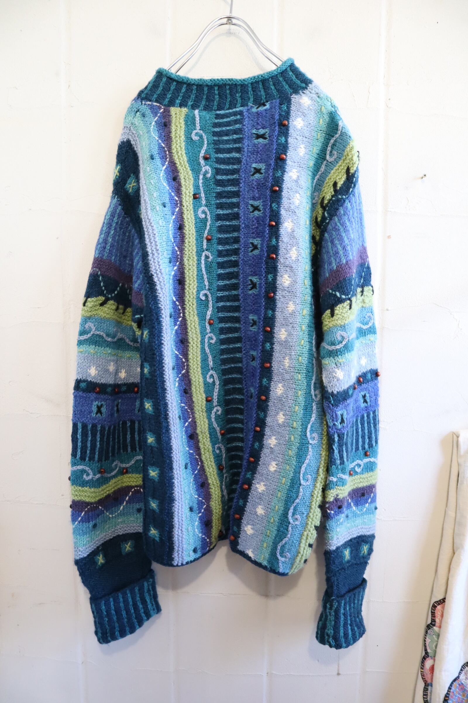 blue×green wood beads design knit cardigan [l-4530]