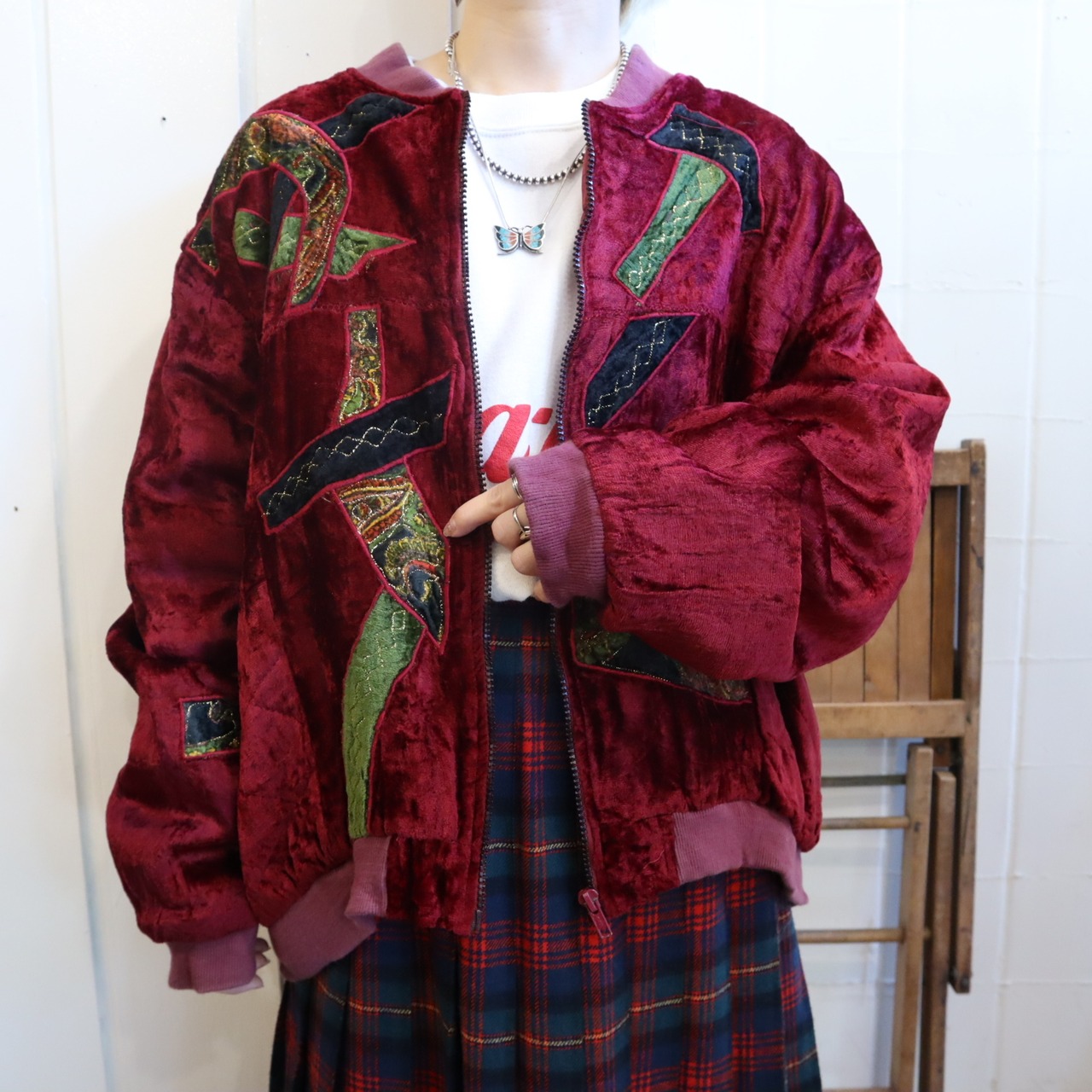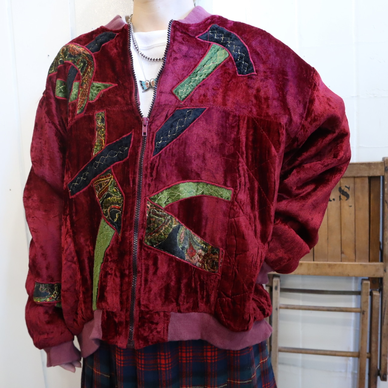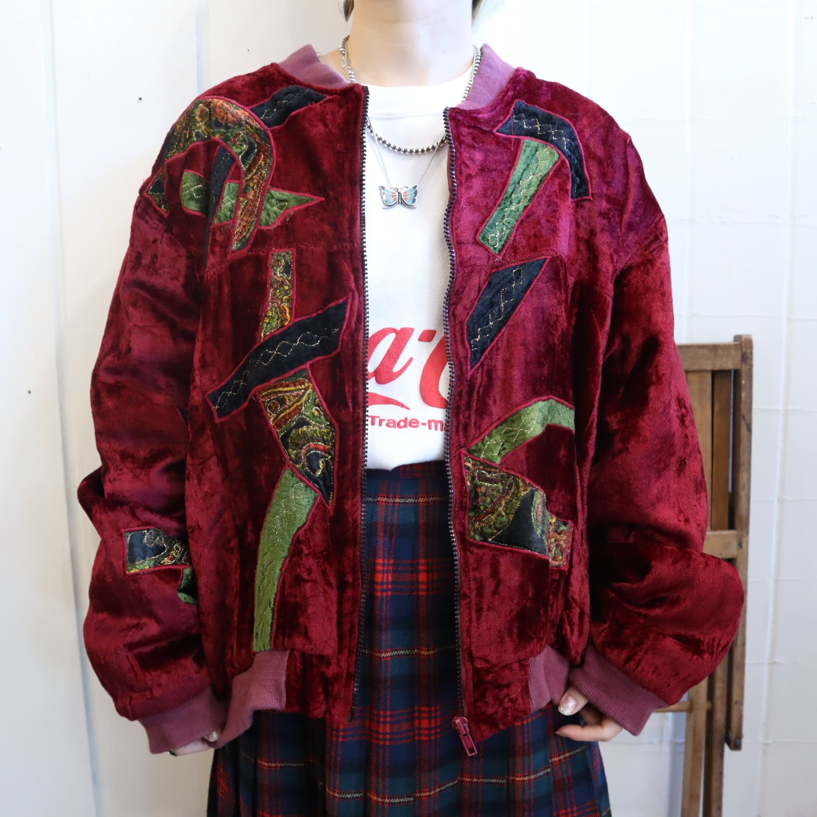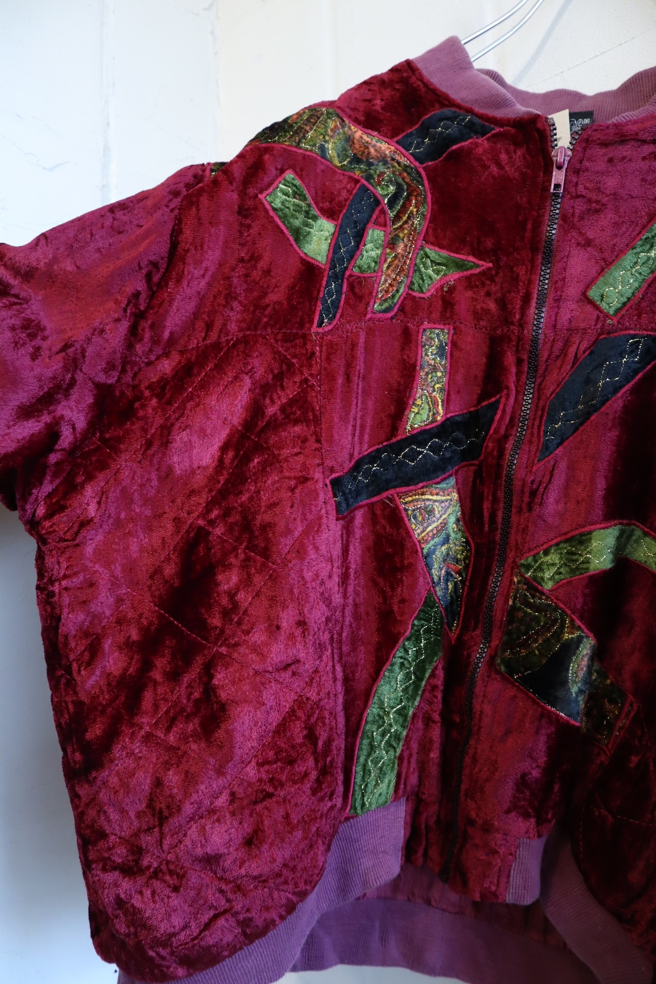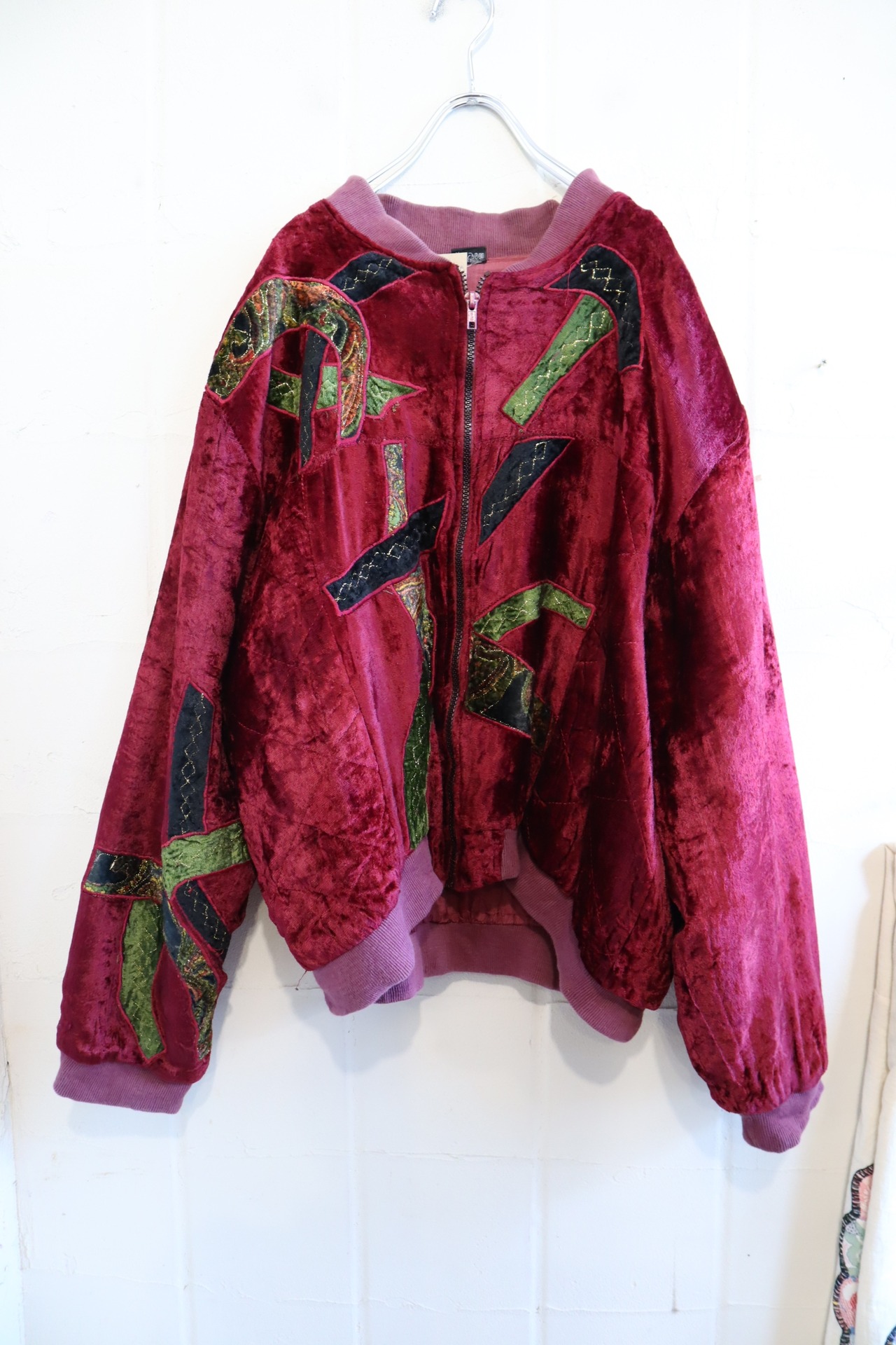古着らしいパッチデザインが個性的で素敵な80sのベロアジャケット。