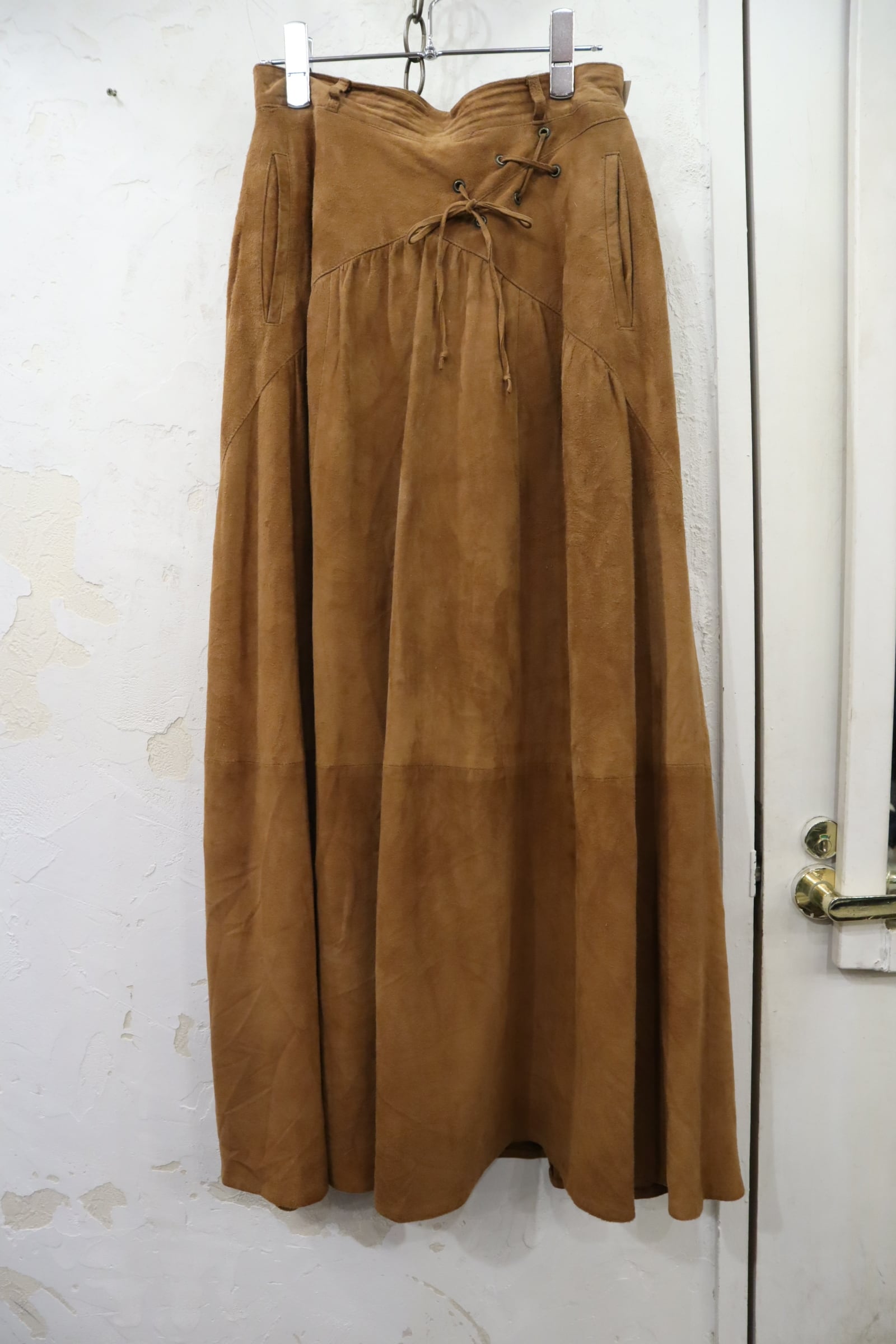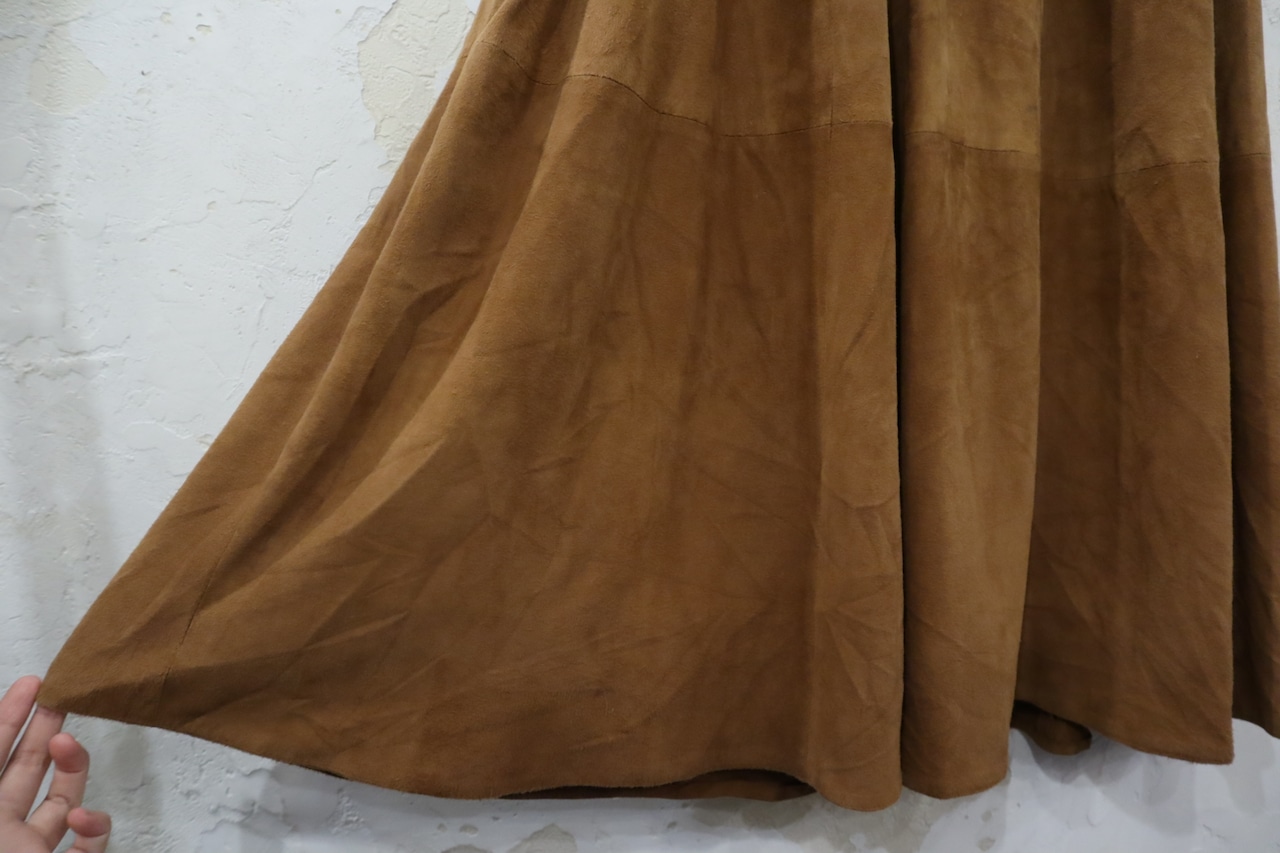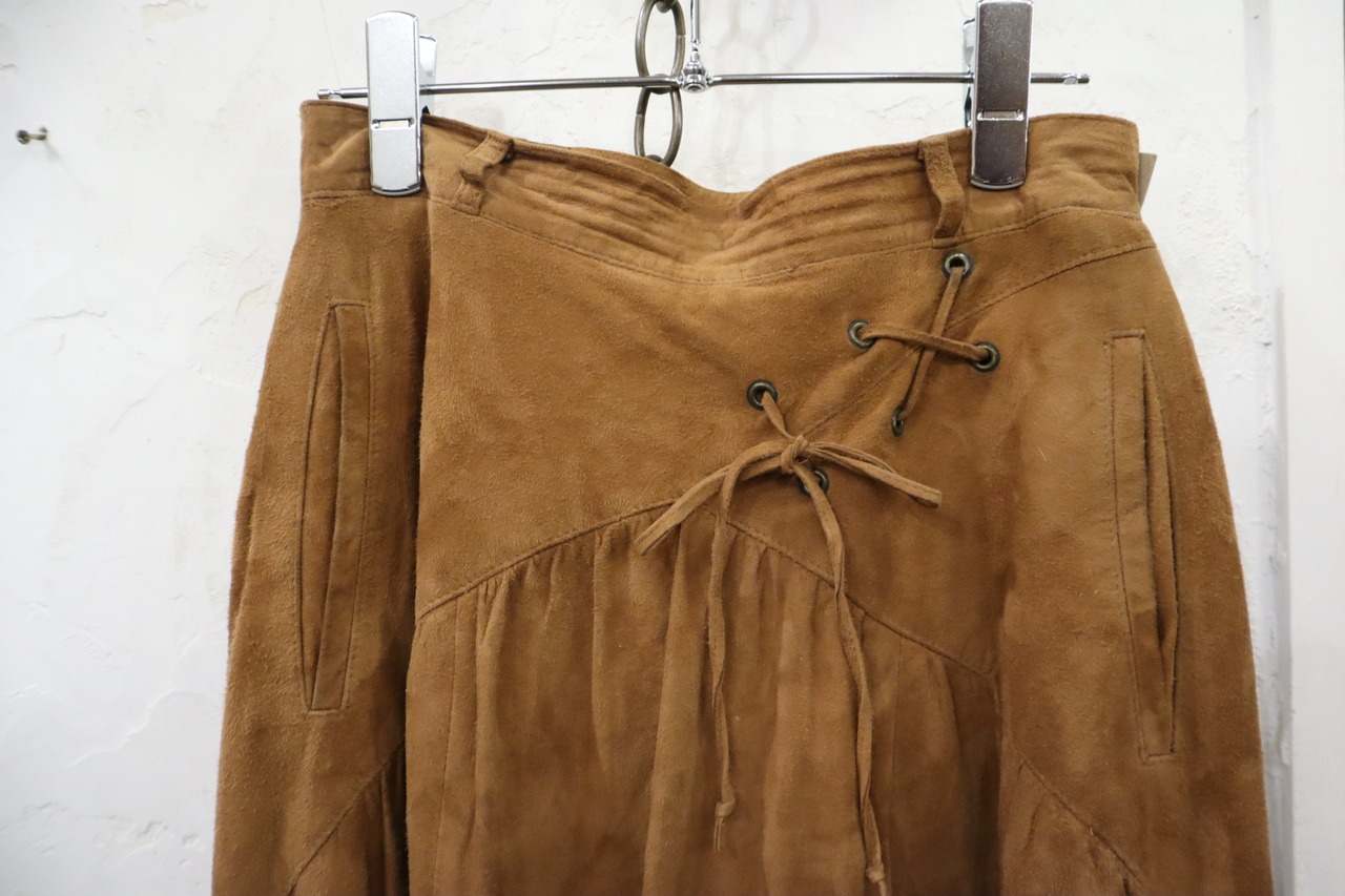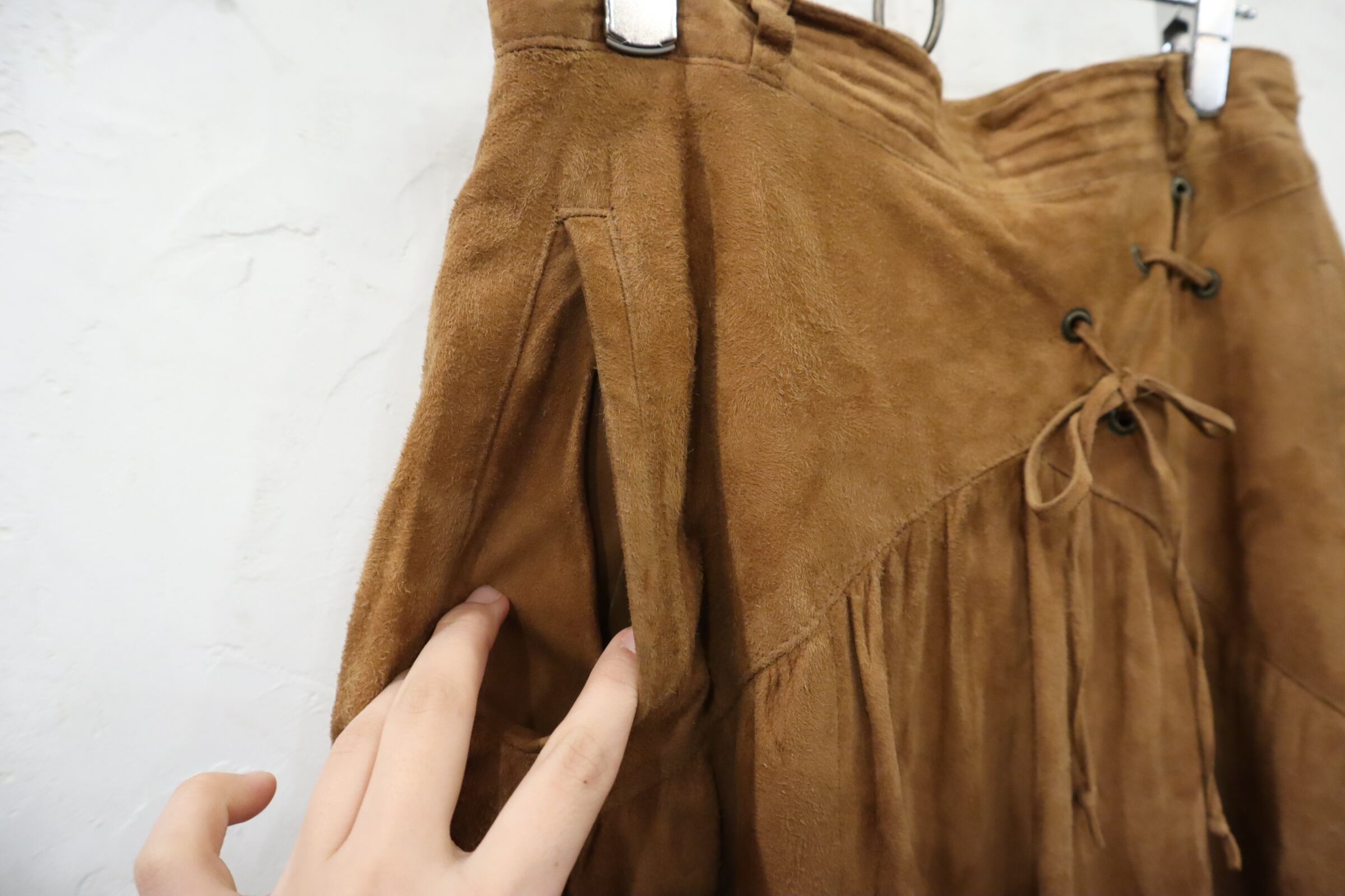さりげないレースアップデザインや切替、タックと心揺さぶられるディテールが詰め込まれたスエードスカートです。