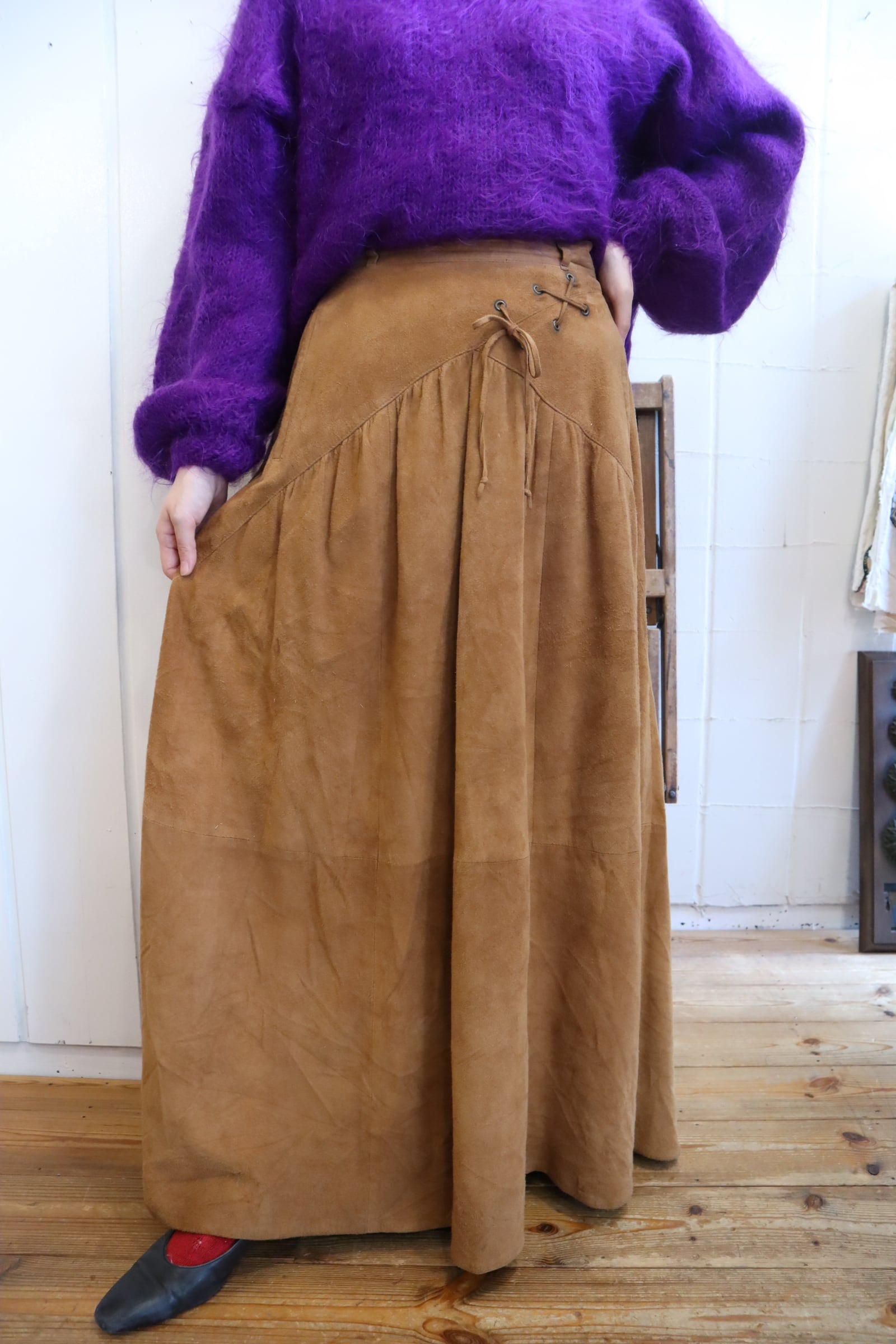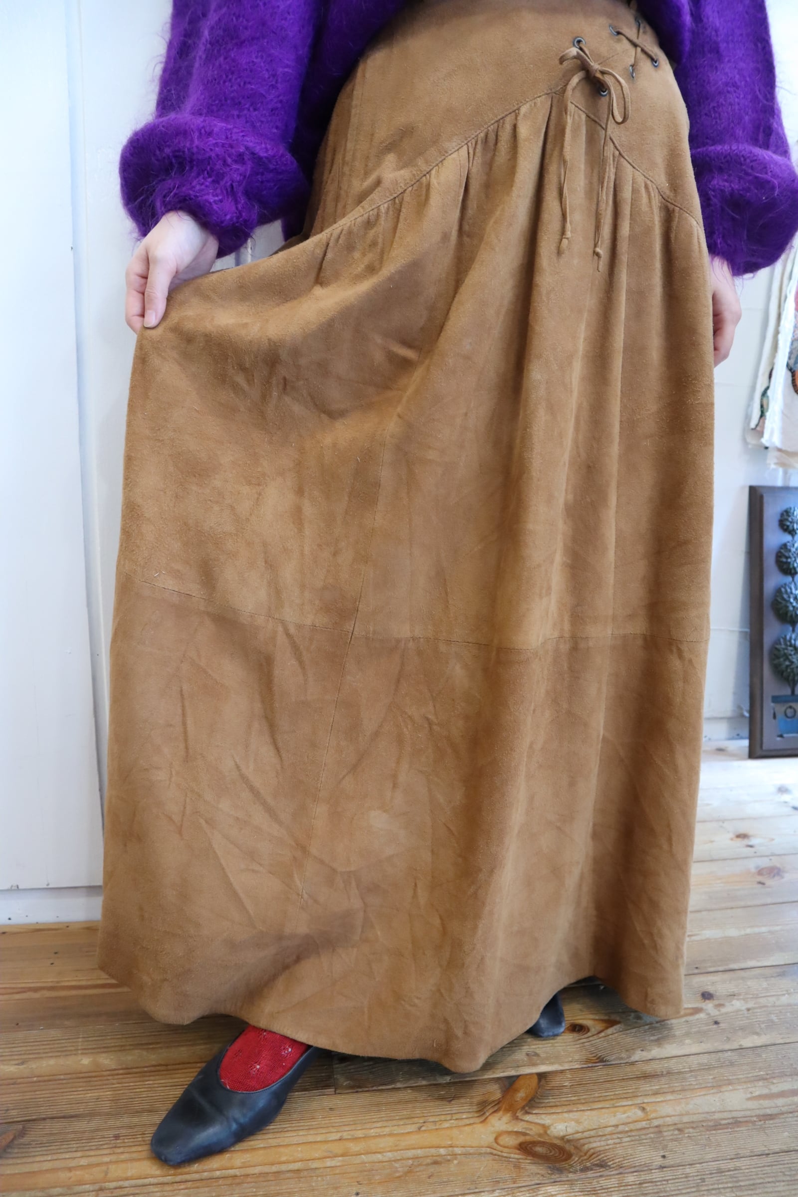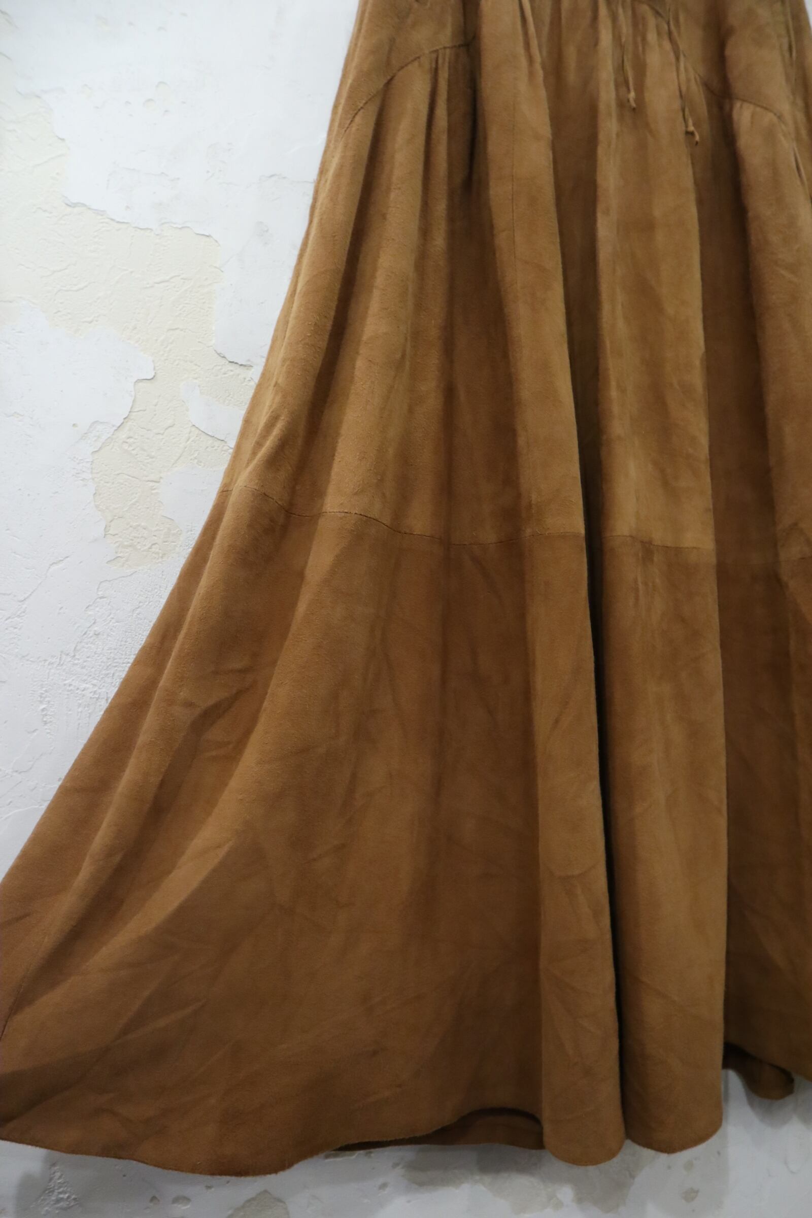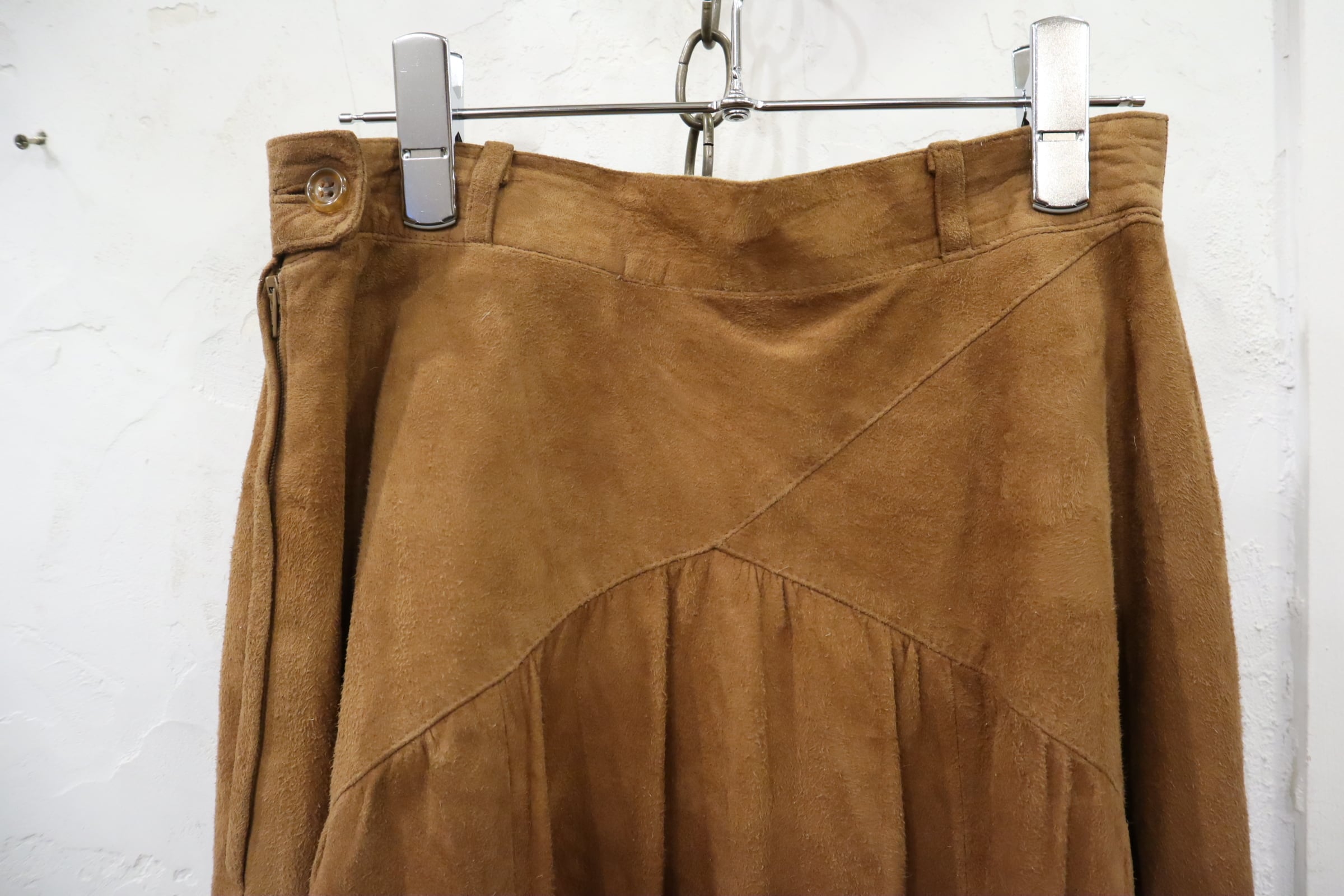 さりげないレースアップデザインや切替、タックと心揺さぶられるディテールが詰め込まれたスエードスカートです。