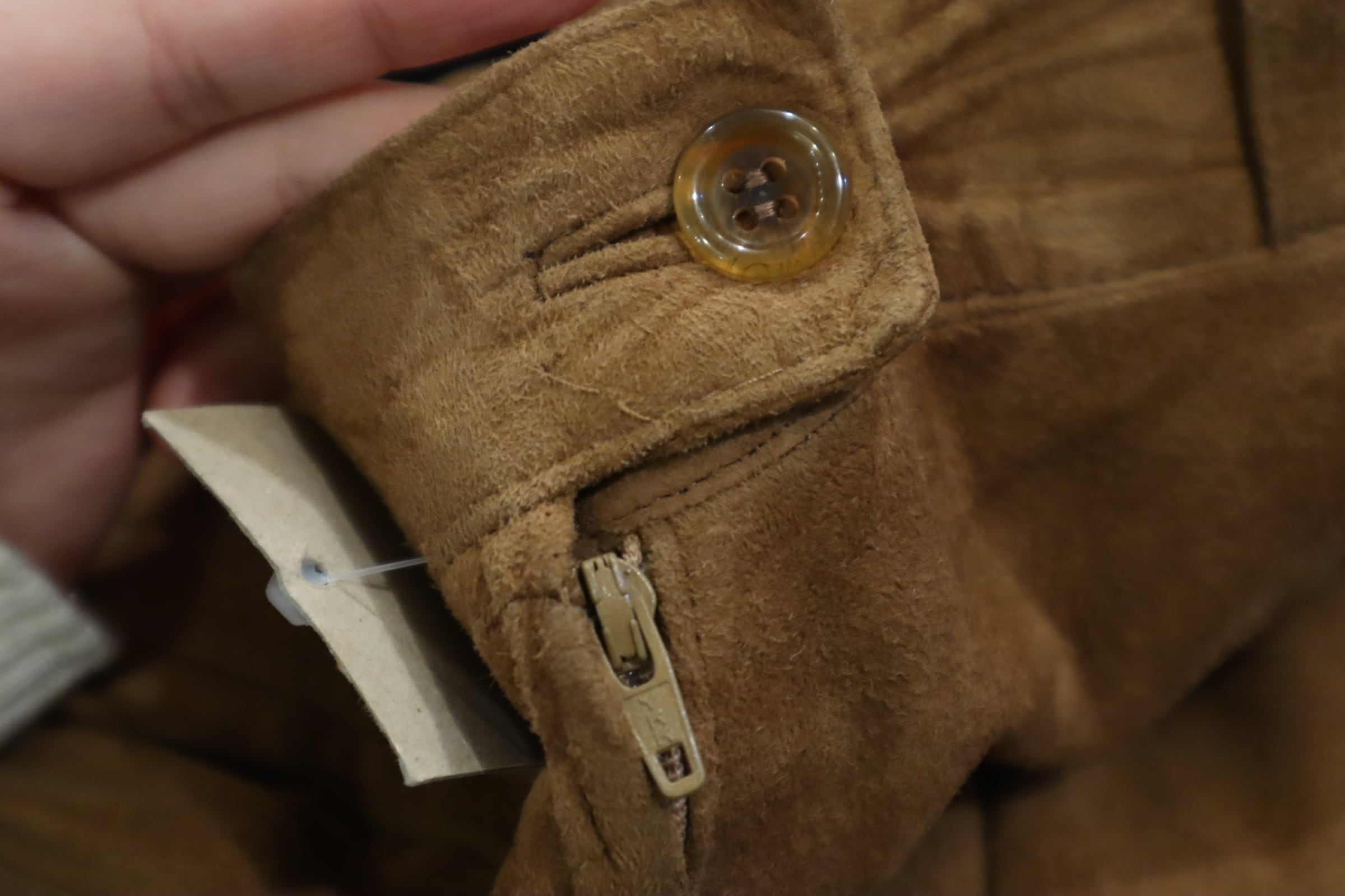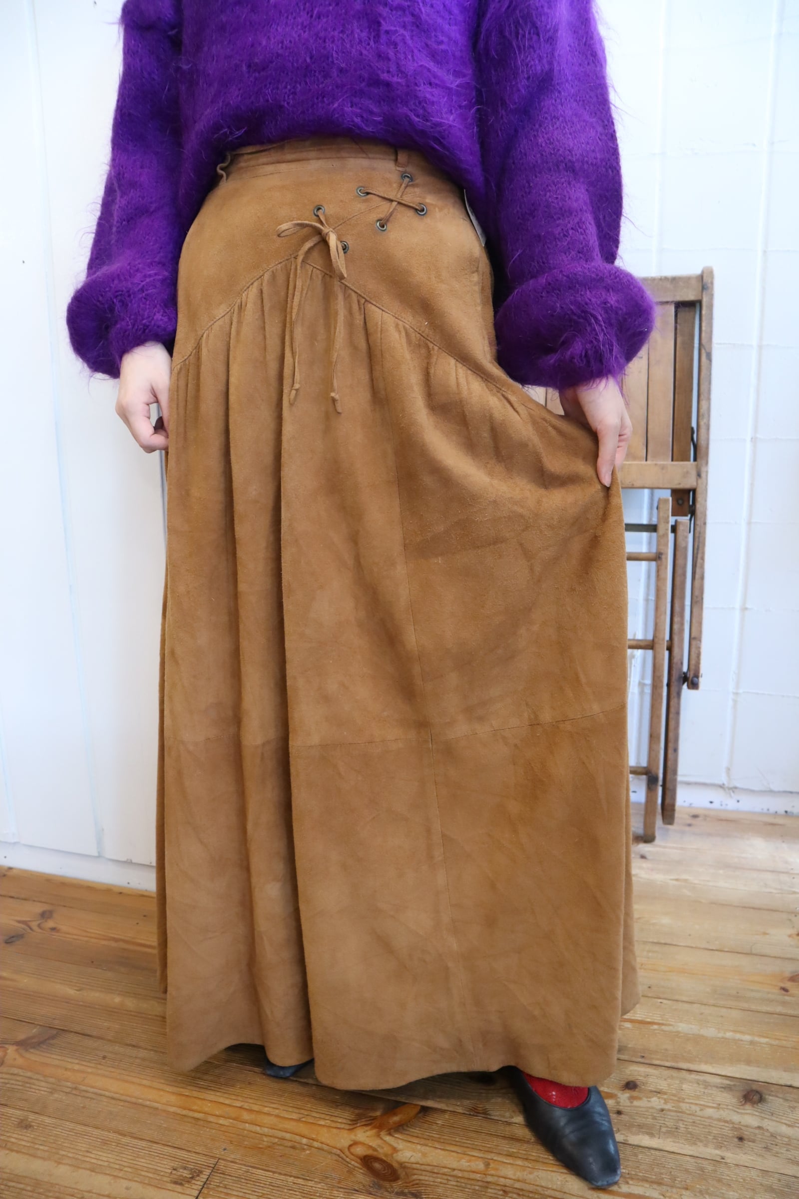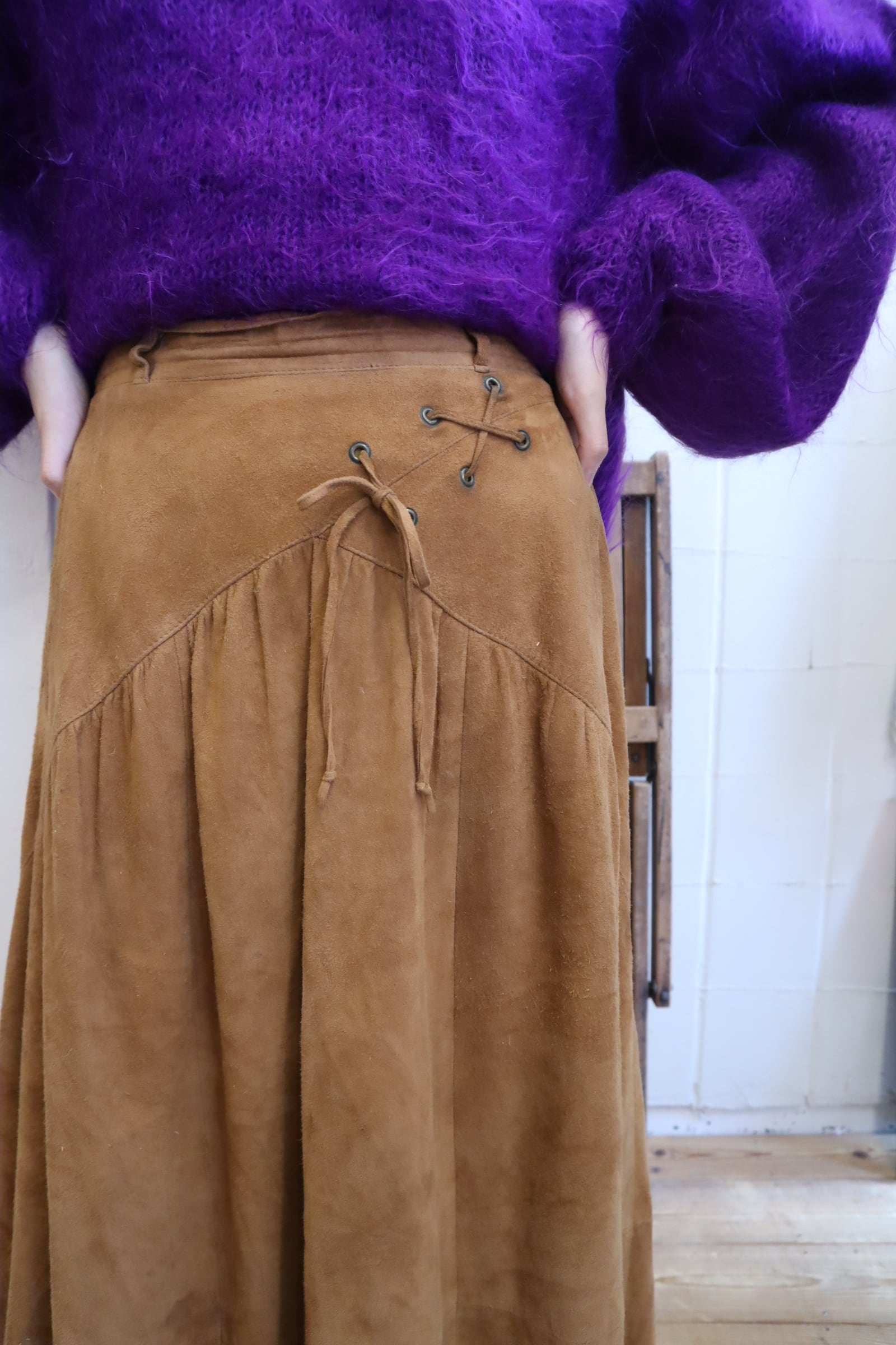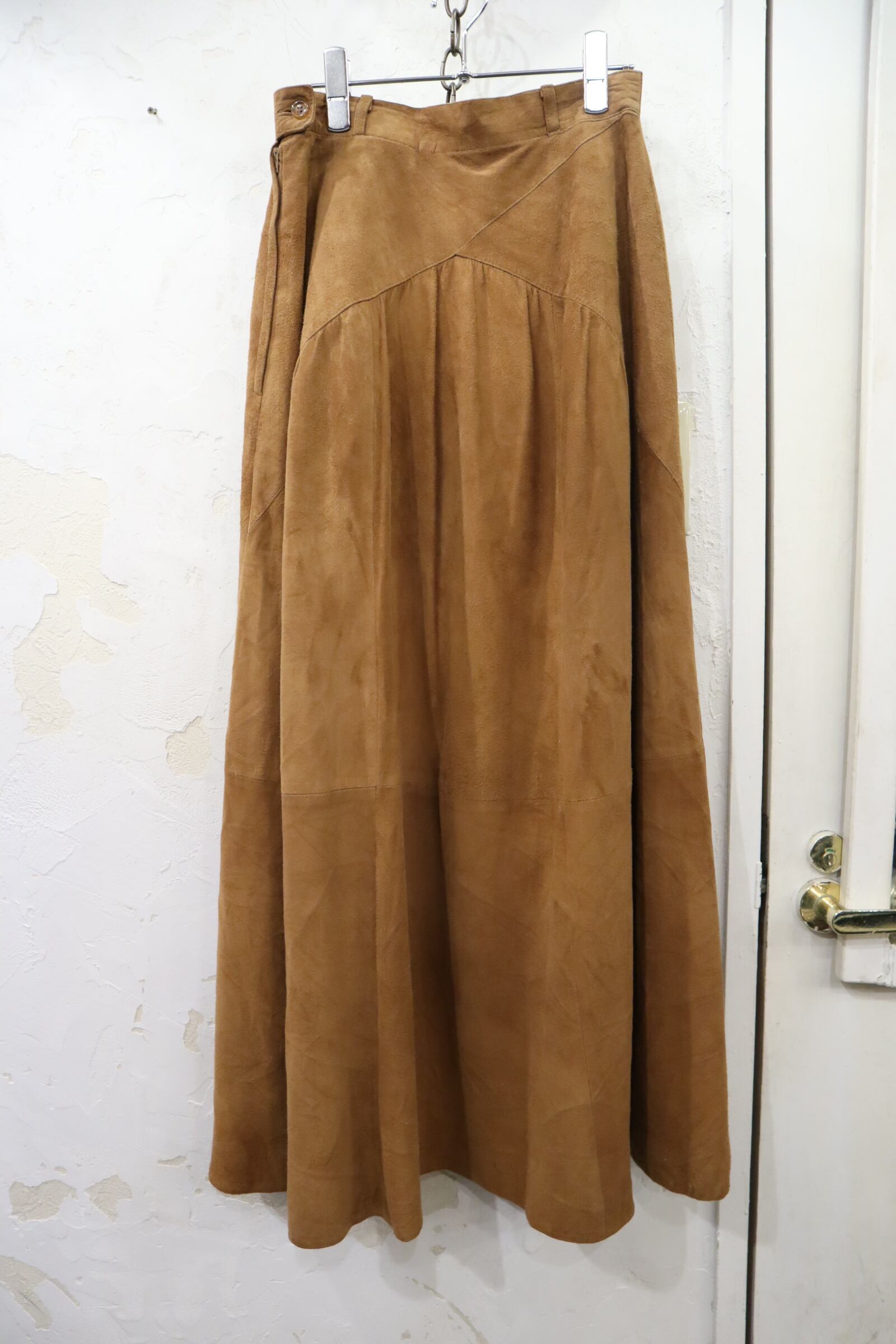 さりげないレースアップデザインや切替、タックと心揺さぶられるディテールが詰め込まれたスエードスカートです。