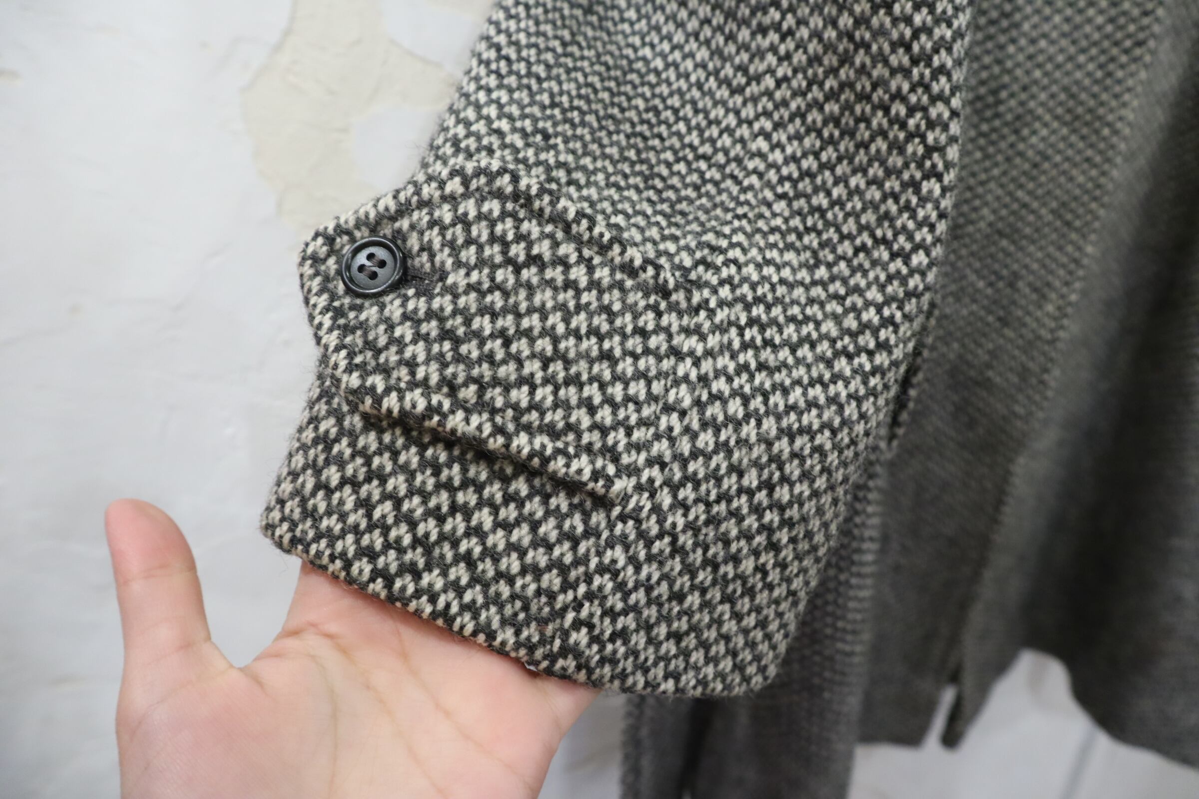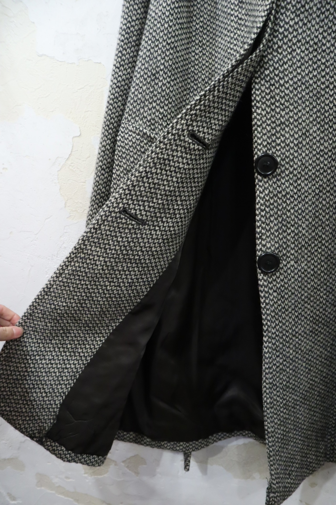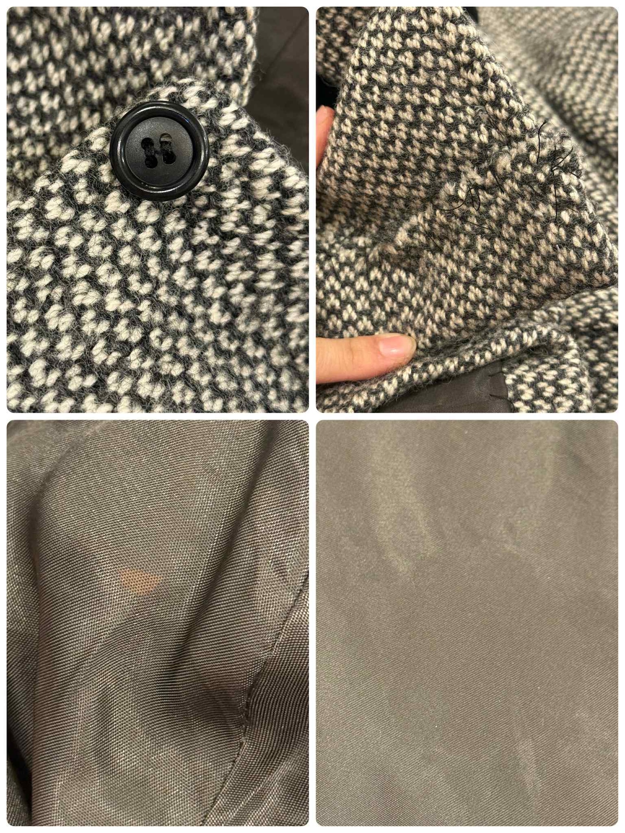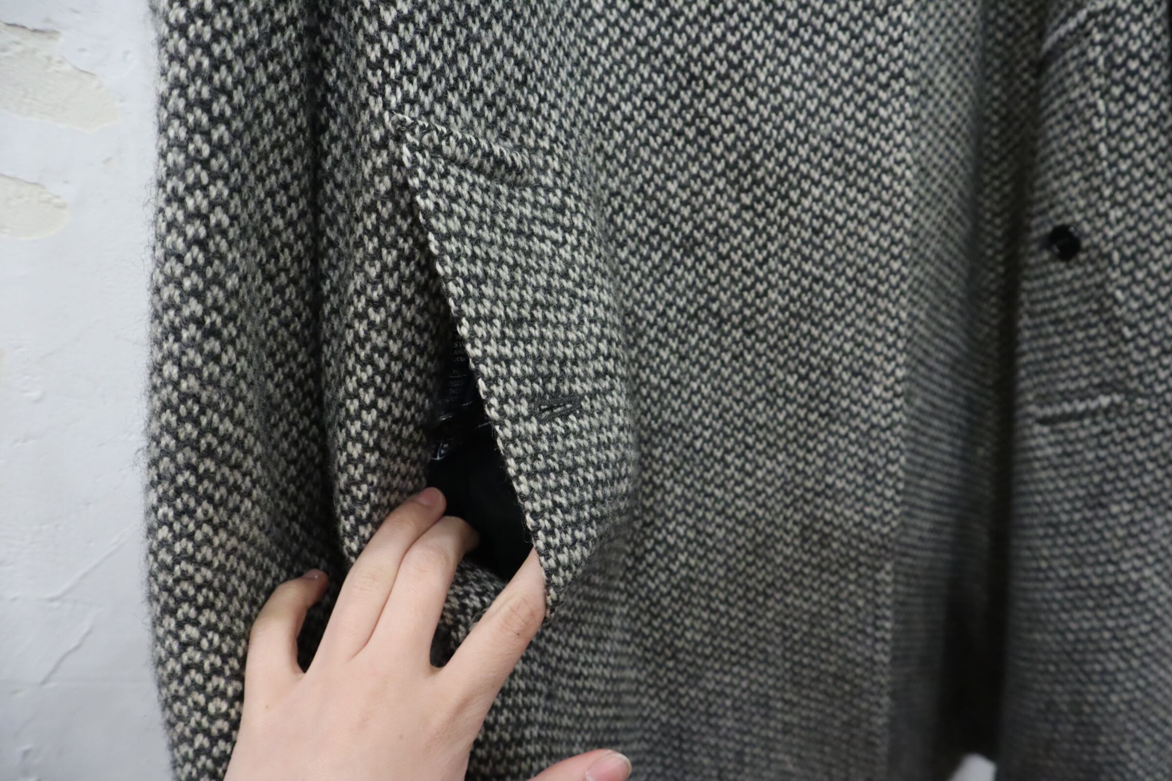 裾を詰めたようなリペア跡、裏地にシミや汚れがございますが、古着の味として着て頂けるかと思います。