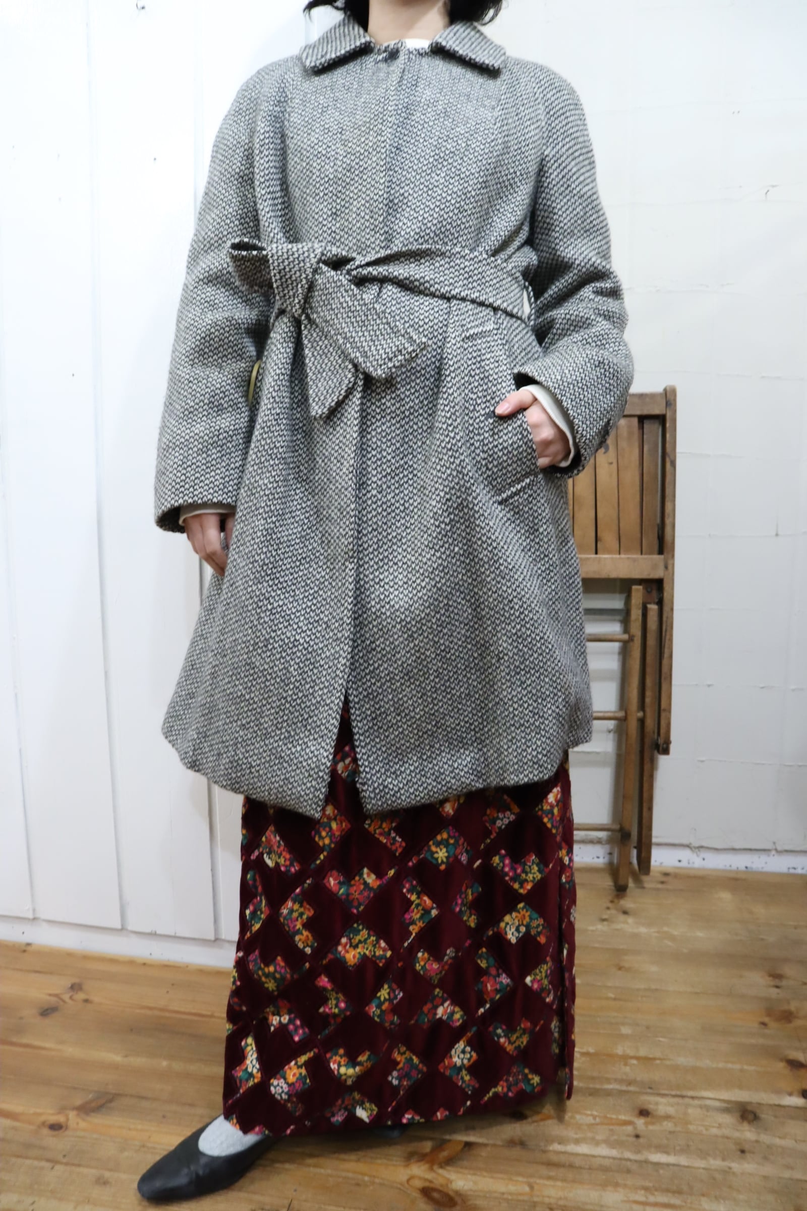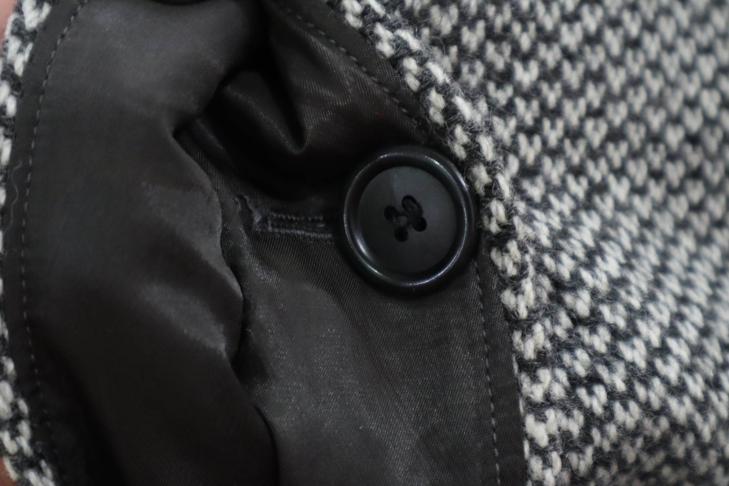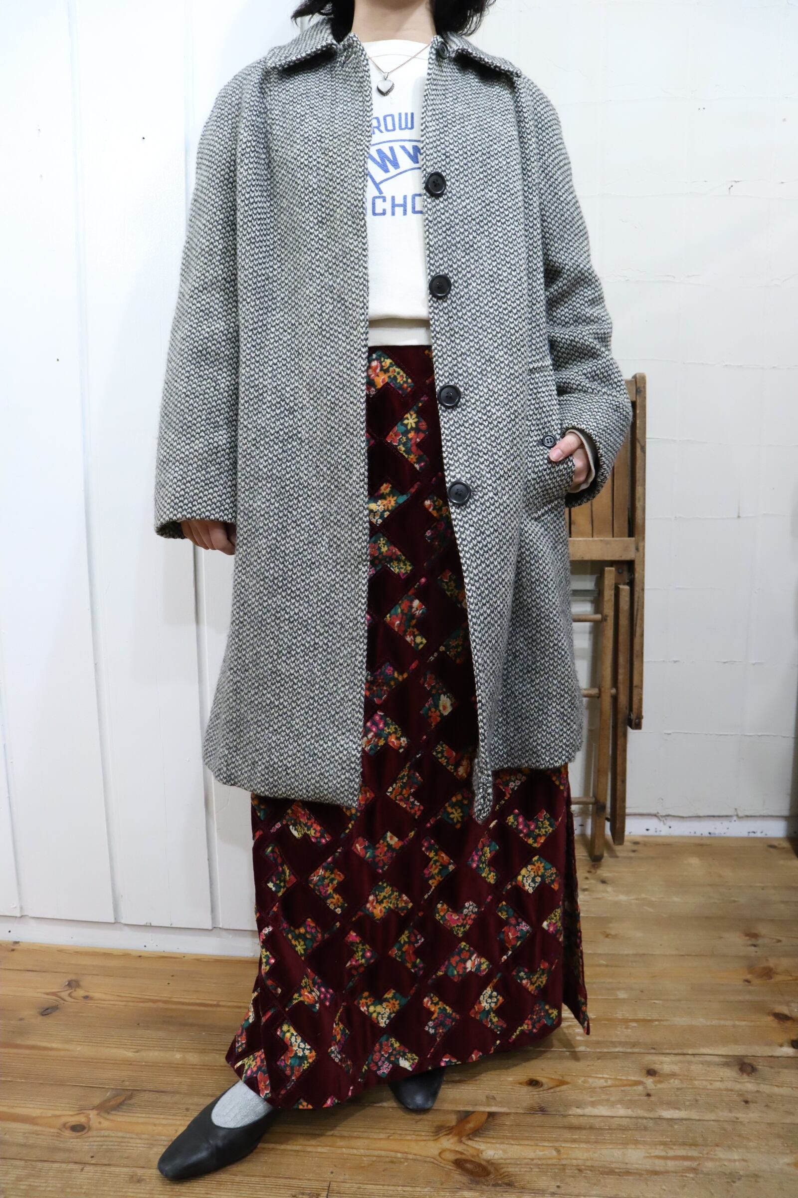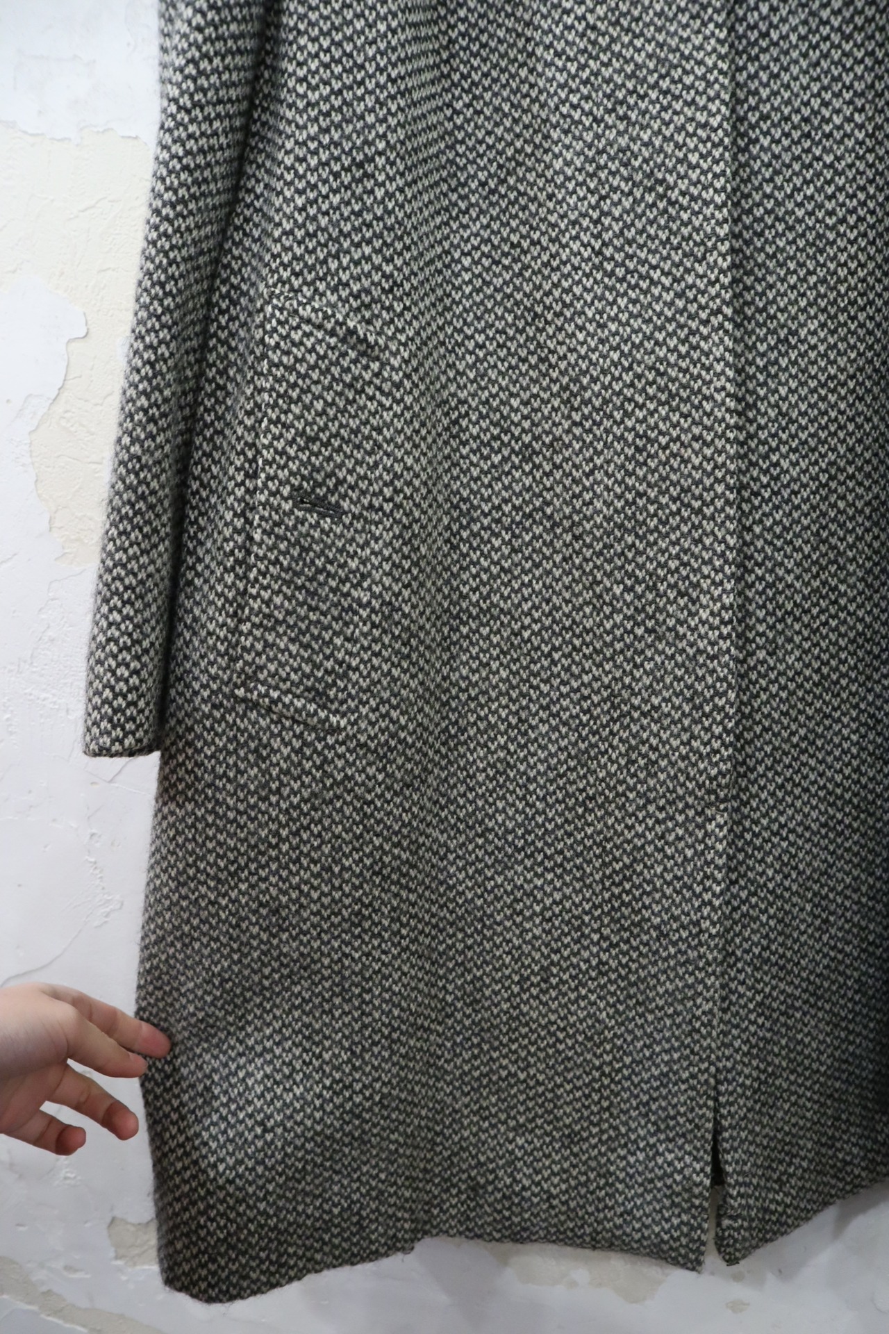 裾を詰めたようなリペア跡、裏地にシミや汚れがございますが、古着の味として着て頂けるかと思います。