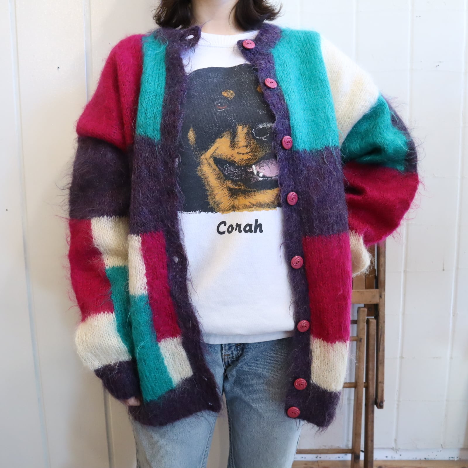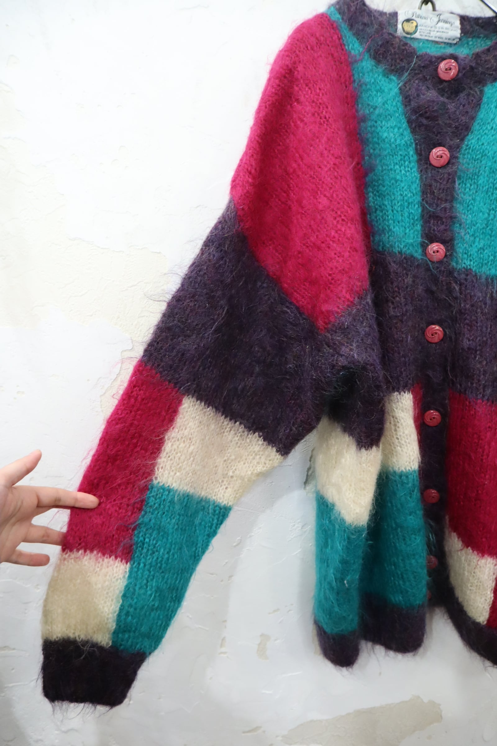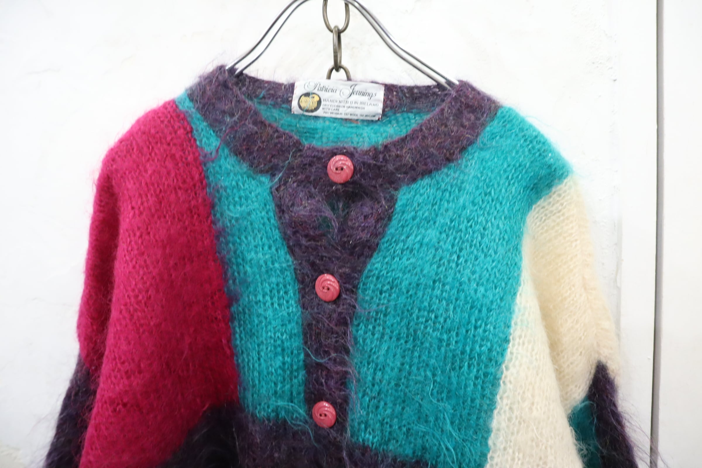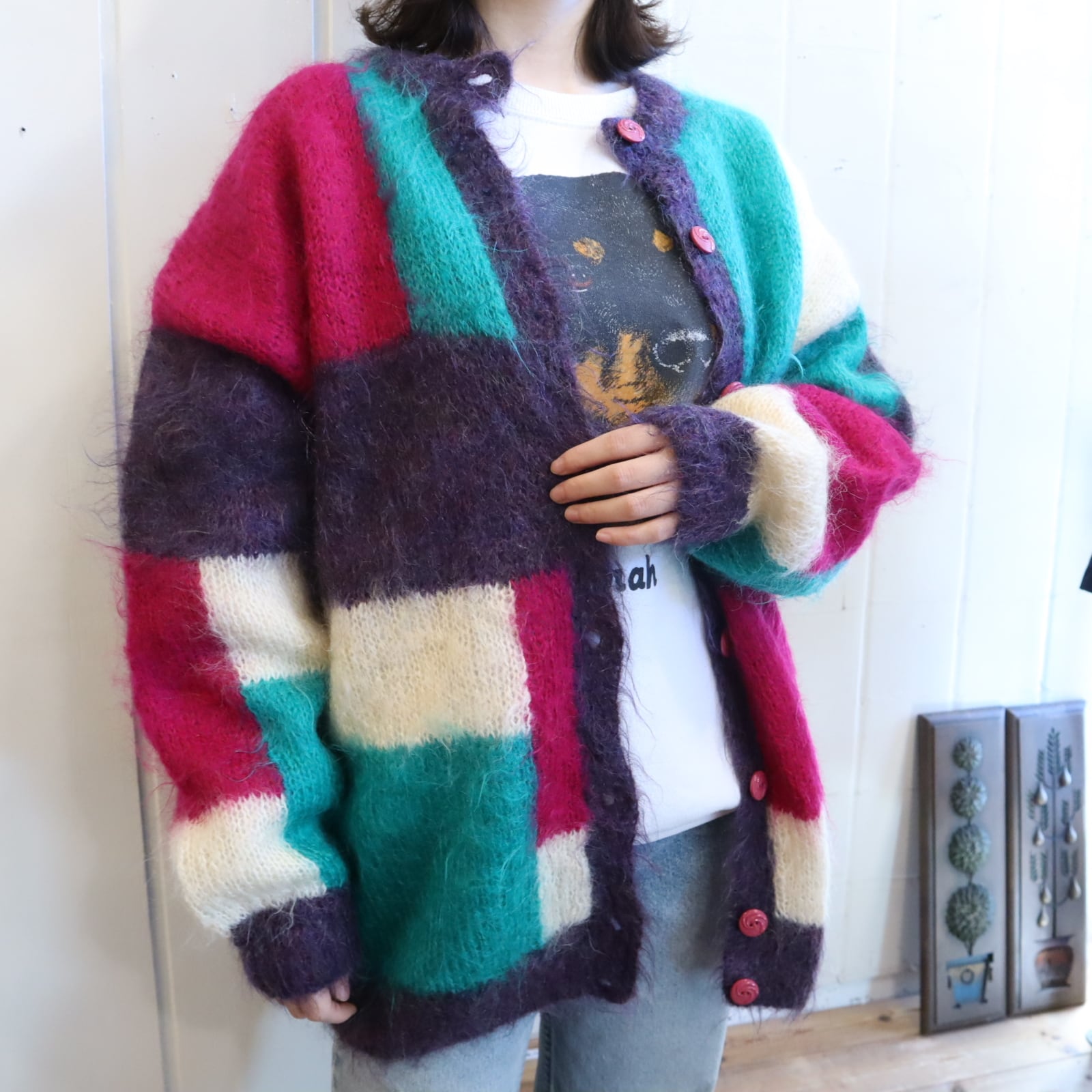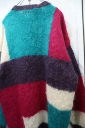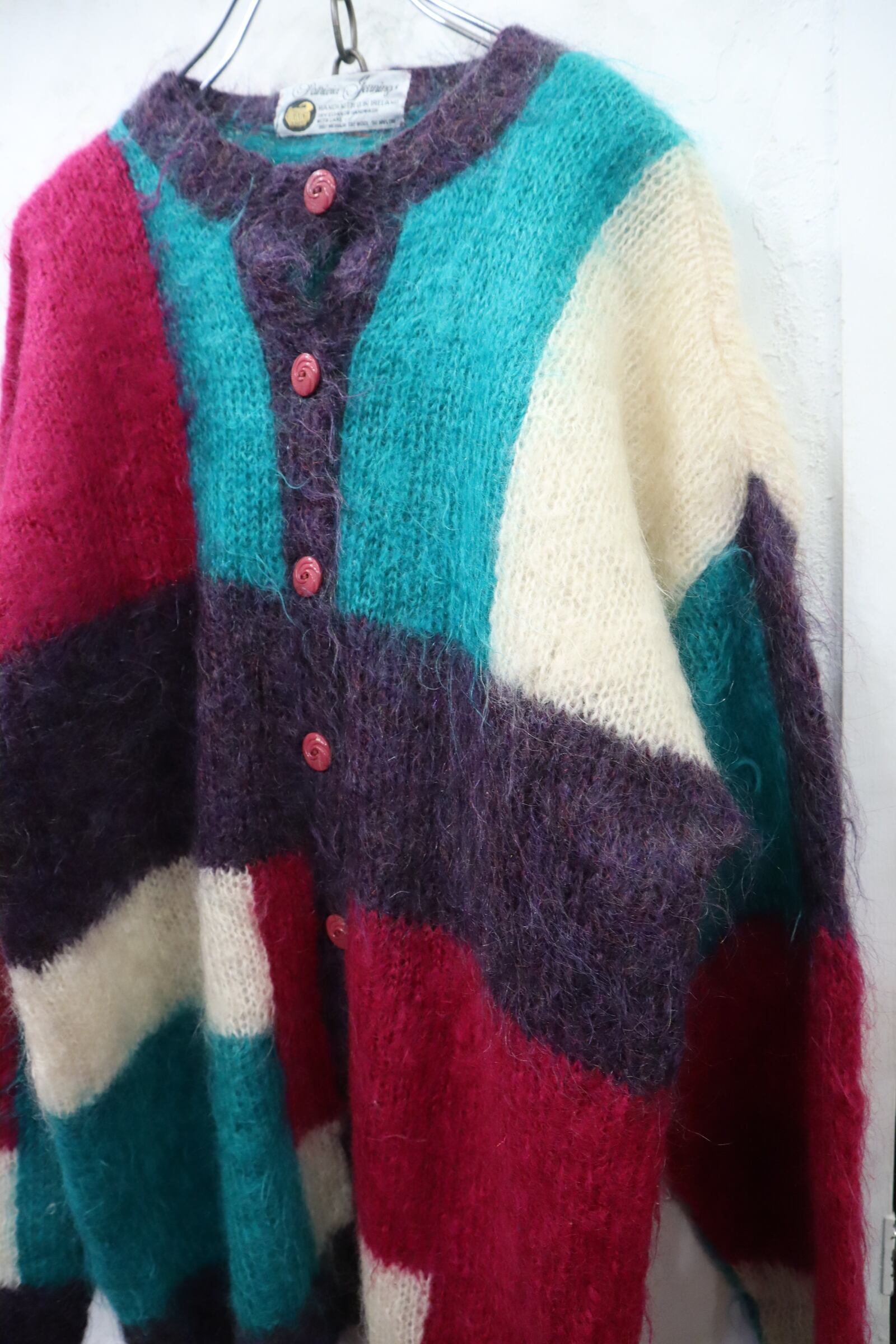 pink×green square mohair knit cardigan [l-4631]