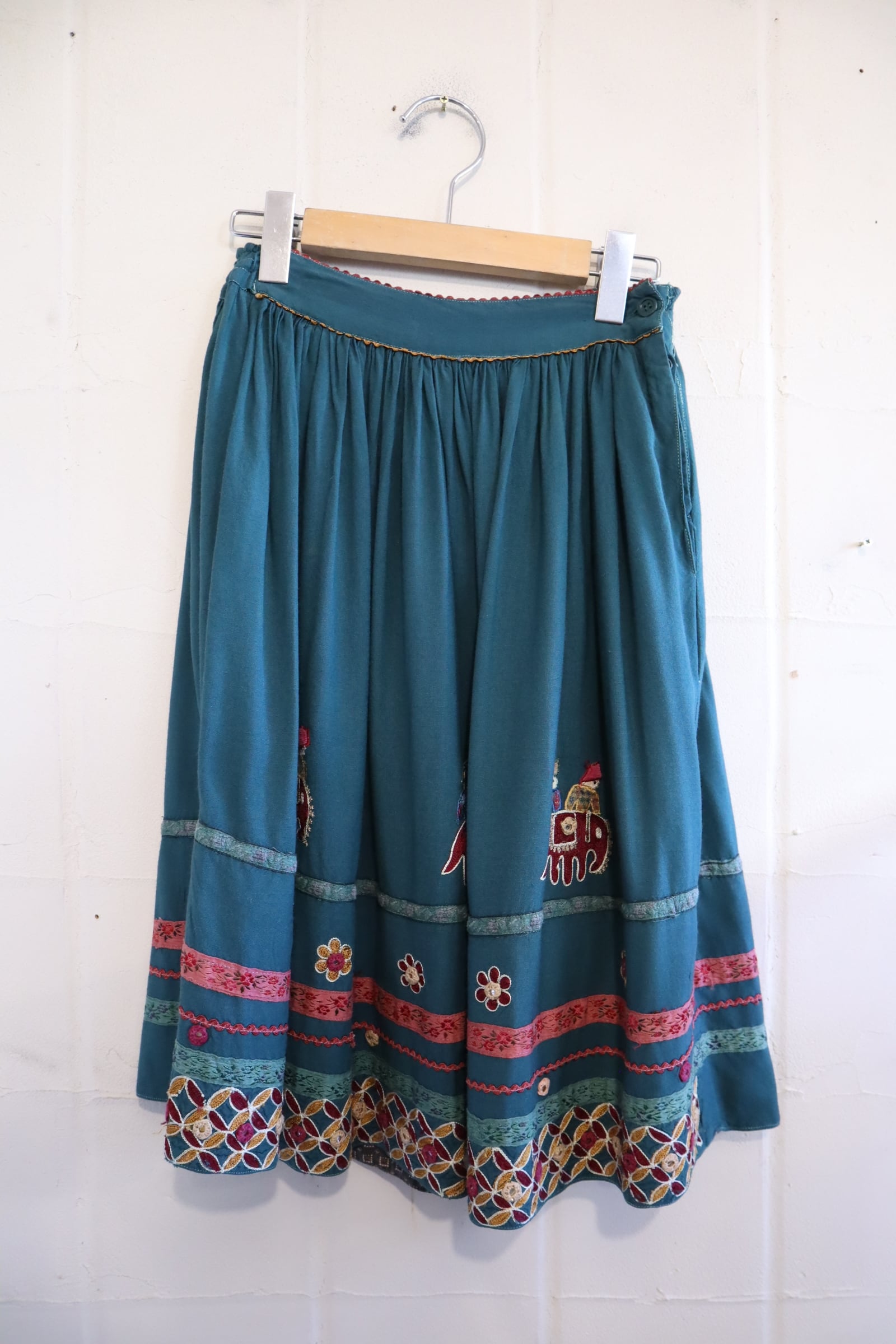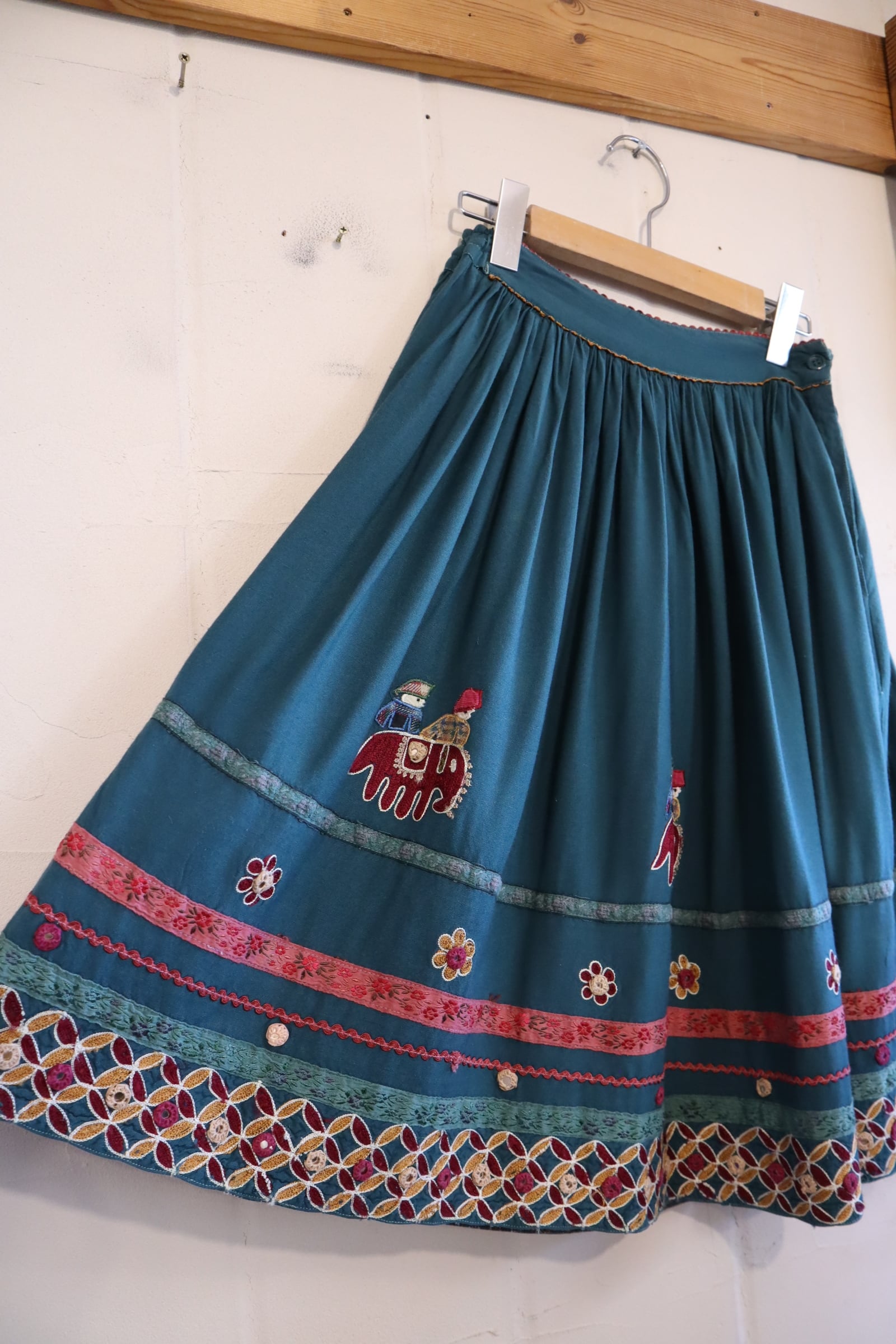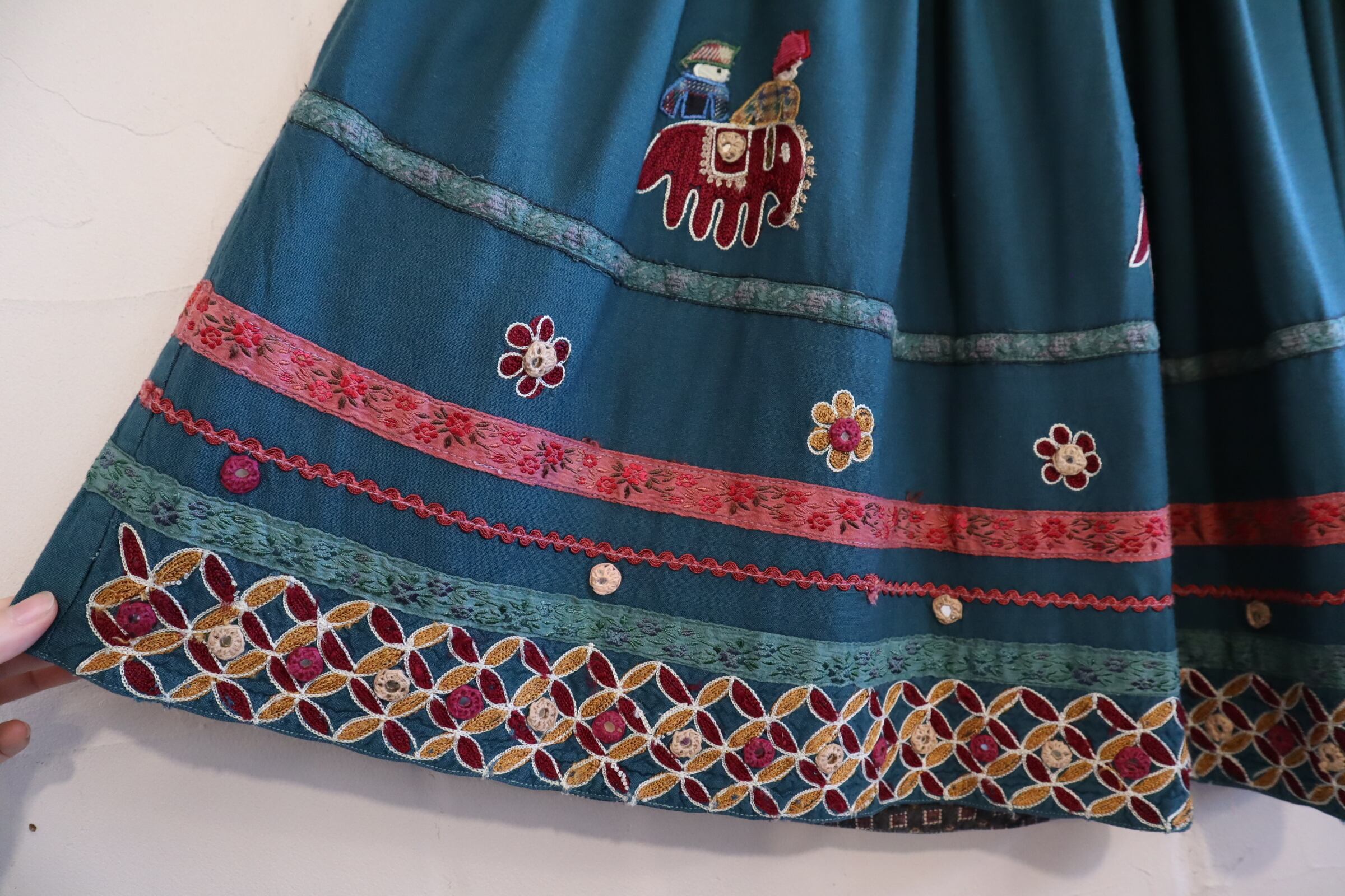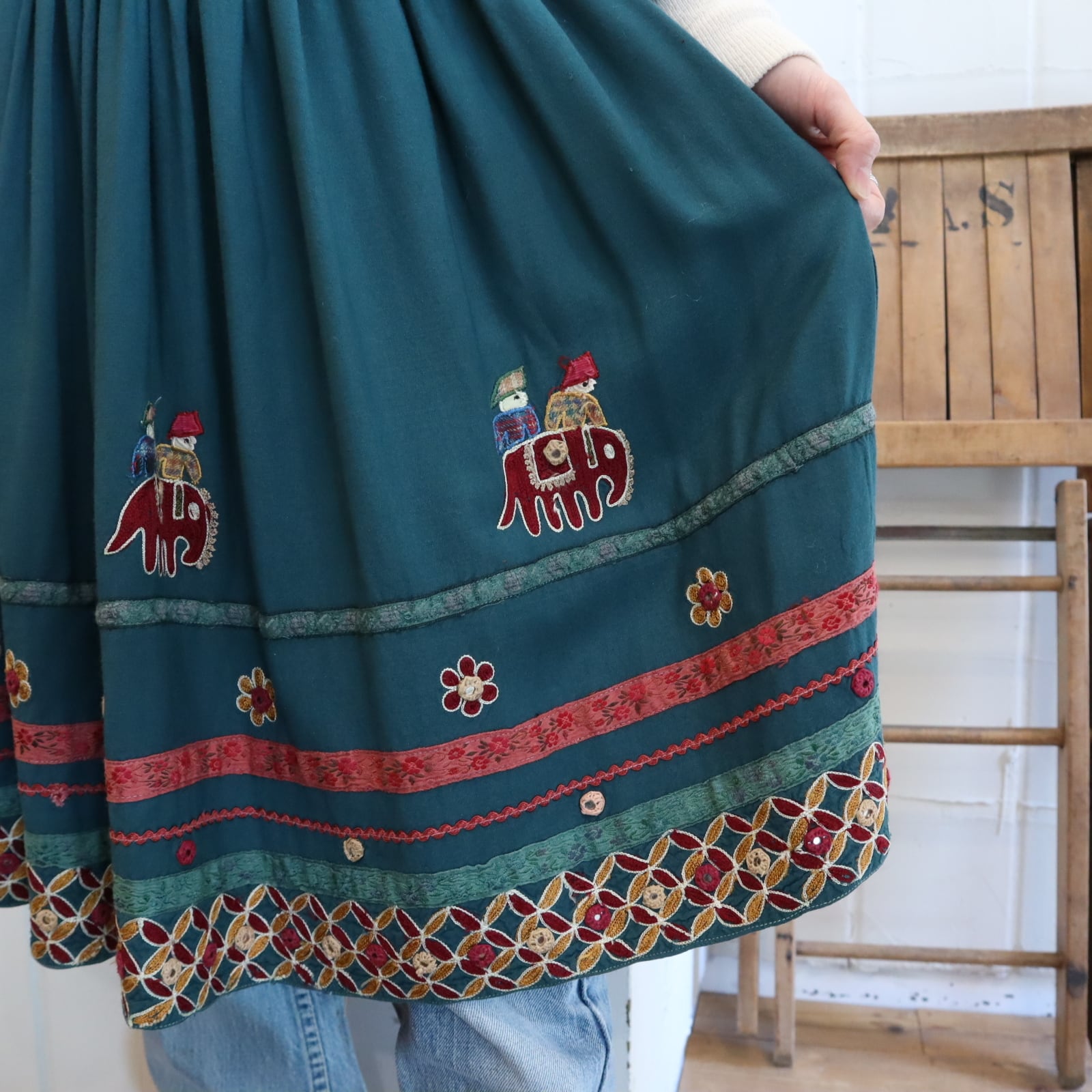 ゾウの刺繍やミラーワークなど、手仕事の温かみを感じるディテールが魅力的な60sインドレーヨンスカート*