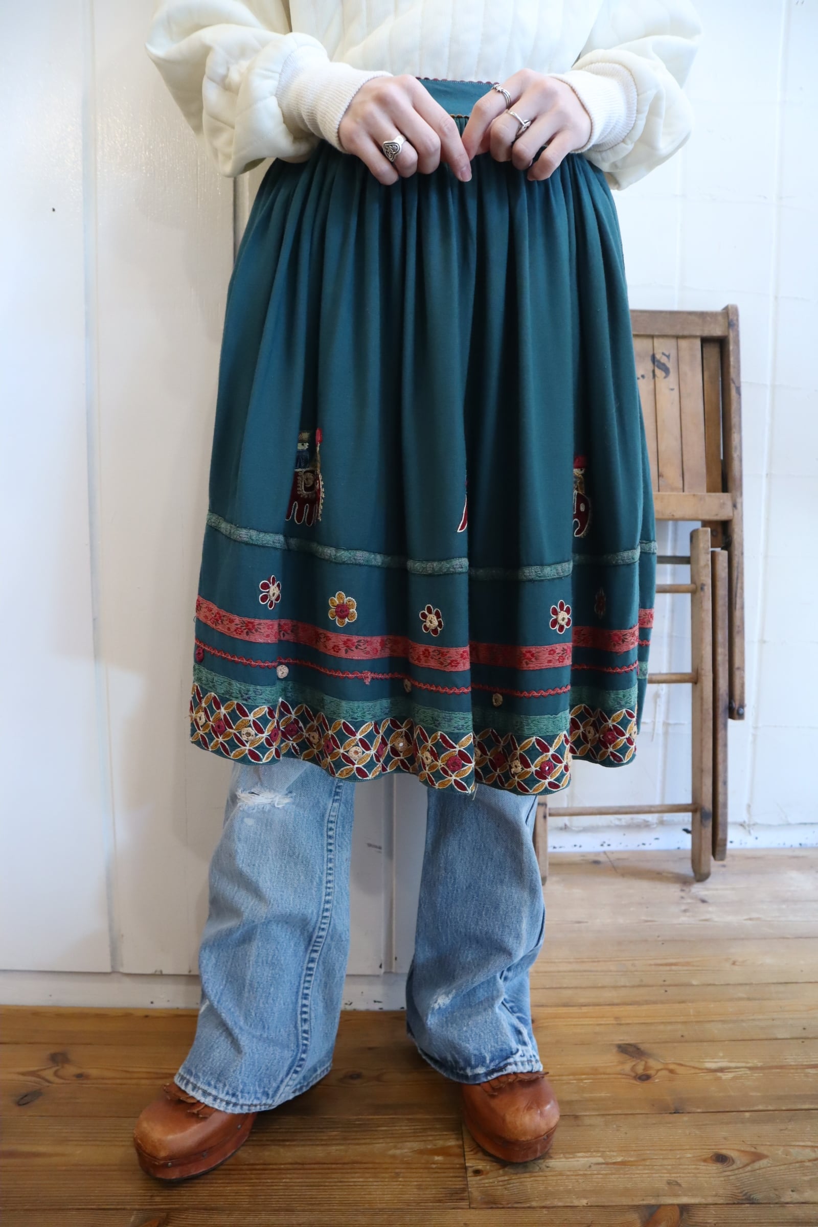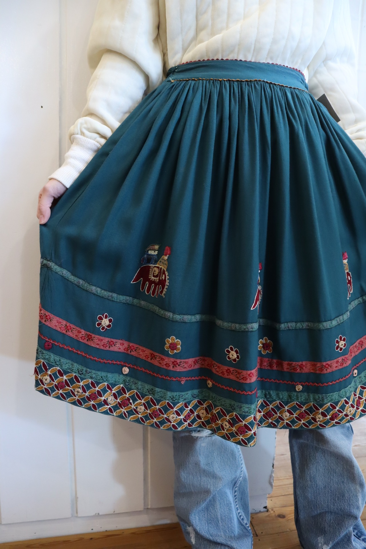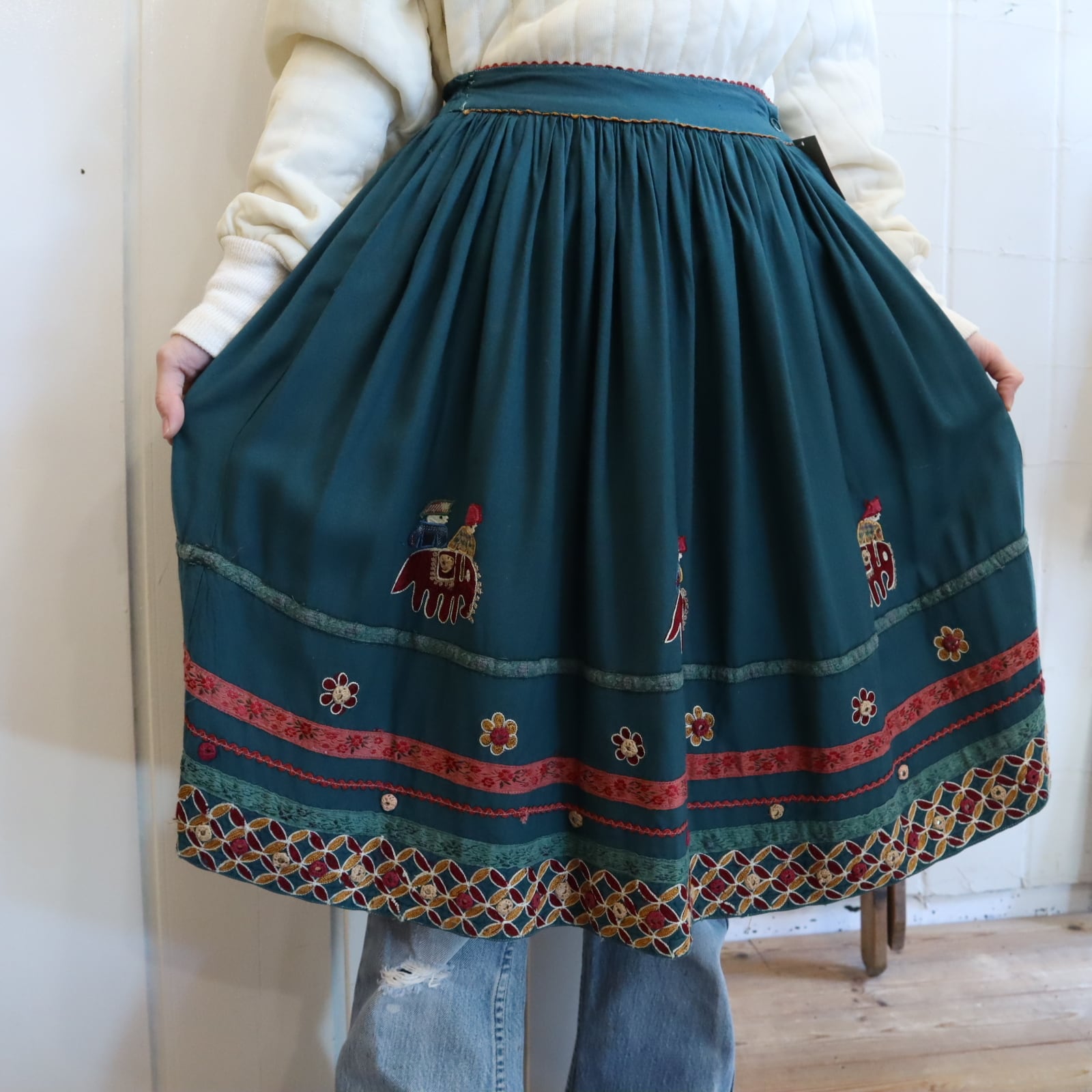 ゾウの刺繍やミラーワークなど、手仕事の温かみを感じるディテールが魅力的な60sインドレーヨンスカート*