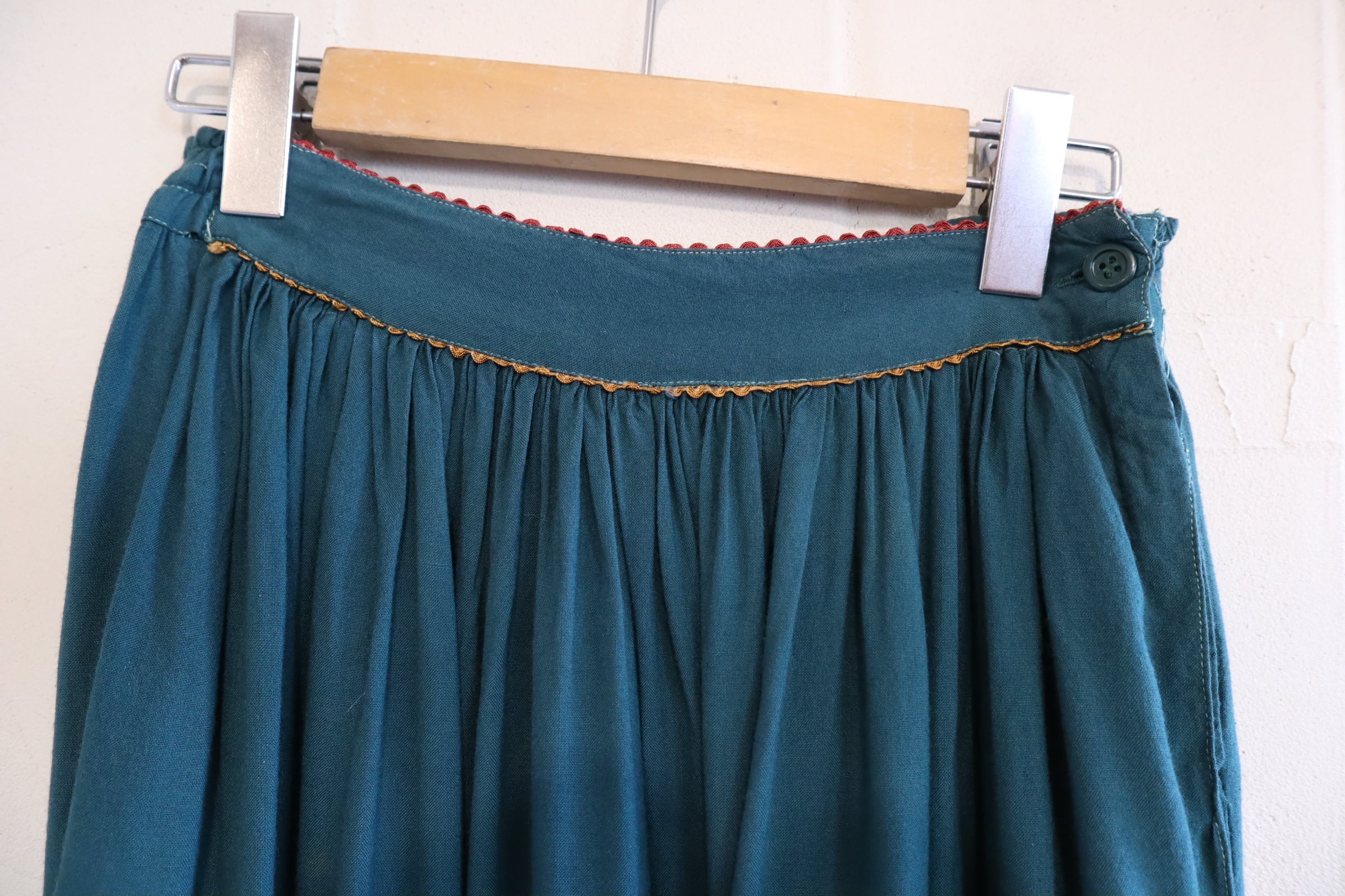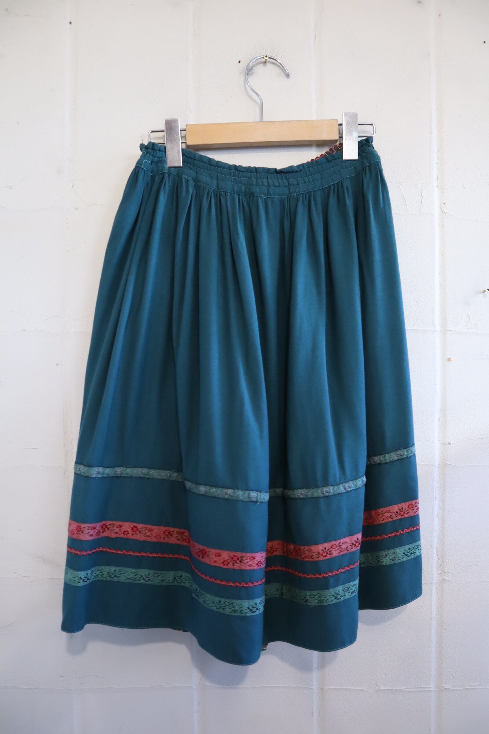 60s bluegreen×pink elephant embroidery Indian rayon skirt [l-4650]