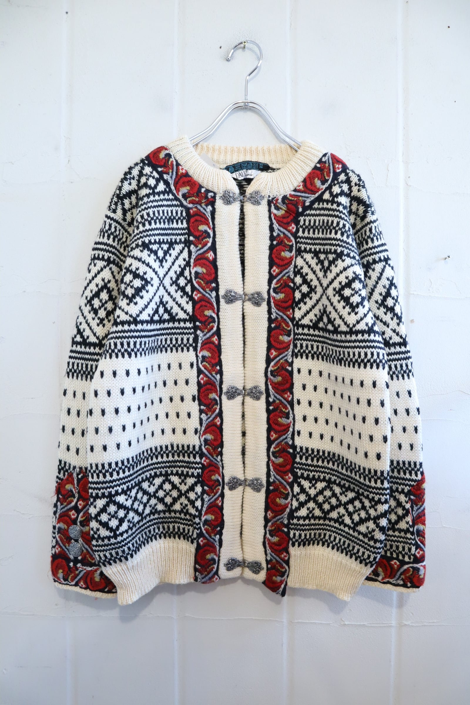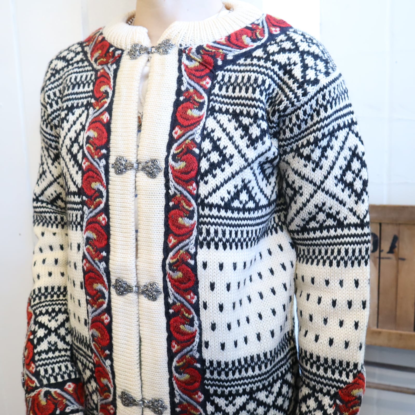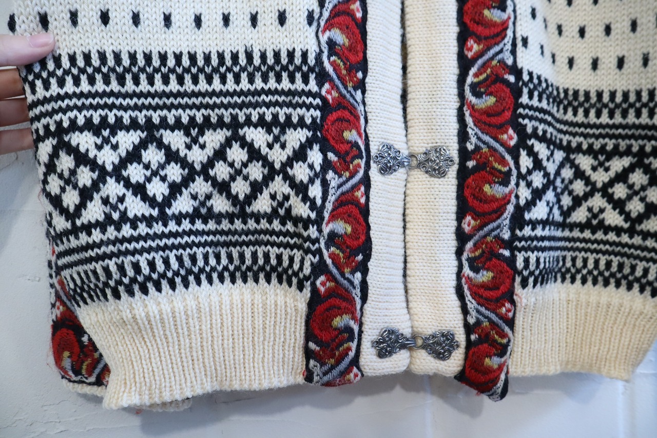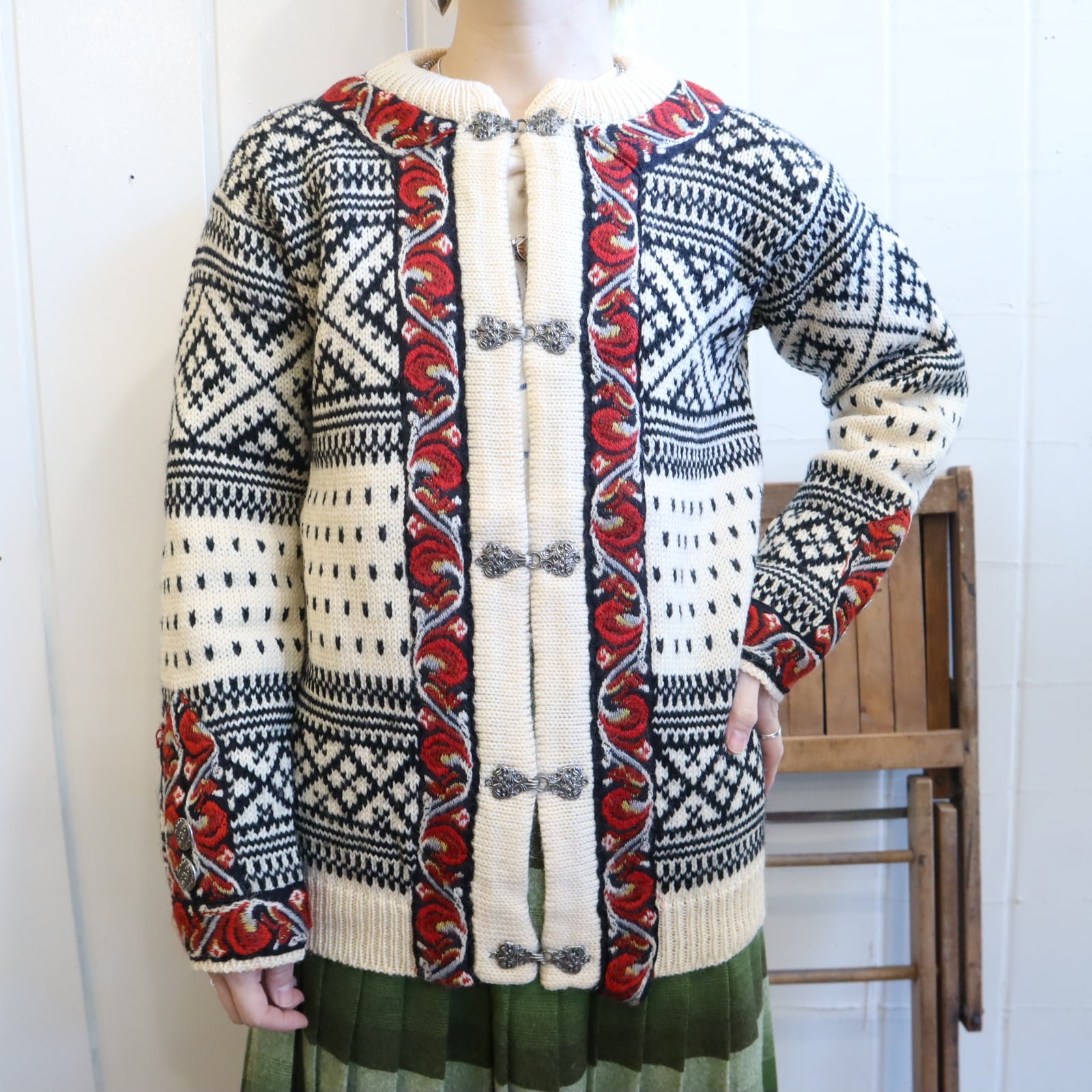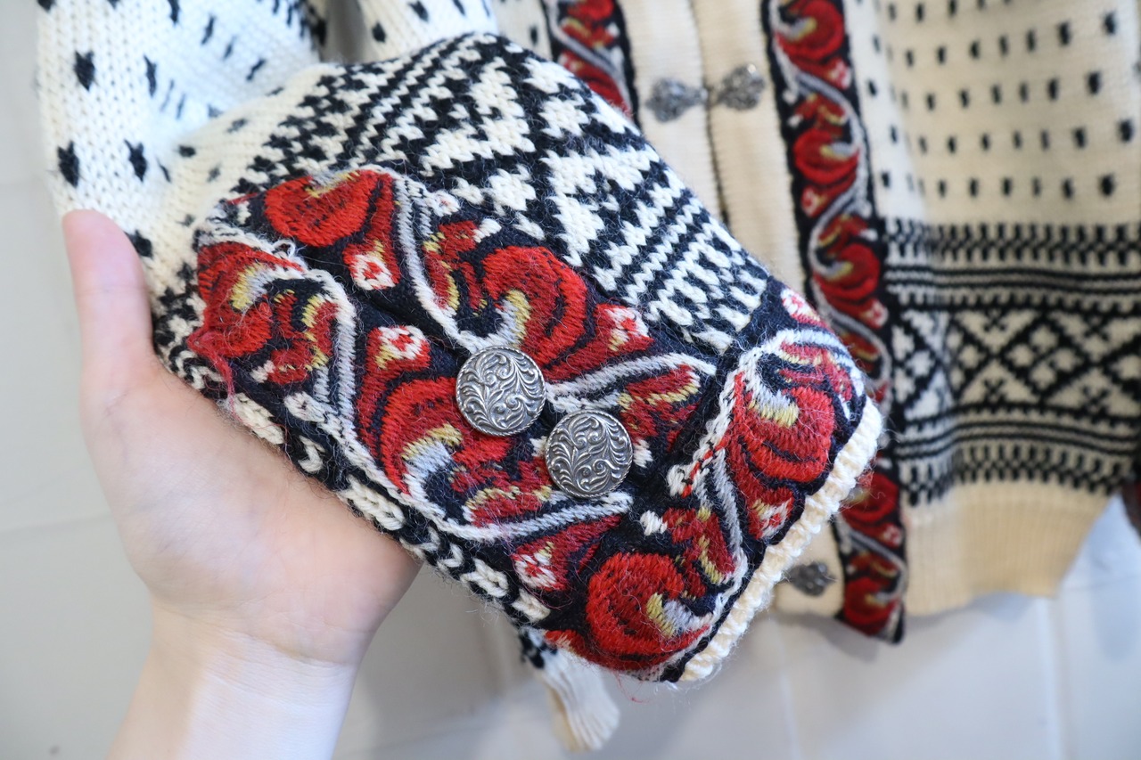 金具フックや袖口のボタンなどノルディックらしいデザインが素敵なニットカーディガン。