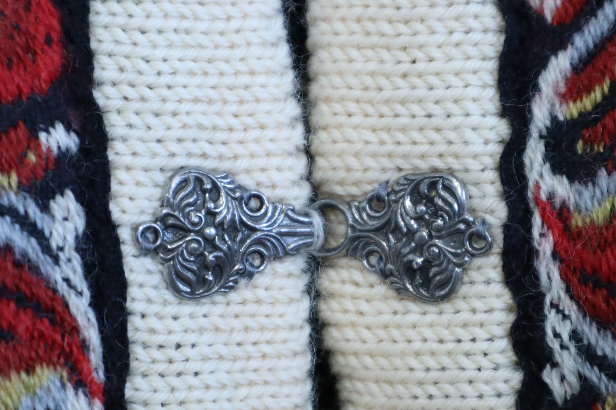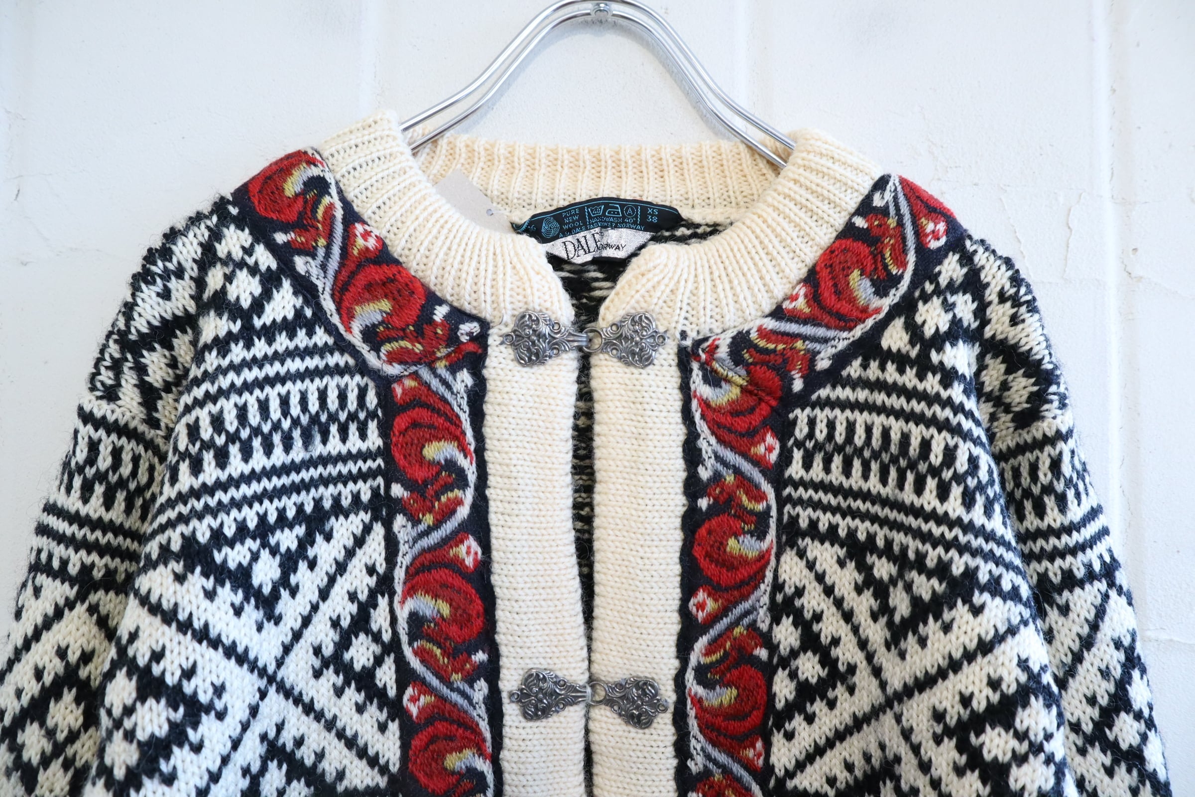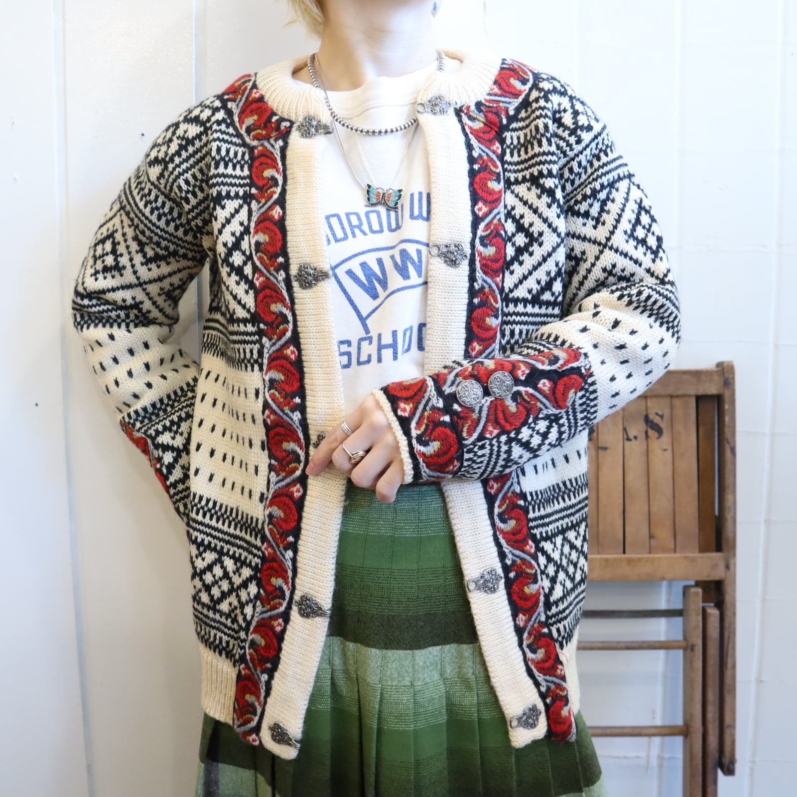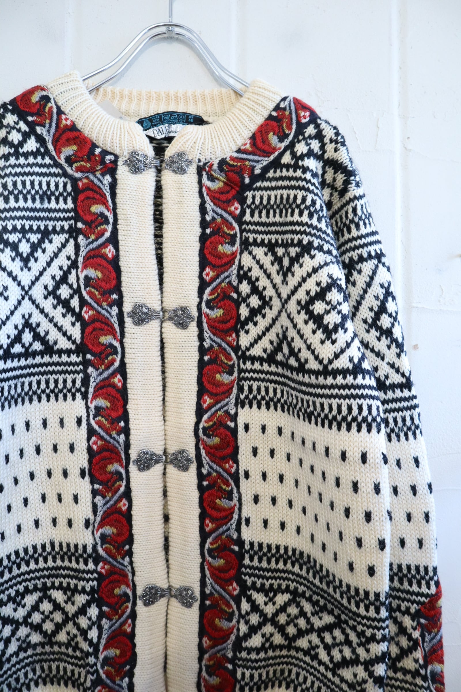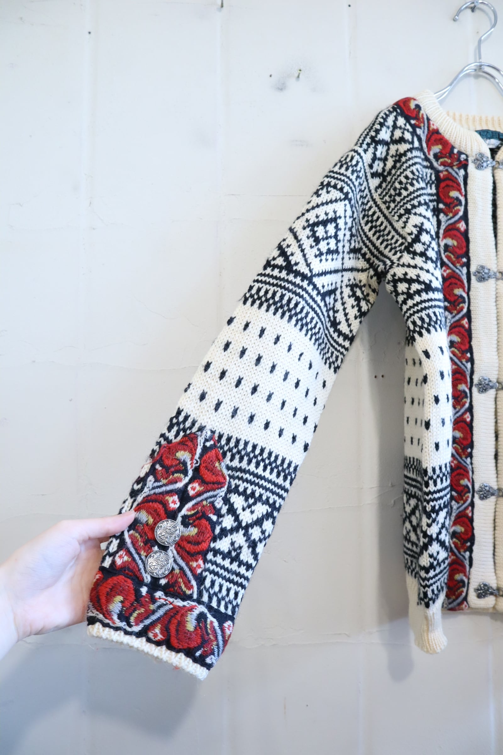 金具フックや袖口のボタンなどノルディックらしいデザインが素敵なニットカーディガン。