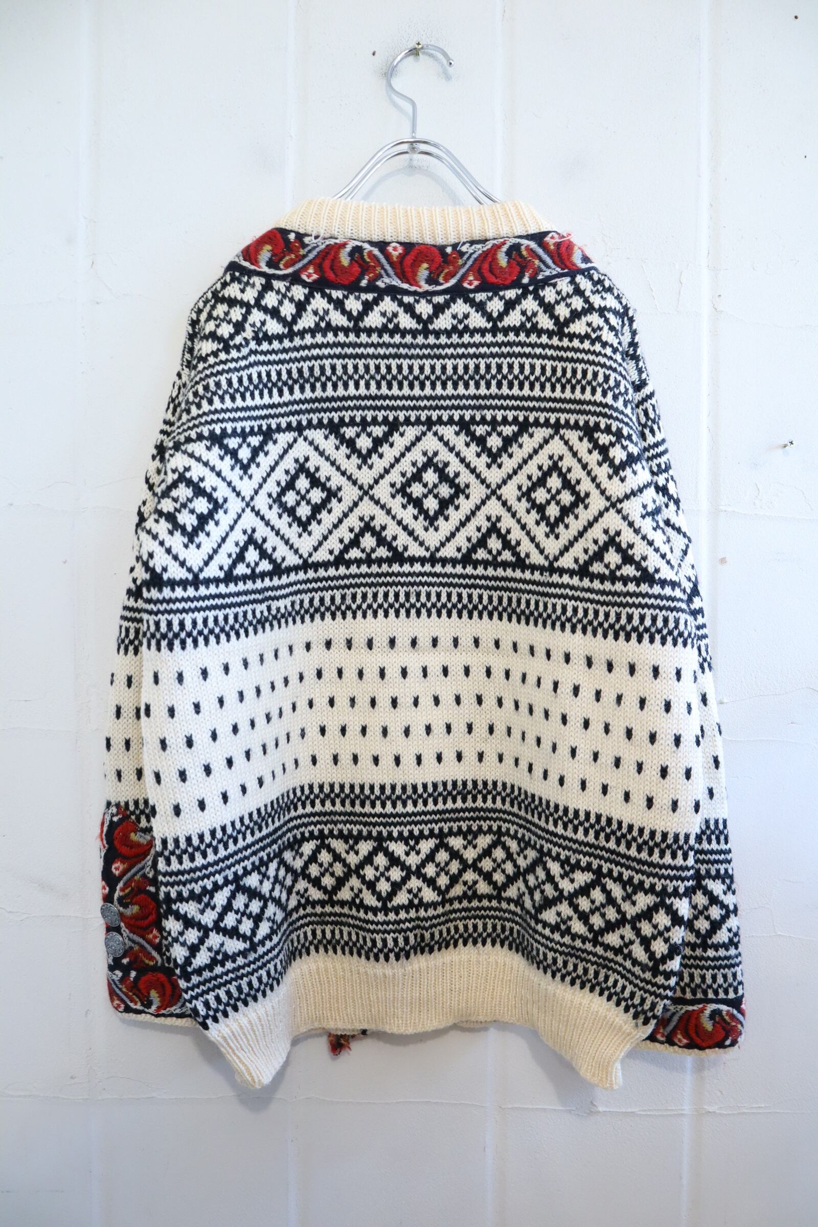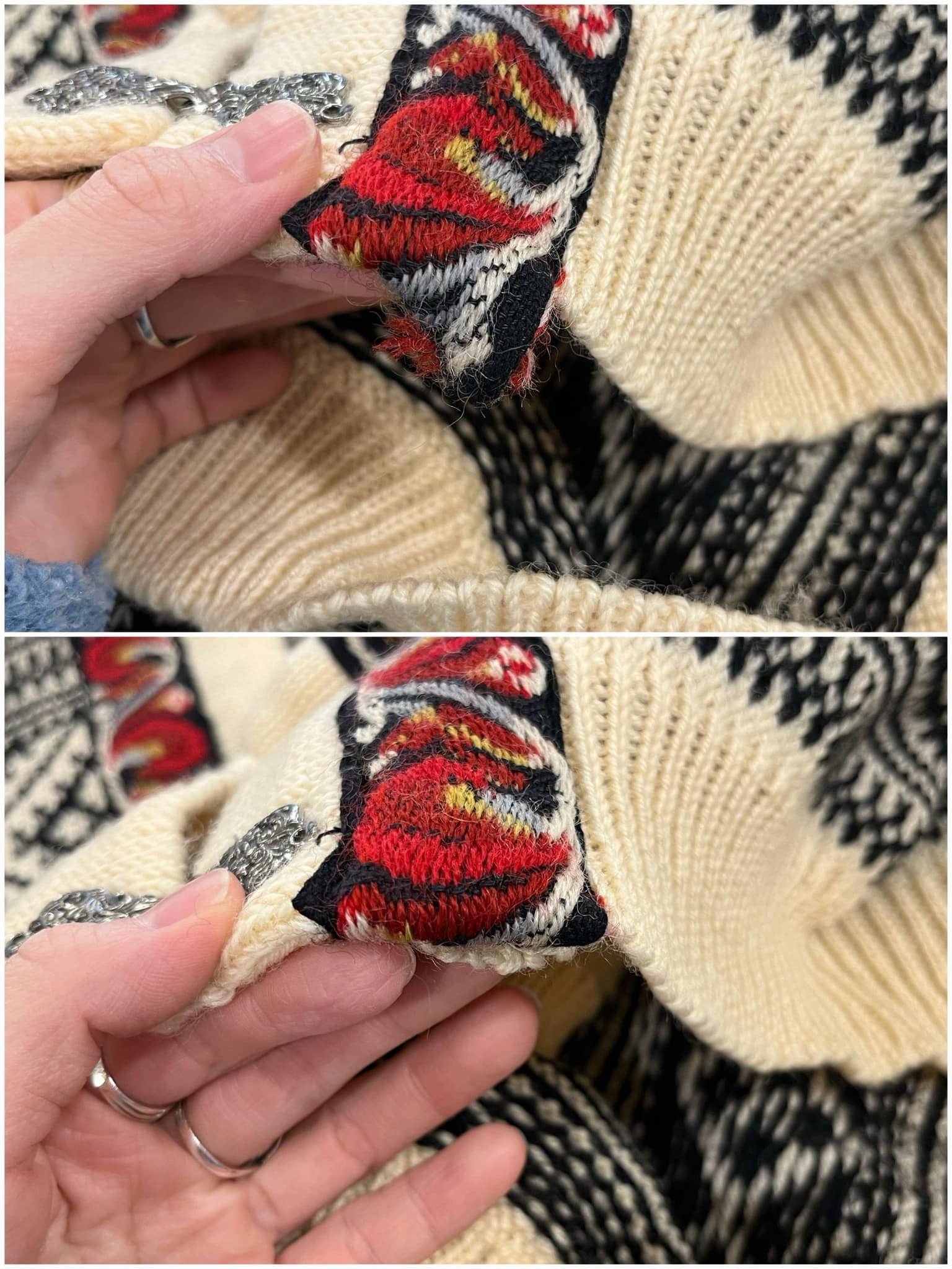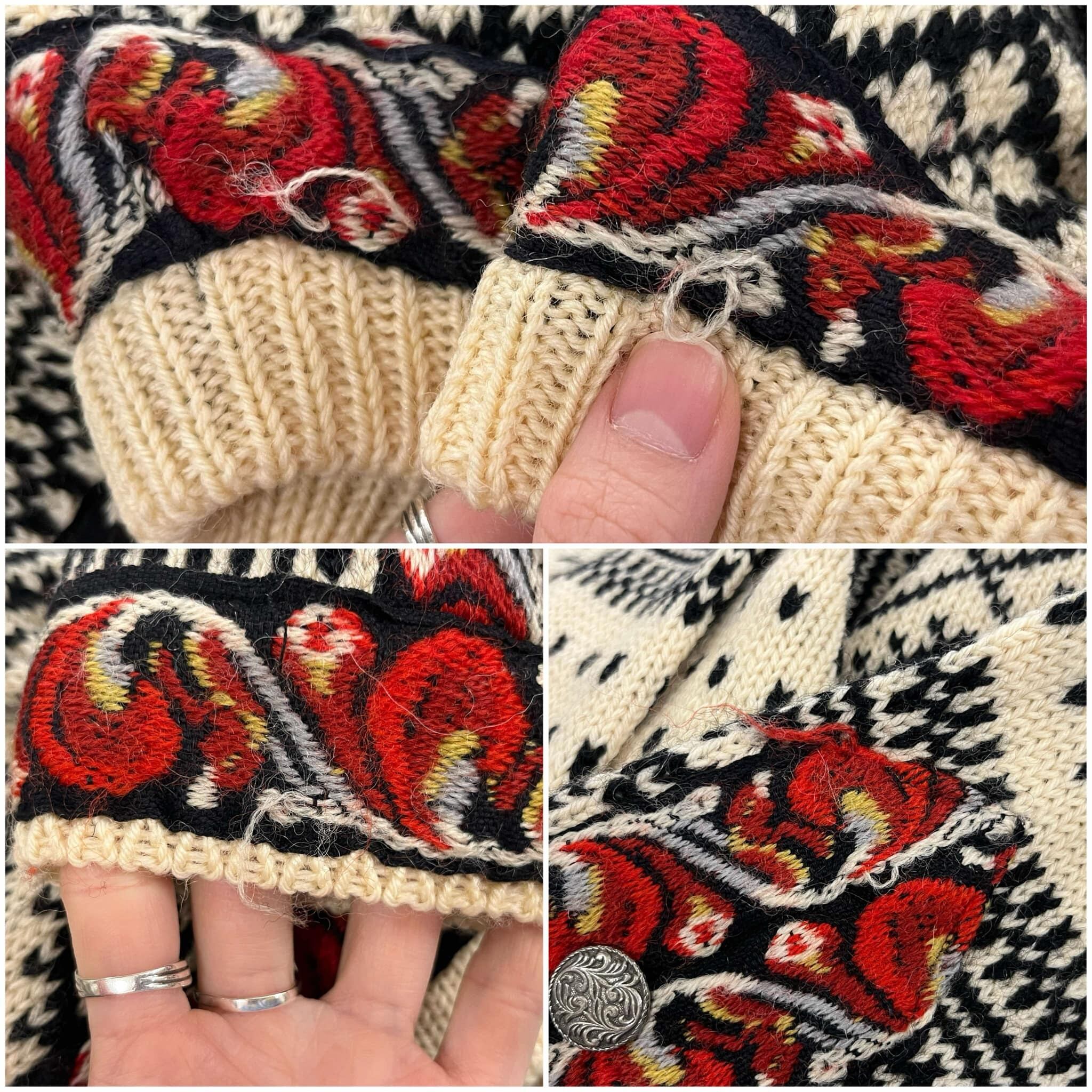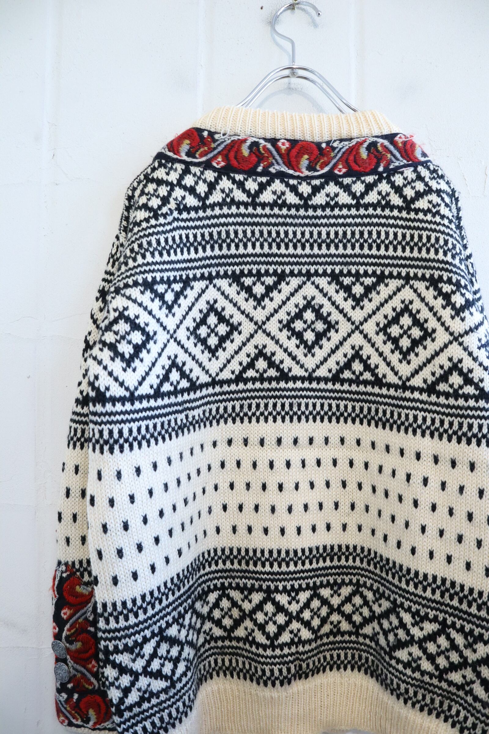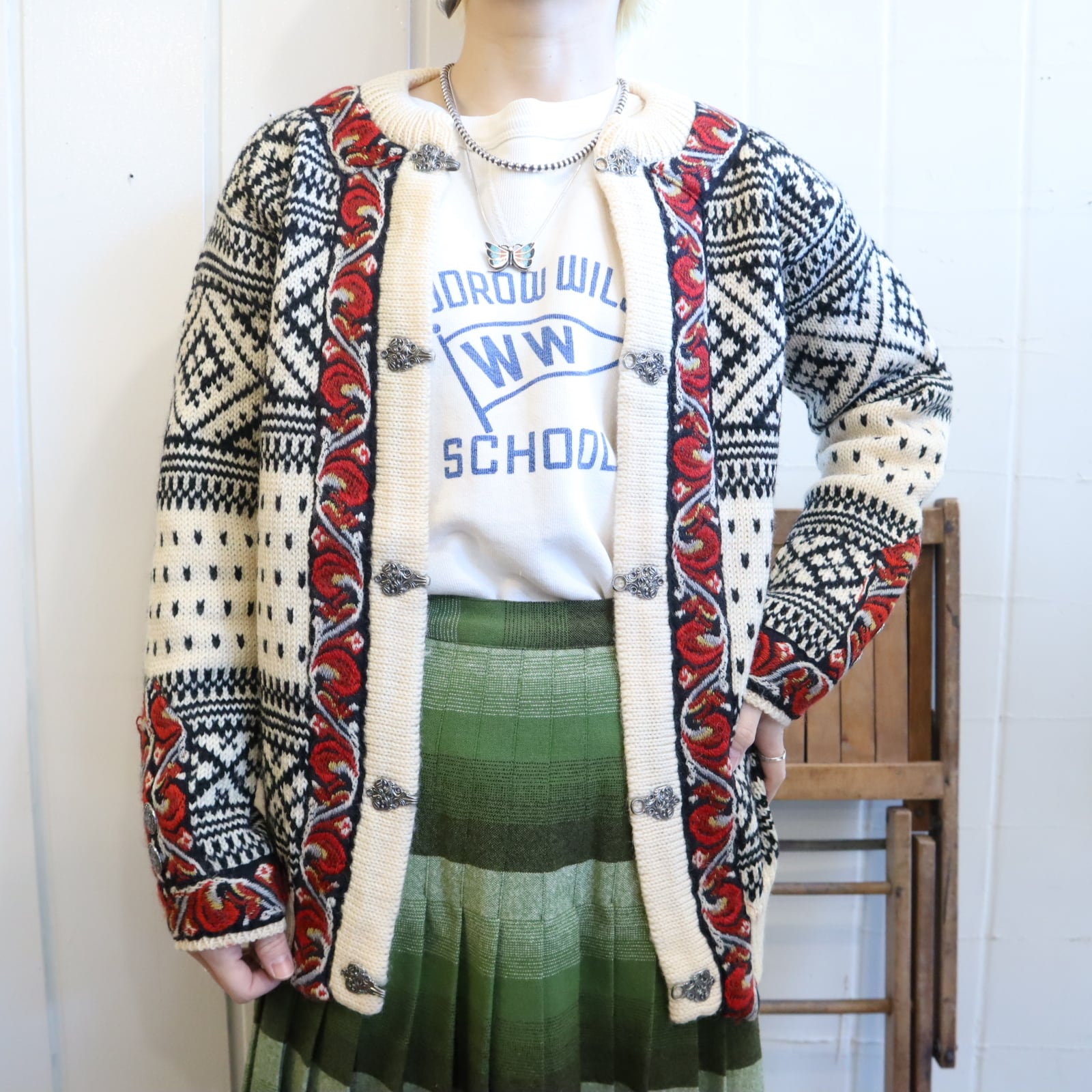 金具フックや袖口のボタンなどノルディックらしいデザインが素敵なニットカーディガン。