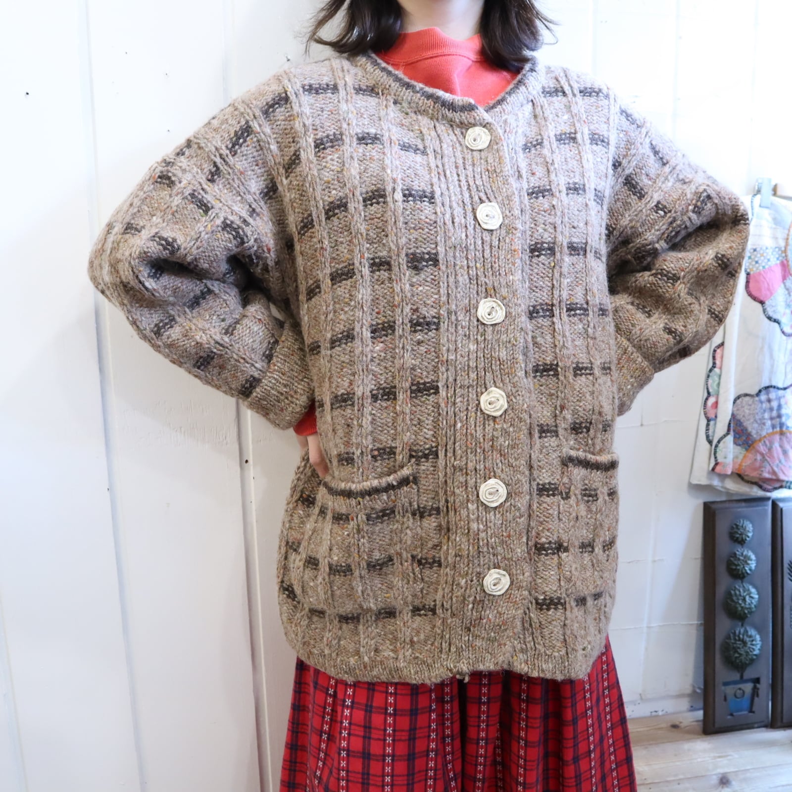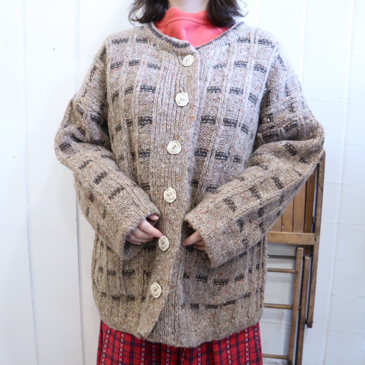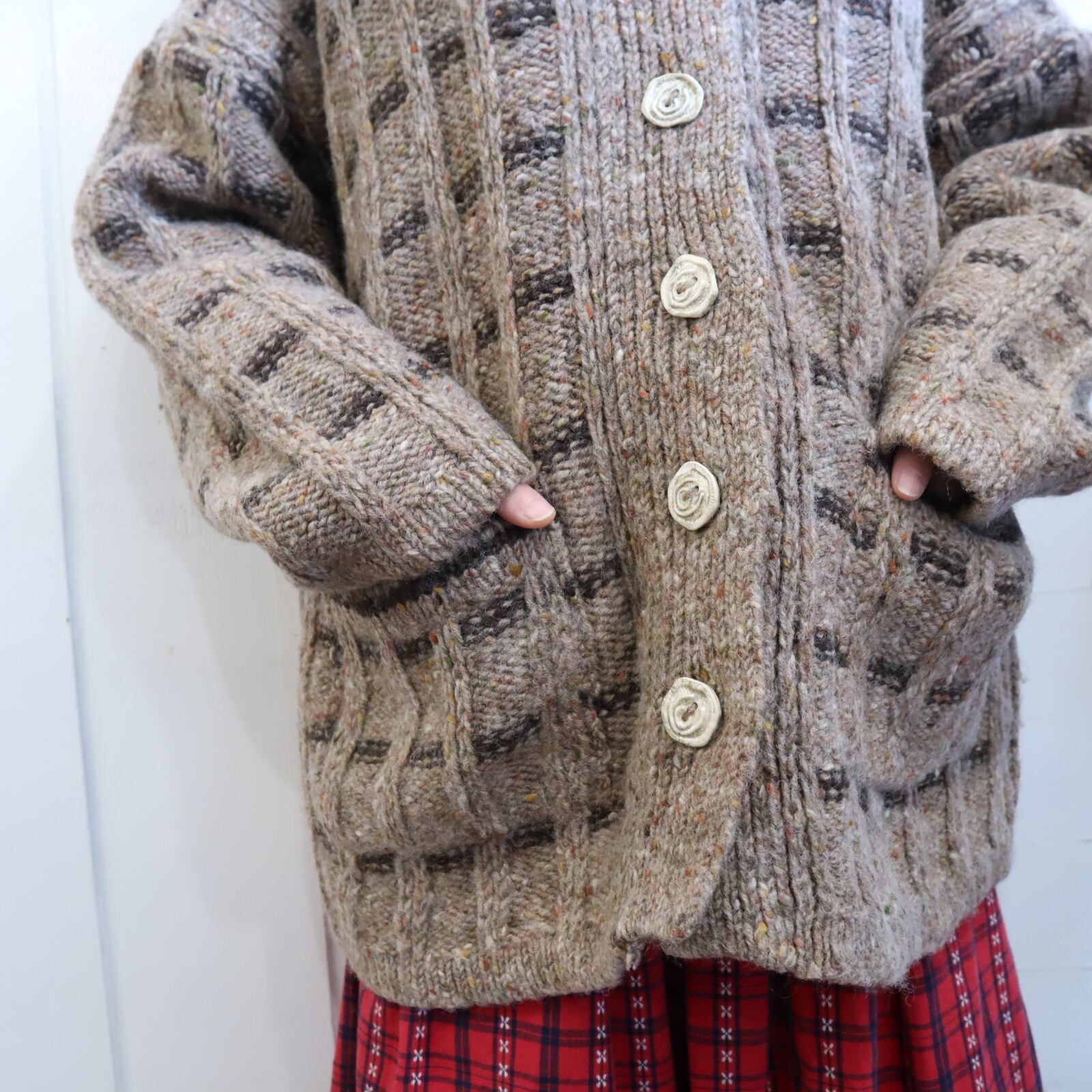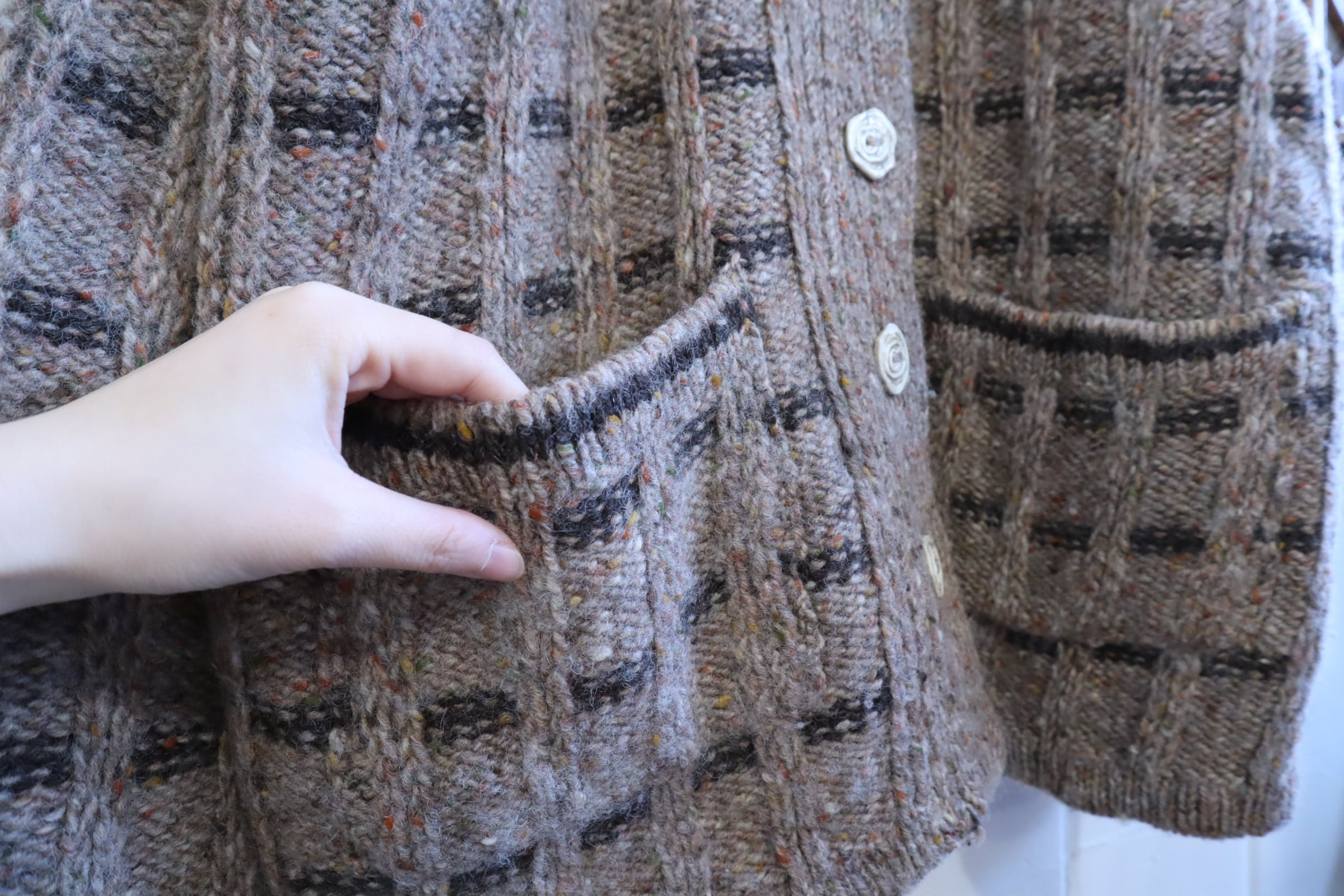チェックのような模様と拘られたボタンが可愛いニットカーディガン。