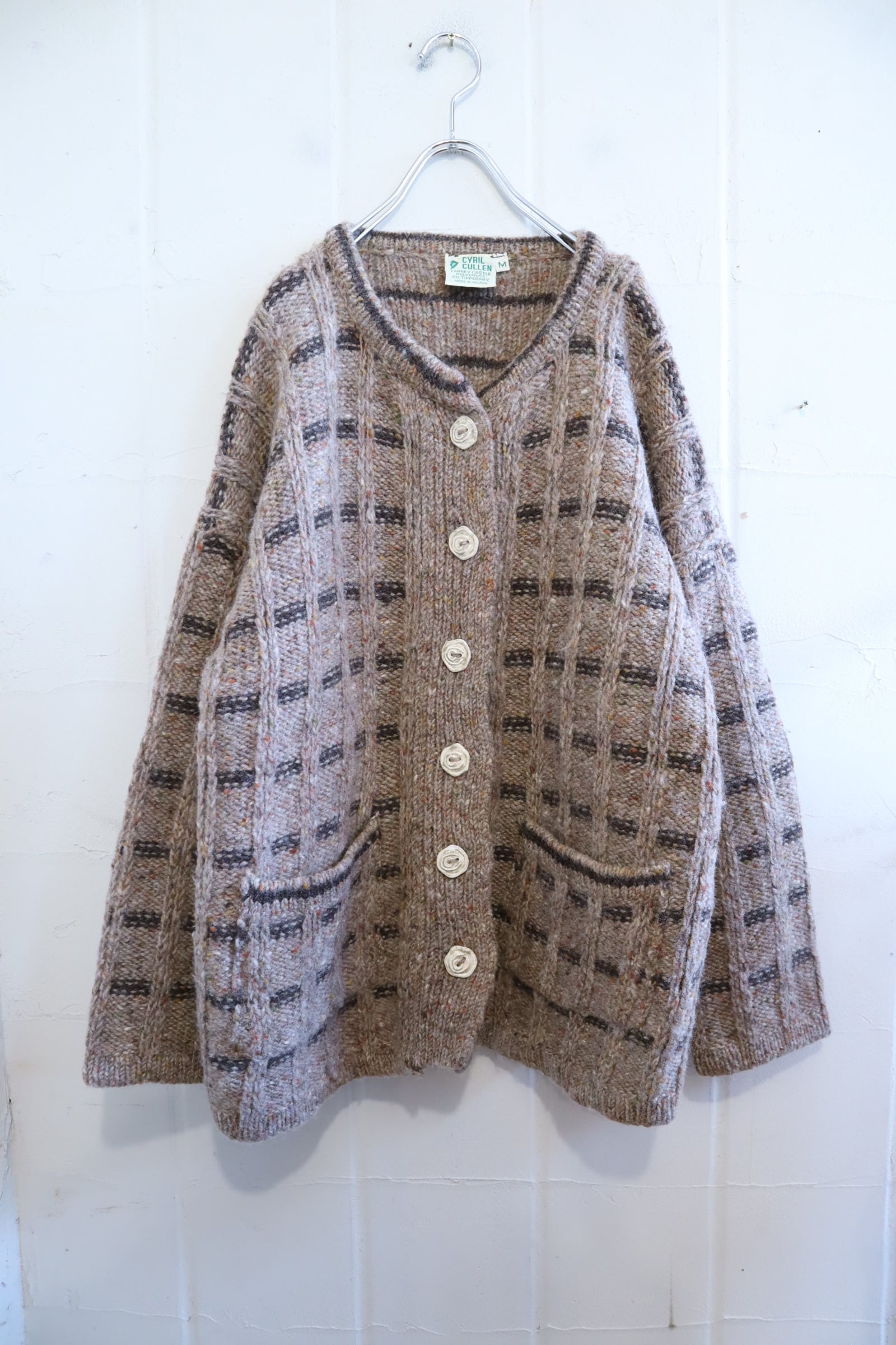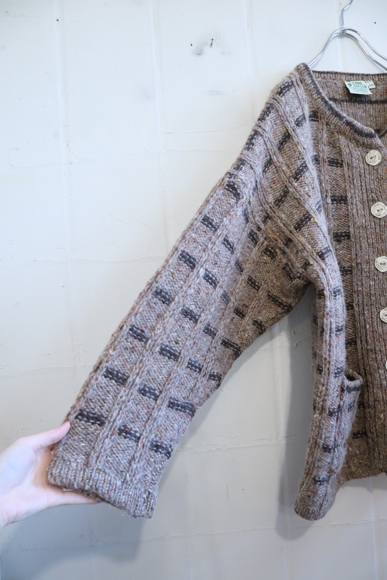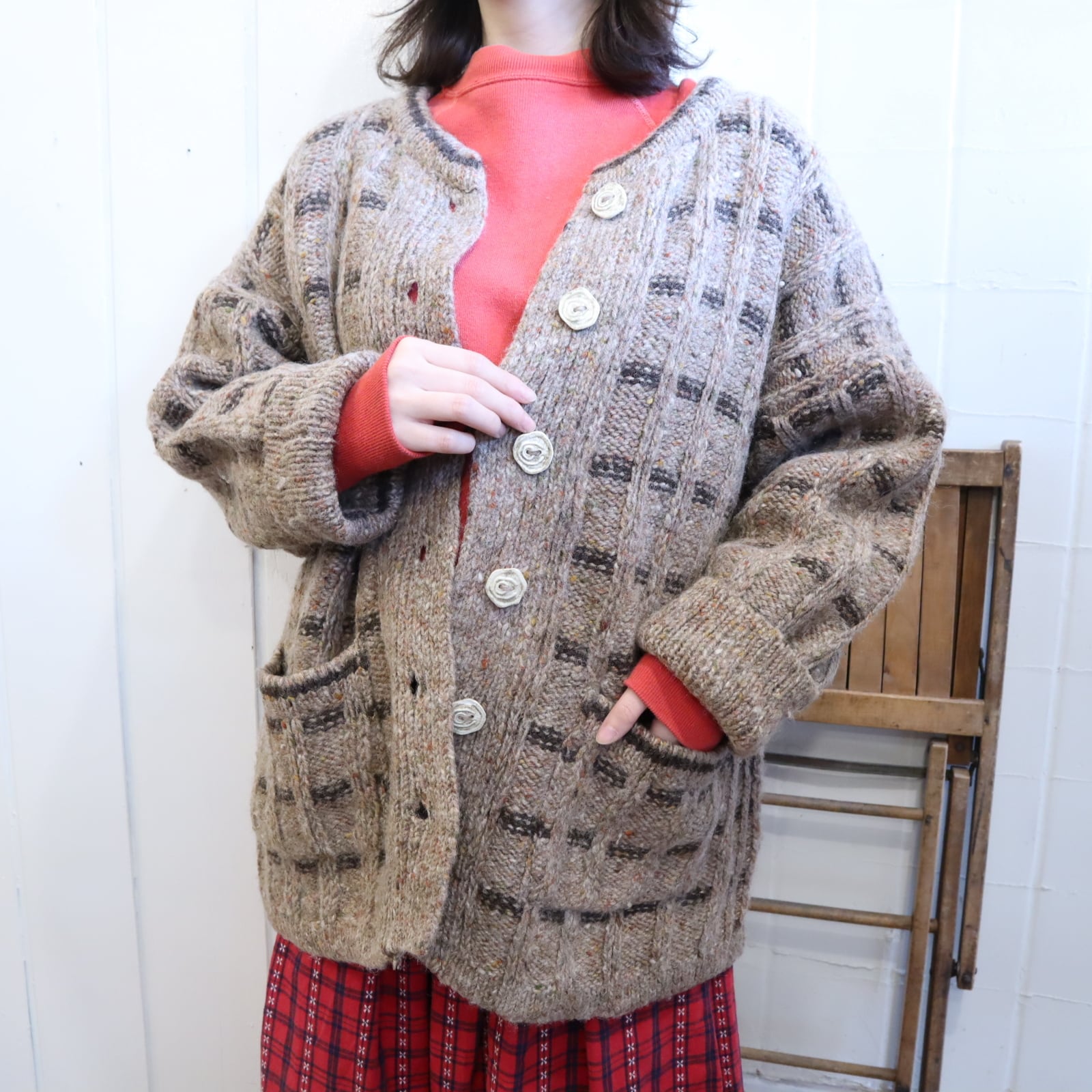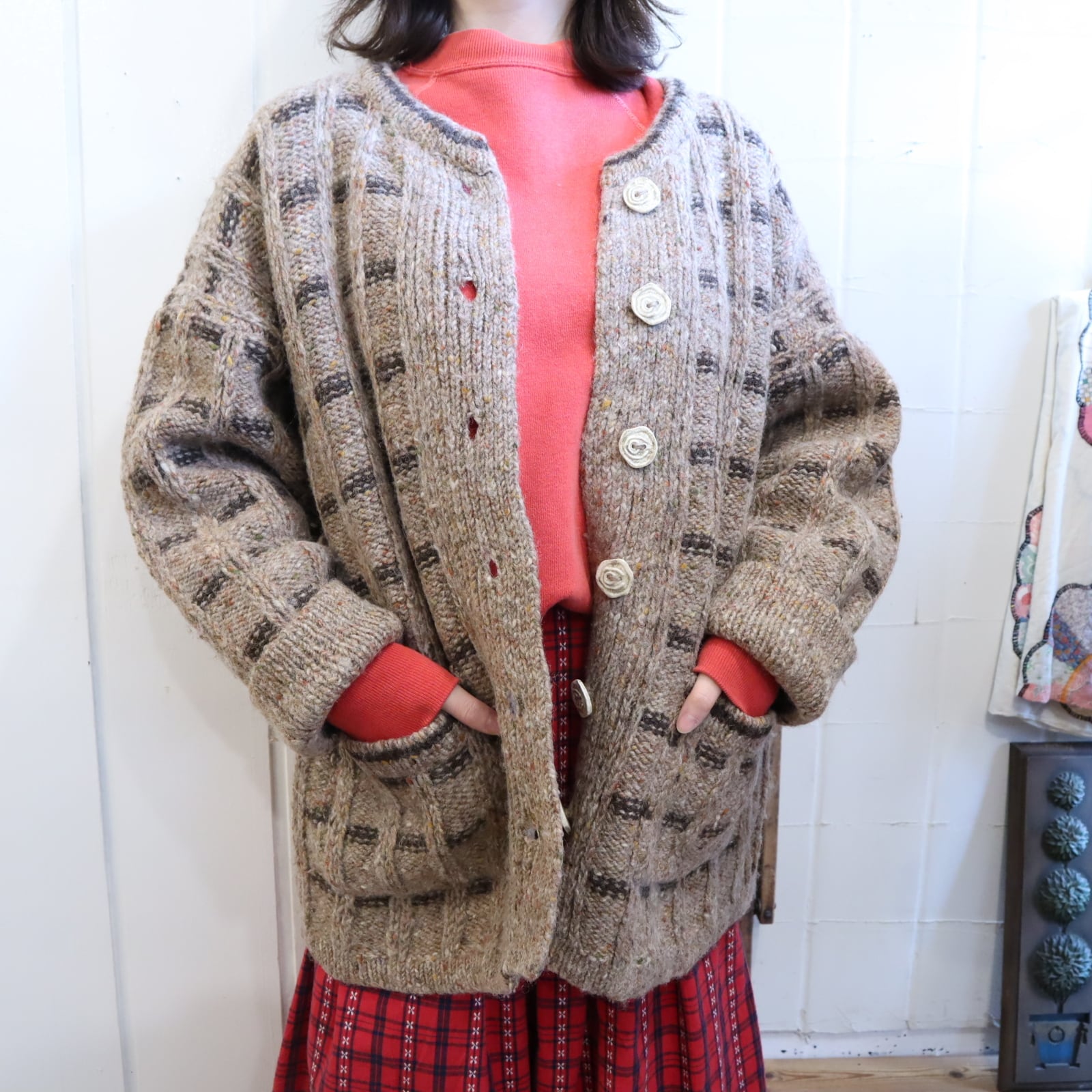 チェックのような模様と拘られたボタンが可愛いニットカーディガン。